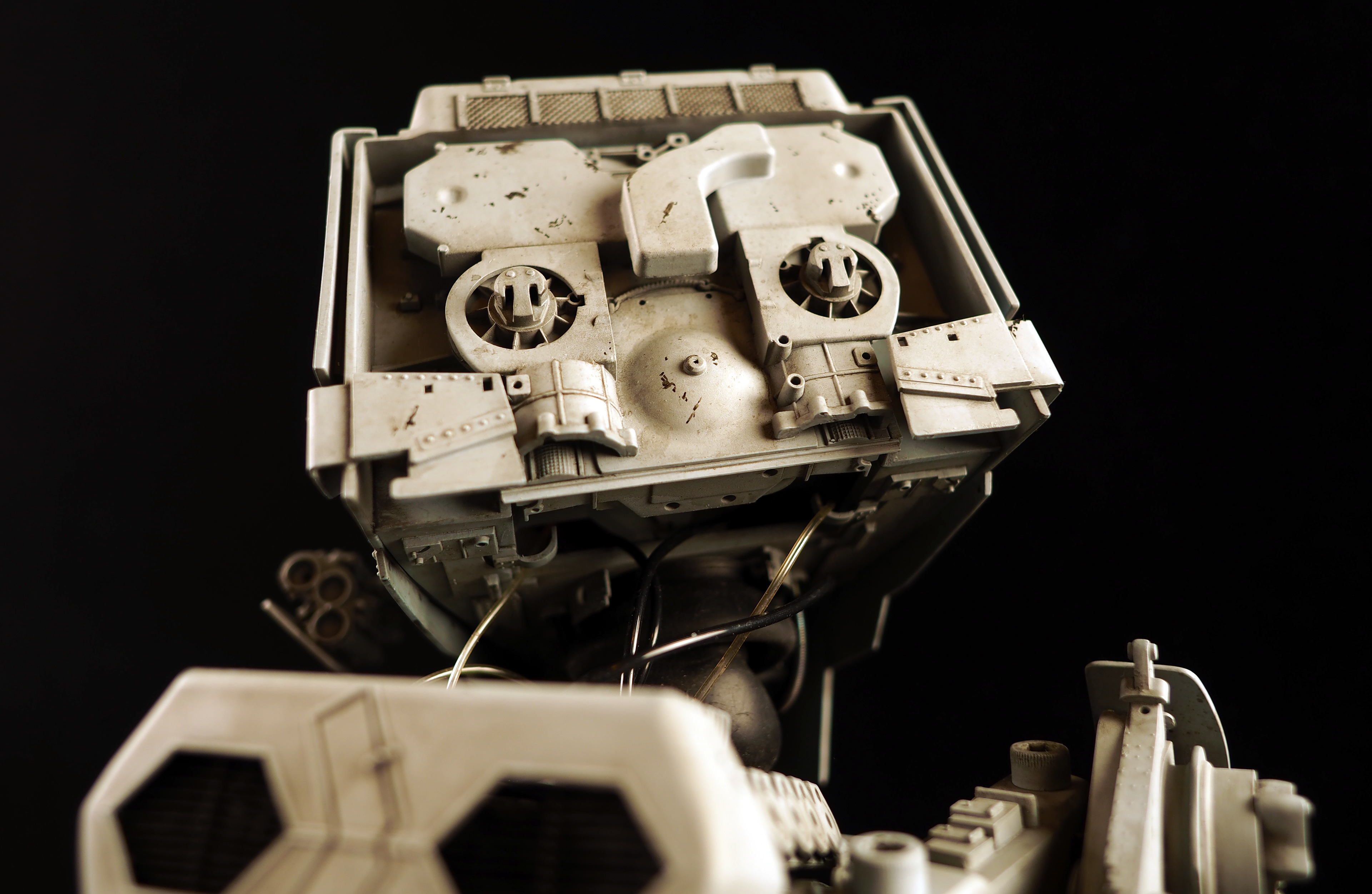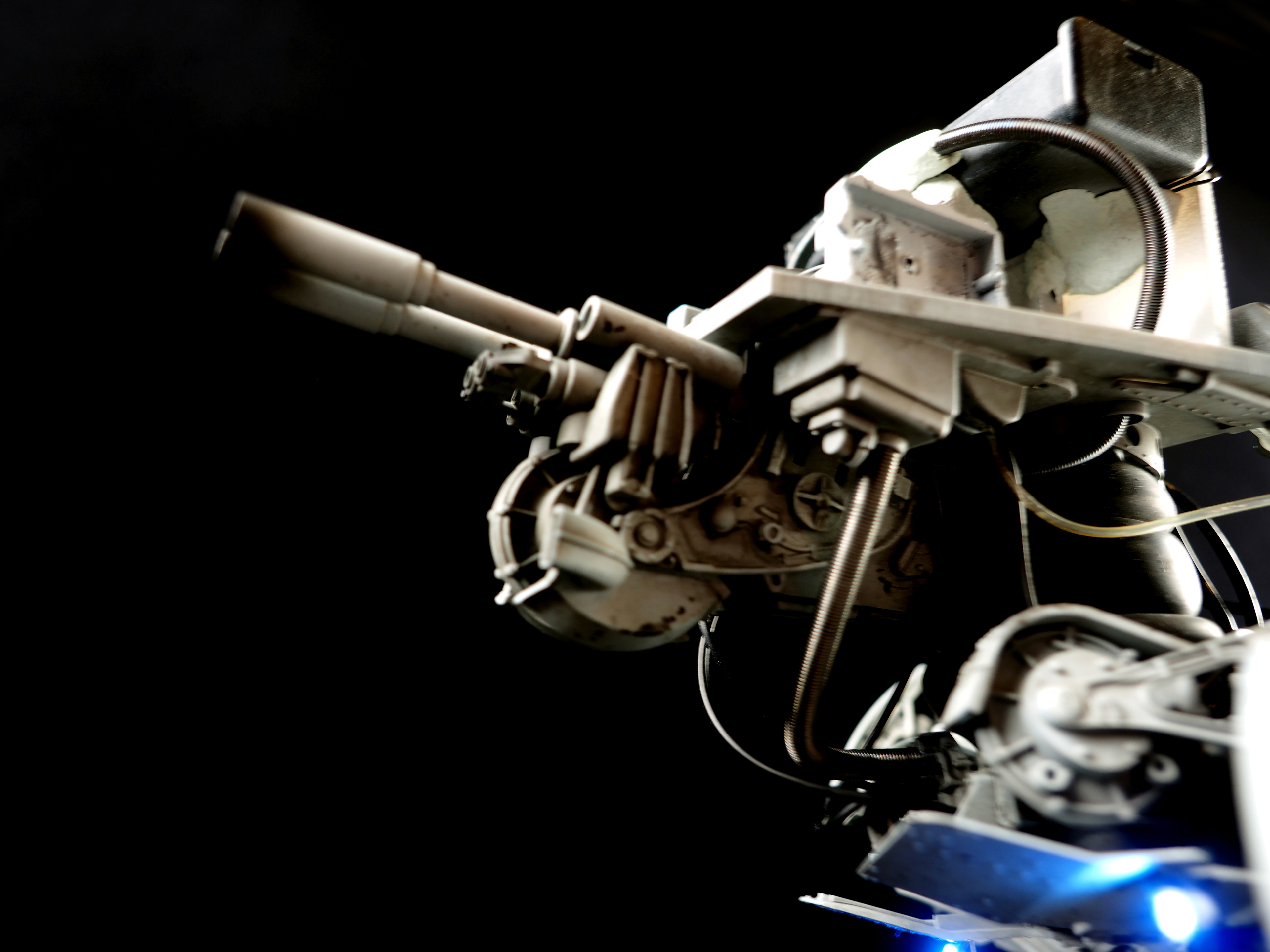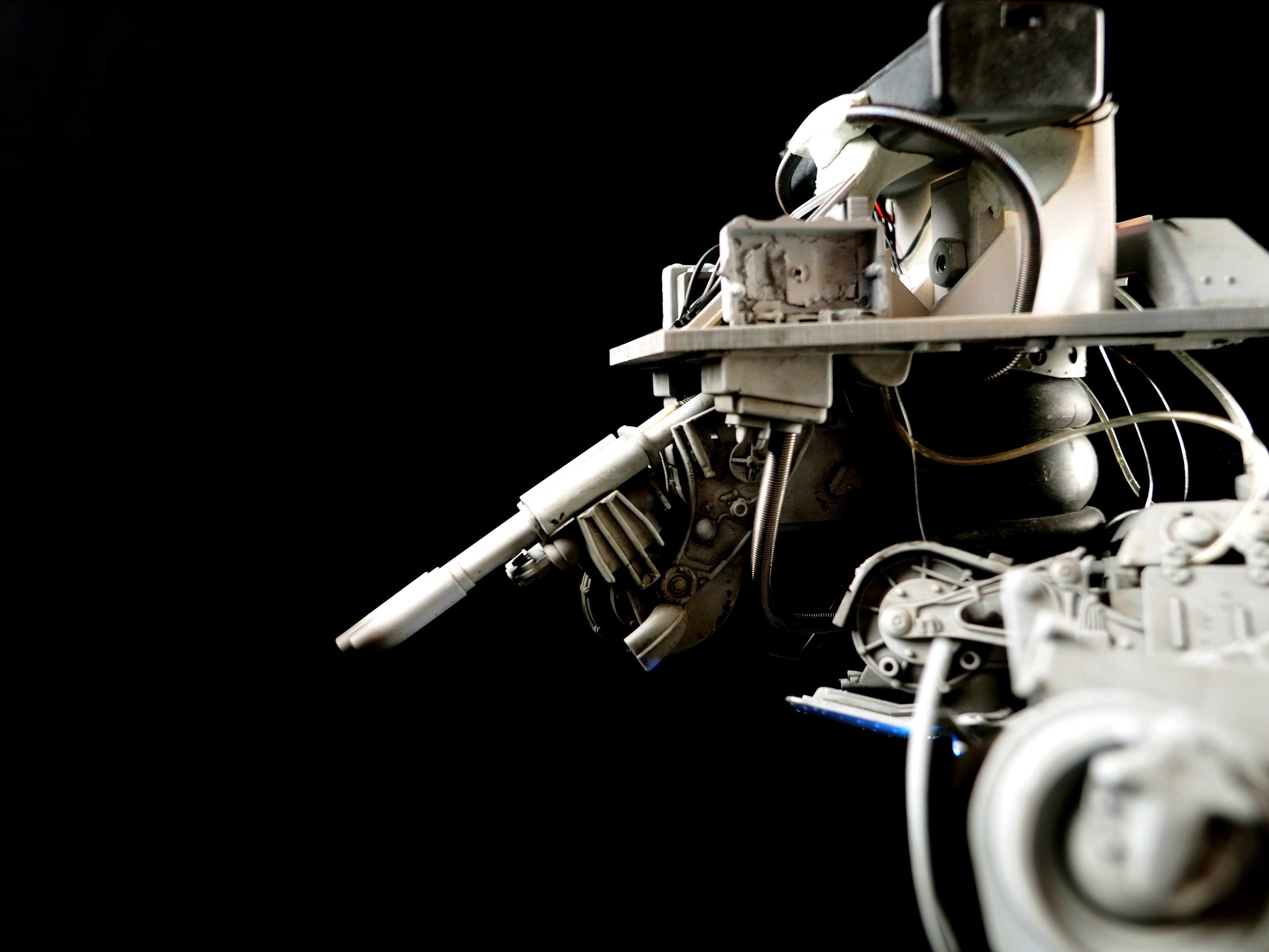 The whole model is built on a machined metal armature, with a vacuum-formed head shell made from two halves, and all styrene donor kits. Not a single piece of resin was used on this build. The feet screw into the laser cut acrylic base, the side “cheek” guns articulate in ball and socket joints, and an extra rubber tire (folded inside out per the original) was stacked to the neck, so that none of the armature is visible. Painted with acrylics and weathered with oils, this is the culmination of years of research by the community, and was a pleasure to build.