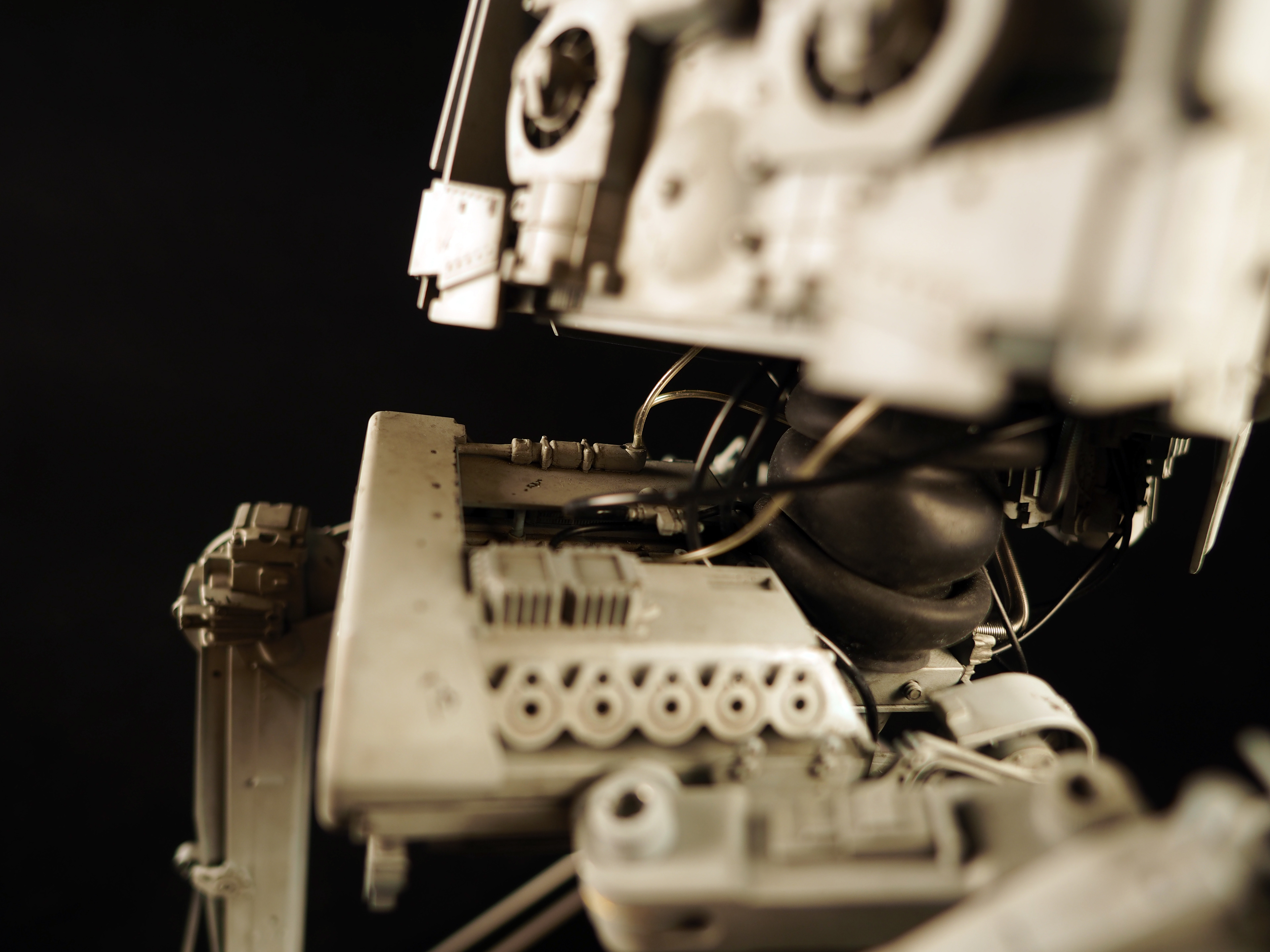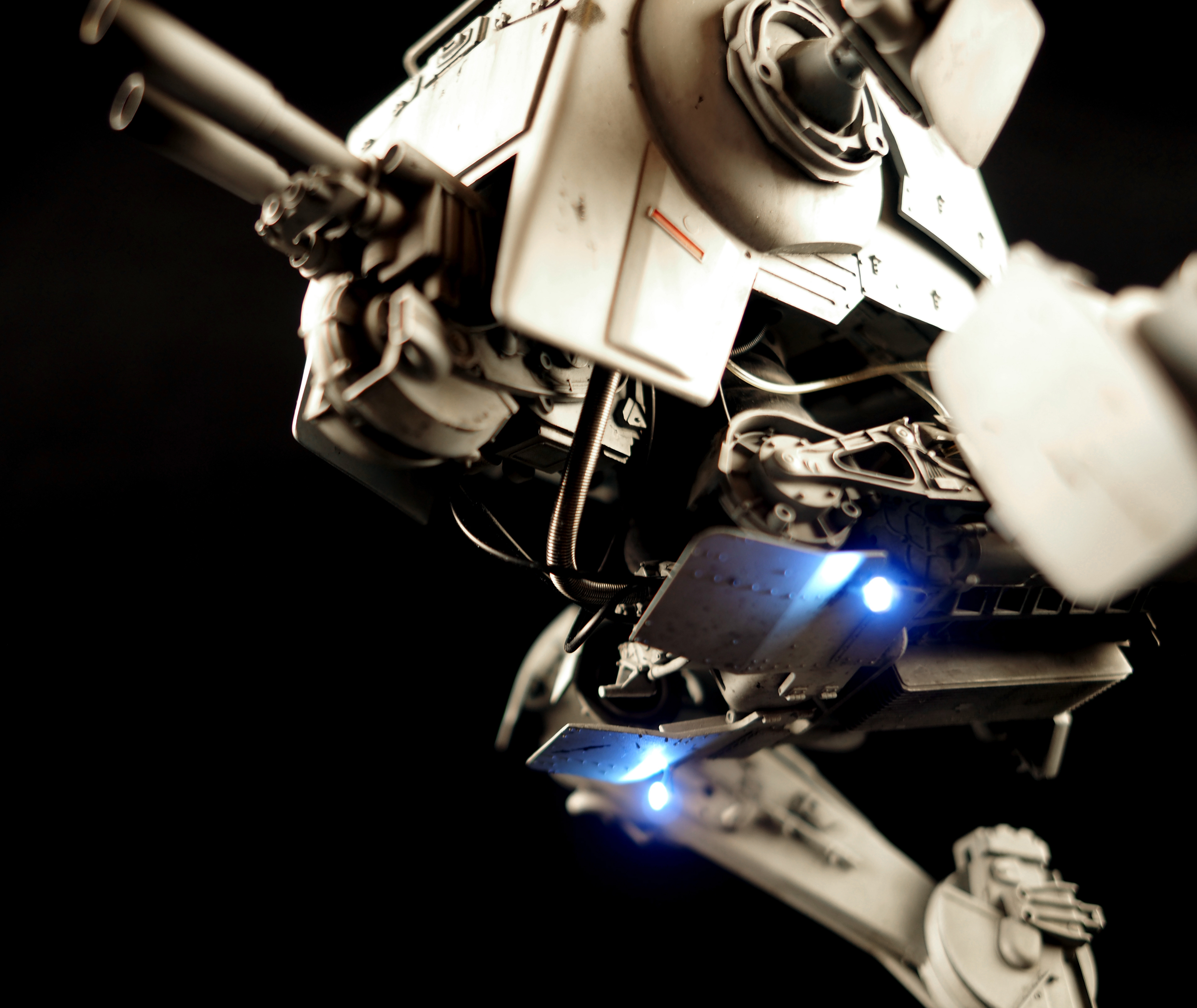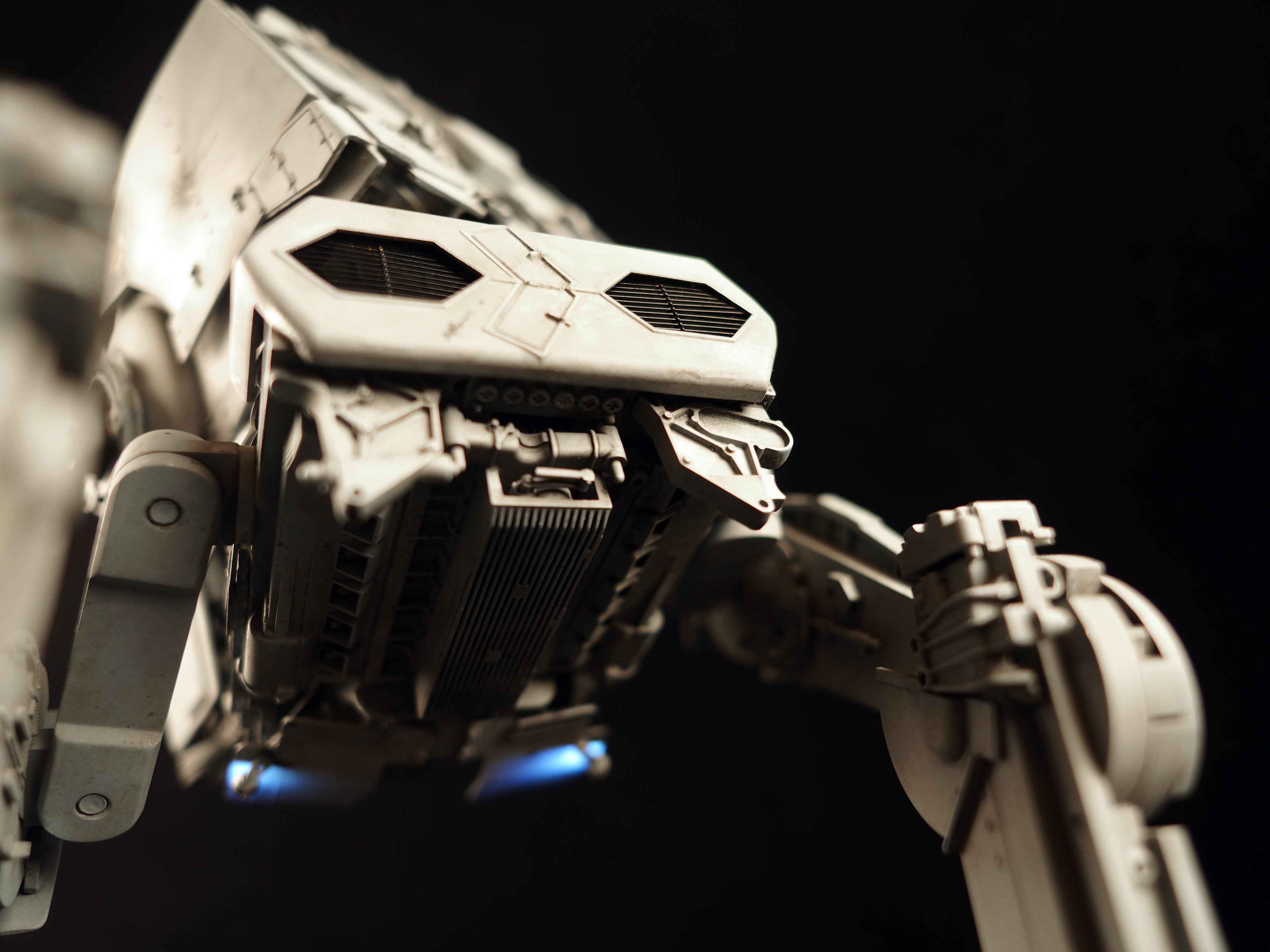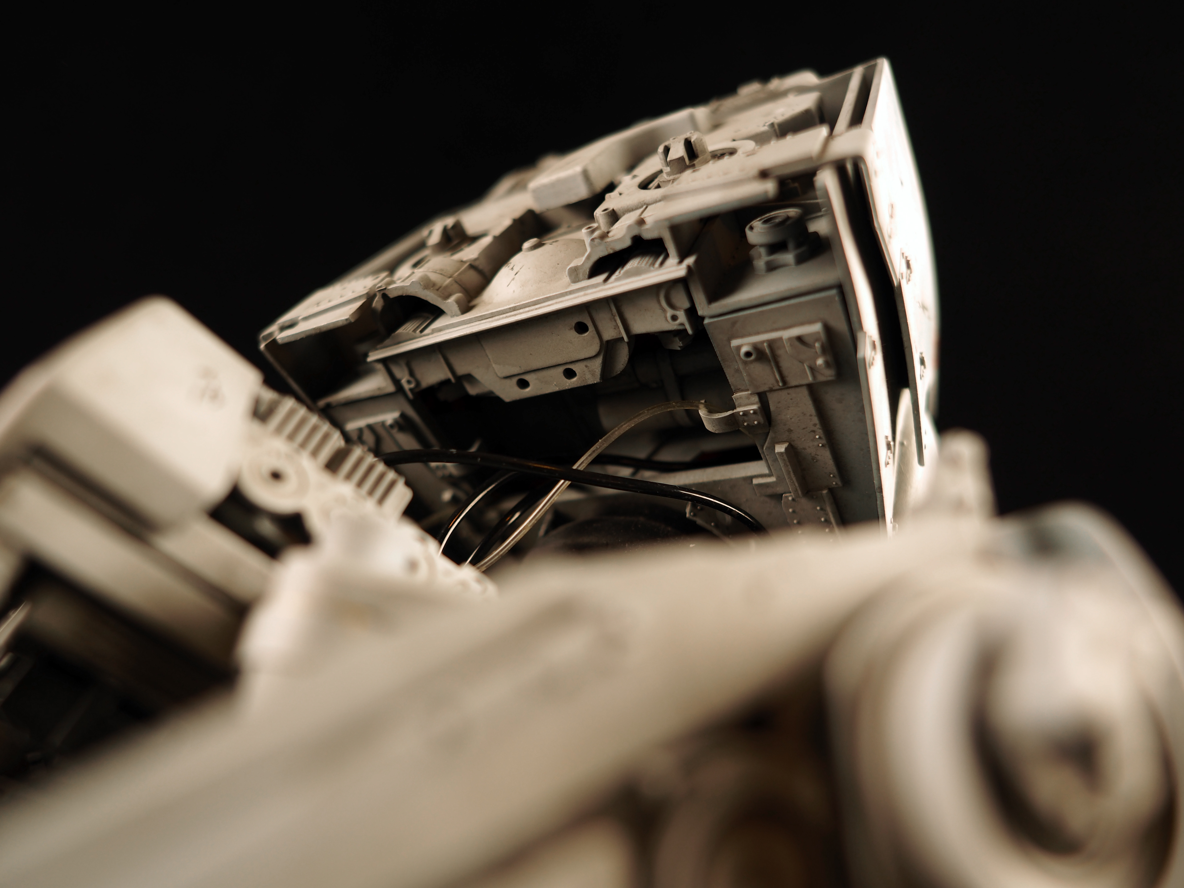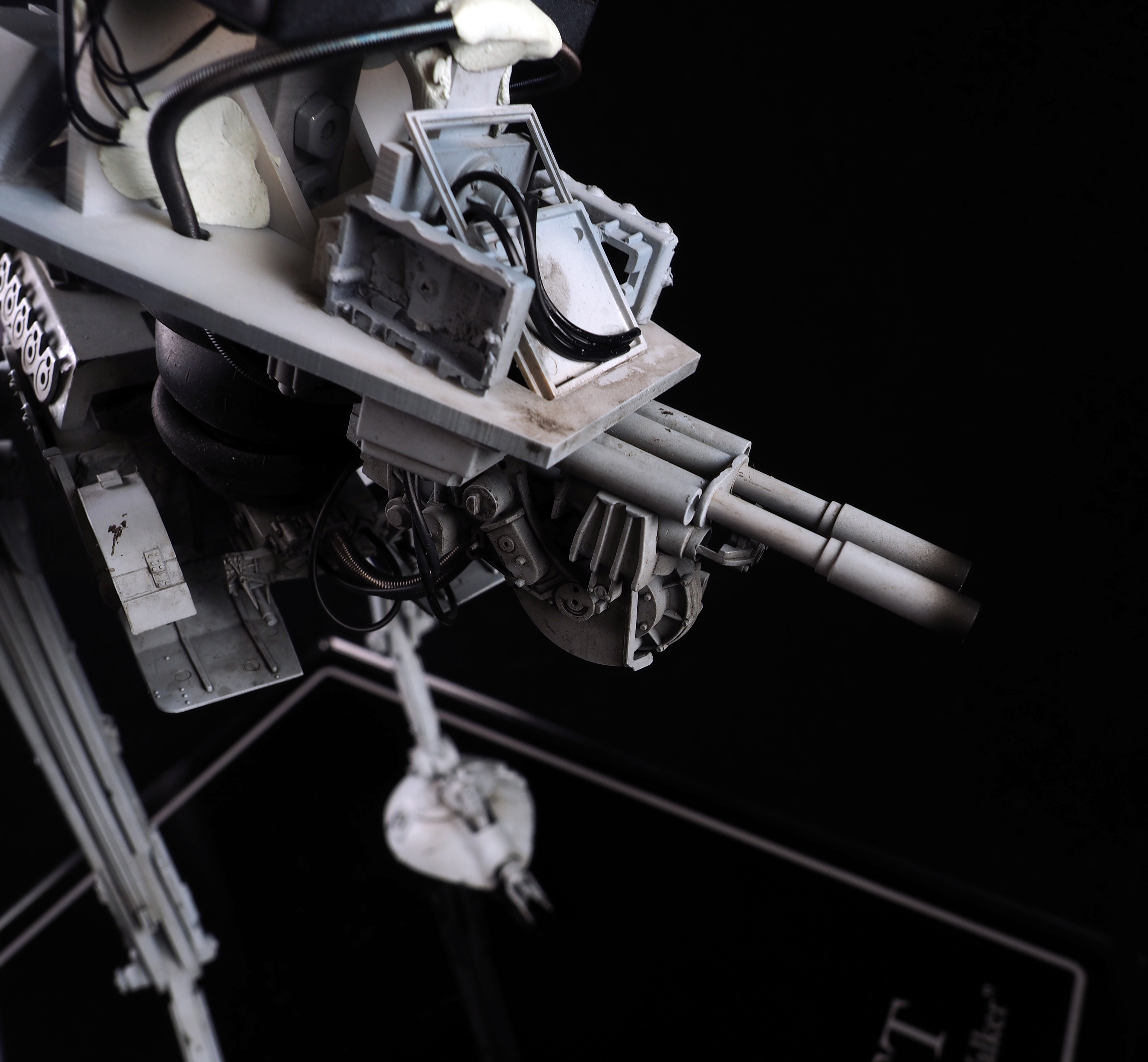 This is a replica of the AT-ST (internally referenced as “The Chicken Walker”) from The Empire Strikes Back. This is a fascinating subject to model, due to it’s unusual history. As much as I have been able to verify from first and secondhand stories from ILMers, it was built “as a joke” by Joe Johnston (or perhaps just as a fun side design, not called for at all by the story), and placed on the table with all the other designs that George Lucas would view and approve or pass on. Apparently Lucas loved it, and wanted it added to the film. The problem was, it was built as a static model , so in order to make it work for production, the model was stripped apart, and a metal articulated armature was machined by Tom St. Amand. From there it was animated for the movie, and was by some accounts a problem to work with, as parts tended to pop off on the animation stand. This design problem would be solved for Return of the Jedi by Bill George, who said he mastered the leg parts as a solid cast that was bolted to the armature, so that it stayed put. The Jedi AT-STs were also radically changed by shortening the legs, making the head a bit boxier, and many more subtle details. I have always assumed that “in-universe” it’s the same design, but the physical miniatures are quite different.The actual ESB miniature today is almost totally stripped of detail with the armature, leg base parts, and some of the head remaining. It was reported to be in “rough shape” during the Jedi production, and the archival photos taken in 1979 or so show a miniature that has somewhat melted and distorted (perhaps due to hot stage lights) and with hot glue blobs holding many things in place. The right (starboard) side of the miniature is unfinished as well, with the words “OFF CAMERA” written down the side of the leg. For this replica, I wanted to finish the model off, completing the right side. Because I cannot leave well enough alone, I also fleshed out parts of the design that were left blank or where reference doesn’t exist – the underside of the head, the inner thighs, etc. I also added lights – a subtle red glow inside the guts of the back of the head, and two spotlights that are in the spirit of both the German armor kit donors and what I feel would be a natural extension of the design. I also “completed” the underside and back of the body, where the armature mount existed and negated the opportunity for detailing. The front chin guns swivel downwards, as I also re-designed that area, hacking up the base pieces used and grafting them back together in articulated pieces.