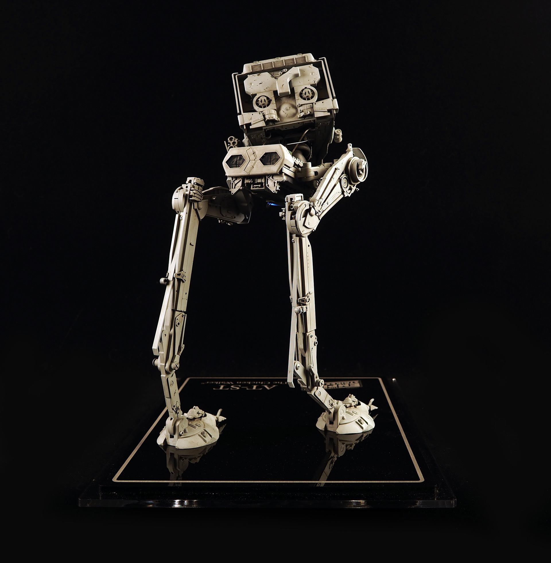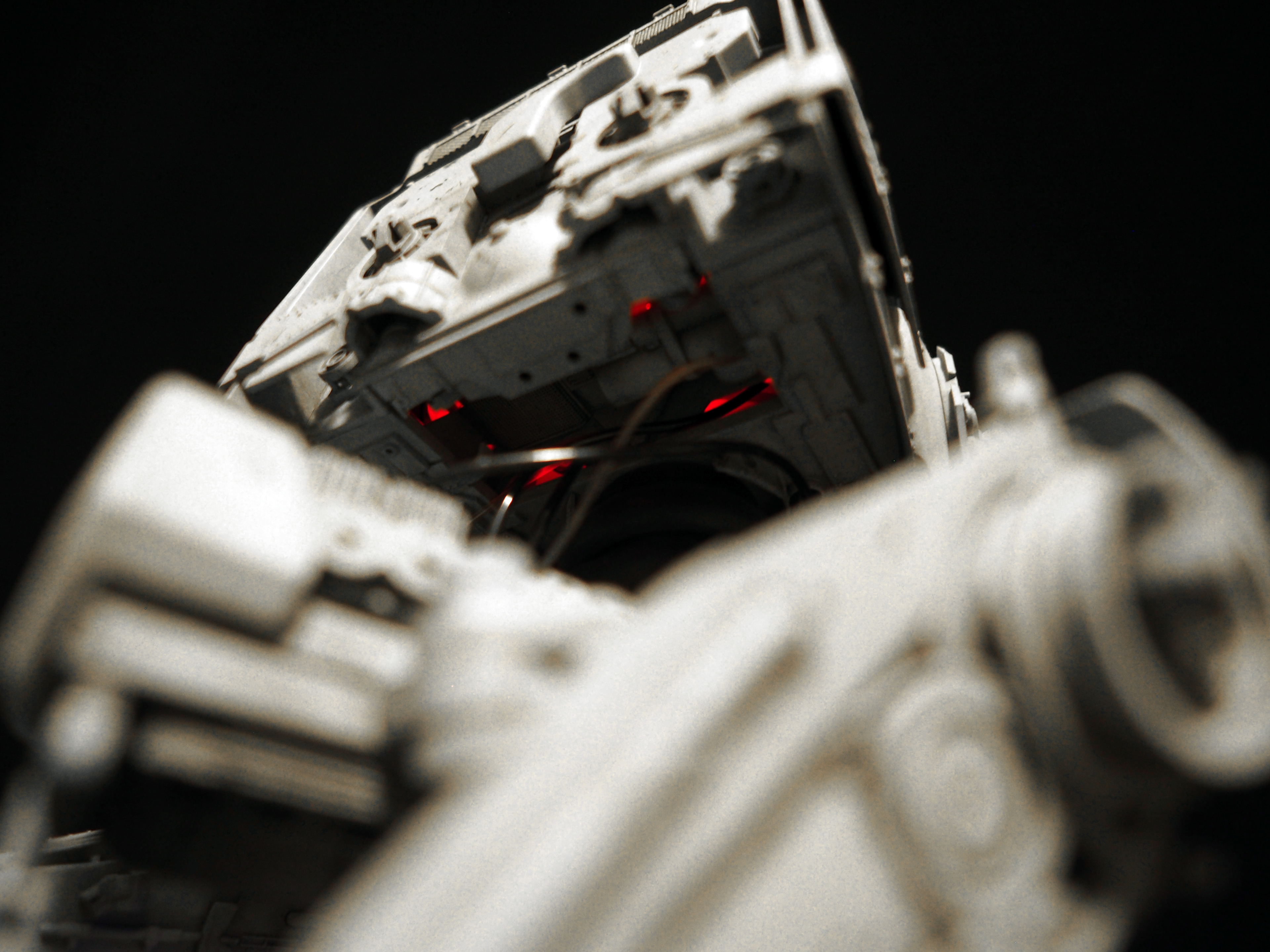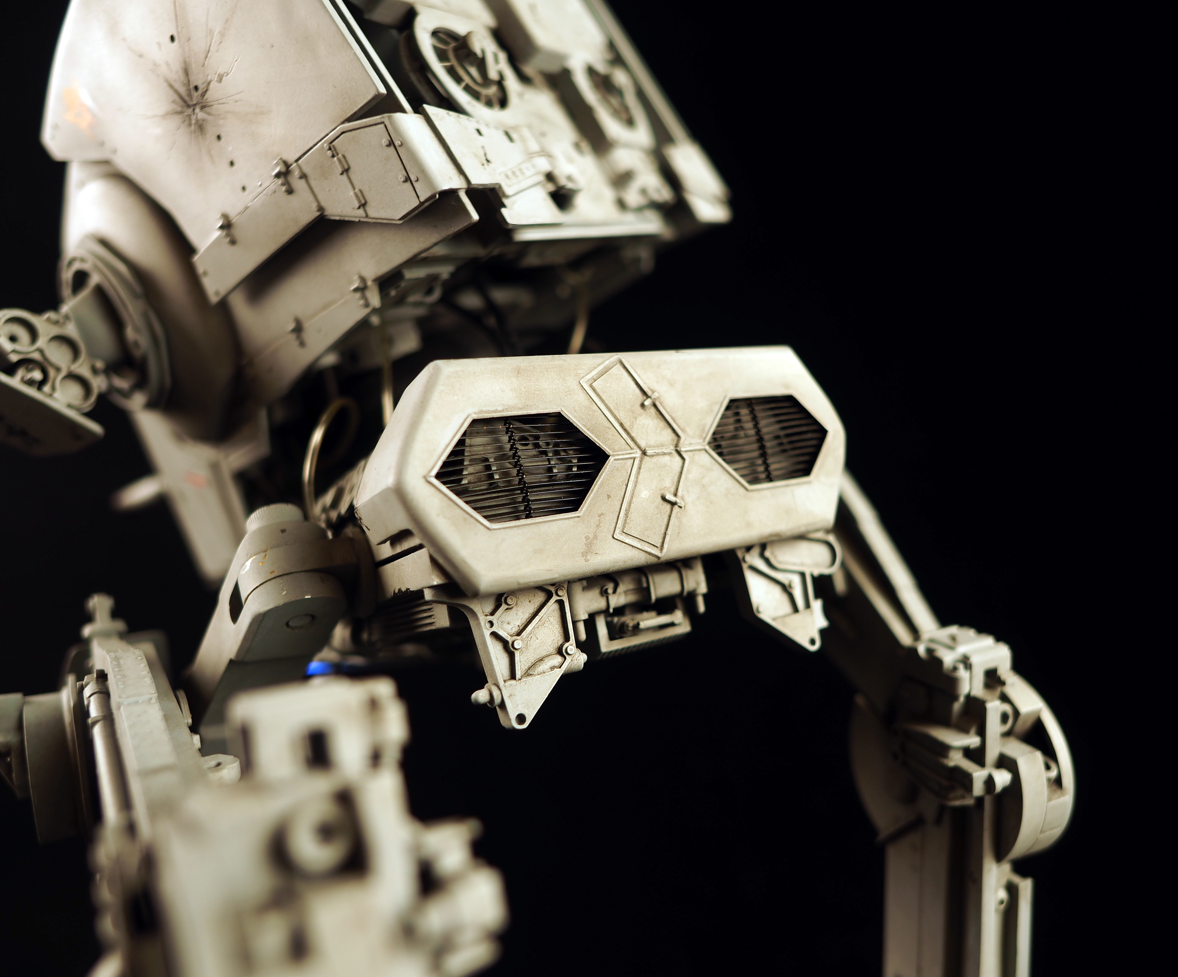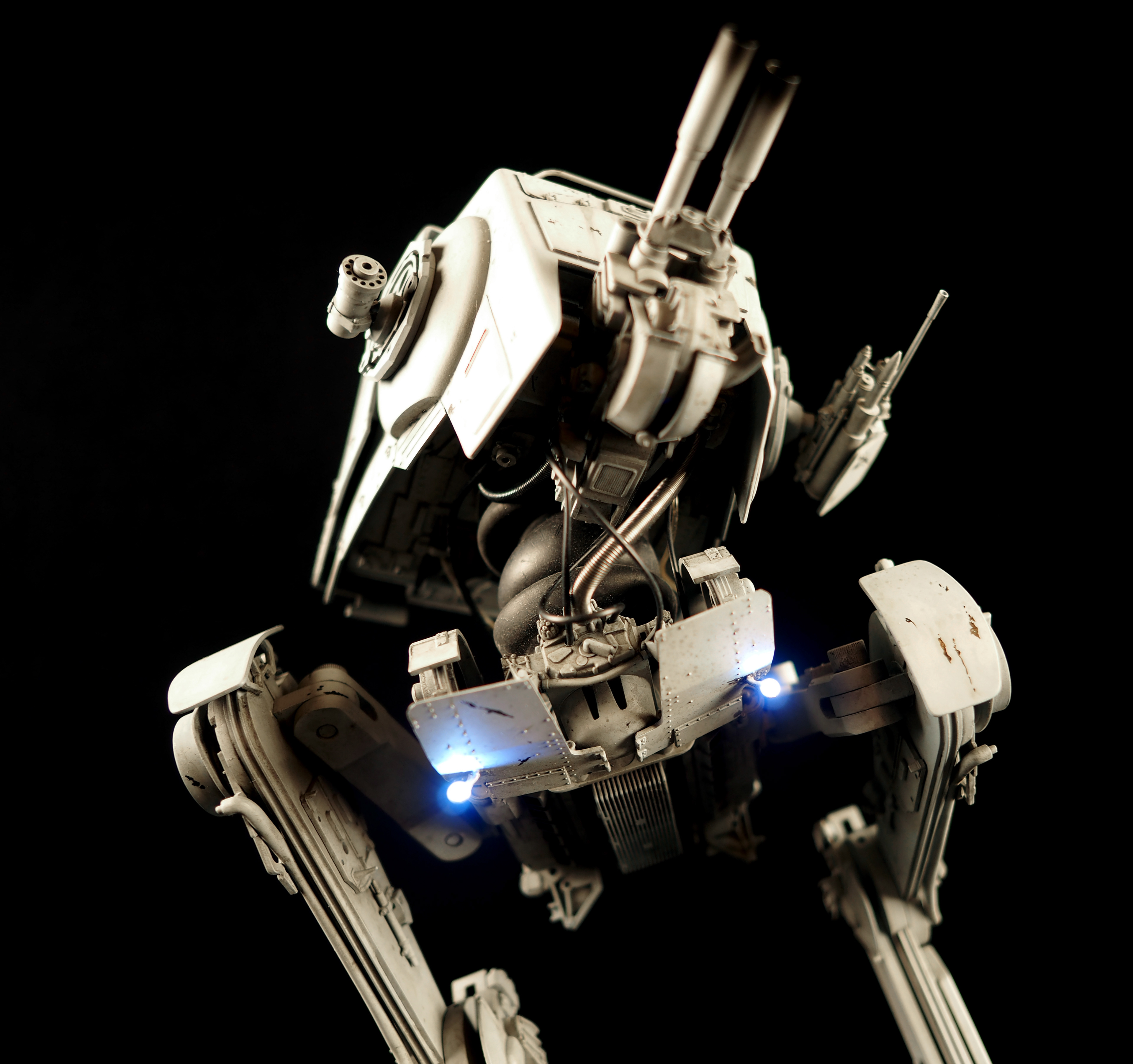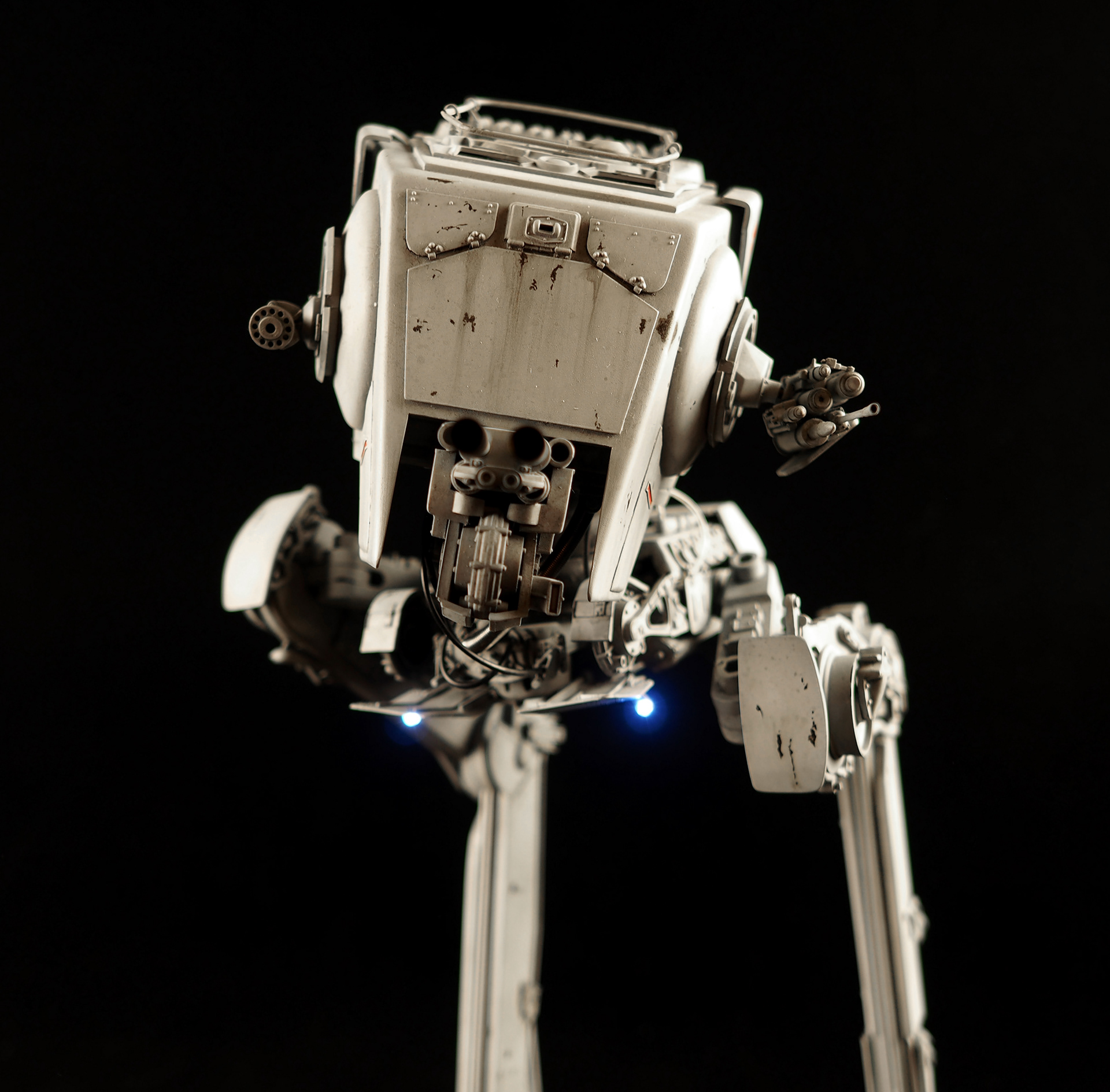 This is a replica of the AT-ST (internally referenced as “The Chicken Walker”) from The Empire Strikes Back. This is a fascinating subject to model, due to it’s unusual history. As much as I have been able to verify from first and secondhand stories from ILMers, it was built “as a joke” by Joe Johnston (or perhaps just as a fun side design, not called for at all by the story), and placed on the table with all the other designs that George Lucas would view and approve or pass on. Apparently Lucas loved it, and wanted it added to the film. The problem was, it was built as a static model , so in order to make it work for production, the model was stripped apart, and a metal articulated armature was machined by Tom St. Amand. From there it was animated for the movie, and was by some accounts a problem to work with, as parts tended to pop off on the animation stand. This design problem would be solved for Return of the Jedi by Bill George, who said he mastered the leg parts as a solid cast that was bolted to the armature, so that it stayed put. The Jedi AT-STs were also radically changed by shortening the legs, making the head a bit boxier, and many more subtle details. I have always assumed that “in-universe” it’s the same design, but the physical miniatures are quite different.The actual ESB miniature today is almost totally stripped of detail with the armature, leg base parts, and some of the head remaining. It was reported to be in “rough shape” during the Jedi production, and the archival photos taken in 1979 or so show a miniature that has somewhat melted and distorted (perhaps due to hot stage lights) and with hot glue blobs holding many things in place. The right (starboard) side of the miniature is unfinished as well, with the words “OFF CAMERA” written down the side of the leg. For this replica, I wanted to finish the model off, completing the right side. Because I cannot leave well enough alone, I also fleshed out parts of the design that were left blank or where reference doesn’t exist – the underside of the head, the inner thighs, etc. I also added lights – a subtle red glow inside the guts of the back of the head, and two spotlights that are in the spirit of both the German armor kit donors and what I feel would be a natural extension of the design. I also “completed” the underside and back of the body, where the armature mount existed and negated the opportunity for detailing. The front chin guns swivel downwards, as I also re-designed that area, hacking up the base pieces used and grafting them back together in articulated pieces.