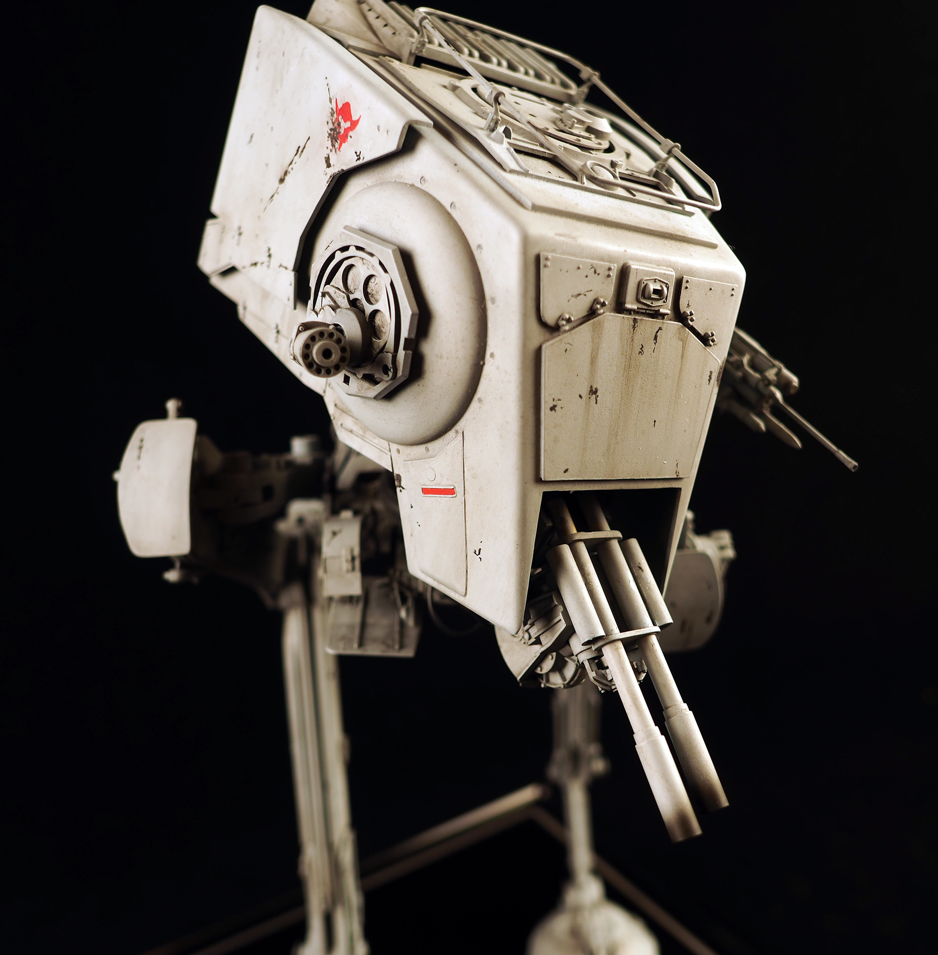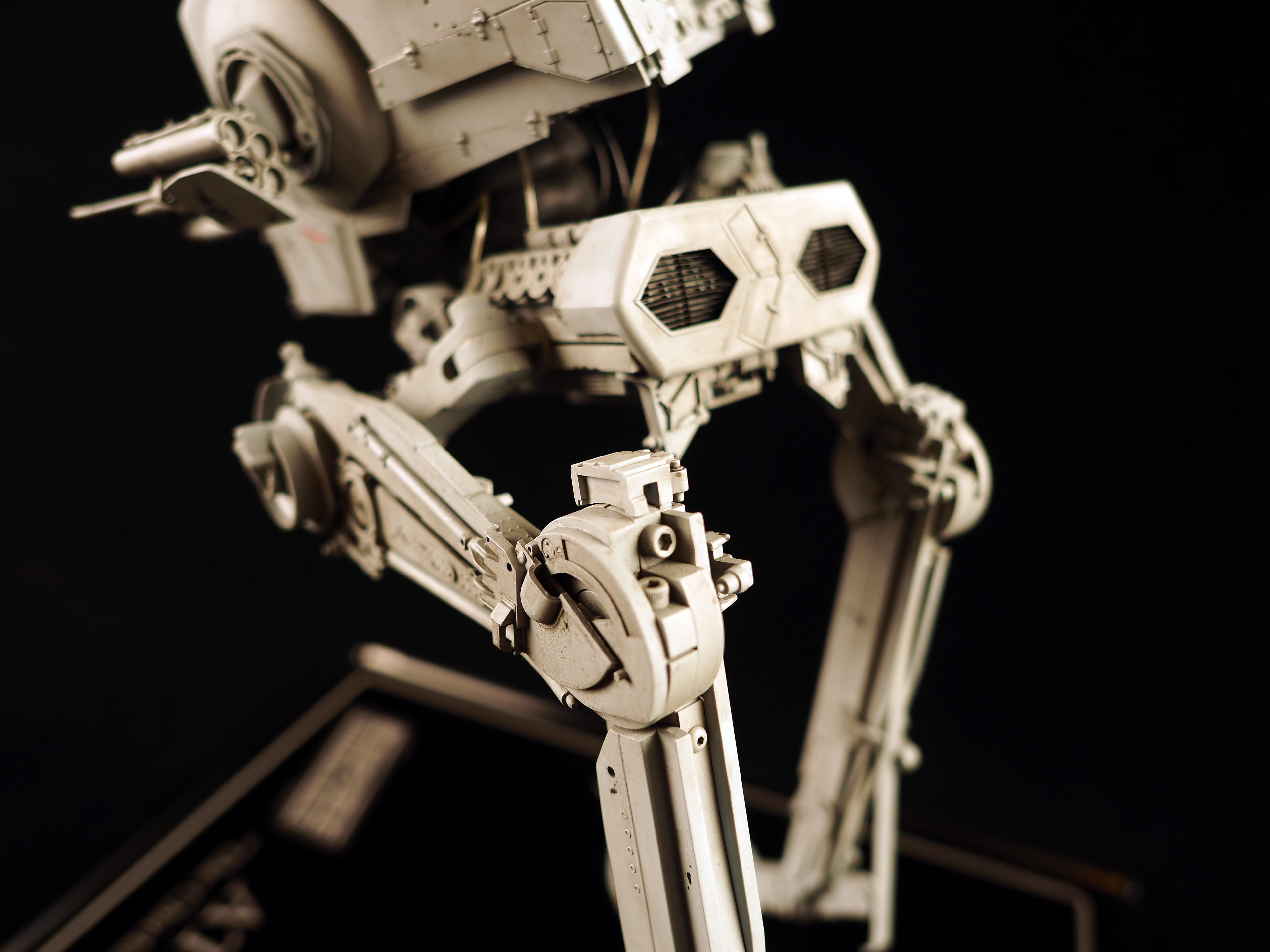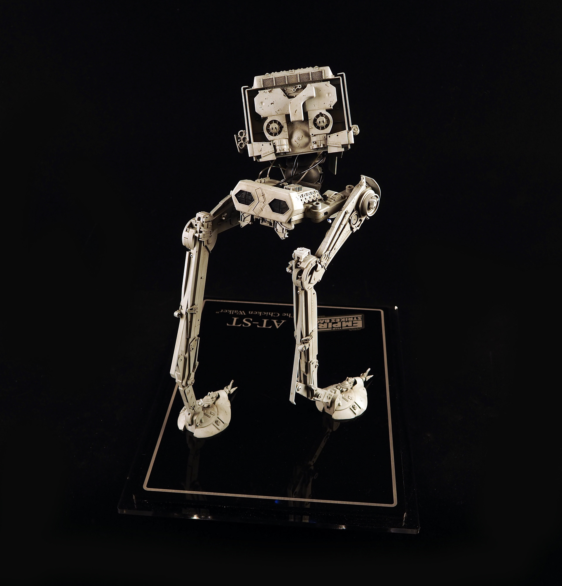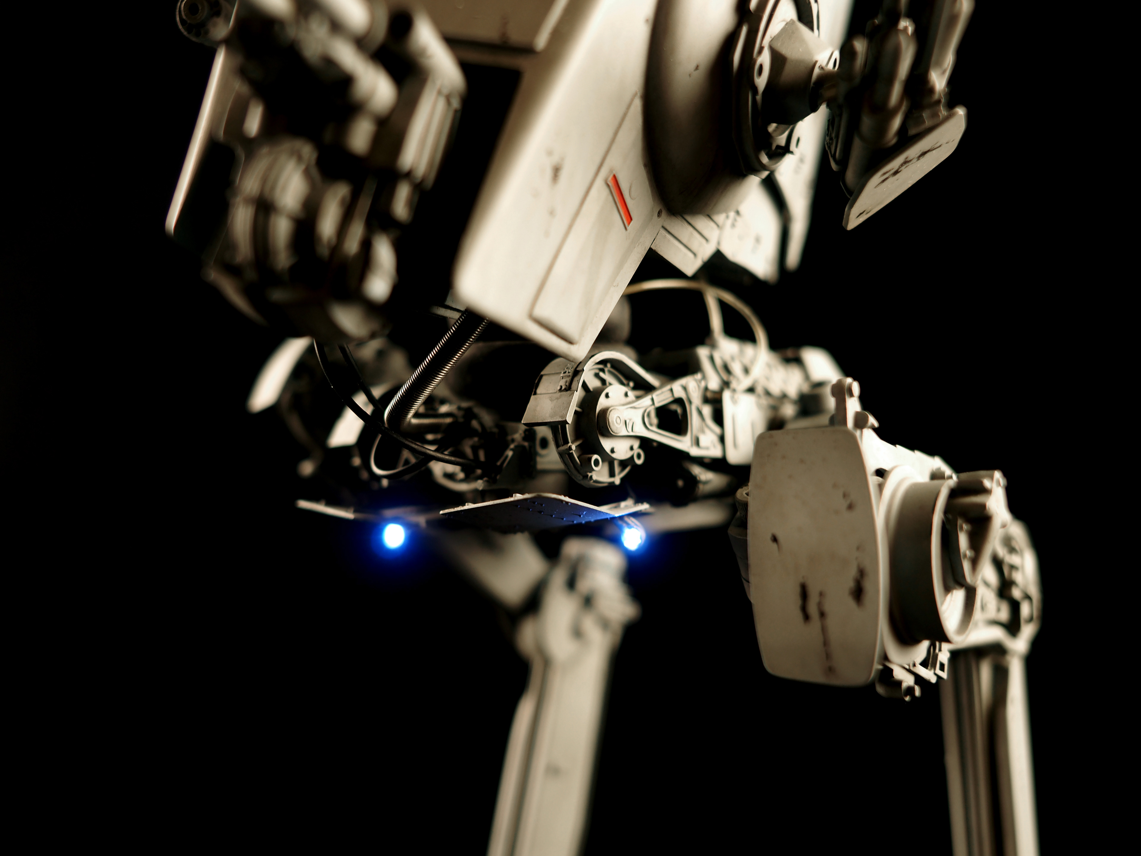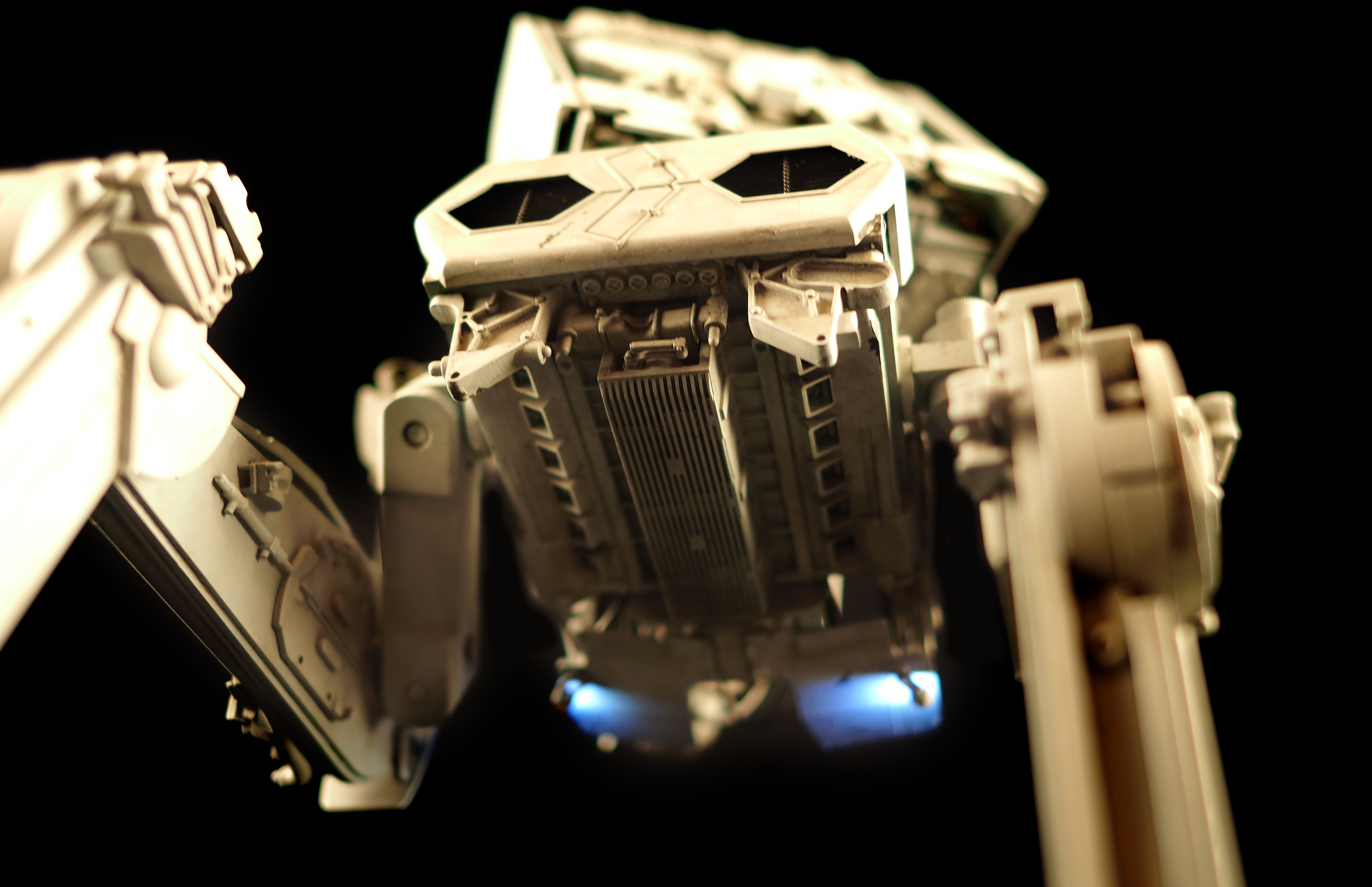 This is a replica of the AT-ST (internally referenced as “The Chicken Walker”) from The Empire Strikes Back. This is a fascinating subject to model, due to it’s unusual history. As much as I have been able to verify from first and secondhand stories from ILMers, it was built “as a joke” by Joe Johnston (or perhaps just as a fun side design, not called for at all by the story), and placed on the table with all the other designs that George Lucas would view and approve or pass on. Apparently Lucas loved it, and wanted it added to the film. The problem was, it was built as a static model , so in order to make it work for production, the model was stripped apart, and a metal articulated armature was machined by Tom St. Amand. From there it was animated for the movie, and was by some accounts a problem to work with, as parts tended to pop off on the animation stand. This design problem would be solved for Return of the Jedi by Bill George, who said he mastered the leg parts as a solid cast that was bolted to the armature, so that it stayed put. The Jedi AT-STs were also radically changed by shortening the legs, making the head a bit boxier, and many more subtle details. I have always assumed that “in-universe” it’s the same design, but the physical miniatures are quite different.The actual ESB miniature today is almost totally stripped of detail with the armature, leg base parts, and some of the head remaining. It was reported to be in “rough shape” during the Jedi production, and the archival photos taken in 1979 or so show a miniature that has somewhat melted and distorted (perhaps due to hot stage lights) and with hot glue blobs holding many things in place. The right (starboard) side of the miniature is unfinished as well, with the words “OFF CAMERA” written down the side of the leg. For this replica, I wanted to finish the model off, completing the right side. Because I cannot leave well enough alone, I also fleshed out parts of the design that were left blank or where reference doesn’t exist – the underside of the head, the inner thighs, etc. I also added lights – a subtle red glow inside the guts of the back of the head, and two spotlights that are in the spirit of both the German armor kit donors and what I feel would be a natural extension of the design. I also “completed” the underside and back of the body, where the armature mount existed and negated the opportunity for detailing. The front chin guns swivel downwards, as I also re-designed that area, hacking up the base pieces used and grafting them back together in articulated pieces.