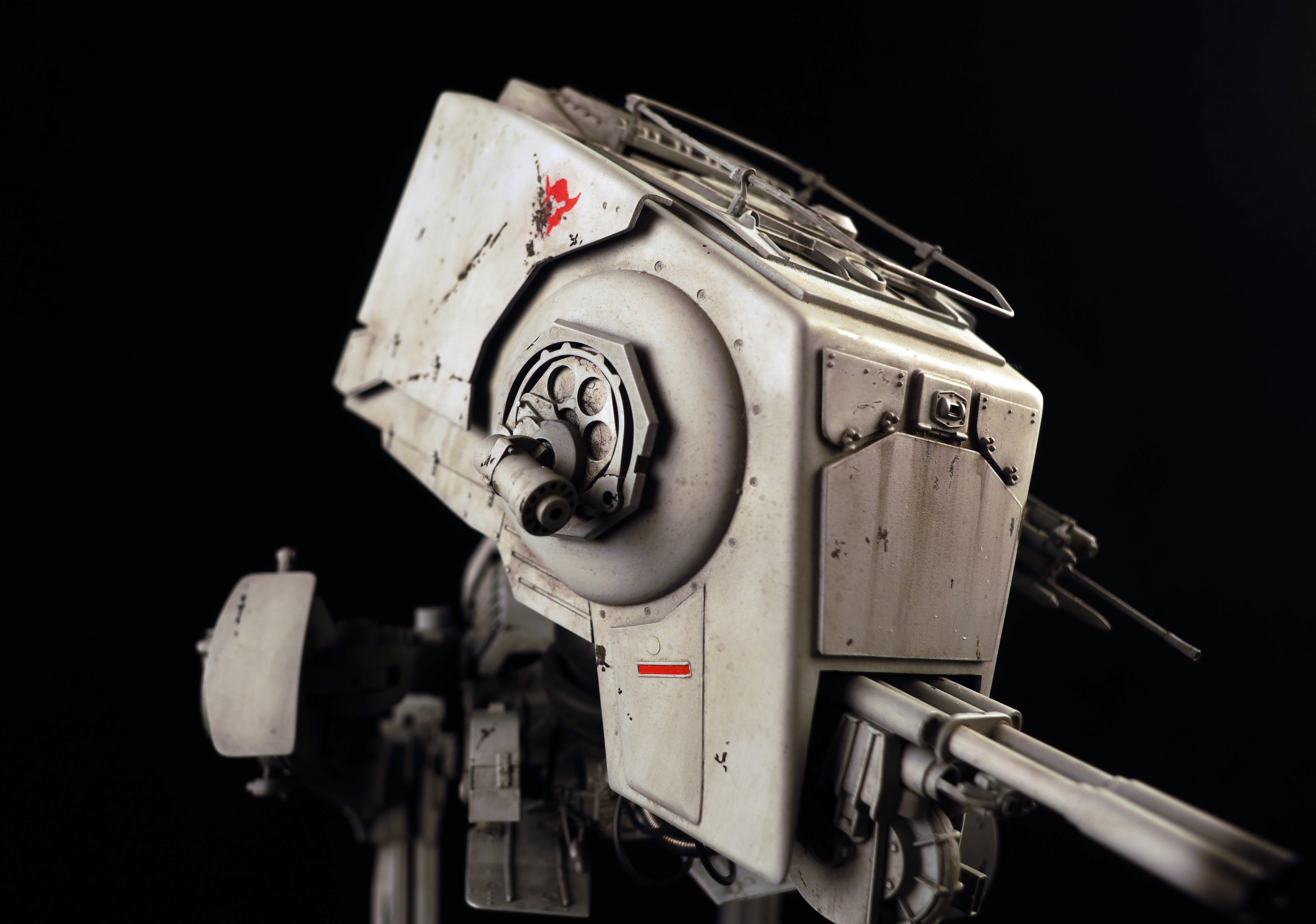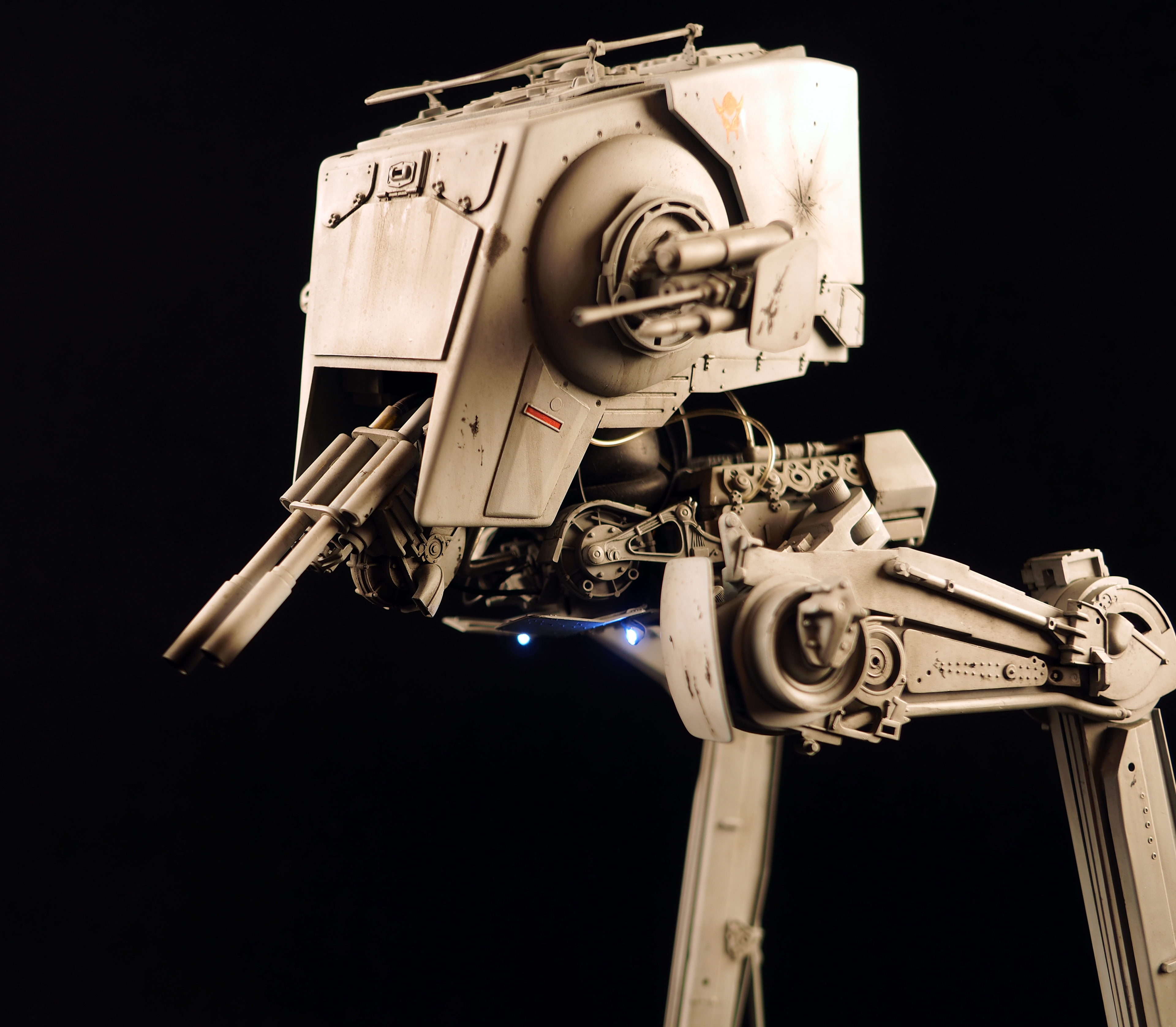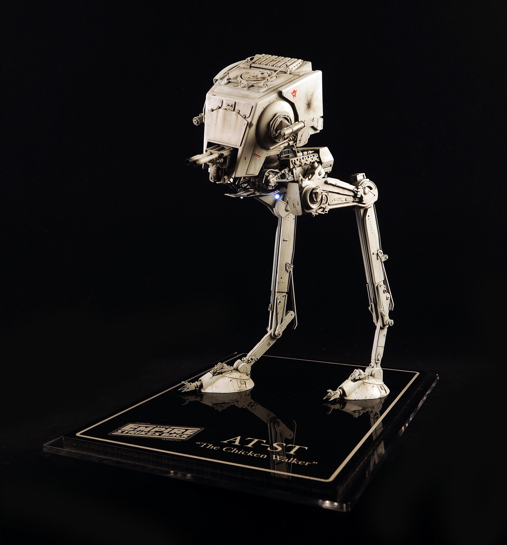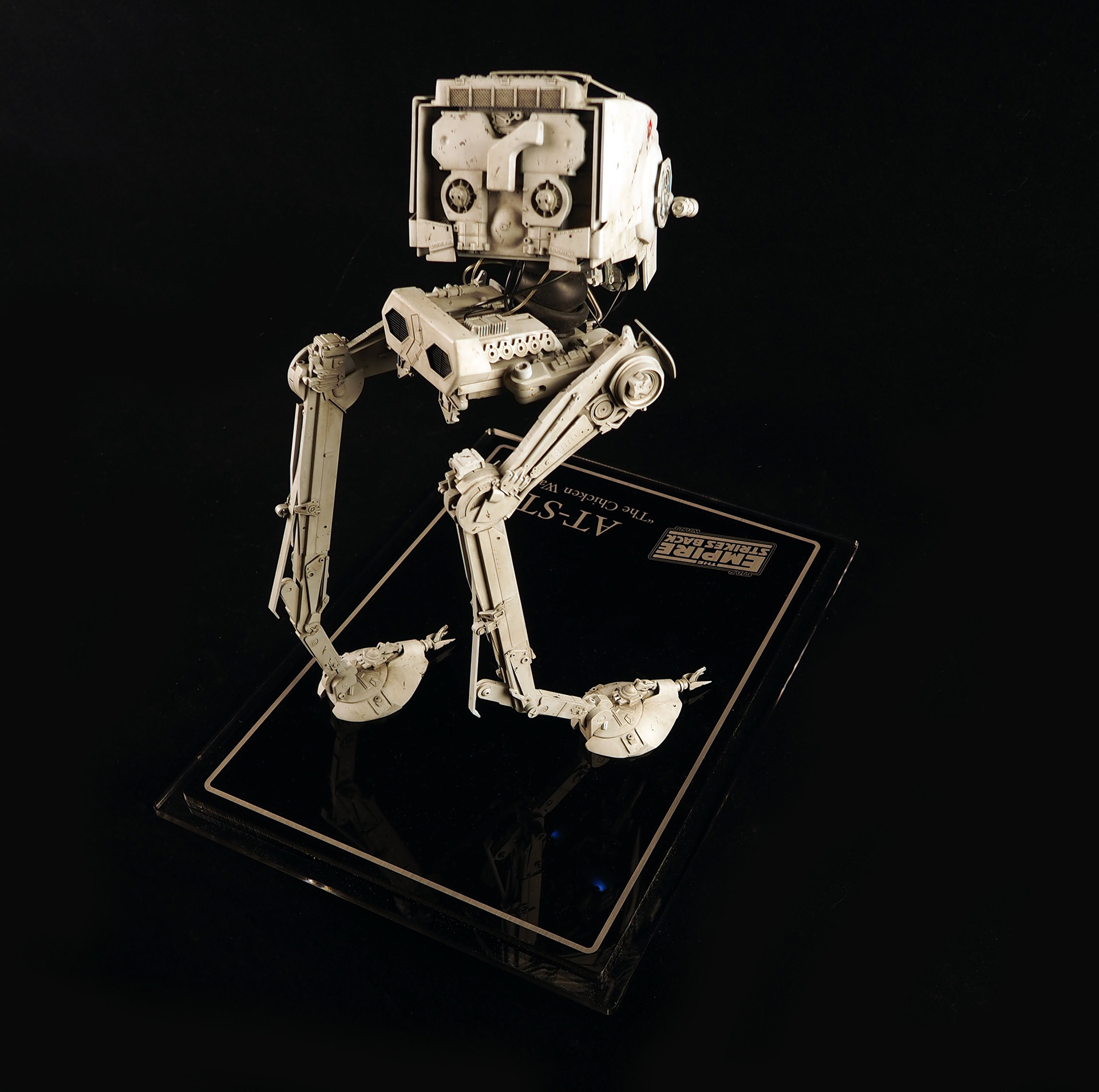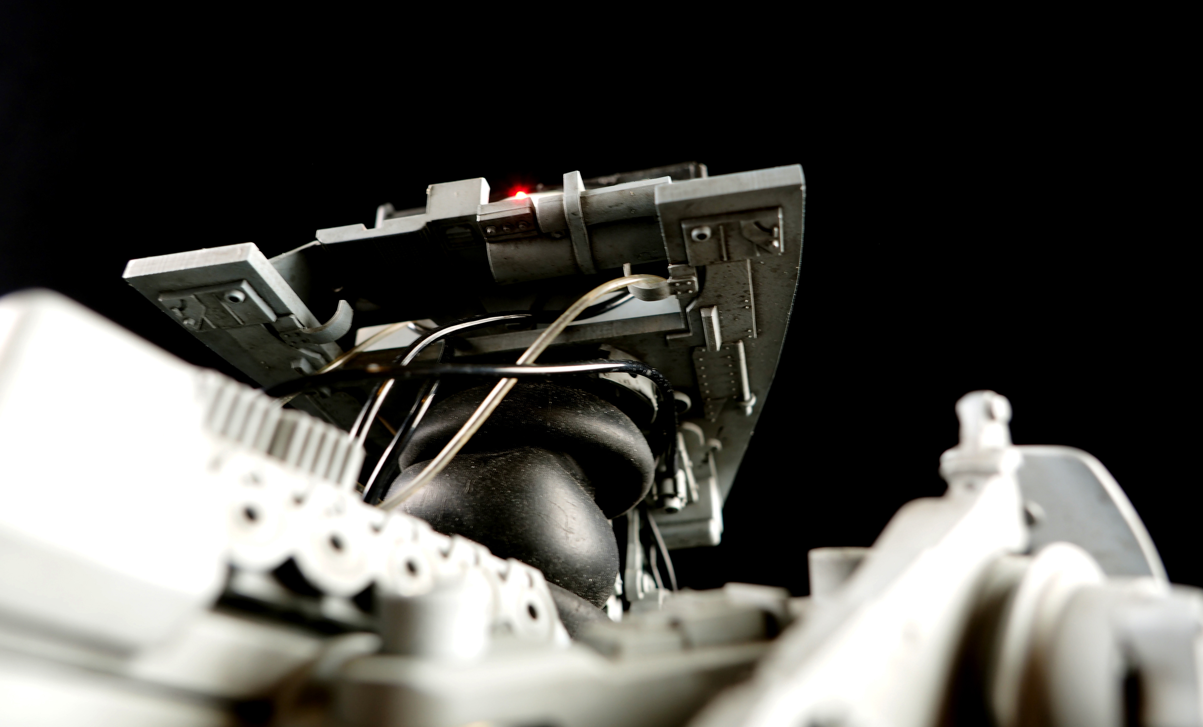 This is a replica of the AT-ST (internally referenced as “The Chicken Walker”) from The Empire Strikes Back. This is a fascinating subject to model, due to it’s unusual history. As much as I have been able to verify from first and secondhand stories from ILMers, it was built “as a joke” by Joe Johnston (or perhaps just as a fun side design, not called for at all by the story), and placed on the table with all the other designs that George Lucas would view and approve or pass on. Apparently Lucas loved it, and wanted it added to the film. The problem was, it was built as a static model , so in order to make it work for production, the model was stripped apart, and a metal articulated armature was machined by Tom St. Amand. From there it was animated for the movie, and was by some accounts a problem to work with, as parts tended to pop off on the animation stand. This design problem would be solved for Return of the Jedi by Bill George, who said he mastered the leg parts as a solid cast that was bolted to the armature, so that it stayed put. The Jedi AT-STs were also radically changed by shortening the legs, making the head a bit boxier, and many more subtle details. I have always assumed that “in-universe” it’s the same design, but the physical miniatures are quite different.The actual ESB miniature today is almost totally stripped of detail with the armature, leg base parts, and some of the head remaining. It was reported to be in “rough shape” during the Jedi production, and the archival photos taken in 1979 or so show a miniature that has somewhat melted and distorted (perhaps due to hot stage lights) and with hot glue blobs holding many things in place. The right (starboard) side of the miniature is unfinished as well, with the words “OFF CAMERA” written down the side of the leg. For this replica, I wanted to finish the model off, completing the right side. Because I cannot leave well enough alone, I also fleshed out parts of the design that were left blank or where reference doesn’t exist – the underside of the head, the inner thighs, etc. I also added lights – a subtle red glow inside the guts of the back of the head, and two spotlights that are in the spirit of both the German armor kit donors and what I feel would be a natural extension of the design. I also “completed” the underside and back of the body, where the armature mount existed and negated the opportunity for detailing. The front chin guns swivel downwards, as I also re-designed that area, hacking up the base pieces used and grafting them back together in articulated pieces.