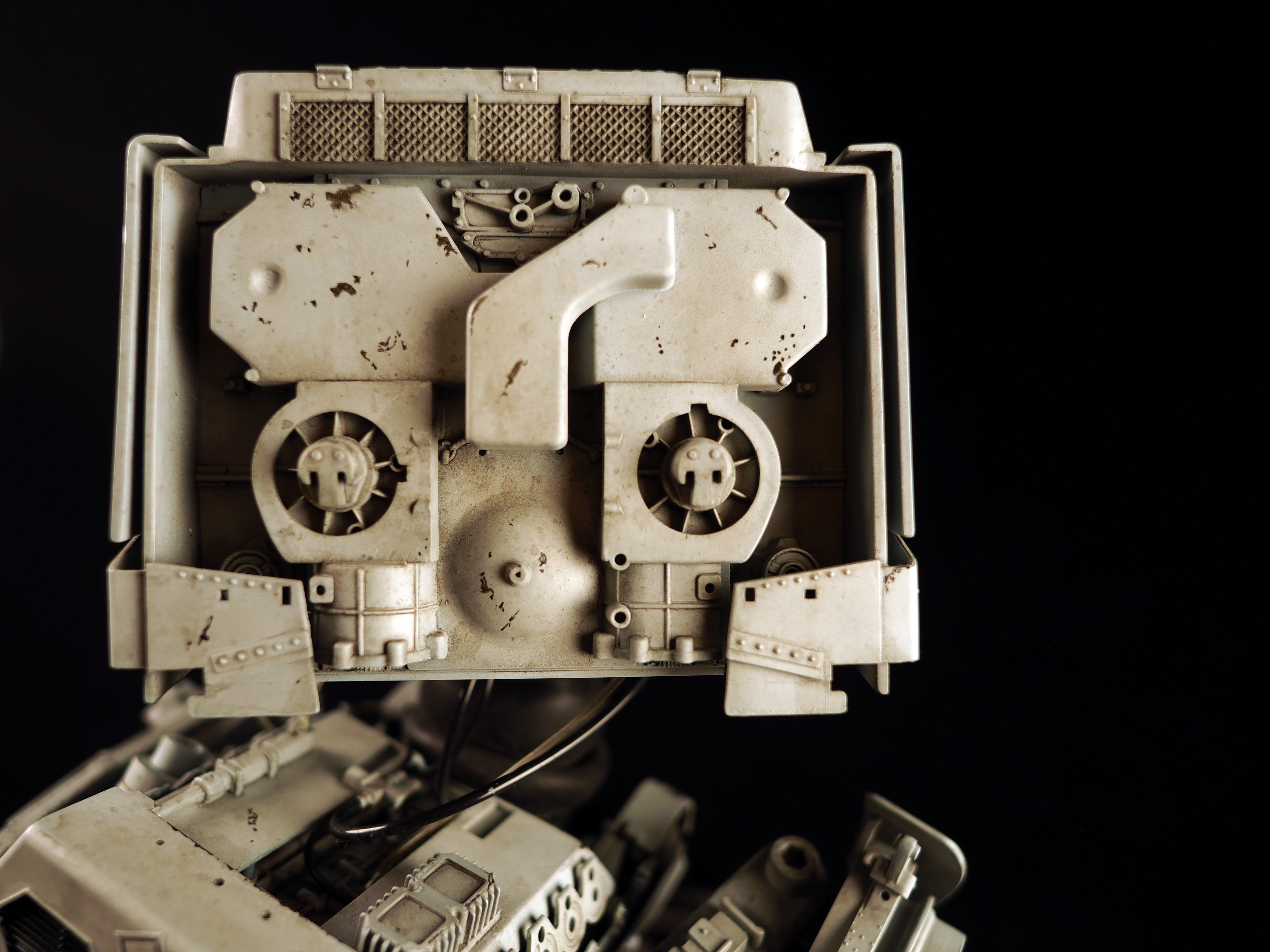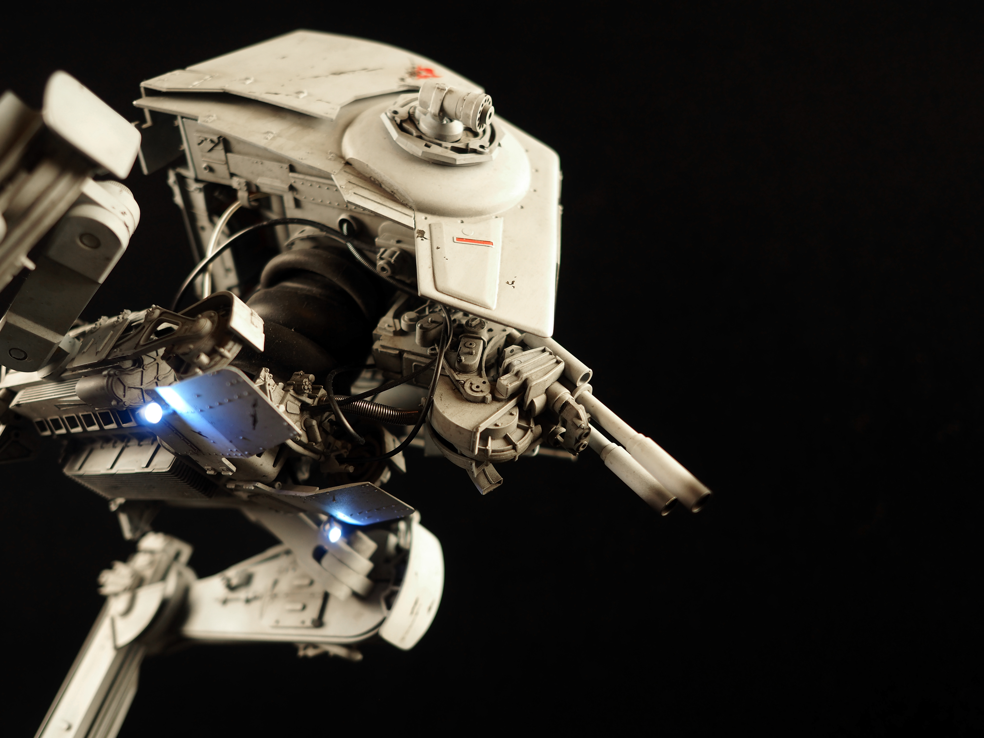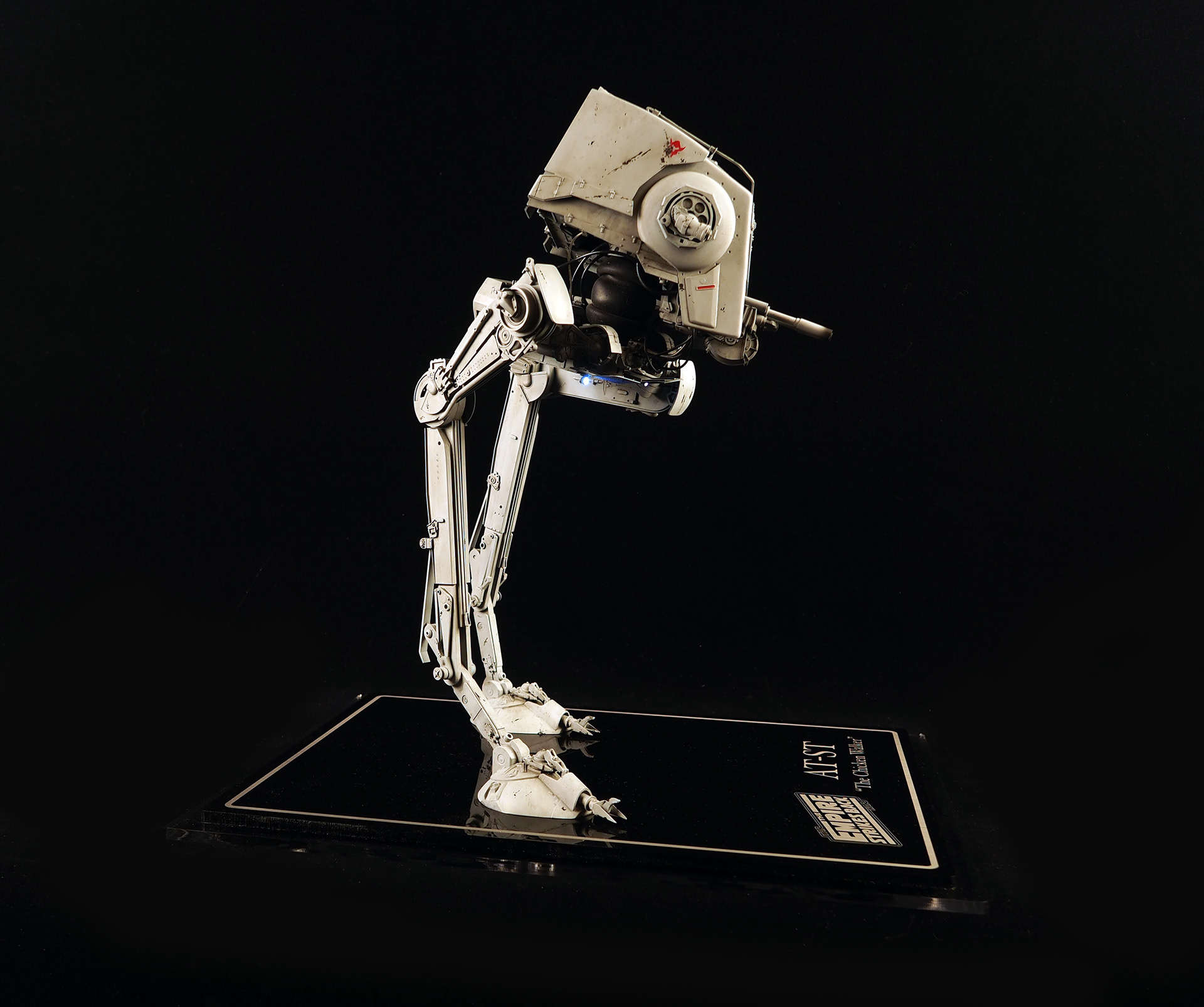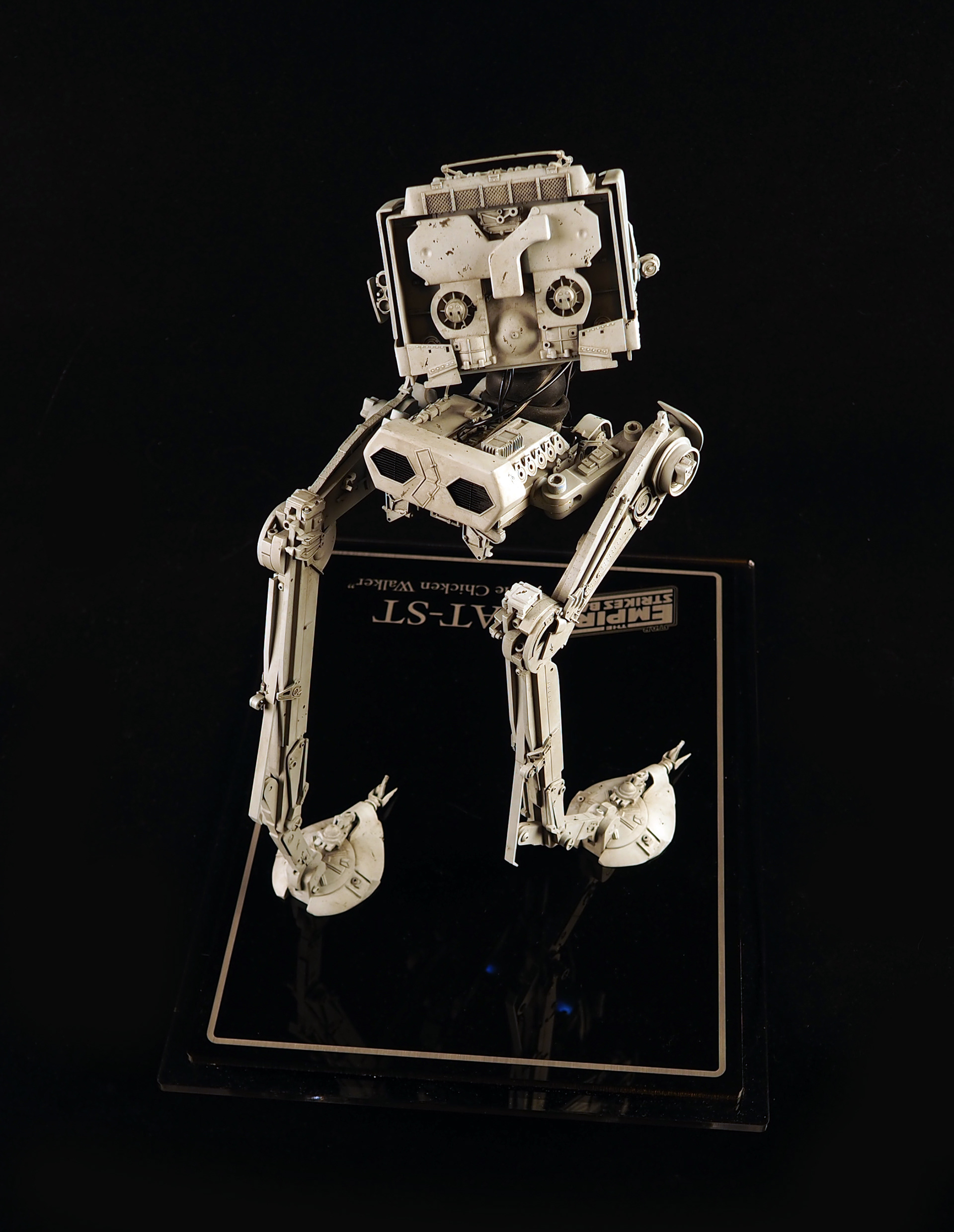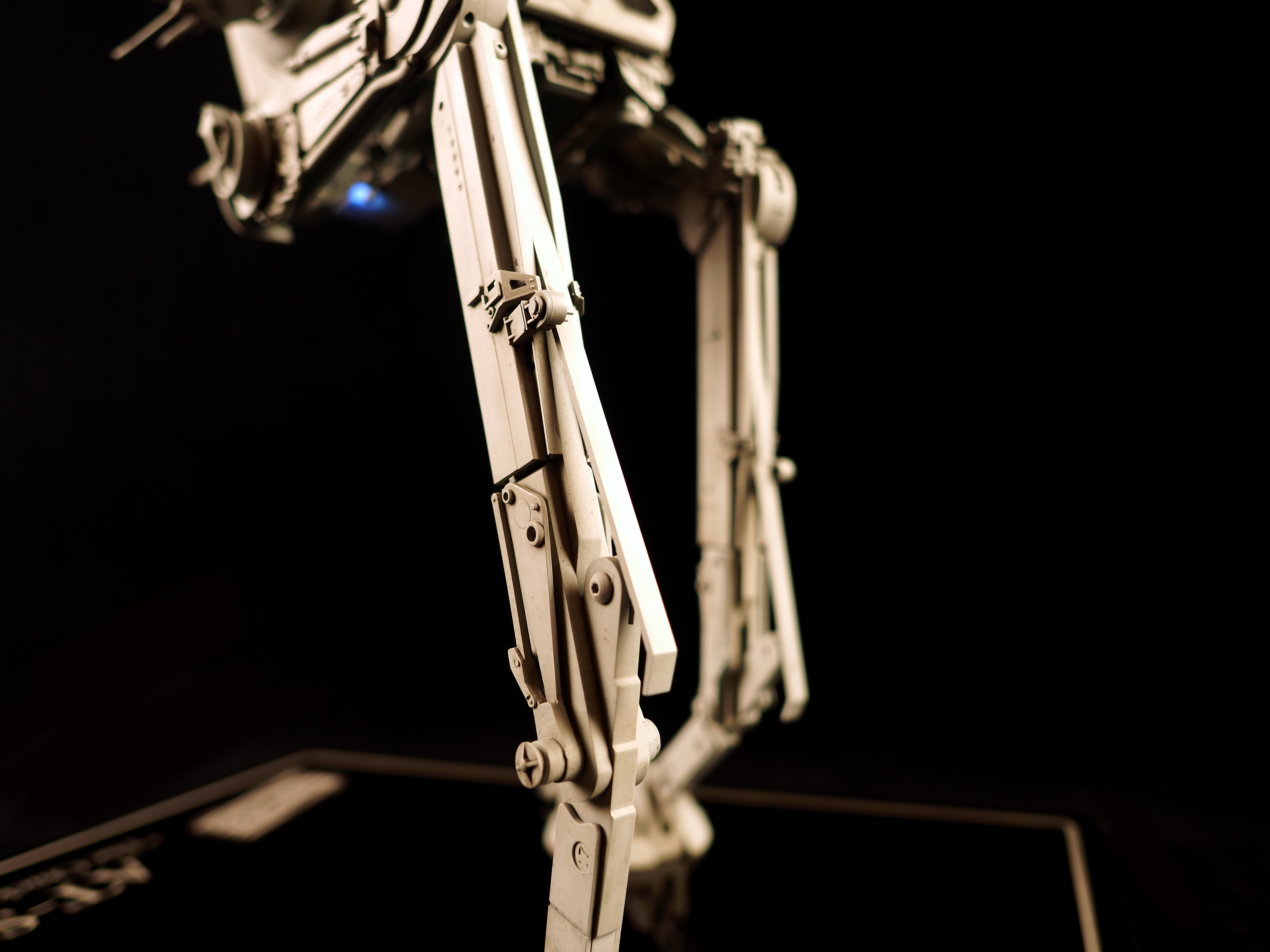 This is a replica of the AT-ST (internally referenced as “The Chicken Walker”) from The Empire Strikes Back. This is a fascinating subject to model, due to it’s unusual history. As much as I have been able to verify from first and secondhand stories from ILMers, it was built “as a joke” by Joe Johnston (or perhaps just as a fun side design, not called for at all by the story), and placed on the table with all the other designs that George Lucas would view and approve or pass on. Apparently Lucas loved it, and wanted it added to the film. The problem was, it was built as a static model , so in order to make it work for production, the model was stripped apart, and a metal articulated armature was machined by Tom St. Amand. From there it was animated for the movie, and was by some accounts a problem to work with, as parts tended to pop off on the animation stand. This design problem would be solved for Return of the Jedi by Bill George, who said he mastered the leg parts as a solid cast that was bolted to the armature, so that it stayed put. The Jedi AT-STs were also radically changed by shortening the legs, making the head a bit boxier, and many more subtle details. I have always assumed that “in-universe” it’s the same design, but the physical miniatures are quite different.The actual ESB miniature today is almost totally stripped of detail with the armature, leg base parts, and some of the head remaining. It was reported to be in “rough shape” during the Jedi production, and the archival photos taken in 1979 or so show a miniature that has somewhat melted and distorted (perhaps due to hot stage lights) and with hot glue blobs holding many things in place. The right (starboard) side of the miniature is unfinished as well, with the words “OFF CAMERA” written down the side of the leg. For this replica, I wanted to finish the model off, completing the right side. Because I cannot leave well enough alone, I also fleshed out parts of the design that were left blank or where reference doesn’t exist – the underside of the head, the inner thighs, etc. I also added lights – a subtle red glow inside the guts of the back of the head, and two spotlights that are in the spirit of both the German armor kit donors and what I feel would be a natural extension of the design. I also “completed” the underside and back of the body, where the armature mount existed and negated the opportunity for detailing. The front chin guns swivel downwards, as I also re-designed that area, hacking up the base pieces used and grafting them back together in articulated pieces.
