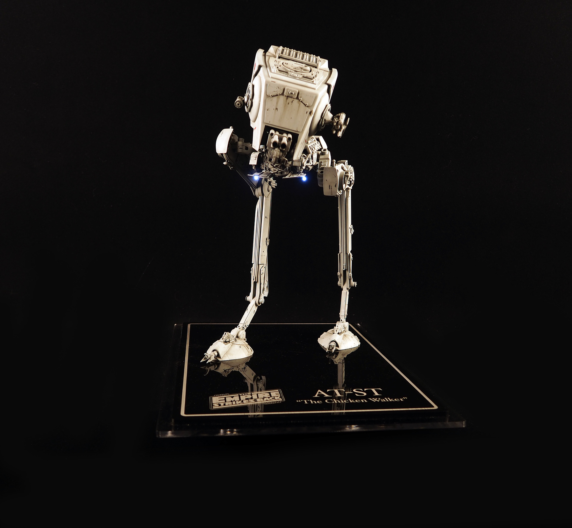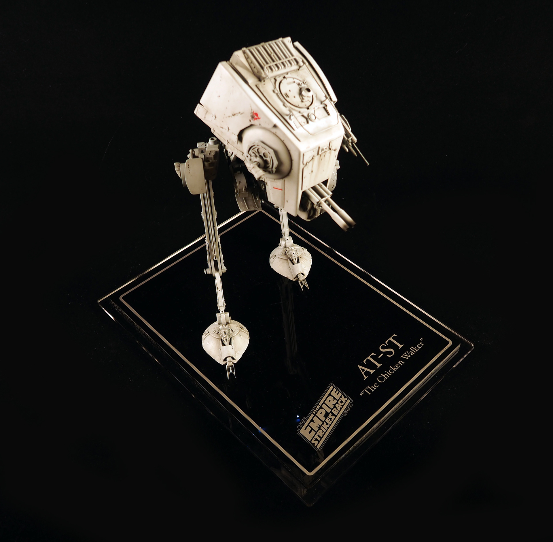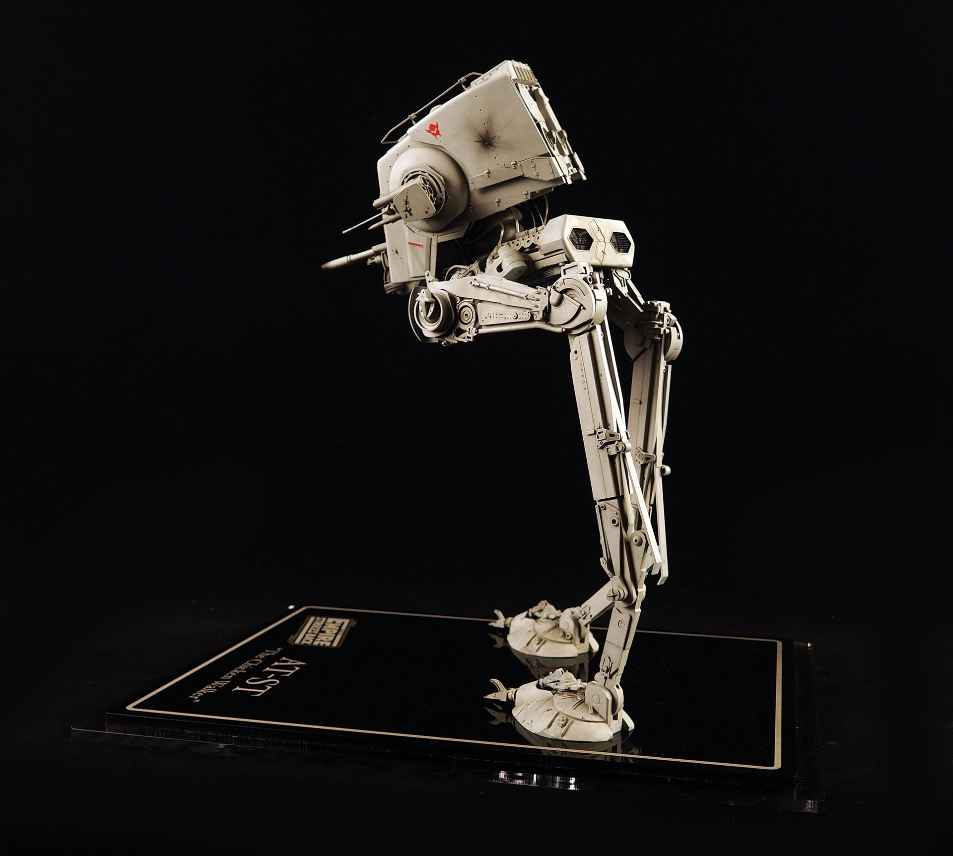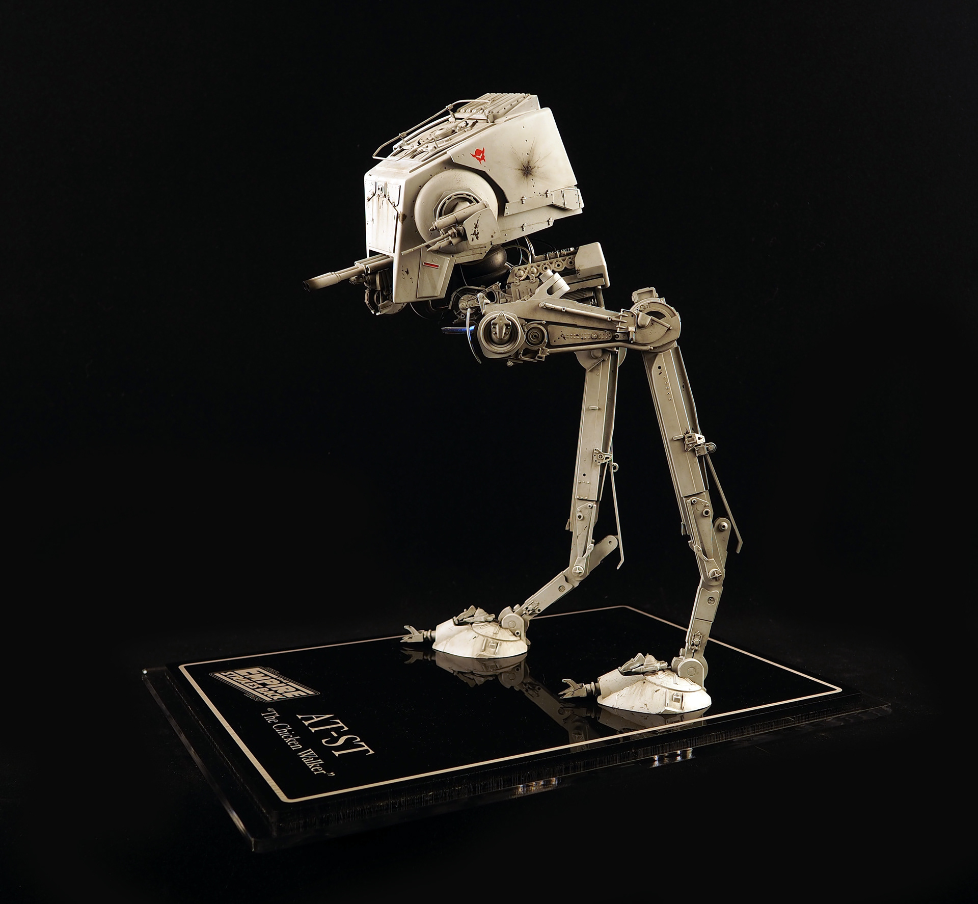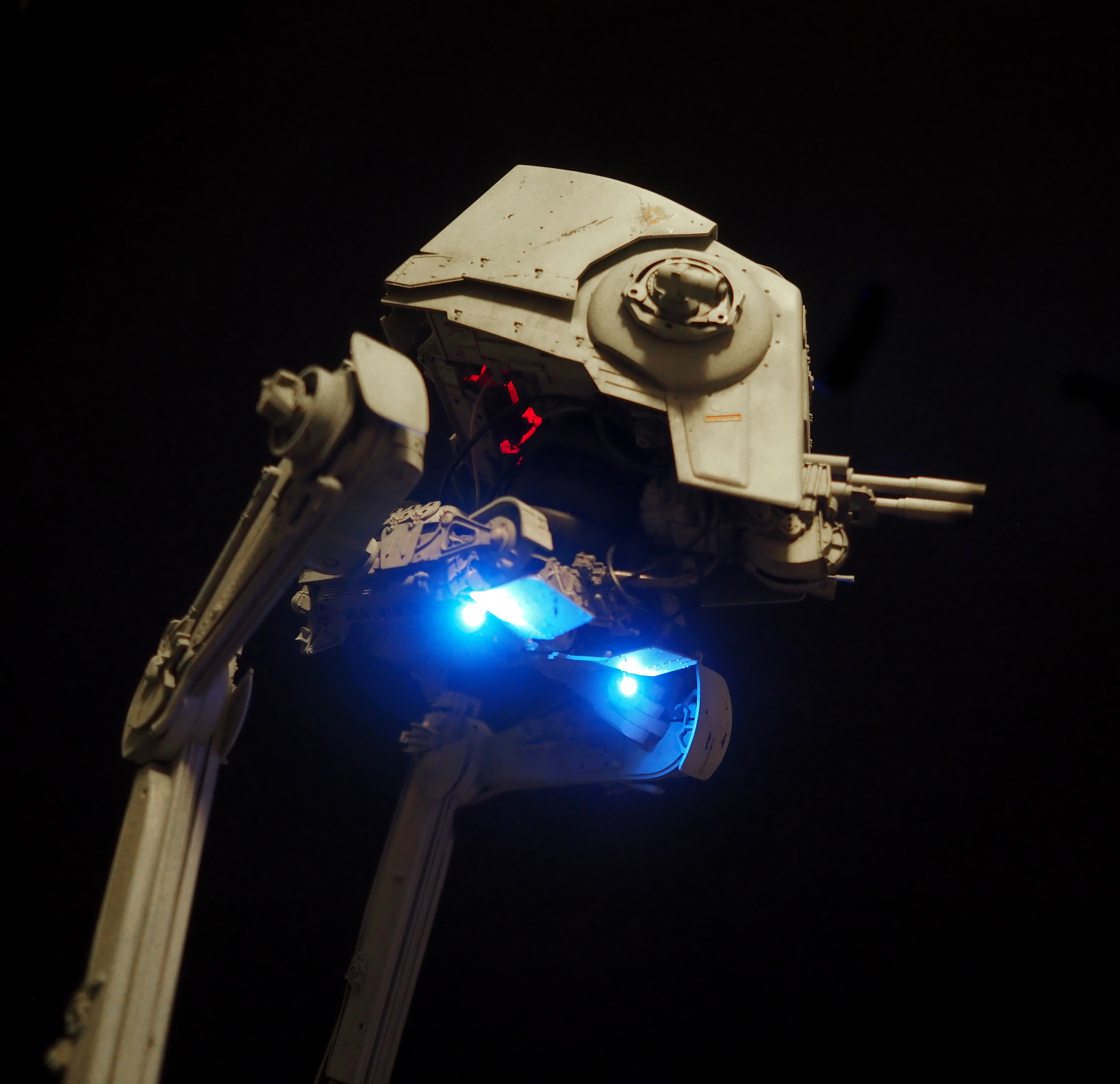 This is a replica of the AT-ST (internally referenced as “The Chicken Walker”) from The Empire Strikes Back. This is a fascinating subject to model, due to it’s unusual history. As much as I have been able to verify from first and secondhand stories from ILMers, it was built “as a joke” by Joe Johnston (or perhaps just as a fun side design, not called for at all by the story), and placed on the table with all the other designs that George Lucas would view and approve or pass on. Apparently Lucas loved it, and wanted it added to the film. The problem was, it was built as a static model , so in order to make it work for production, the model was stripped apart, and a metal articulated armature was machined by Tom St. Amand. From there it was animated for the movie, and was by some accounts a problem to work with, as parts tended to pop off on the animation stand. This design problem would be solved for Return of the Jedi by Bill George, who said he mastered the leg parts as a solid cast that was bolted to the armature, so that it stayed put. The Jedi AT-STs were also radically changed by shortening the legs, making the head a bit boxier, and many more subtle details. I have always assumed that “in-universe” it’s the same design, but the physical miniatures are quite different.The actual ESB miniature today is almost totally stripped of detail with the armature, leg base parts, and some of the head remaining. It was reported to be in “rough shape” during the Jedi production, and the archival photos taken in 1979 or so show a miniature that has somewhat melted and distorted (perhaps due to hot stage lights) and with hot glue blobs holding many things in place. The right (starboard) side of the miniature is unfinished as well, with the words “OFF CAMERA” written down the side of the leg. For this replica, I wanted to finish the model off, completing the right side. Because I cannot leave well enough alone, I also fleshed out parts of the design that were left blank or where reference doesn’t exist – the underside of the head, the inner thighs, etc. I also added lights – a subtle red glow inside the guts of the back of the head, and two spotlights that are in the spirit of both the German armor kit donors and what I feel would be a natural extension of the design. I also “completed” the underside and back of the body, where the armature mount existed and negated the opportunity for detailing. The front chin guns swivel downwards, as I also re-designed that area, hacking up the base pieces used and grafting them back together in articulated pieces.