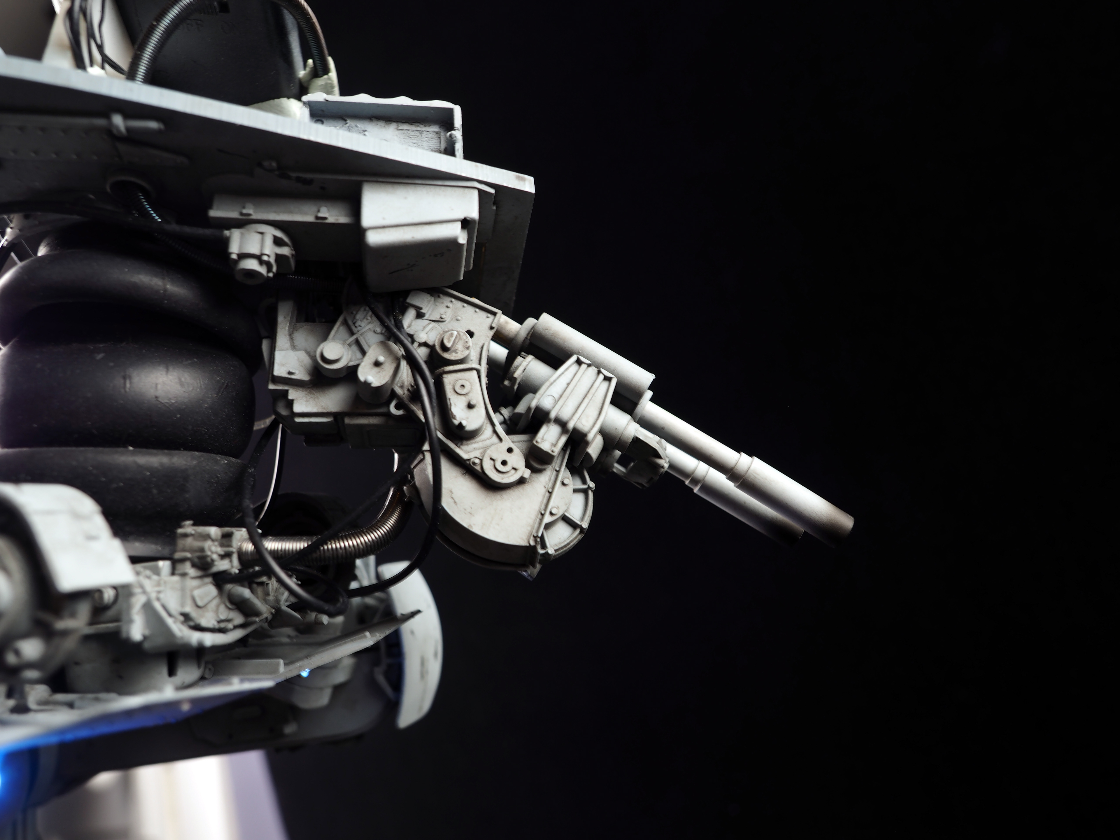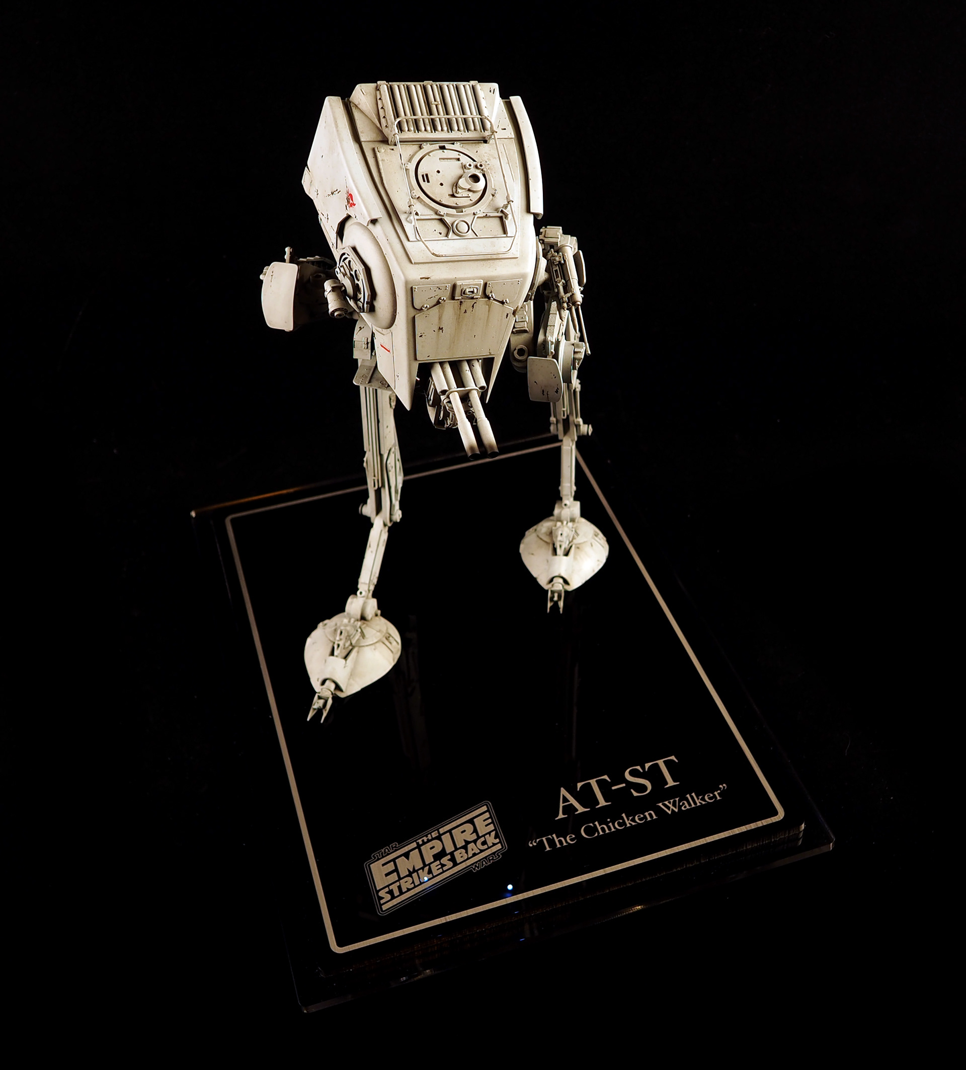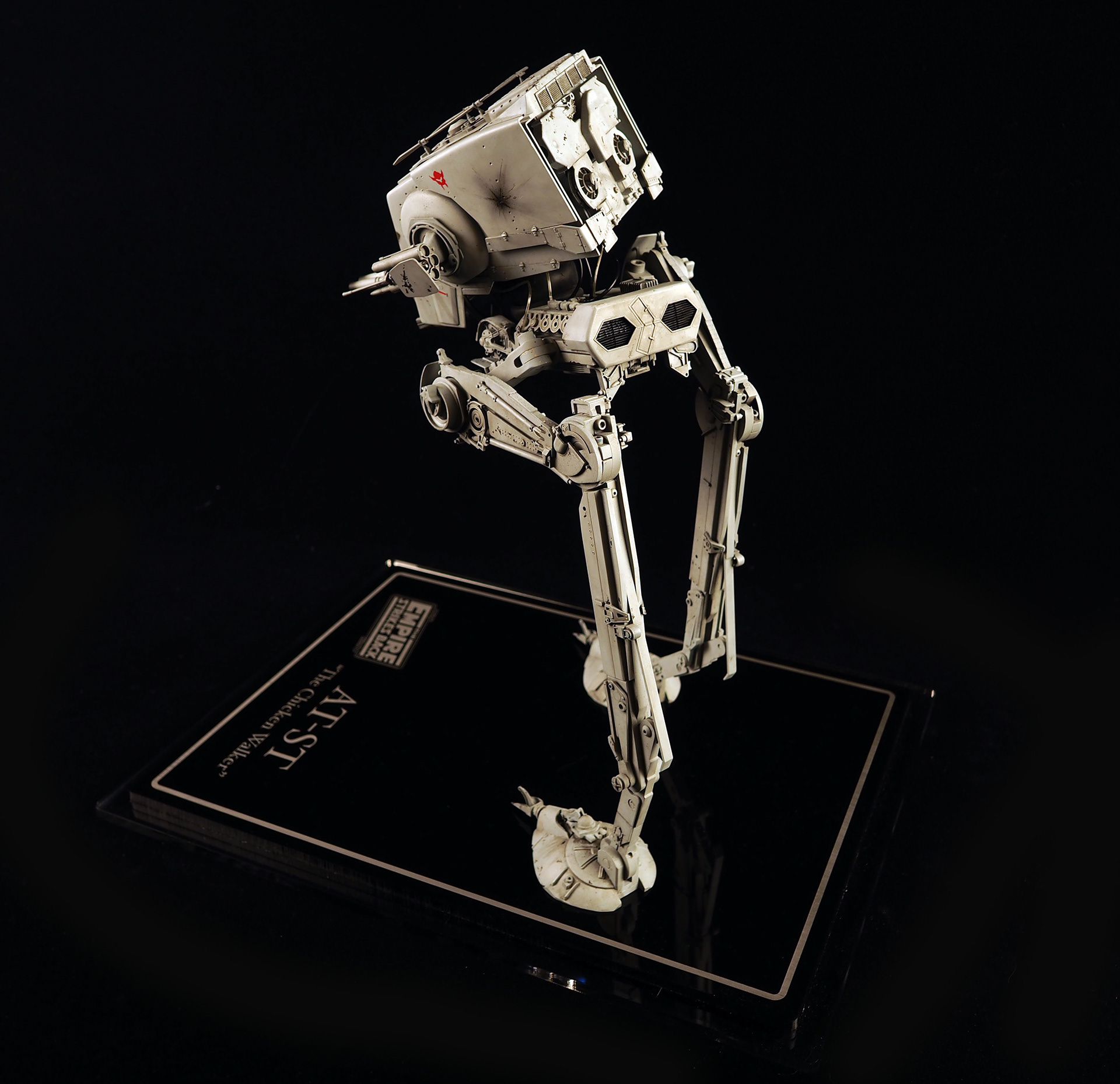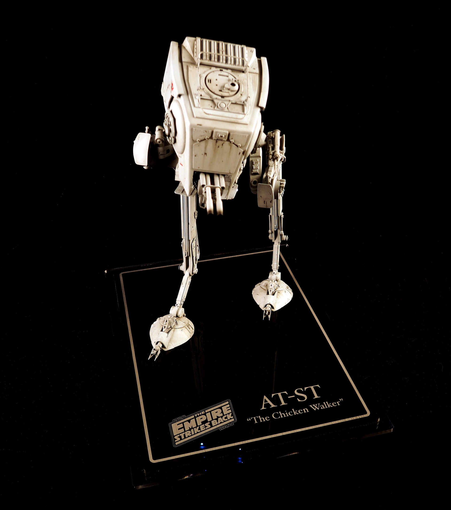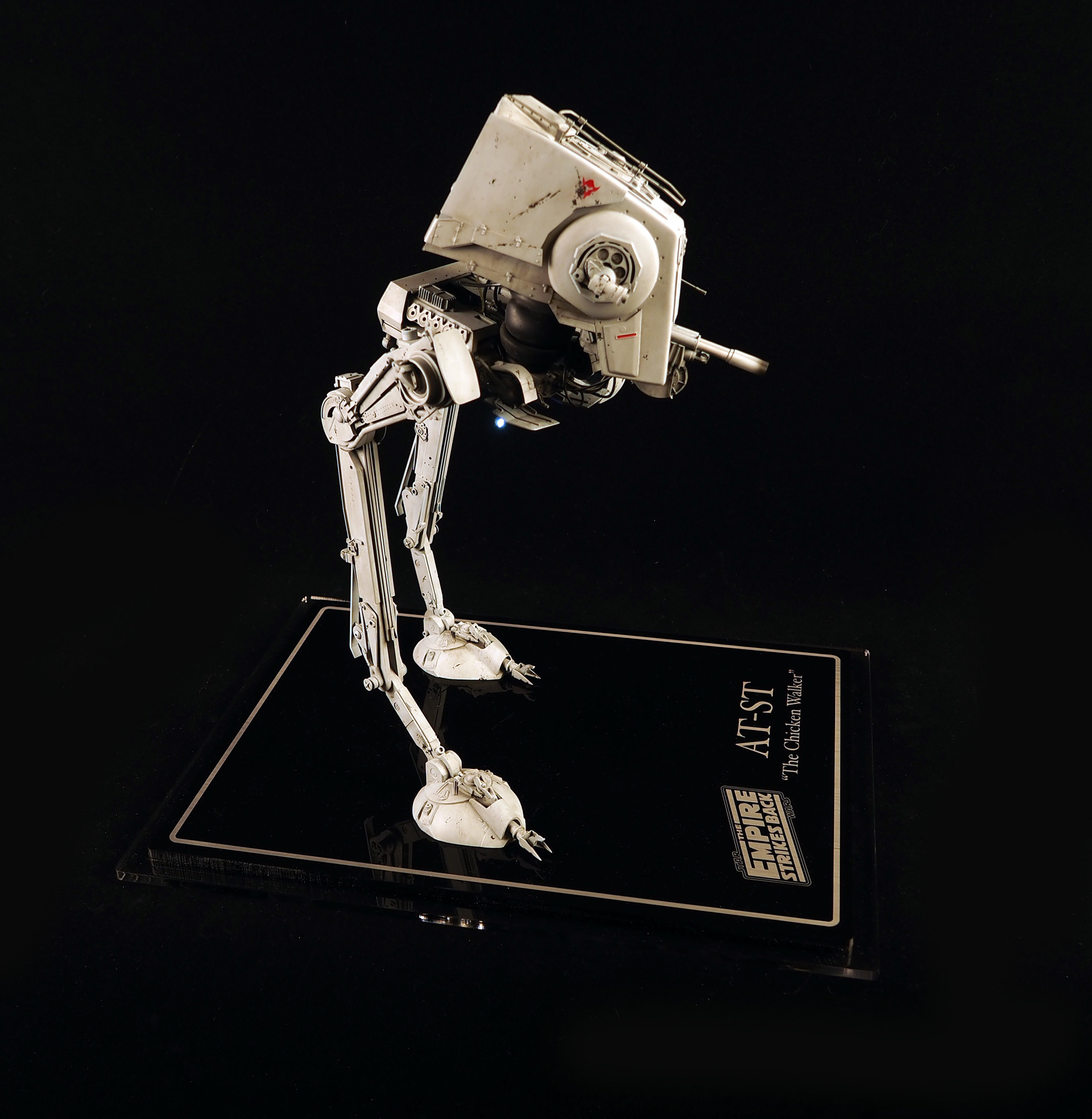 This is a replica of the AT-ST (internally referenced as “The Chicken Walker”) from The Empire Strikes Back. This is a fascinating subject to model, due to it’s unusual history. As much as I have been able to verify from first and secondhand stories from ILMers, it was built “as a joke” by Joe Johnston (or perhaps just as a fun side design, not called for at all by the story), and placed on the table with all the other designs that George Lucas would view and approve or pass on. Apparently Lucas loved it, and wanted it added to the film. The problem was, it was built as a static model , so in order to make it work for production, the model was stripped apart, and a metal articulated armature was machined by Tom St. Amand. From there it was animated for the movie, and was by some accounts a problem to work with, as parts tended to pop off on the animation stand. This design problem would be solved for Return of the Jedi by Bill George, who said he mastered the leg parts as a solid cast that was bolted to the armature, so that it stayed put. The Jedi AT-STs were also radically changed by shortening the legs, making the head a bit boxier, and many more subtle details. I have always assumed that “in-universe” it’s the same design, but the physical miniatures are quite different.The actual ESB miniature today is almost totally stripped of detail with the armature, leg base parts, and some of the head remaining. It was reported to be in “rough shape” during the Jedi production, and the archival photos taken in 1979 or so show a miniature that has somewhat melted and distorted (perhaps due to hot stage lights) and with hot glue blobs holding many things in place. The right (starboard) side of the miniature is unfinished as well, with the words “OFF CAMERA” written down the side of the leg. For this replica, I wanted to finish the model off, completing the right side. Because I cannot leave well enough alone, I also fleshed out parts of the design that were left blank or where reference doesn’t exist – the underside of the head, the inner thighs, etc. I also added lights – a subtle red glow inside the guts of the back of the head, and two spotlights that are in the spirit of both the German armor kit donors and what I feel would be a natural extension of the design. I also “completed” the underside and back of the body, where the armature mount existed and negated the opportunity for detailing. The front chin guns swivel downwards, as I also re-designed that area, hacking up the base pieces used and grafting them back together in articulated pieces.