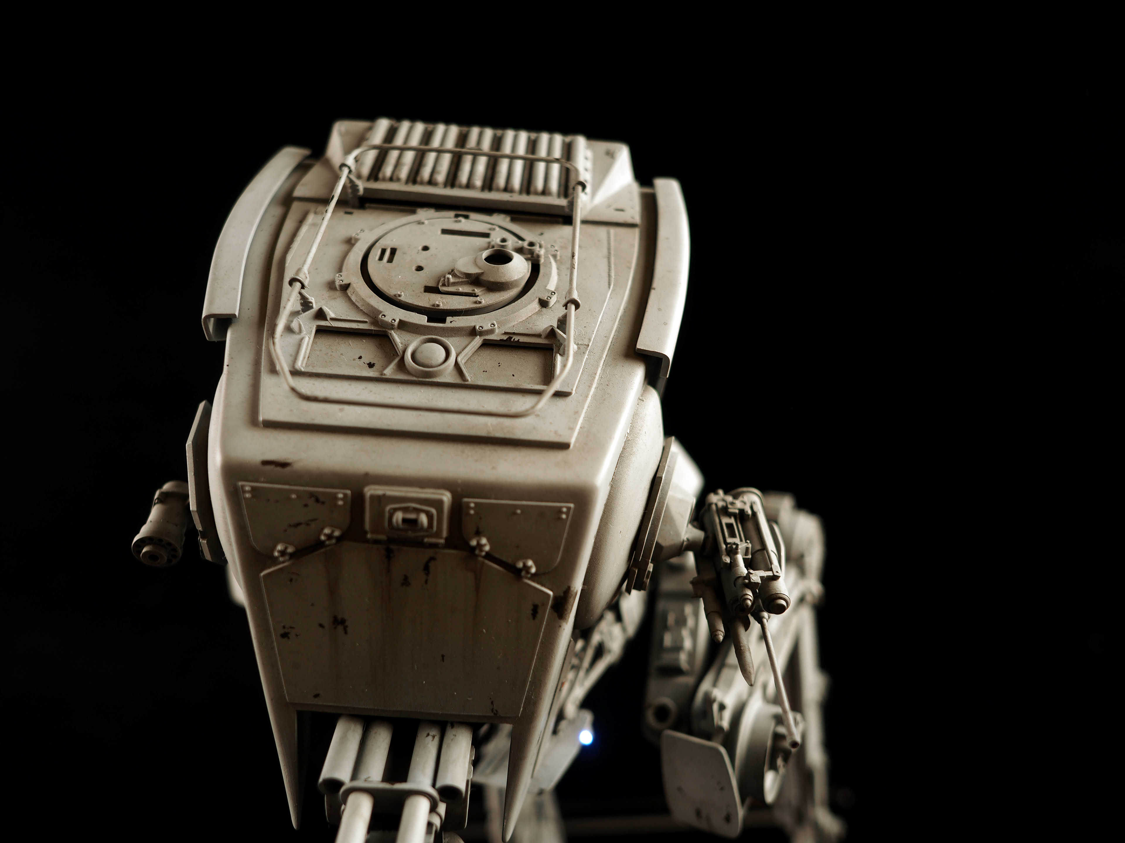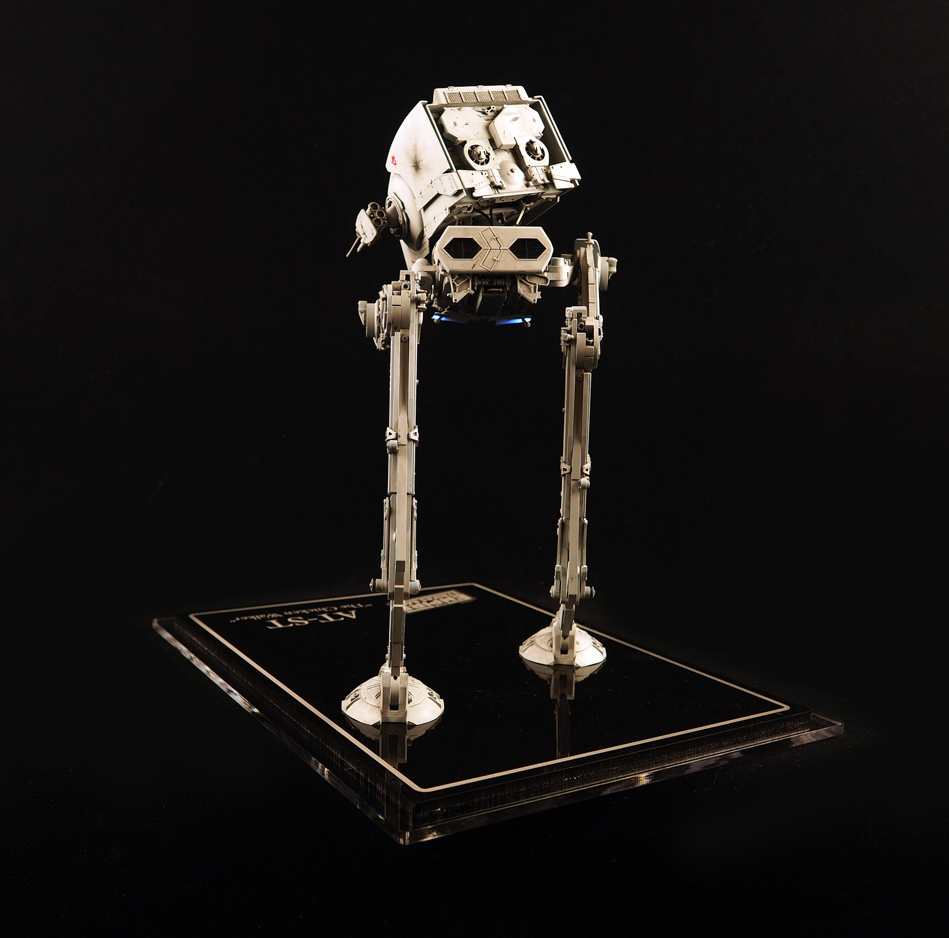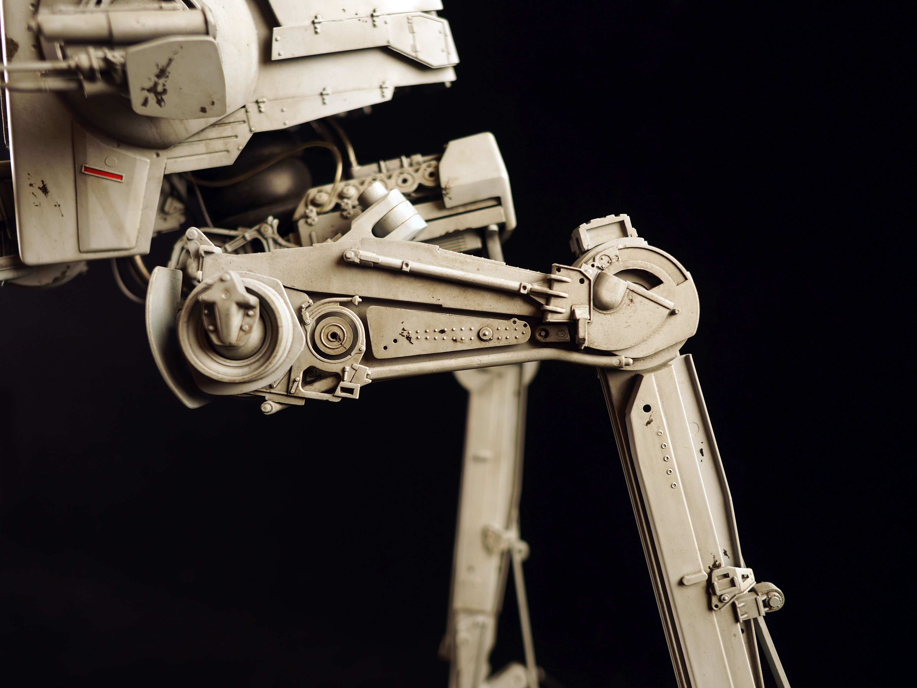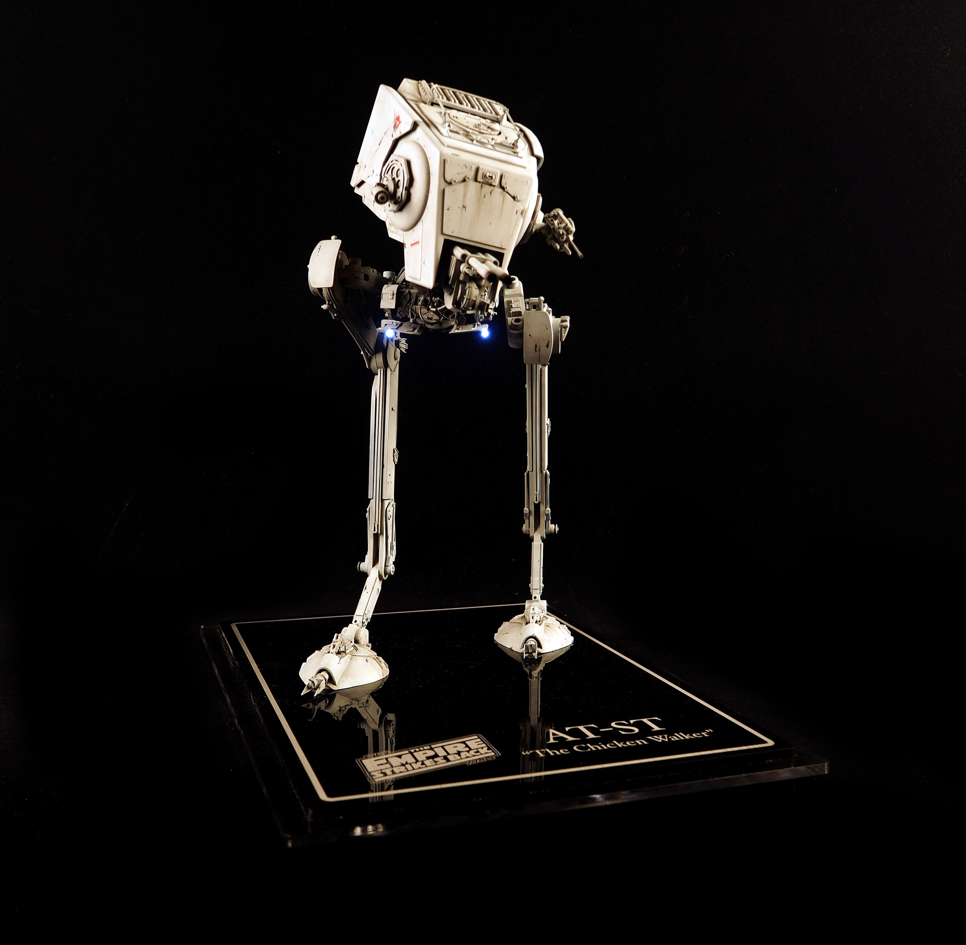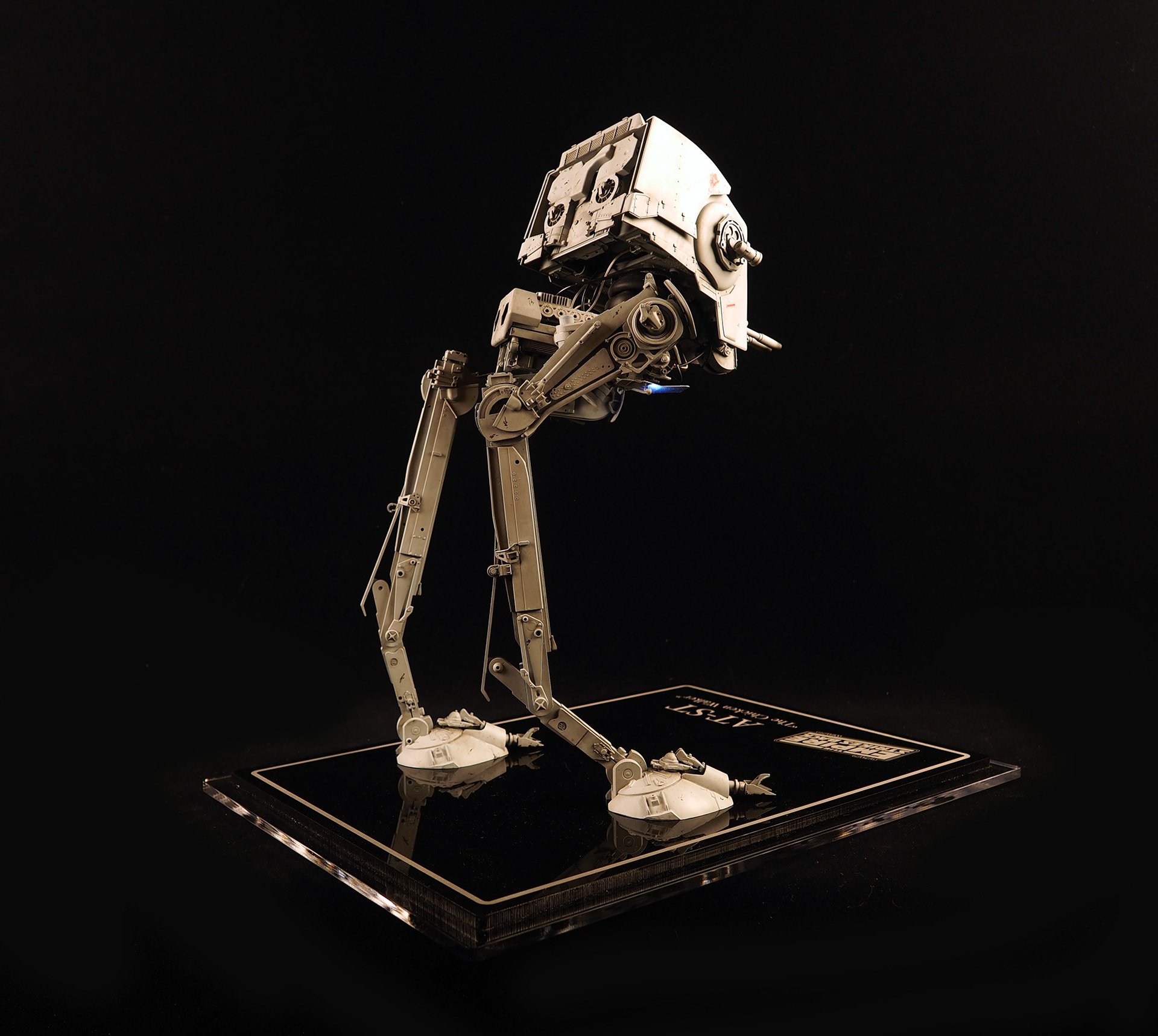 This is a replica of the AT-ST (internally referenced as “The Chicken Walker”) from The Empire Strikes Back. This is a fascinating subject to model, due to it’s unusual history. As much as I have been able to verify from first and secondhand stories from ILMers, it was built “as a joke” by Joe Johnston (or perhaps just as a fun side design, not called for at all by the story), and placed on the table with all the other designs that George Lucas would view and approve or pass on. Apparently Lucas loved it, and wanted it added to the film. The problem was, it was built as a static model , so in order to make it work for production, the model was stripped apart, and a metal articulated armature was machined by Tom St. Amand. From there it was animated for the movie, and was by some accounts a problem to work with, as parts tended to pop off on the animation stand. This design problem would be solved for Return of the Jedi by Bill George, who said he mastered the leg parts as a solid cast that was bolted to the armature, so that it stayed put. The Jedi AT-STs were also radically changed by shortening the legs, making the head a bit boxier, and many more subtle details. I have always assumed that “in-universe” it’s the same design, but the physical miniatures are quite different.The actual ESB miniature today is almost totally stripped of detail with the armature, leg base parts, and some of the head remaining. It was reported to be in “rough shape” during the Jedi production, and the archival photos taken in 1979 or so show a miniature that has somewhat melted and distorted (perhaps due to hot stage lights) and with hot glue blobs holding many things in place. The right (starboard) side of the miniature is unfinished as well, with the words “OFF CAMERA” written down the side of the leg. For this replica, I wanted to finish the model off, completing the right side. Because I cannot leave well enough alone, I also fleshed out parts of the design that were left blank or where reference doesn’t exist – the underside of the head, the inner thighs, etc. I also added lights – a subtle red glow inside the guts of the back of the head, and two spotlights that are in the spirit of both the German armor kit donors and what I feel would be a natural extension of the design. I also “completed” the underside and back of the body, where the armature mount existed and negated the opportunity for detailing. The front chin guns swivel downwards, as I also re-designed that area, hacking up the base pieces used and grafting them back together in articulated pieces.