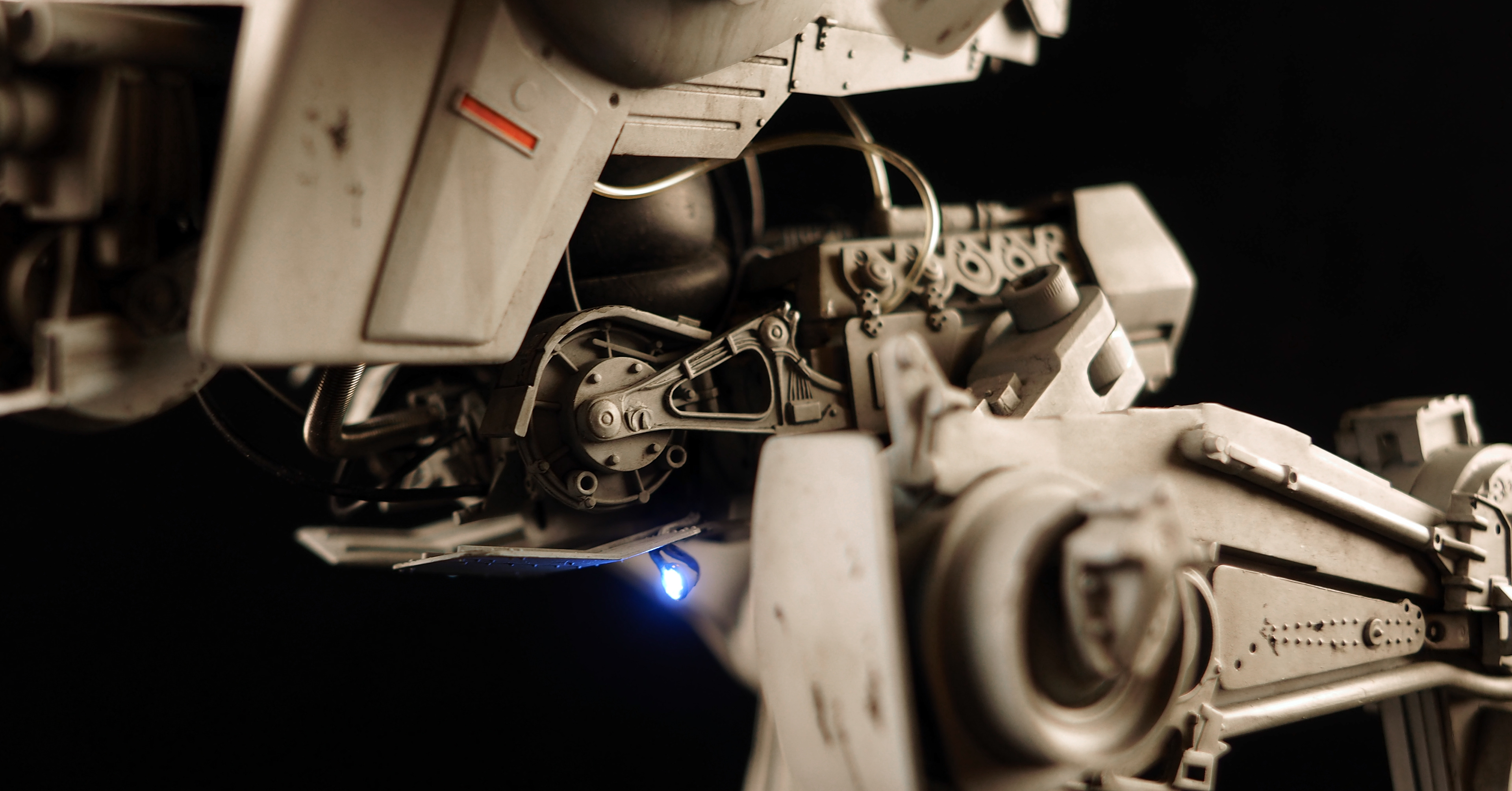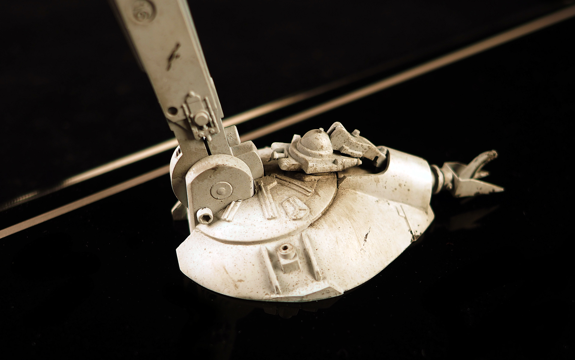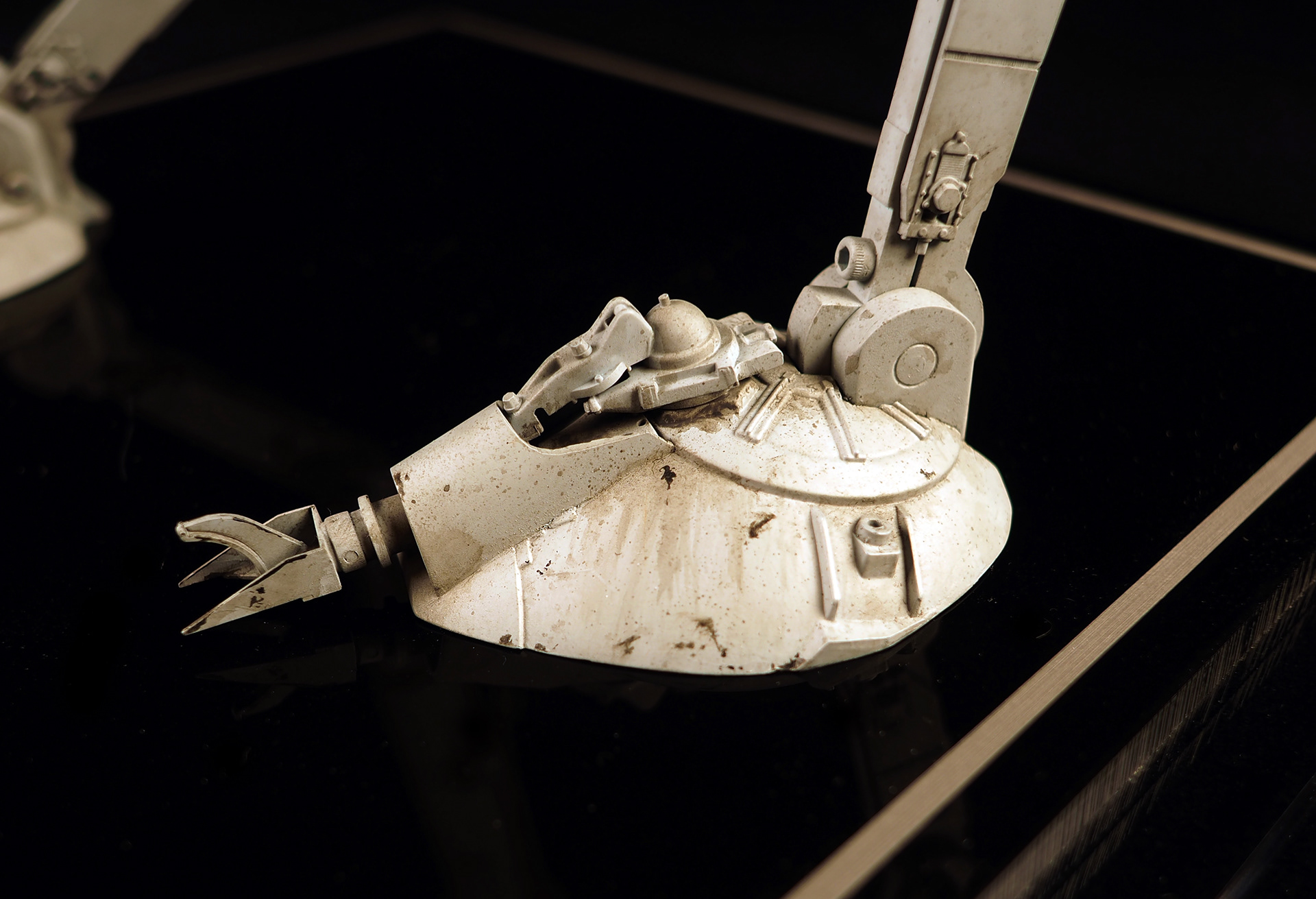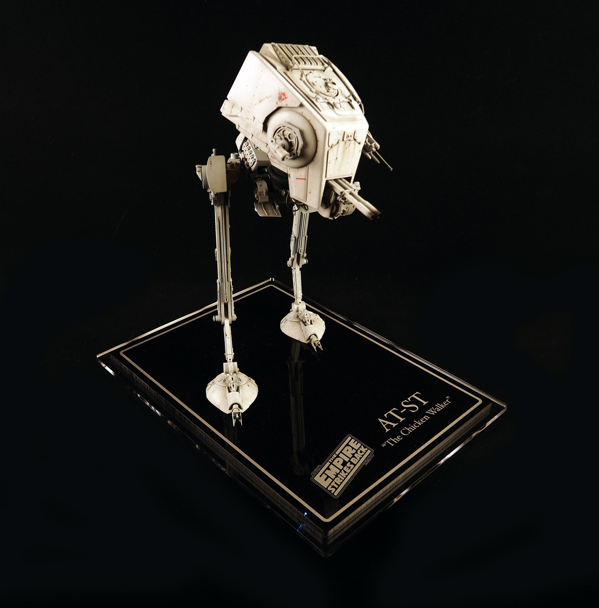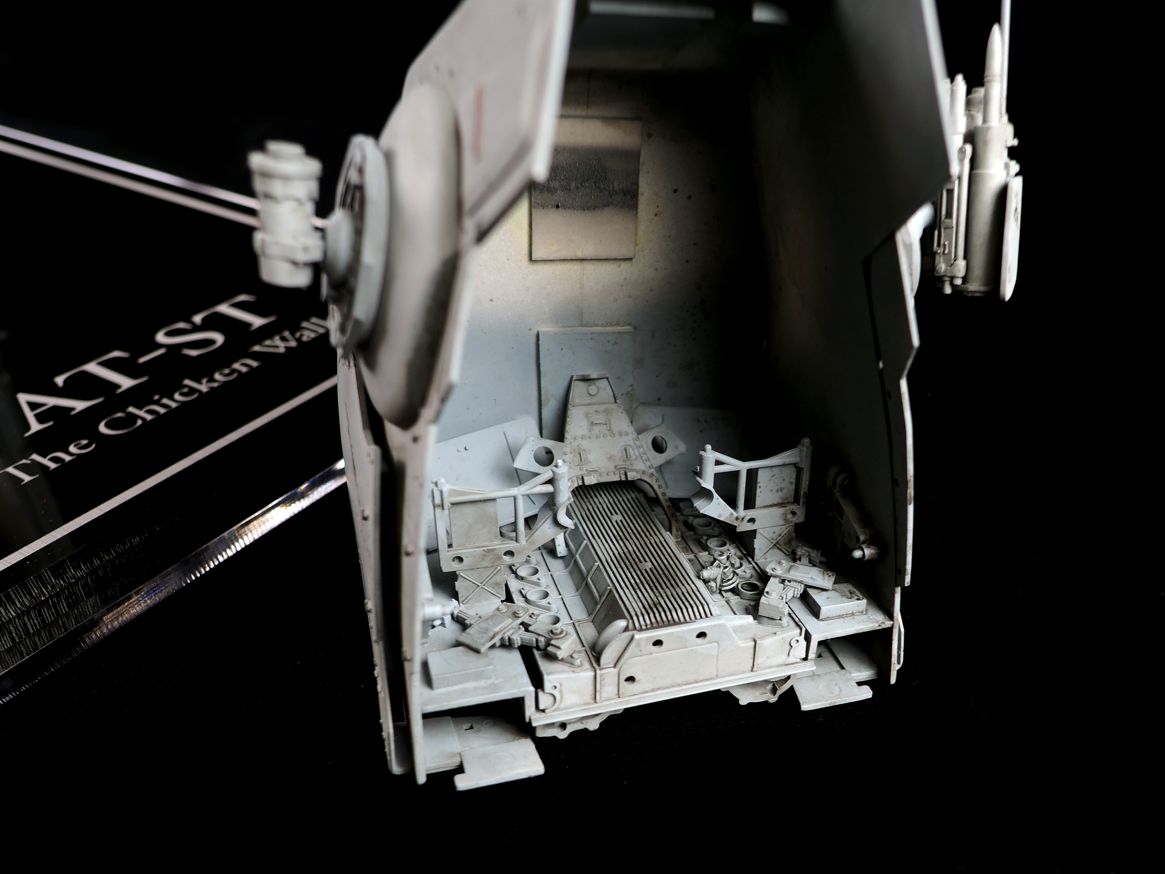 This is a replica of the AT-ST (internally referenced as “The Chicken Walker”) from The Empire Strikes Back. This is a fascinating subject to model, due to it’s unusual history. As much as I have been able to verify from first and secondhand stories from ILMers, it was built “as a joke” by Joe Johnston (or perhaps just as a fun side design, not called for at all by the story), and placed on the table with all the other designs that George Lucas would view and approve or pass on. Apparently Lucas loved it, and wanted it added to the film. The problem was, it was built as a static model , so in order to make it work for production, the model was stripped apart, and a metal articulated armature was machined by Tom St. Amand. From there it was animated for the movie, and was by some accounts a problem to work with, as parts tended to pop off on the animation stand. This design problem would be solved for Return of the Jedi by Bill George, who said he mastered the leg parts as a solid cast that was bolted to the armature, so that it stayed put. The Jedi AT-STs were also radically changed by shortening the legs, making the head a bit boxier, and many more subtle details. I have always assumed that “in-universe” it’s the same design, but the physical miniatures are quite different.The actual ESB miniature today is almost totally stripped of detail with the armature, leg base parts, and some of the head remaining. It was reported to be in “rough shape” during the Jedi production, and the archival photos taken in 1979 or so show a miniature that has somewhat melted and distorted (perhaps due to hot stage lights) and with hot glue blobs holding many things in place. The right (starboard) side of the miniature is unfinished as well, with the words “OFF CAMERA” written down the side of the leg. For this replica, I wanted to finish the model off, completing the right side. Because I cannot leave well enough alone, I also fleshed out parts of the design that were left blank or where reference doesn’t exist – the underside of the head, the inner thighs, etc. I also added lights – a subtle red glow inside the guts of the back of the head, and two spotlights that are in the spirit of both the German armor kit donors and what I feel would be a natural extension of the design. I also “completed” the underside and back of the body, where the armature mount existed and negated the opportunity for detailing. The front chin guns swivel downwards, as I also re-designed that area, hacking up the base pieces used and grafting them back together in articulated pieces.