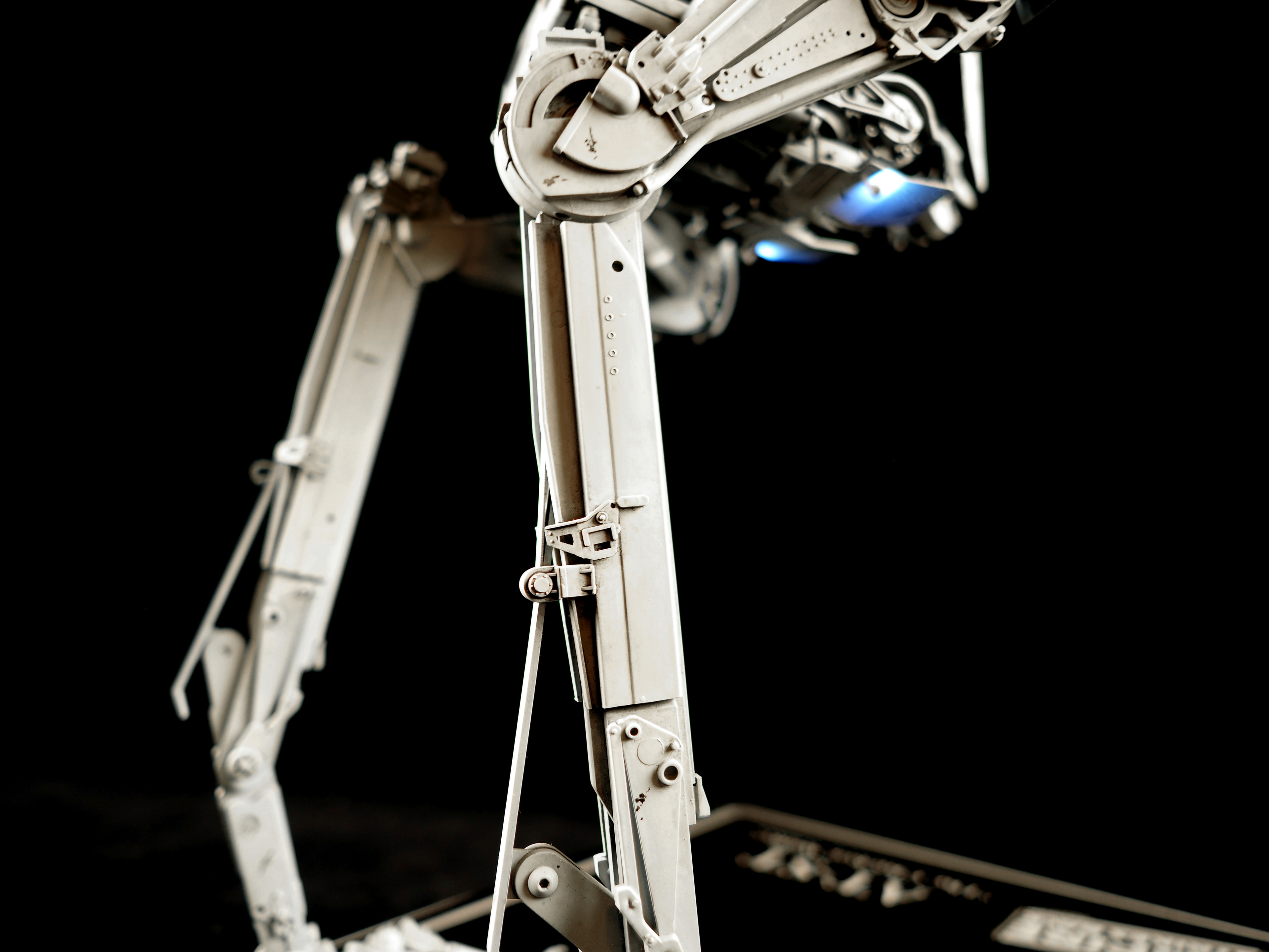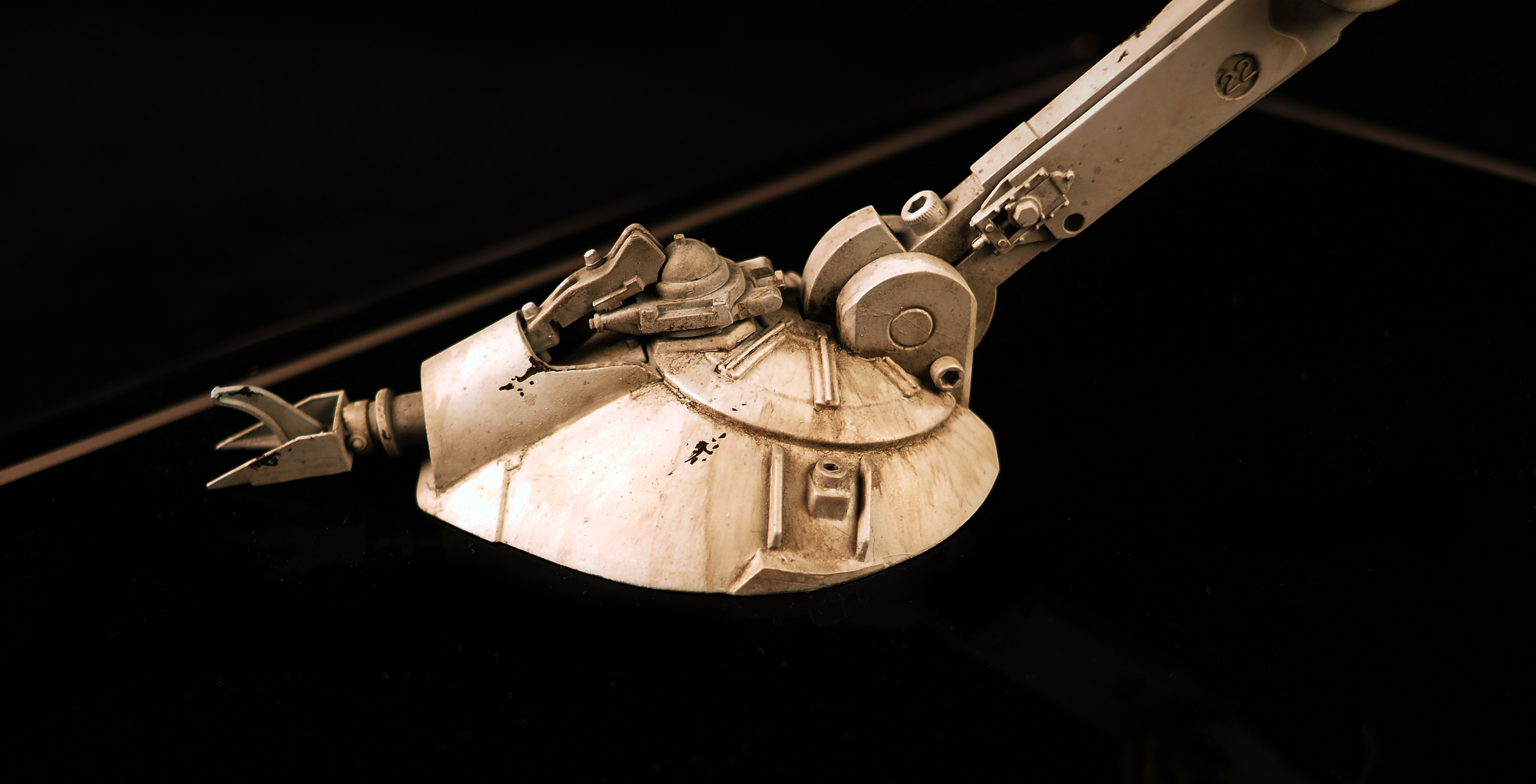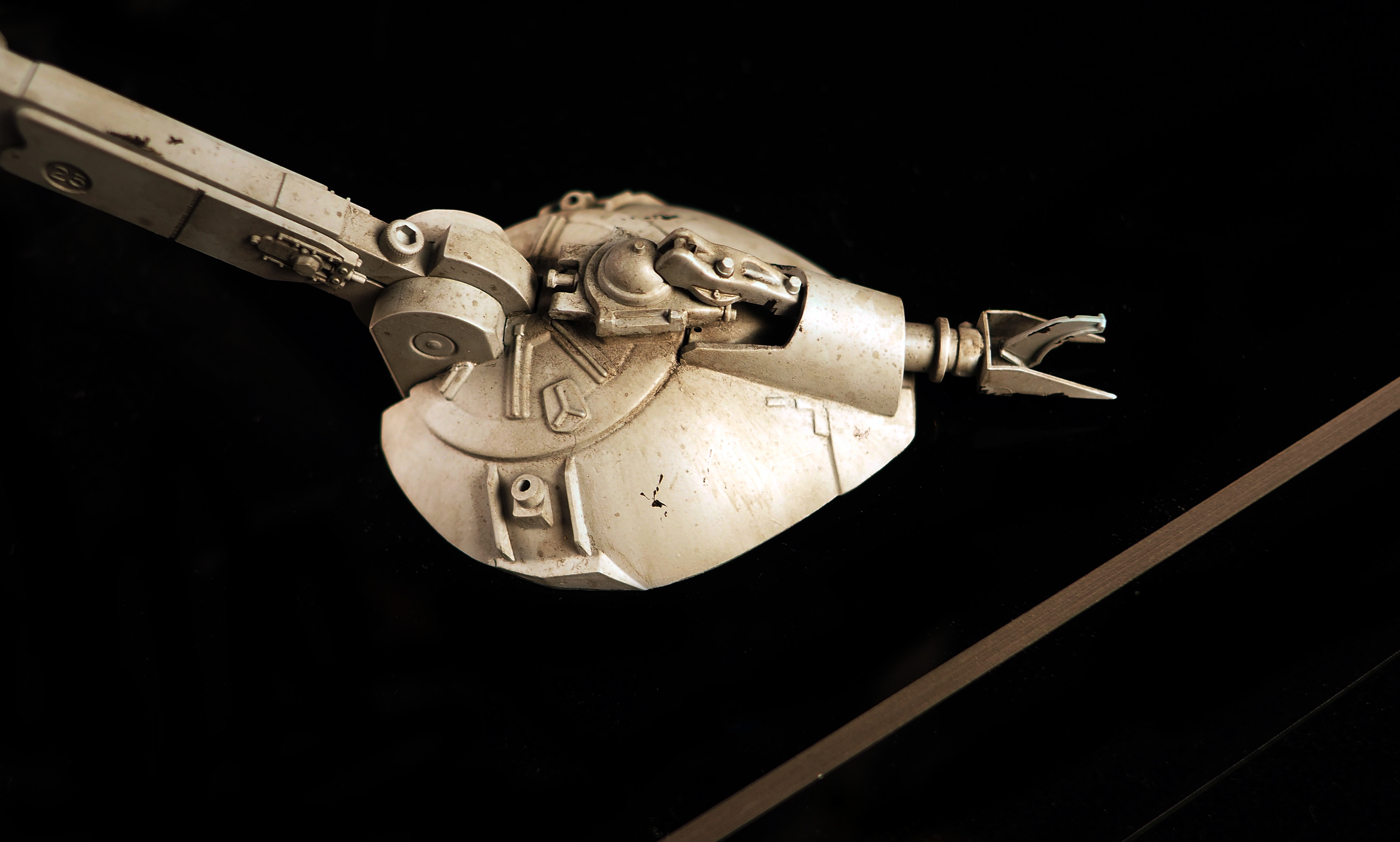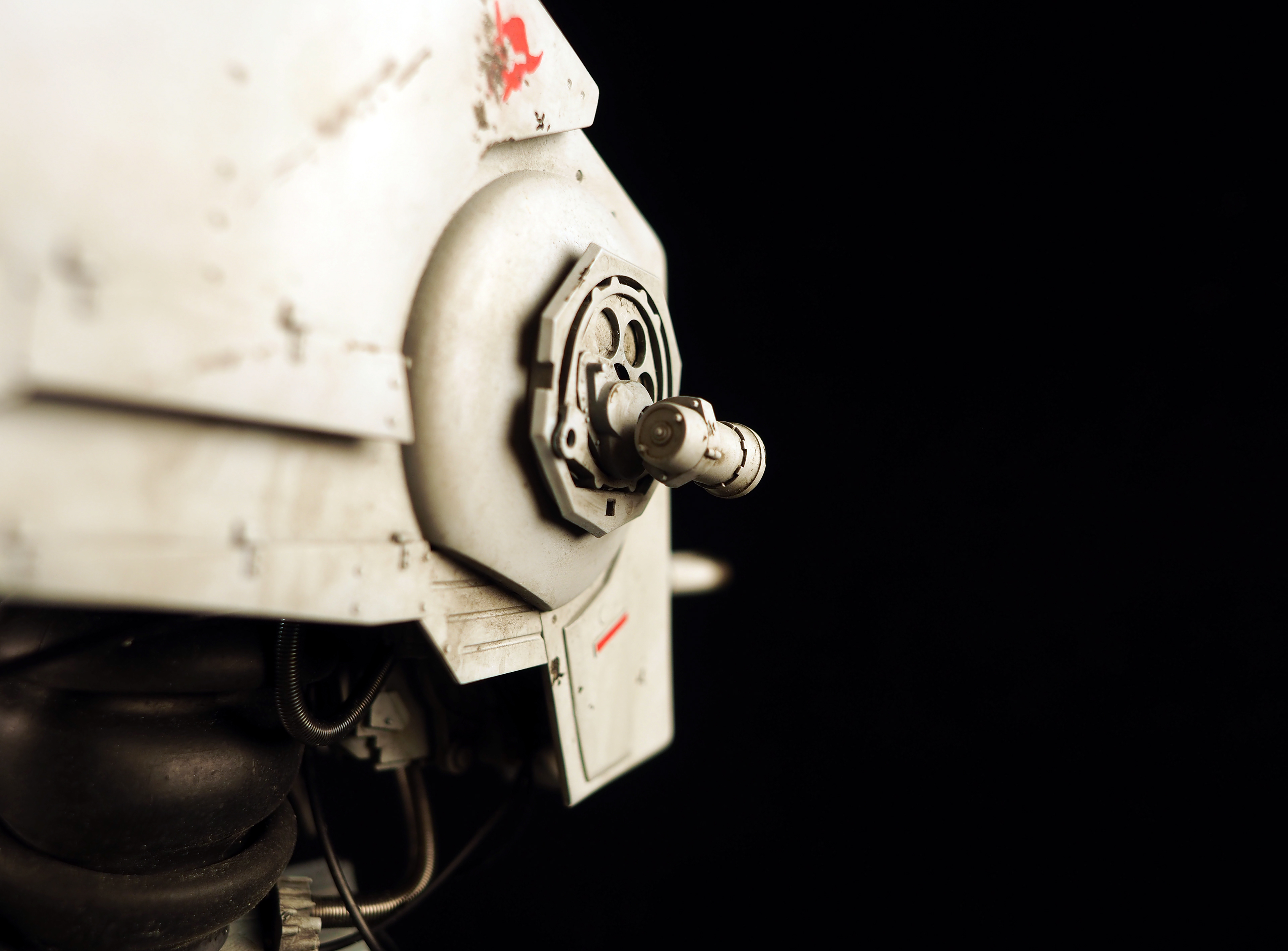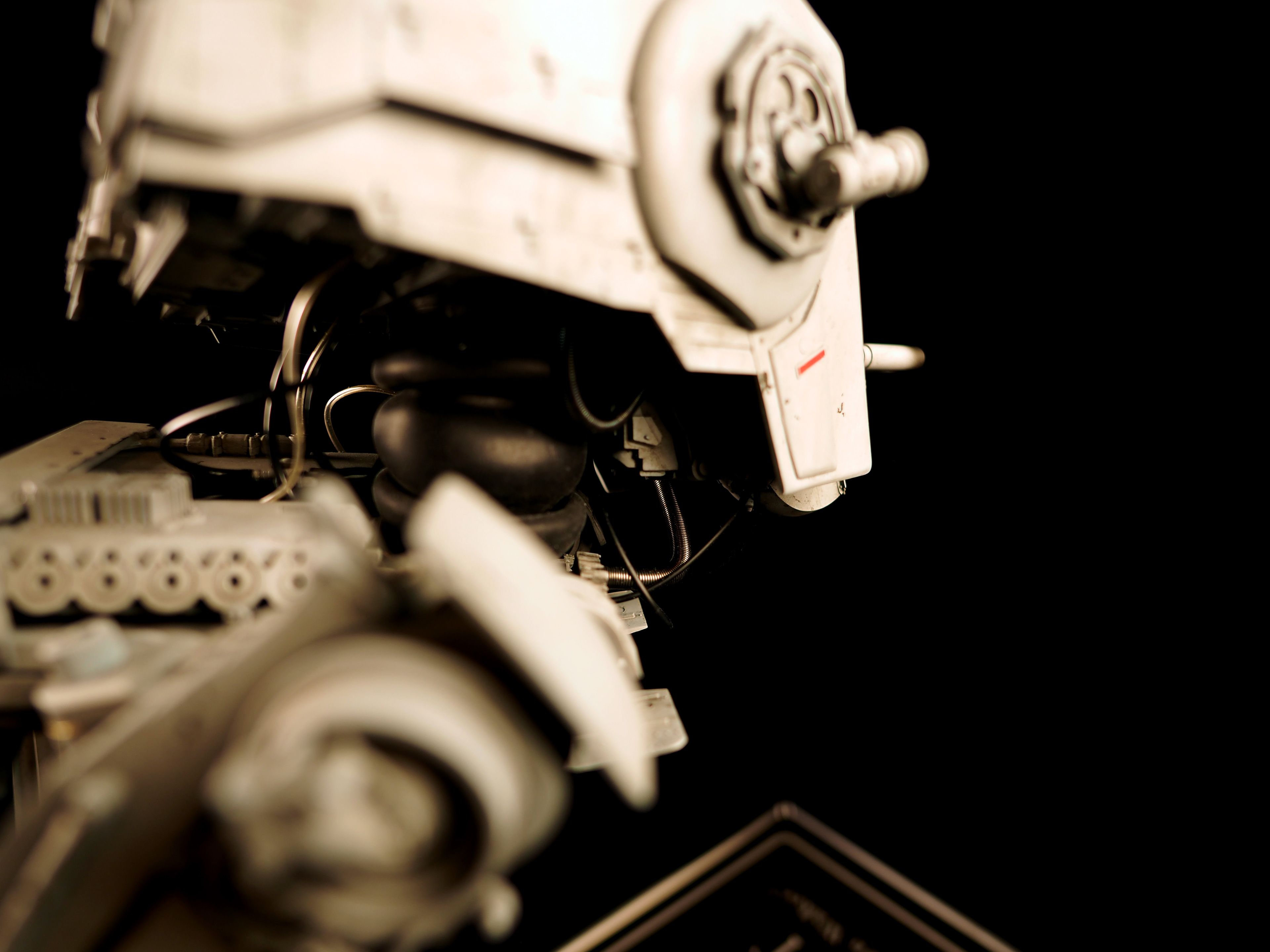 This is a replica of the AT-ST (internally referenced as “The Chicken Walker”) from The Empire Strikes Back. This is a fascinating subject to model, due to it’s unusual history. As much as I have been able to verify from first and secondhand stories from ILMers, it was built “as a joke” by Joe Johnston (or perhaps just as a fun side design, not called for at all by the story), and placed on the table with all the other designs that George Lucas would view and approve or pass on. Apparently Lucas loved it, and wanted it added to the film. The problem was, it was built as a static model , so in order to make it work for production, the model was stripped apart, and a metal articulated armature was machined by Tom St. Amand. From there it was animated for the movie, and was by some accounts a problem to work with, as parts tended to pop off on the animation stand. This design problem would be solved for Return of the Jedi by Bill George, who said he mastered the leg parts as a solid cast that was bolted to the armature, so that it stayed put. The Jedi AT-STs were also radically changed by shortening the legs, making the head a bit boxier, and many more subtle details. I have always assumed that “in-universe” it’s the same design, but the physical miniatures are quite different.The actual ESB miniature today is almost totally stripped of detail with the armature, leg base parts, and some of the head remaining. It was reported to be in “rough shape” during the Jedi production, and the archival photos taken in 1979 or so show a miniature that has somewhat melted and distorted (perhaps due to hot stage lights) and with hot glue blobs holding many things in place. The right (starboard) side of the miniature is unfinished as well, with the words “OFF CAMERA” written down the side of the leg. For this replica, I wanted to finish the model off, completing the right side. Because I cannot leave well enough alone, I also fleshed out parts of the design that were left blank or where reference doesn’t exist – the underside of the head, the inner thighs, etc. I also added lights – a subtle red glow inside the guts of the back of the head, and two spotlights that are in the spirit of both the German armor kit donors and what I feel would be a natural extension of the design. I also “completed” the underside and back of the body, where the armature mount existed and negated the opportunity for detailing. The front chin guns swivel downwards, as I also re-designed that area, hacking up the base pieces used and grafting them back together in articulated pieces.