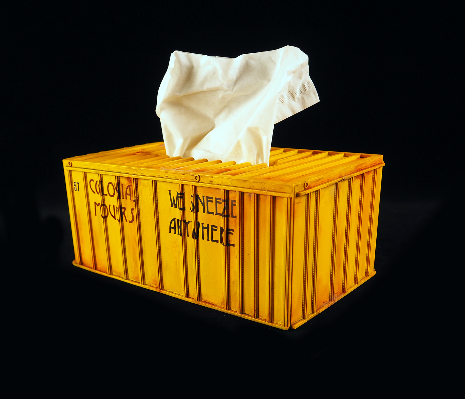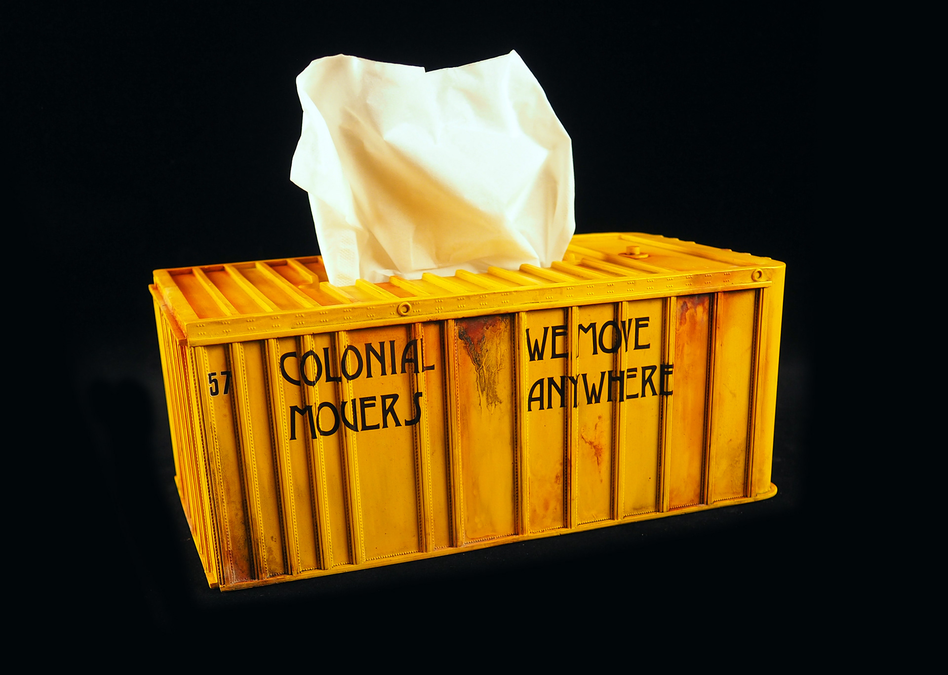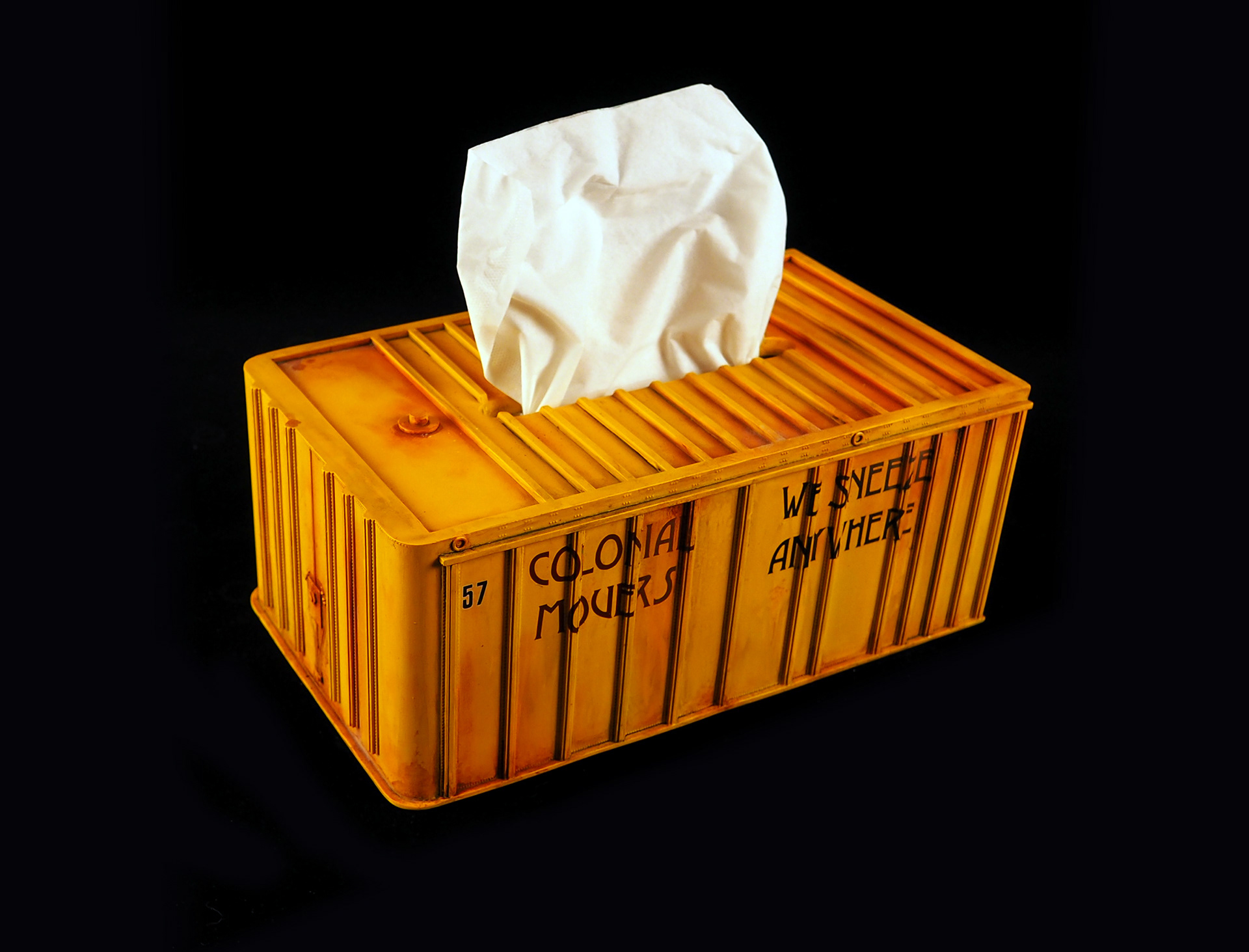 You know what? Tissue boxes have boring printed patterns a lot of the time, and the available covers are even MORE boring. So I thought, why not superdeform the Exterior Post AMT donor trailer used on the Colonial Movers from Battlestar Galactica and turn it into the ultimate sci-fi tissue box! This page will be updated with some of teh other variants soon, as the Colonial Movers has six unique containers (technically one is a Reefer, yes yes) and are all wonderfully bold and different. You can buy a casting and make you own, including decals, here!