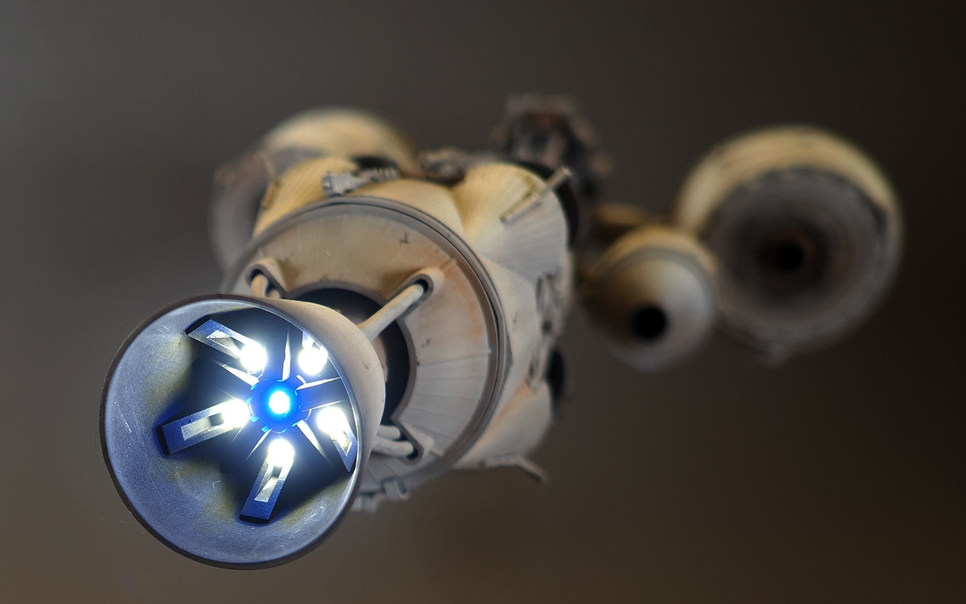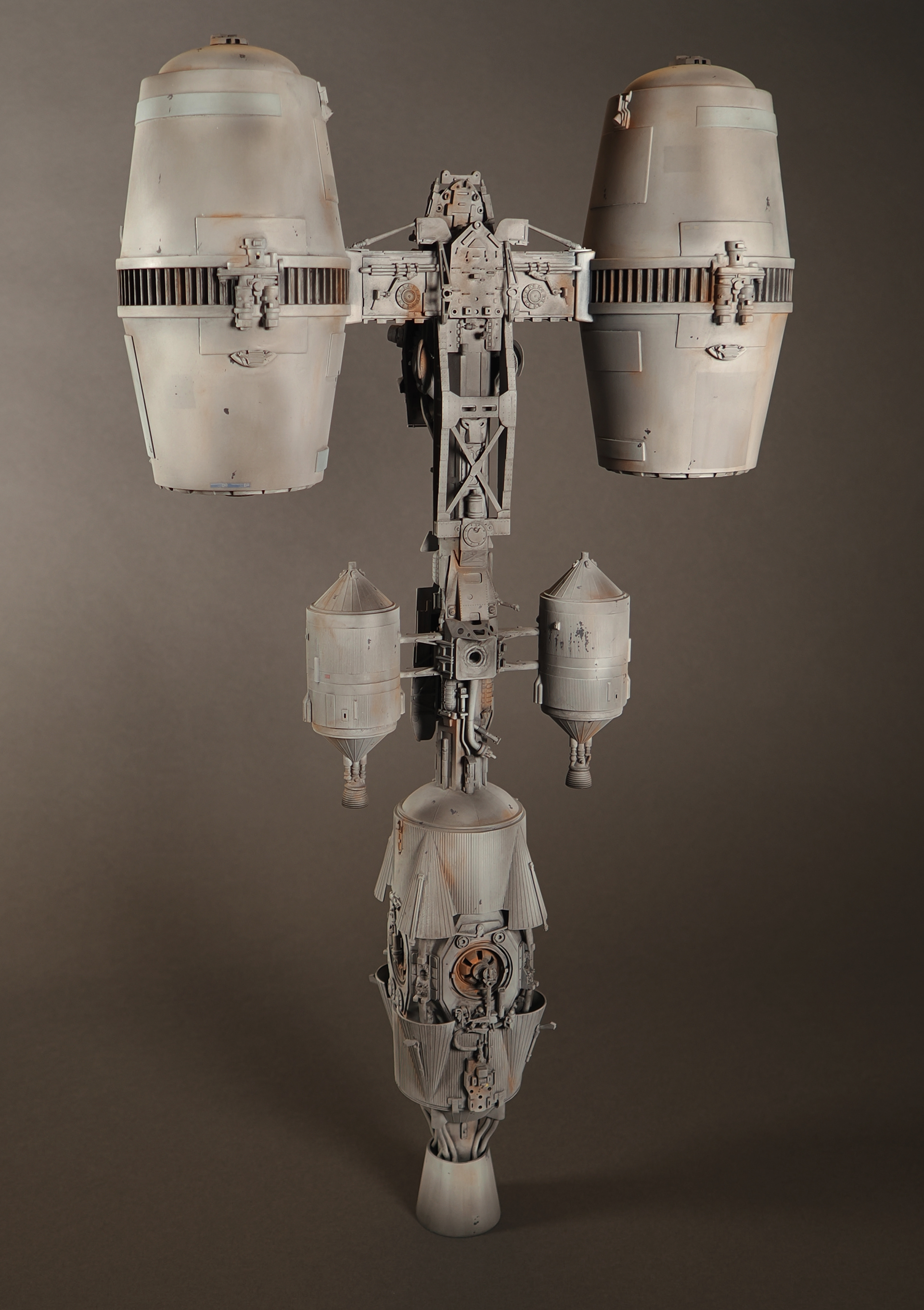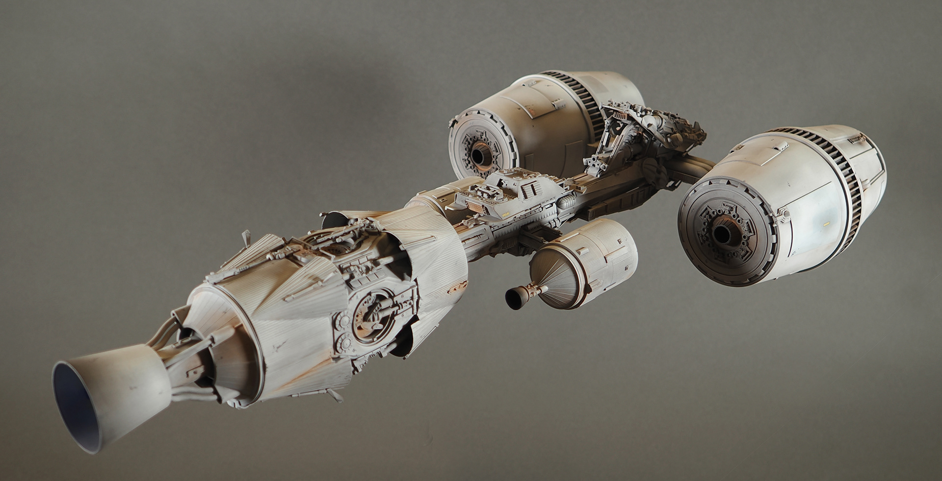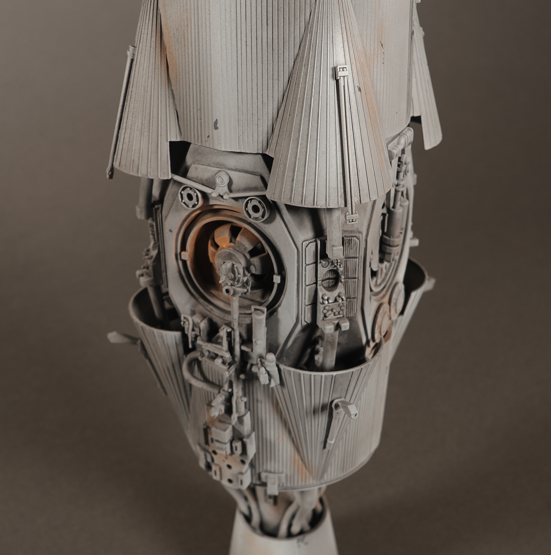 This is a “best guess” interpretation of a Studio Scale Fleet Ship made for the gathering of Rebel ships at the end of the film. The original is nowhere to be found and presumed to be either thrown away or broken up with elements reused. All we have as model makers to go by are very blurry screencaps, which is very exciting - I see it as an invitation to riff! The core body was designed in Rhino and printed in 3D with a metal through-armature, and then dressed with styrene model parts.