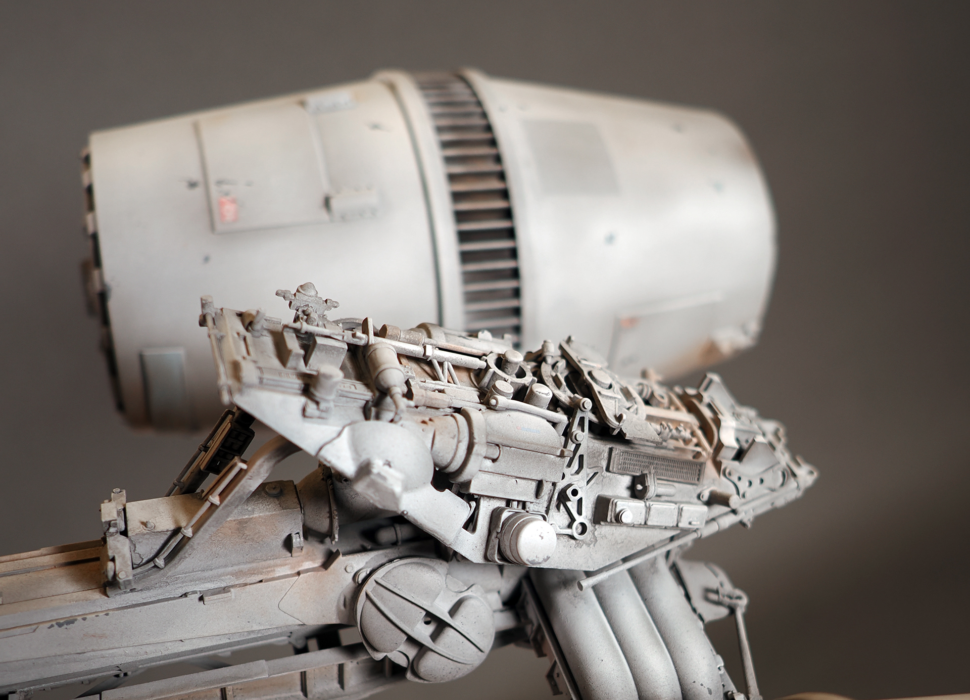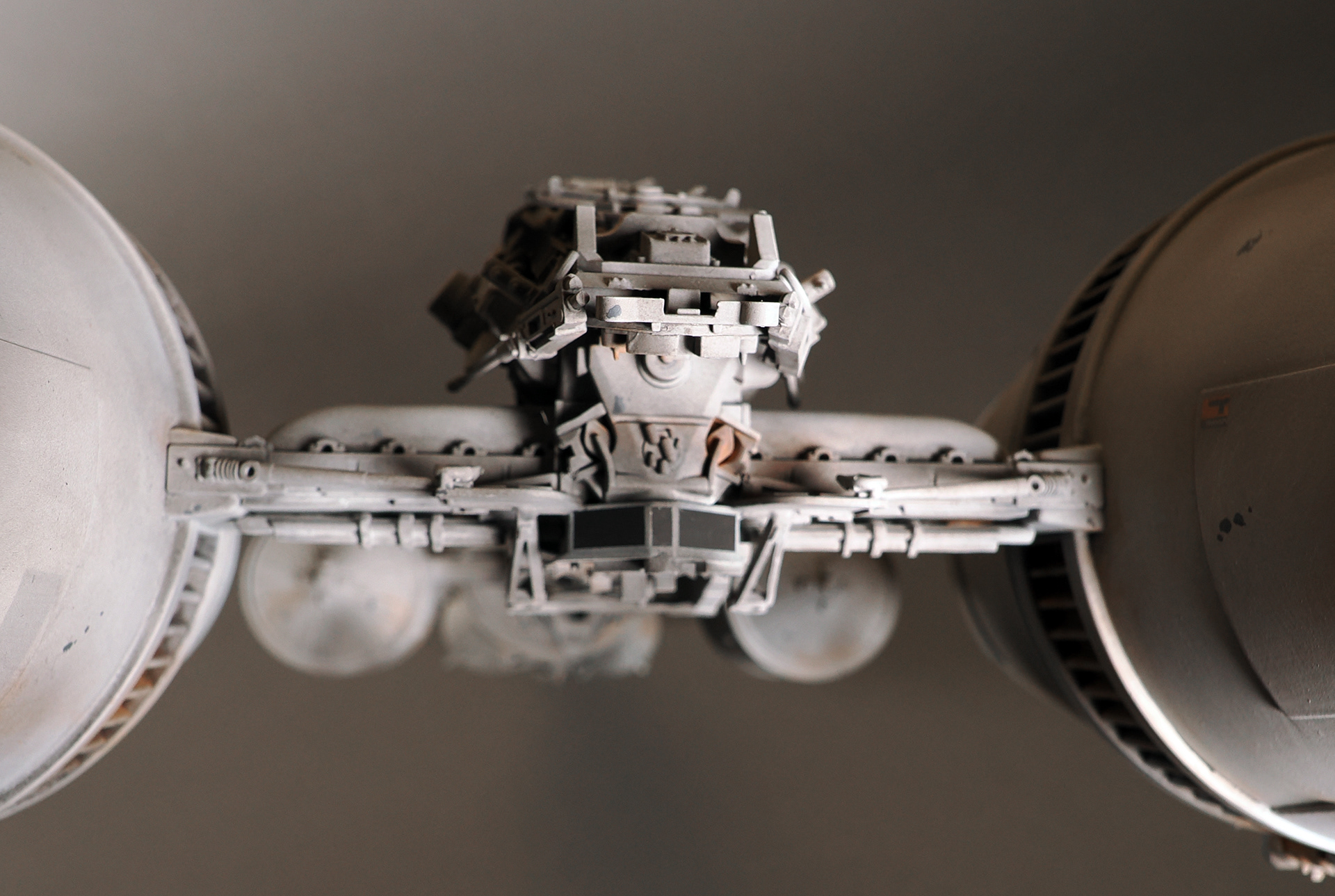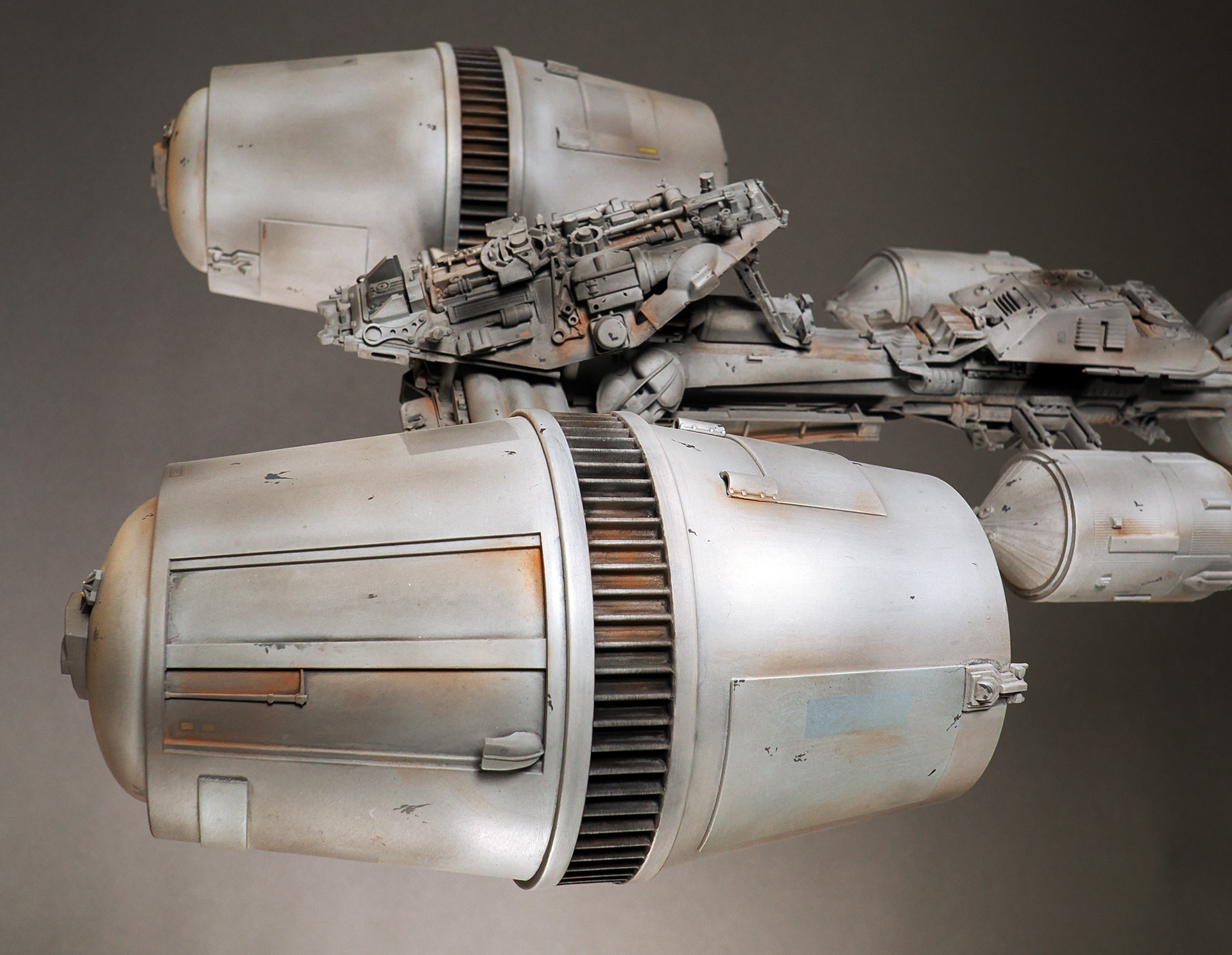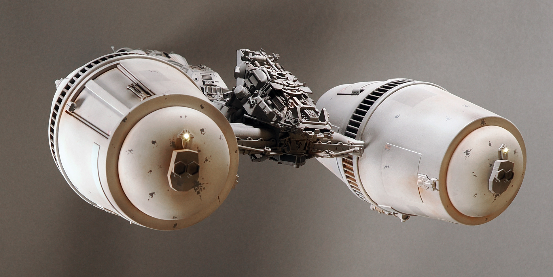 This is a “best guess” interpretation of a Studio Scale Fleet Ship made for the gathering of Rebel ships at the end of the film. The original is nowhere to be found and presumed to be either thrown away or broken up with elements reused. All we have as model makers to go by are very blurry screencaps, which is very exciting - I see it as an invitation to riff! The core body was designed in Rhino and printed in 3D with a metal through-armature, and then dressed with styrene model parts.
