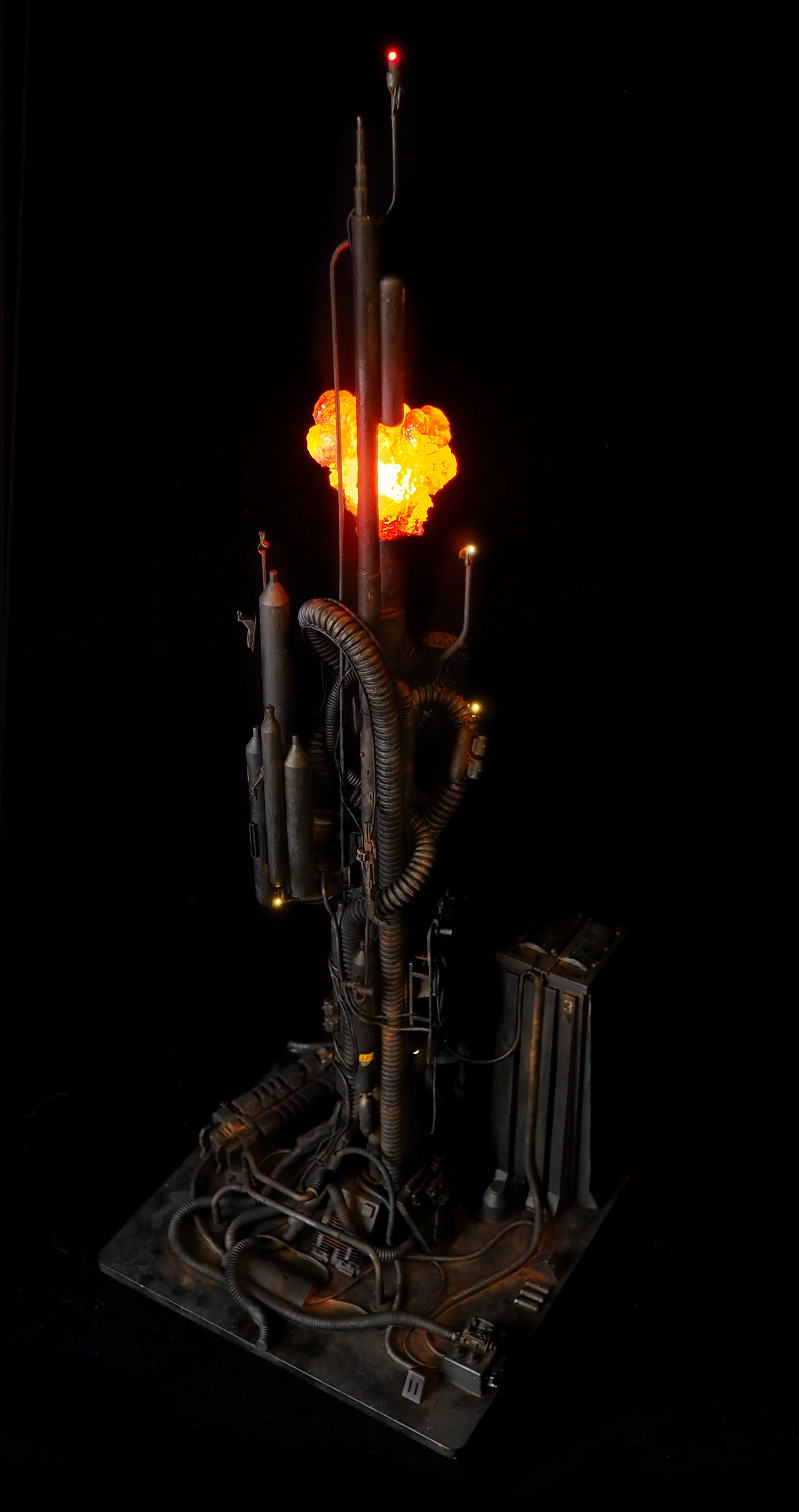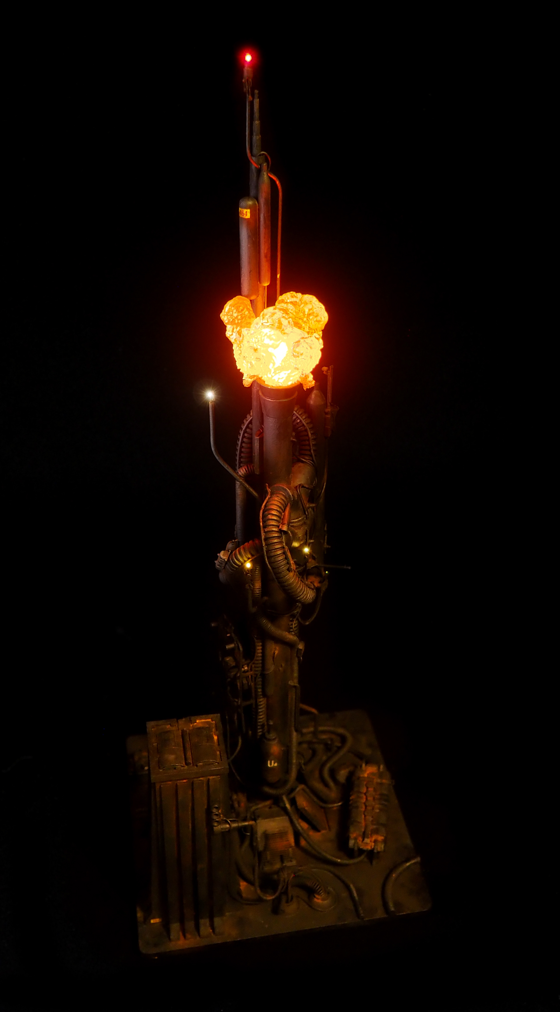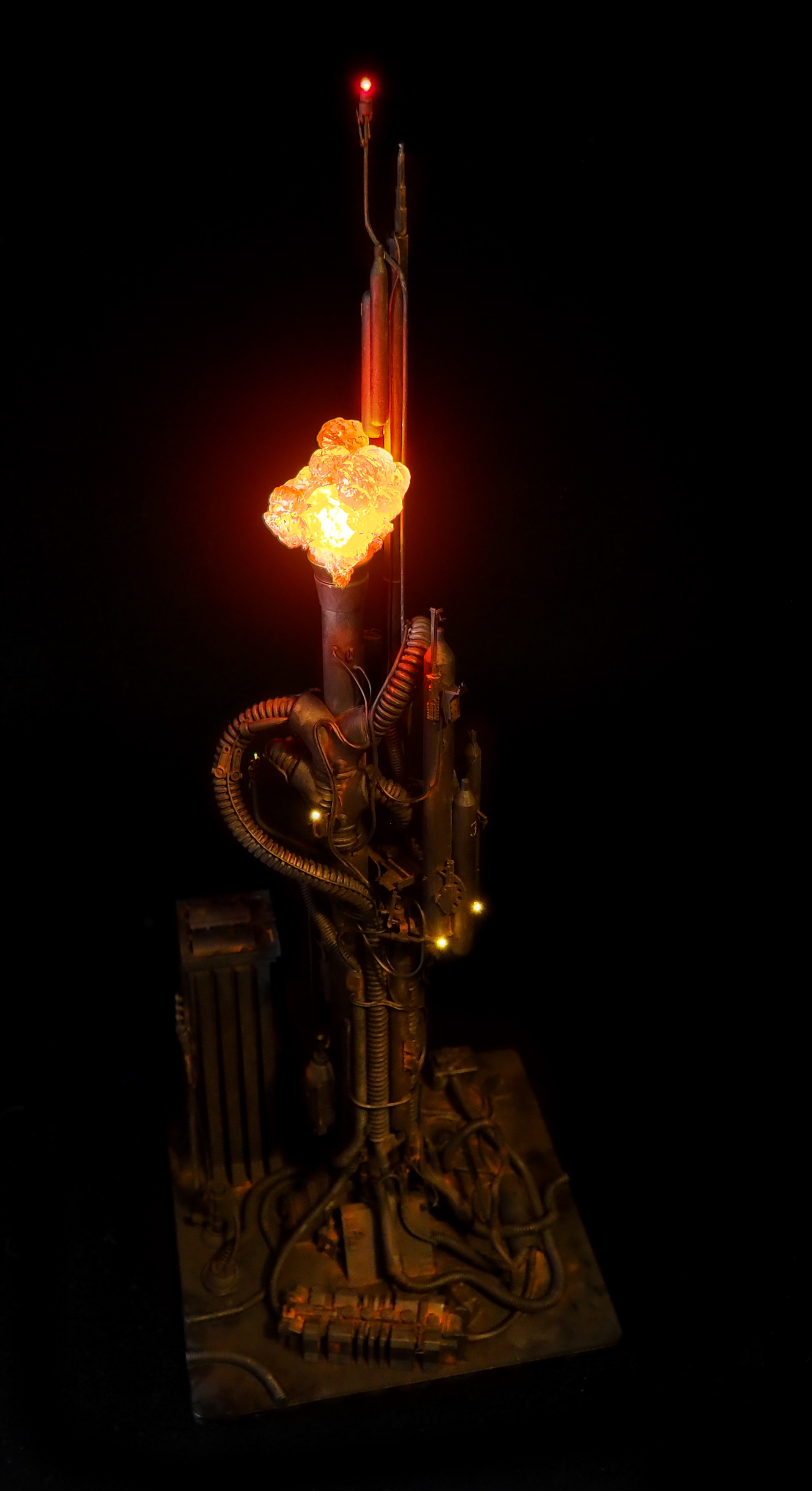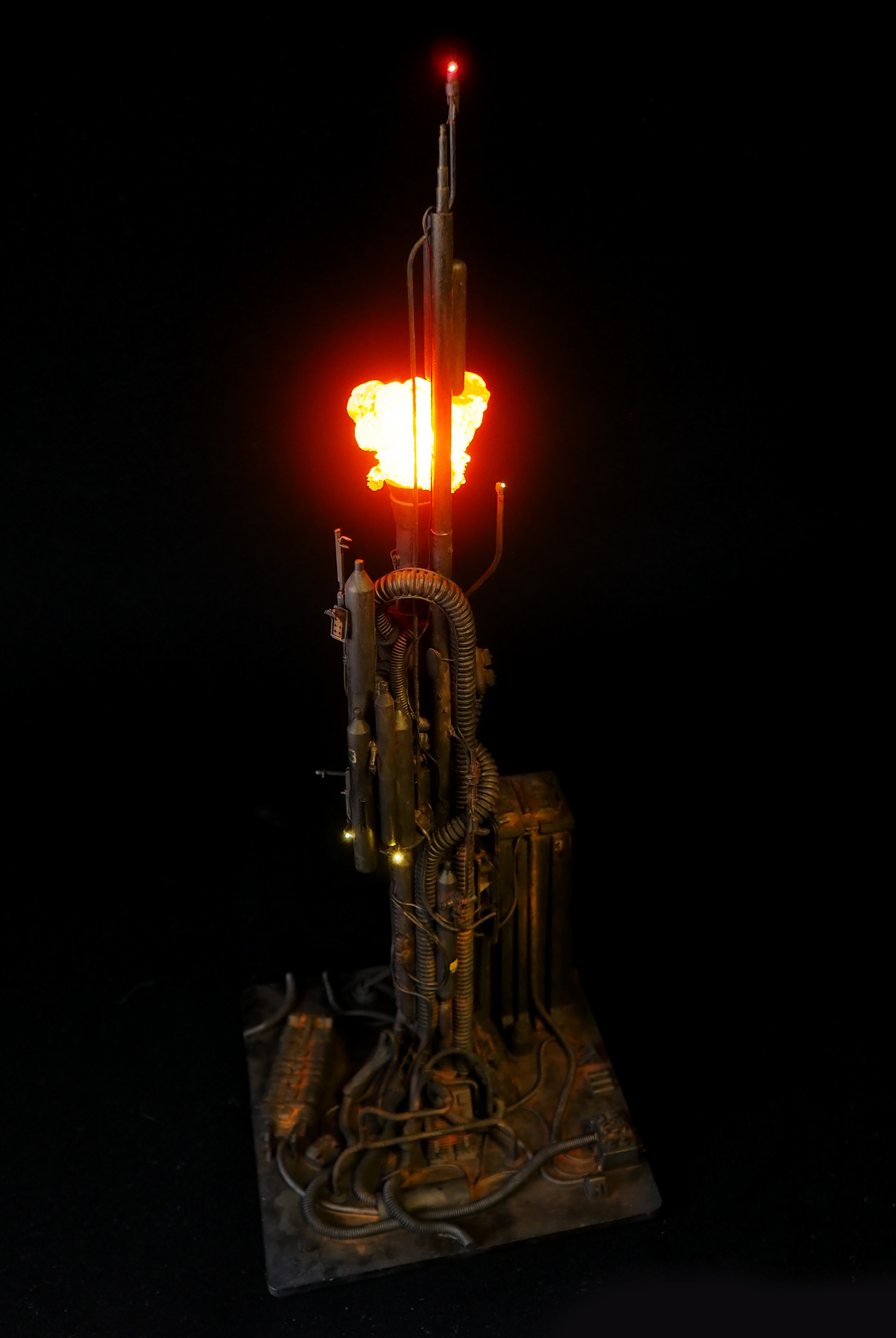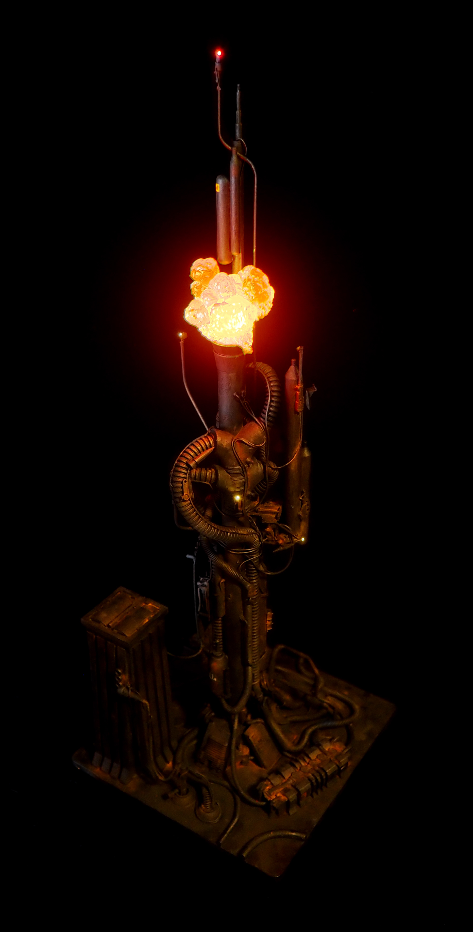 This is my interpretation of one of the foreground refinery towers from the Hades Landscape from the opening shot of Blade Runner. To achieve the belching fire effect, I printed a fireball in clear resin and embedded a series of flickering LEDs inside. All other lights are super micro surface mount LEDs being fed by magnet wire.