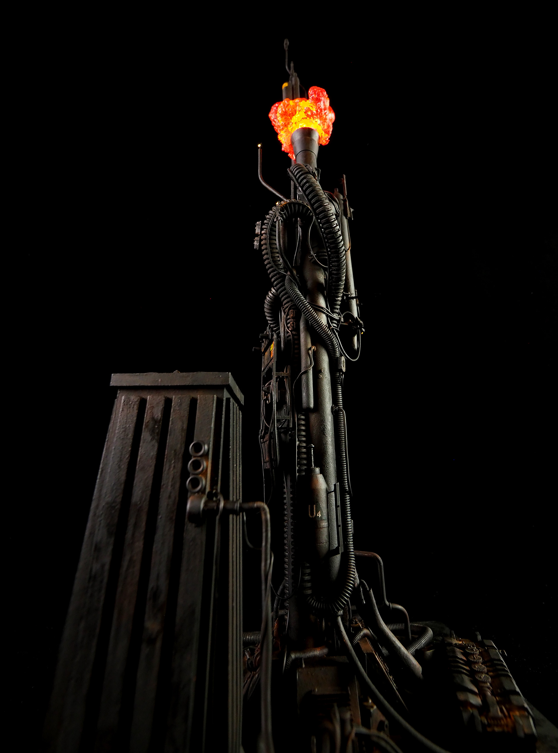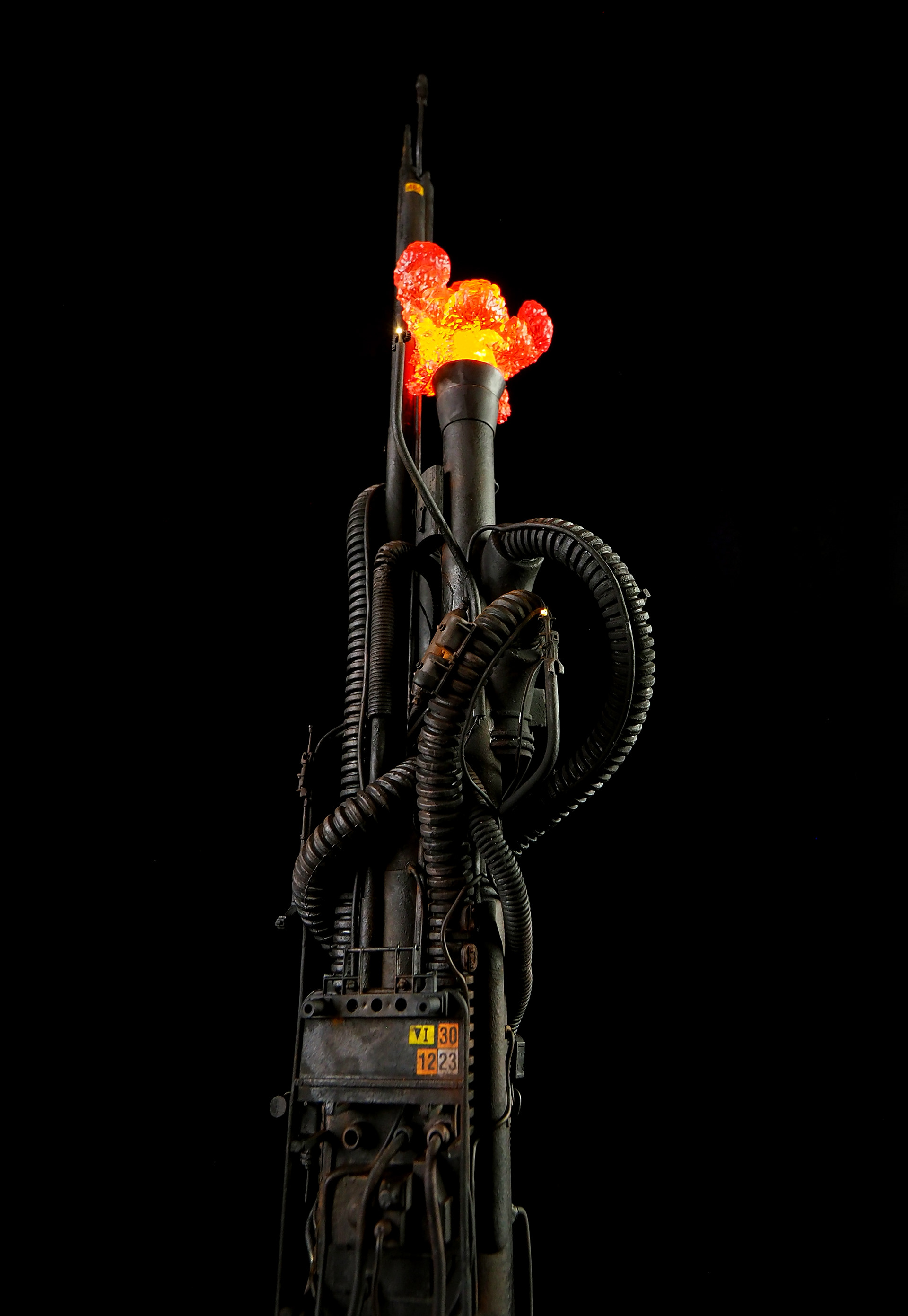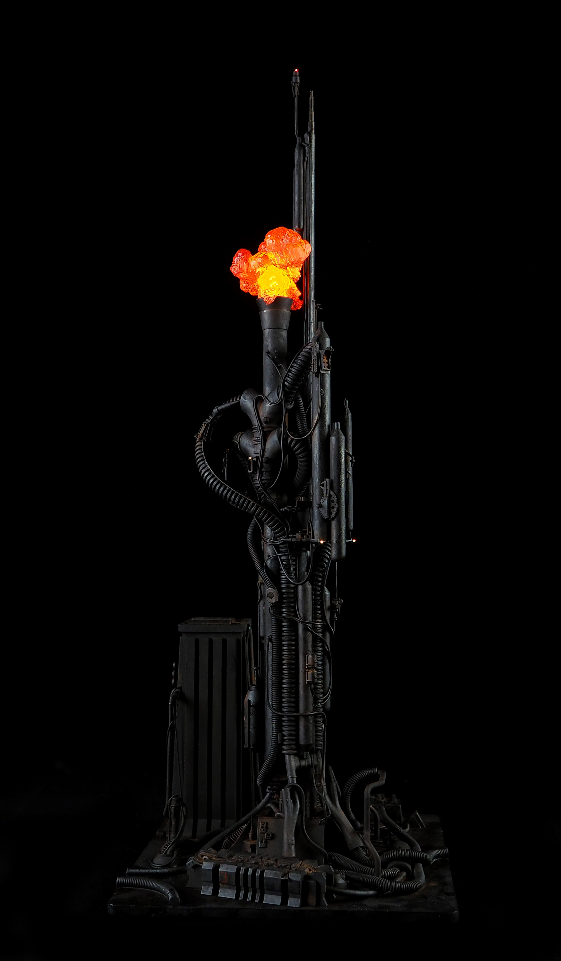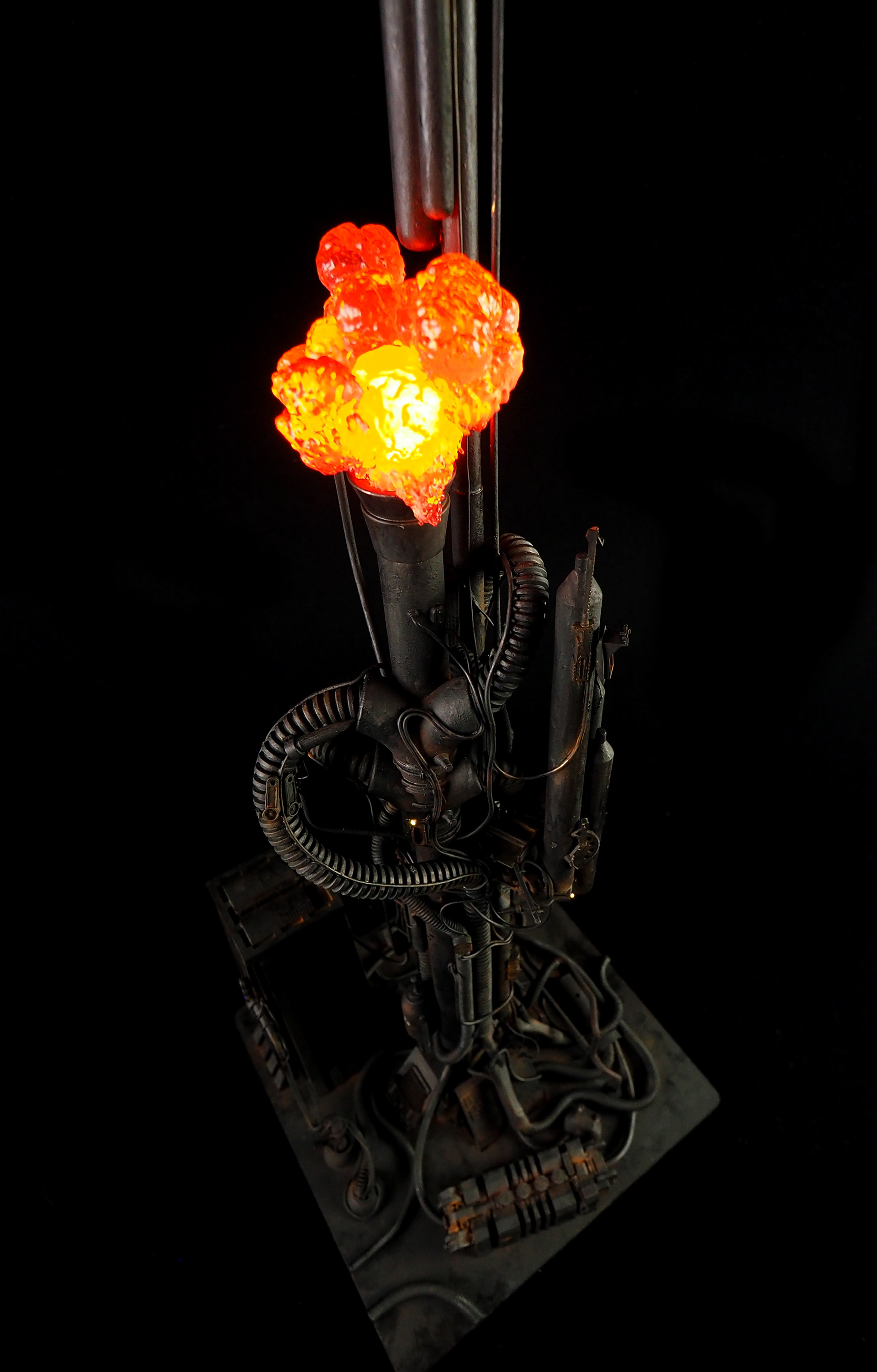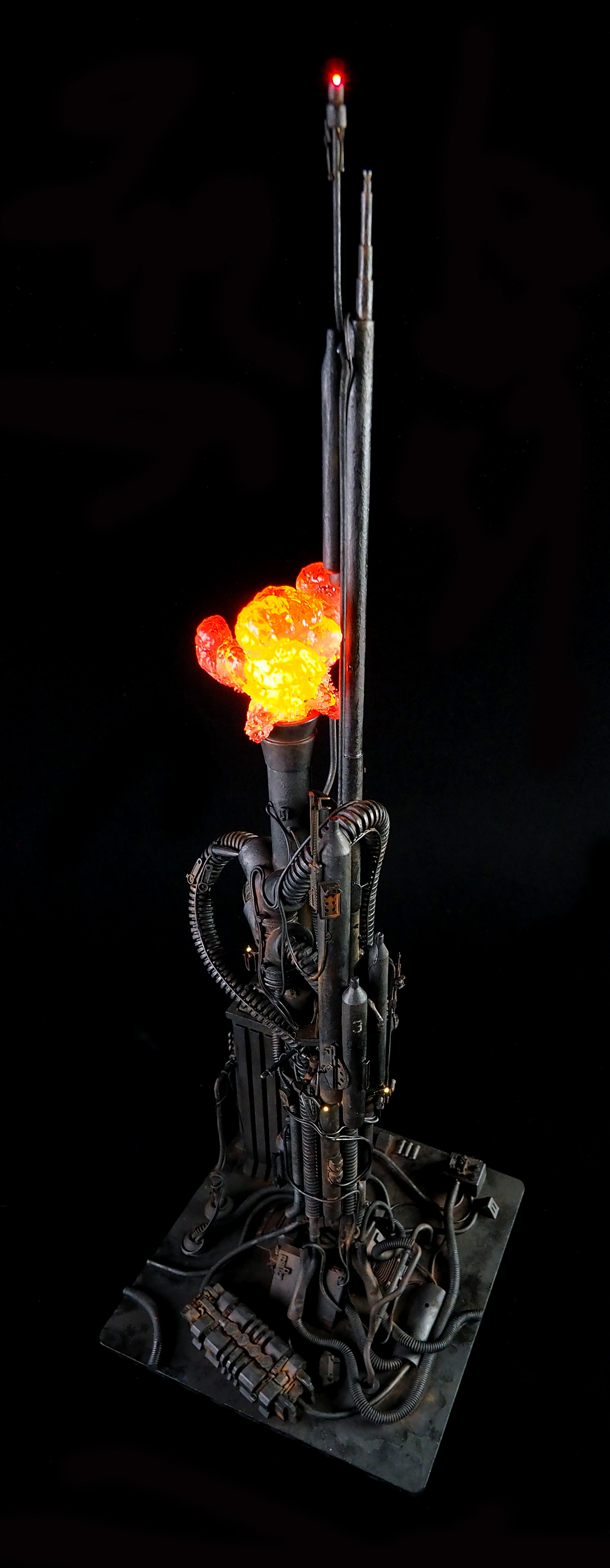 This is my interpretation of one of the foreground refinery towers from the Hades Landscape from the opening shot of Blade Runner. To achieve the belching fire effect, I printed a fireball in clear resin and embedded a series of flickering LEDs inside. All other lights are super micro surface mount LEDs being fed by magnet wire.