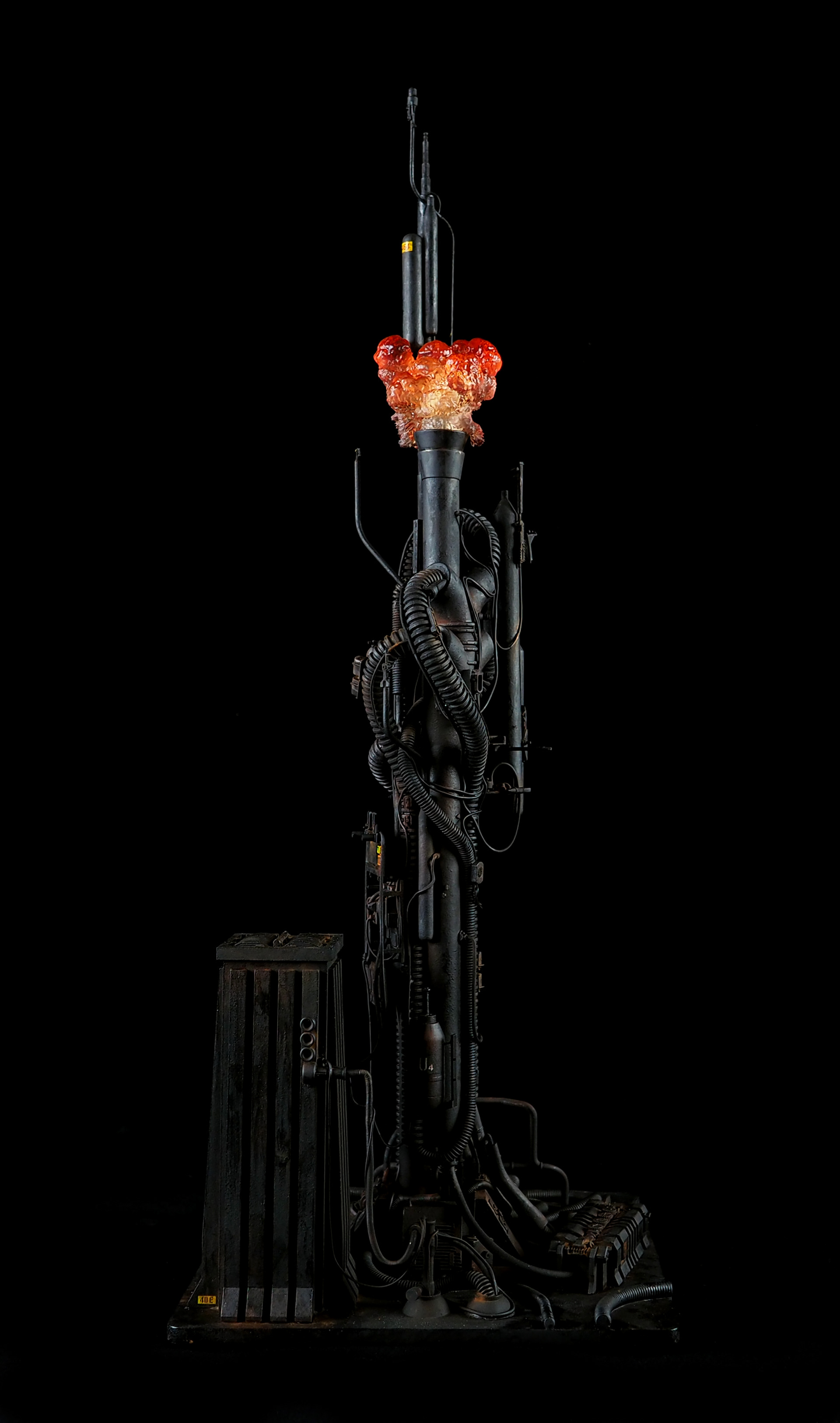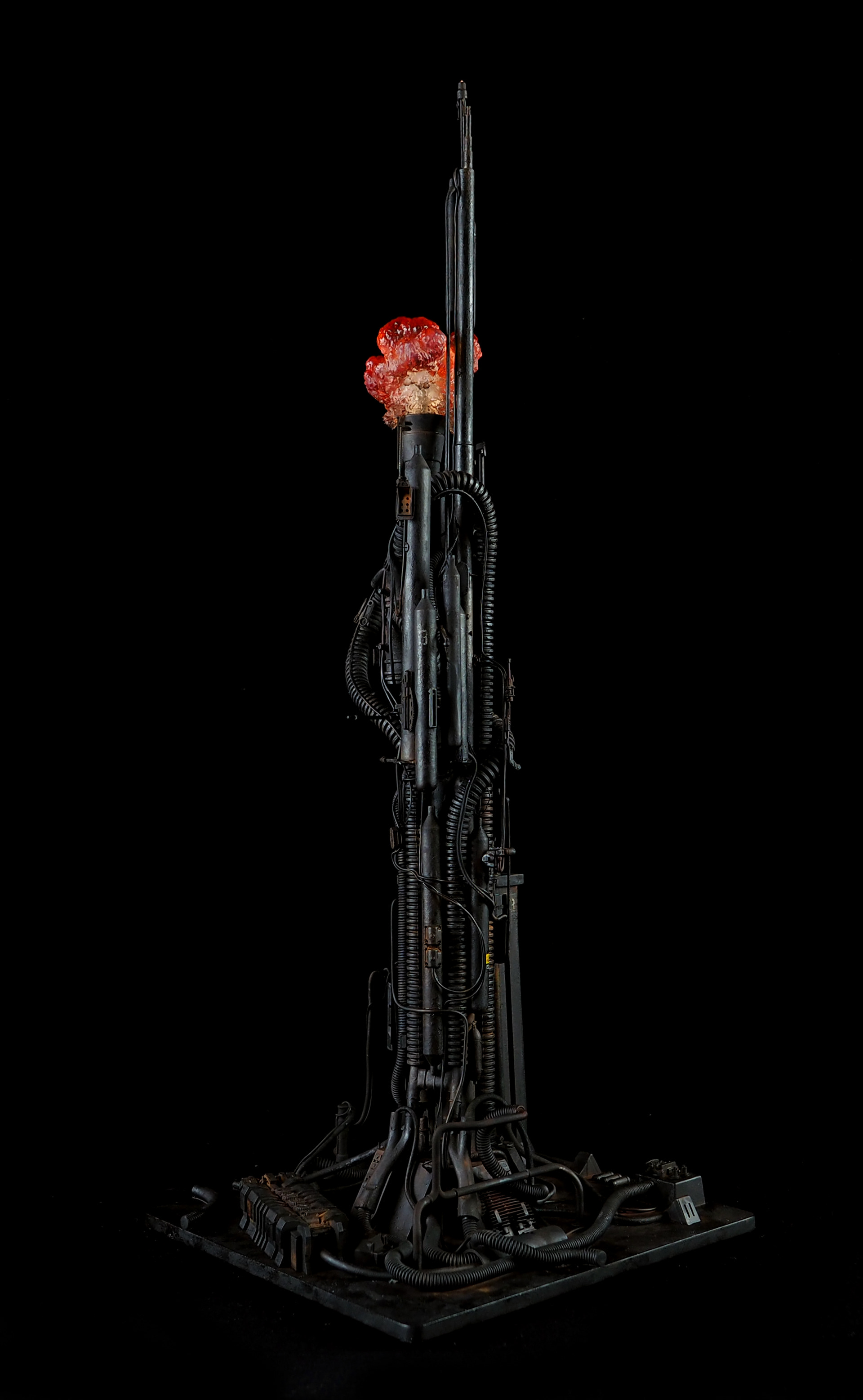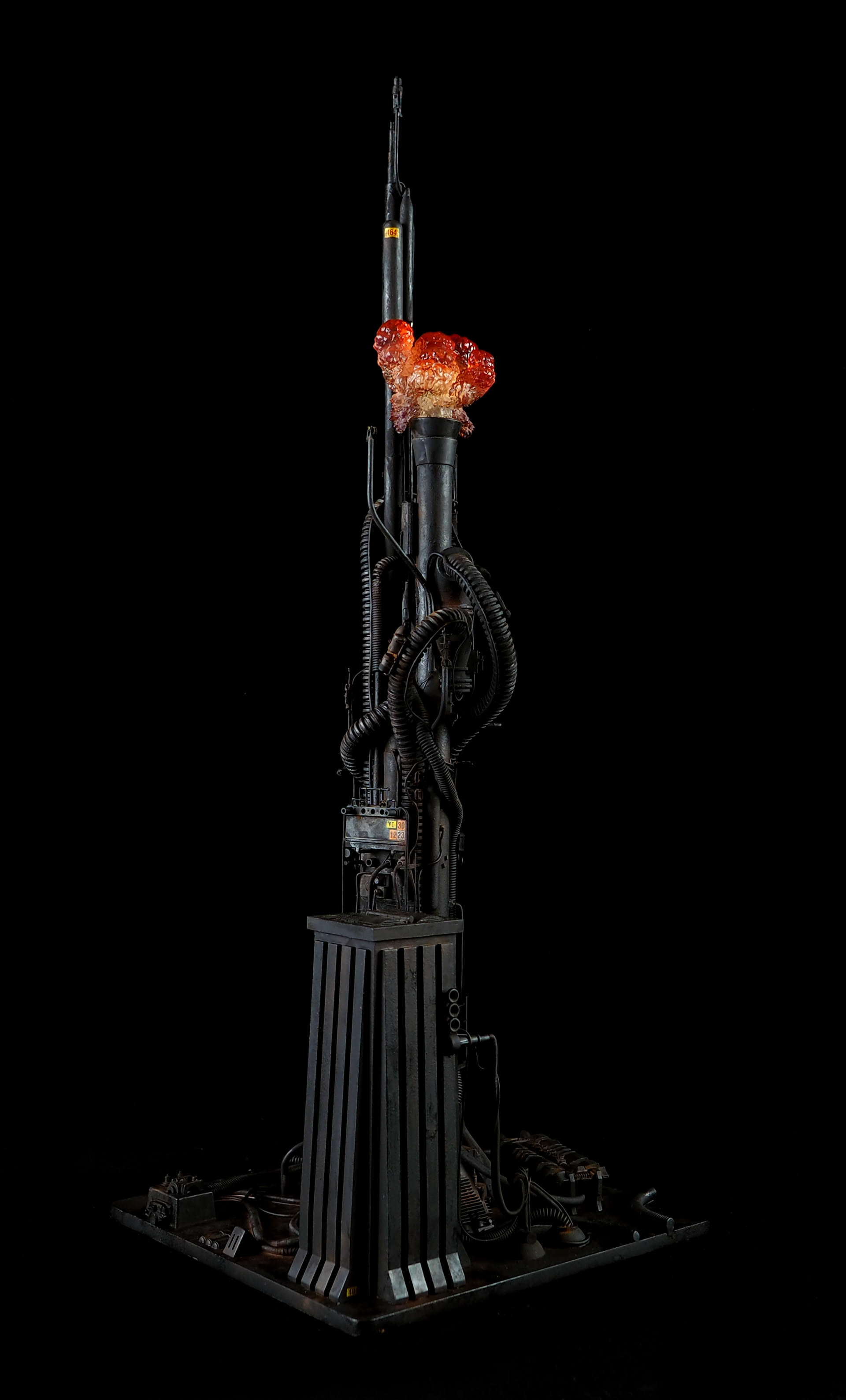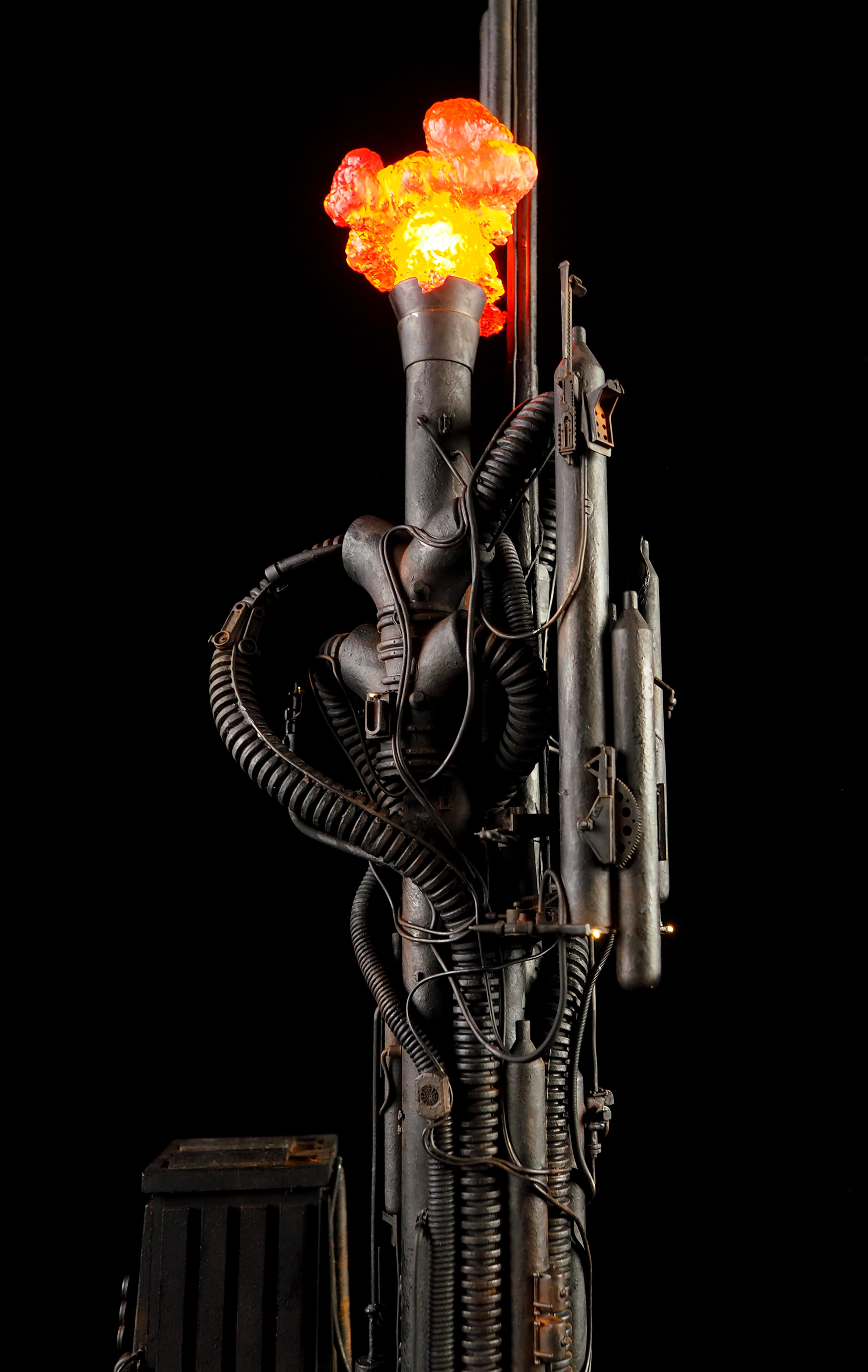 This is my interpretation of one of the foreground refinery towers from the Hades Landscape from the opening shot of Blade Runner. To achieve the belching fire effect, I printed a fireball in clear resin and embedded a series of flickering LEDs inside. All other lights are super micro surface mount LEDs being fed by magnet wire.