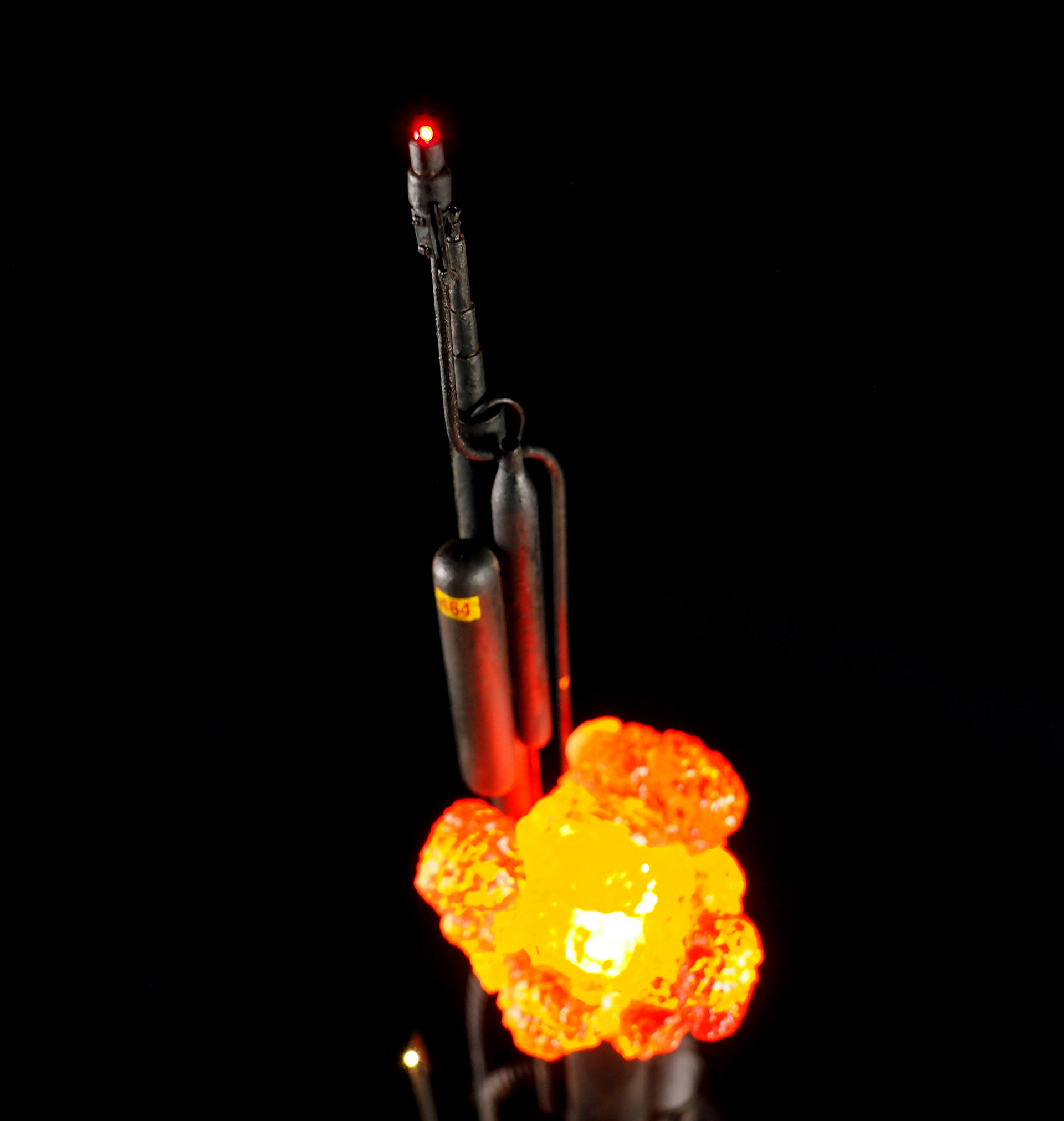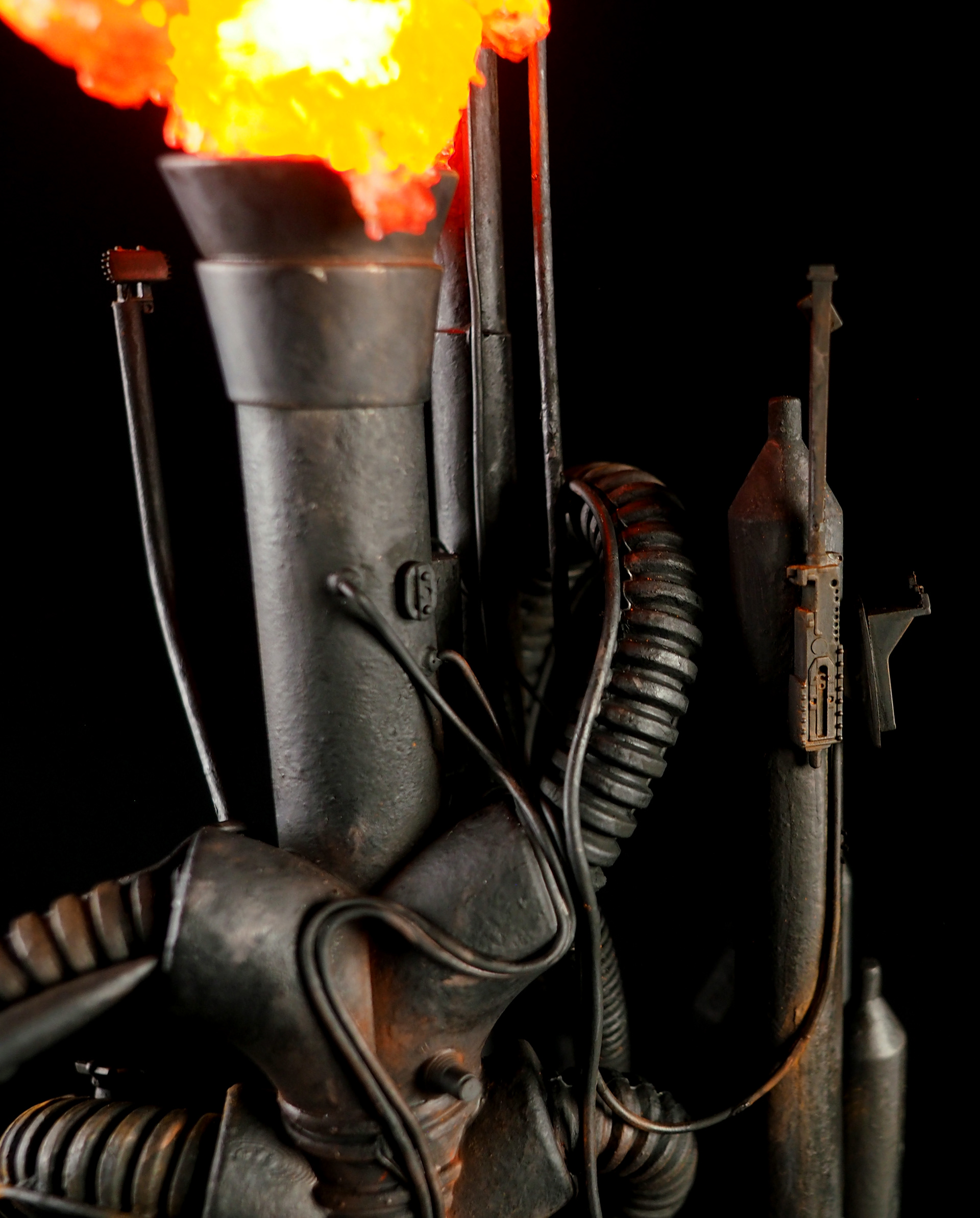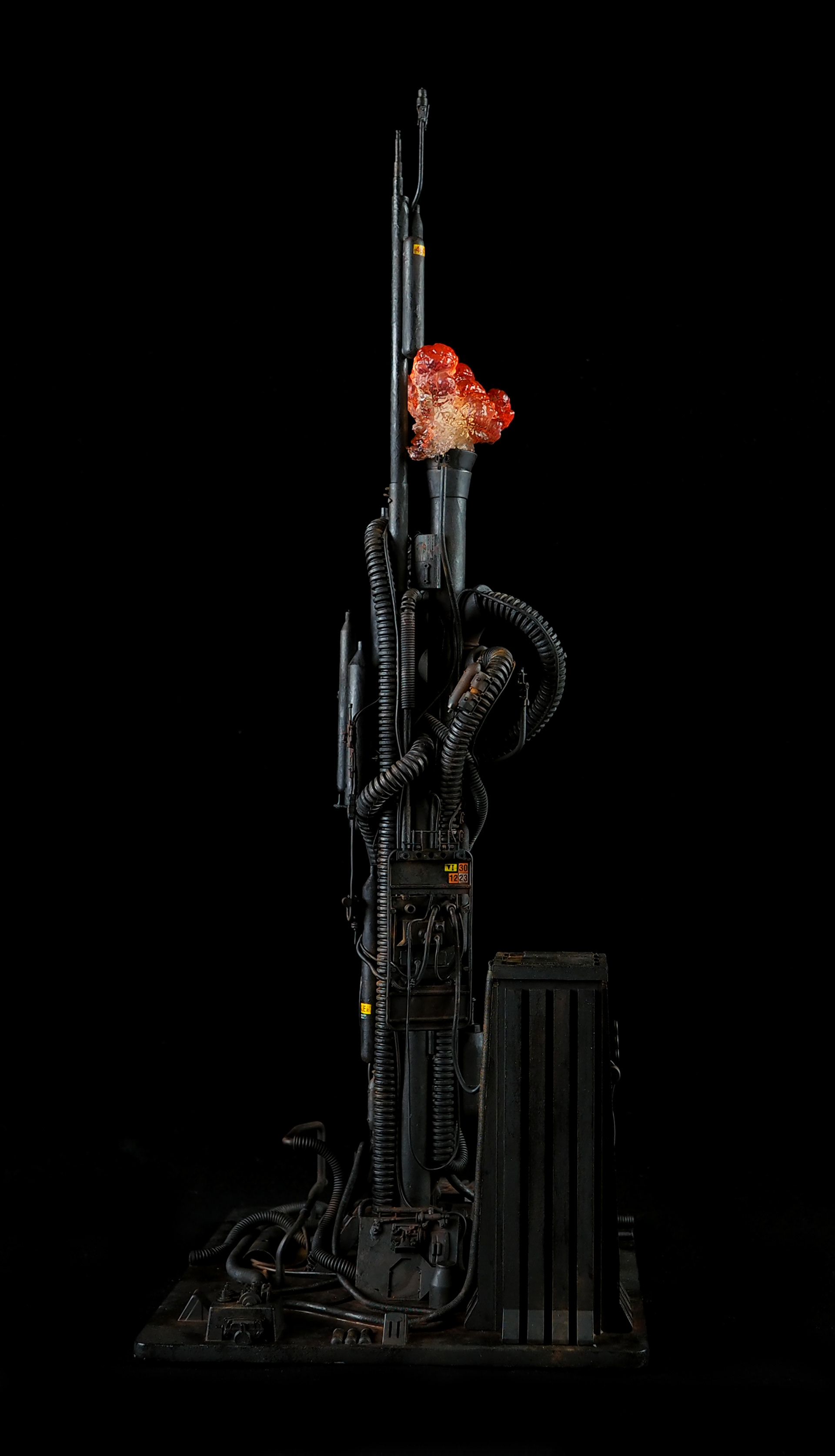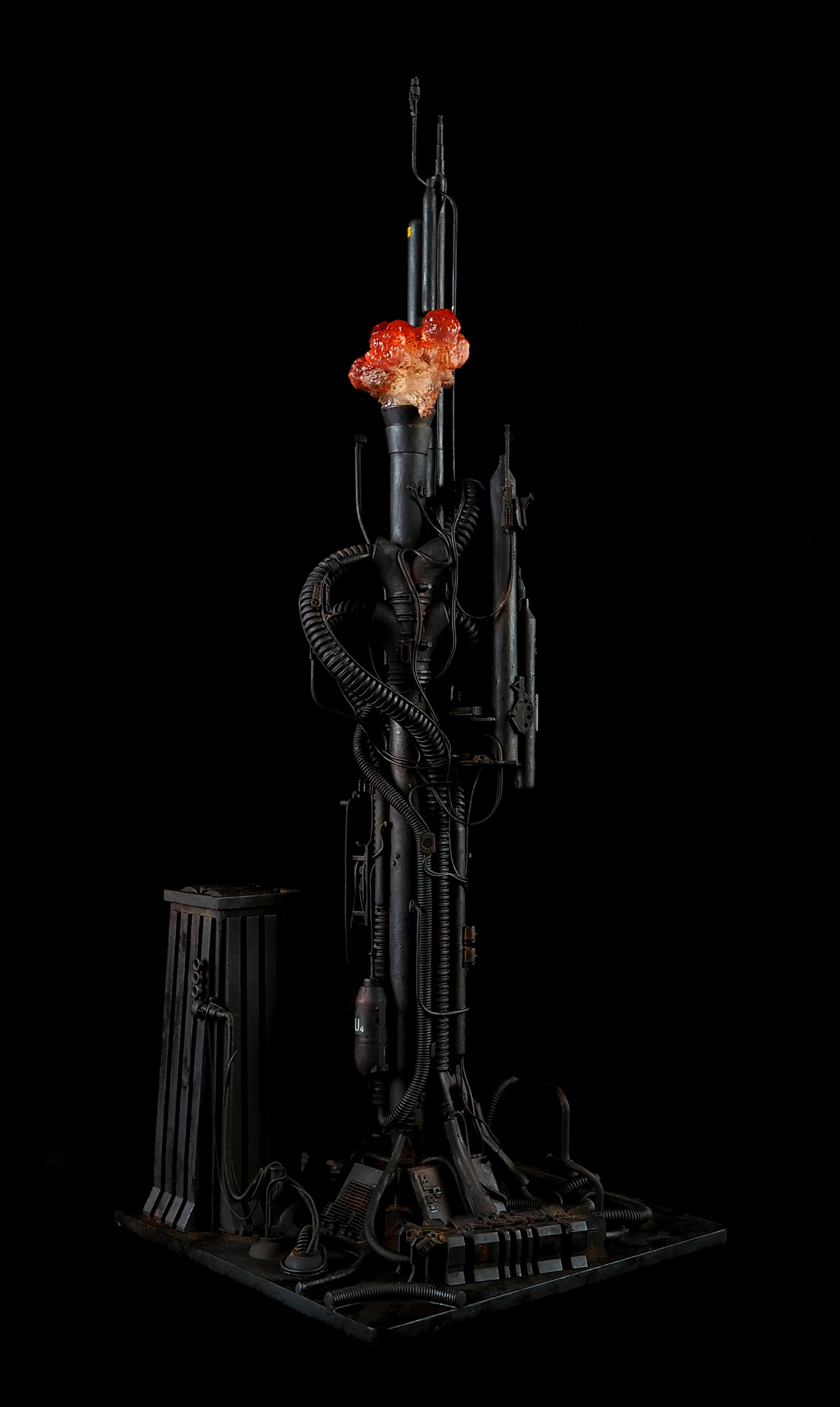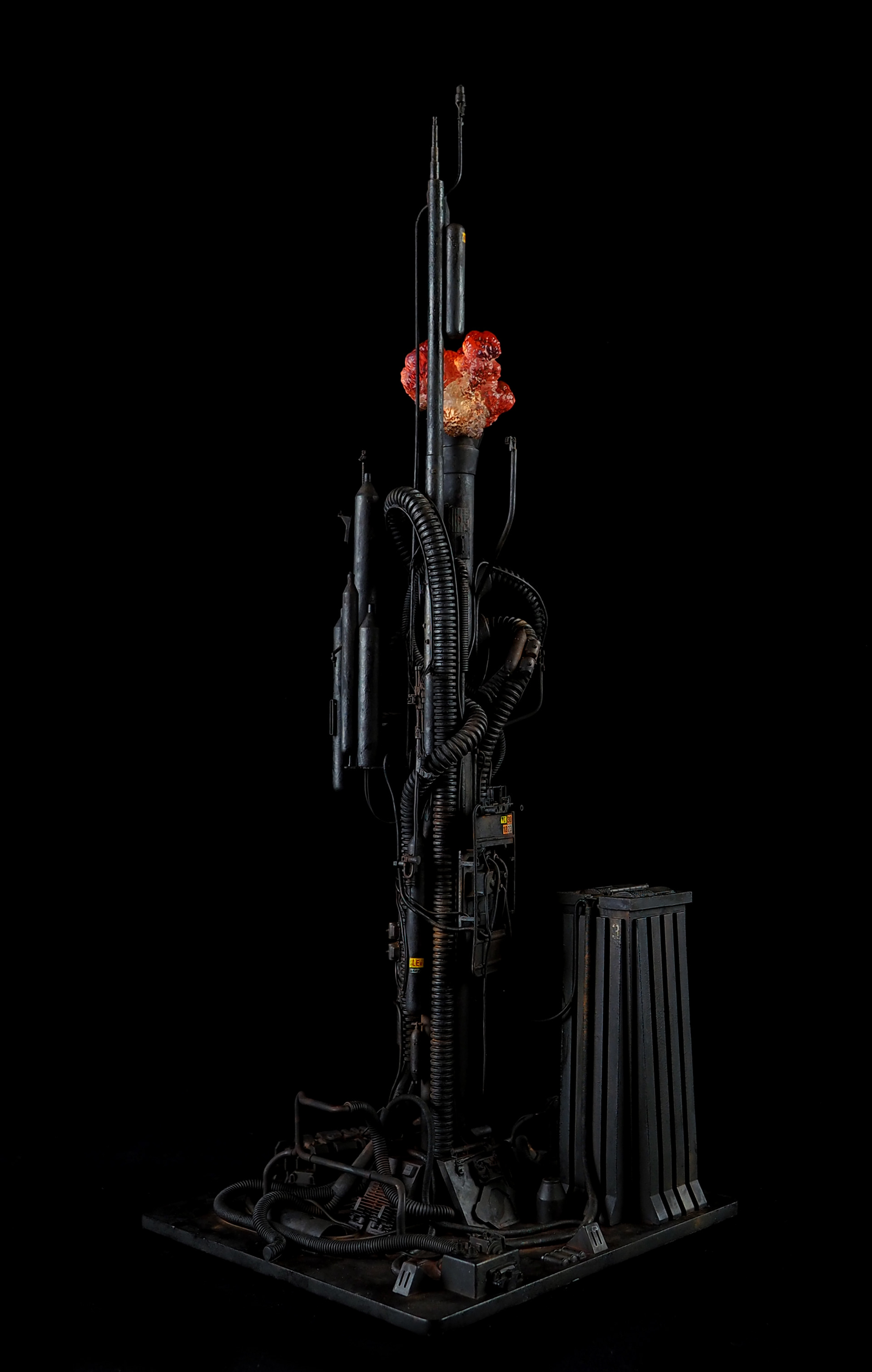 This is my interpretation of one of the foreground refinery towers from the Hades Landscape from the opening shot of Blade Runner. To achieve the belching fire effect, I printed a fireball in clear resin and embedded a series of flickering LEDs inside. All other lights are super micro surface mount LEDs being fed by magnet wire.
