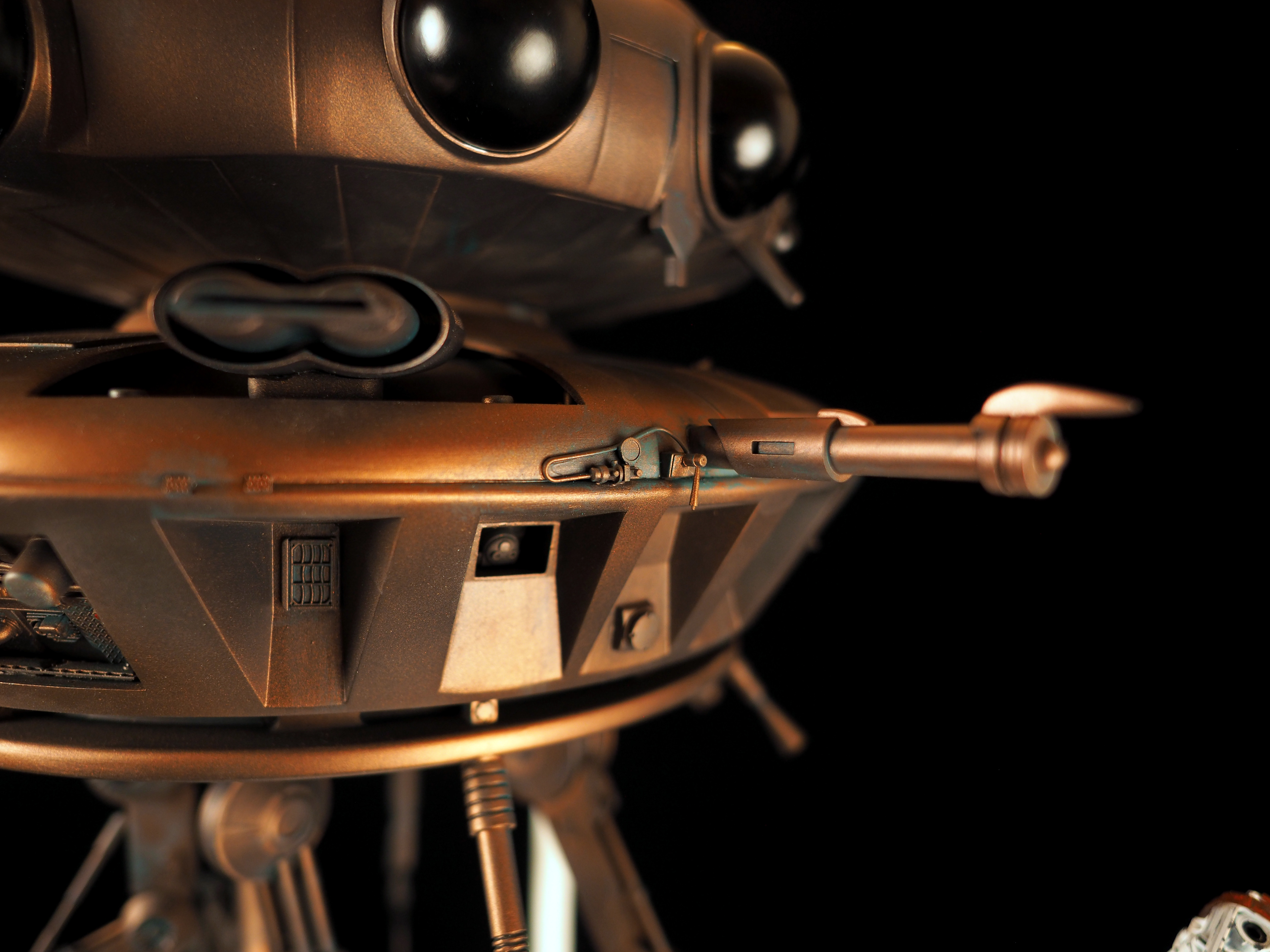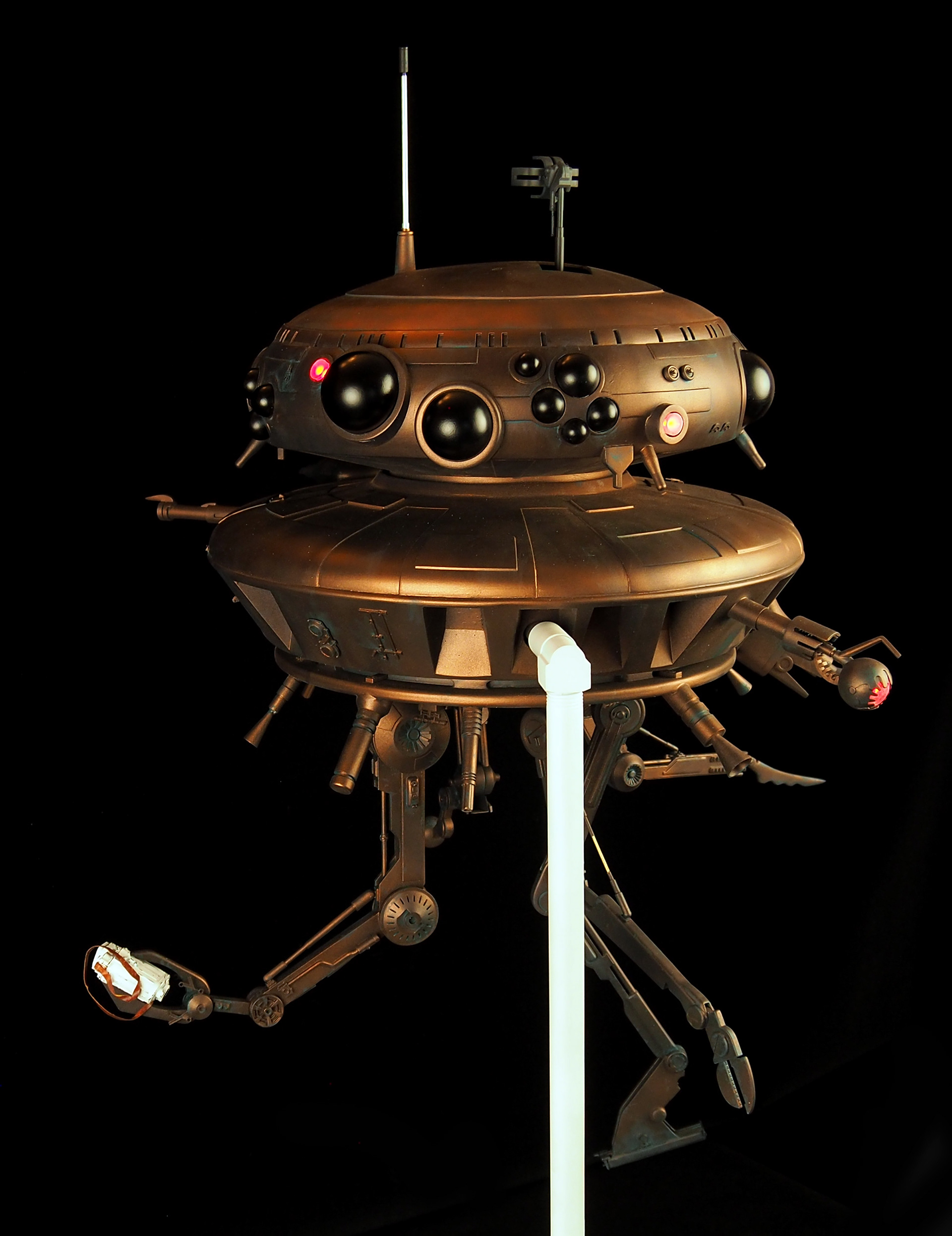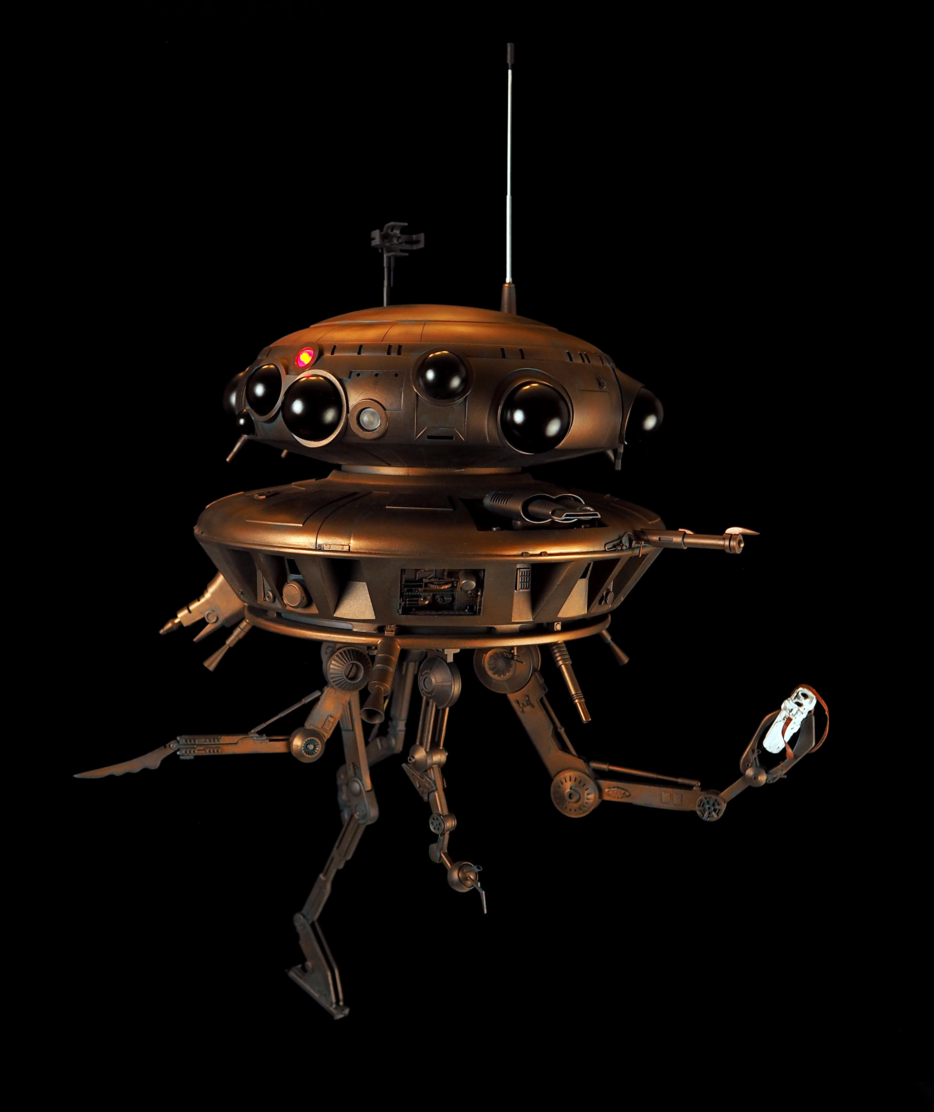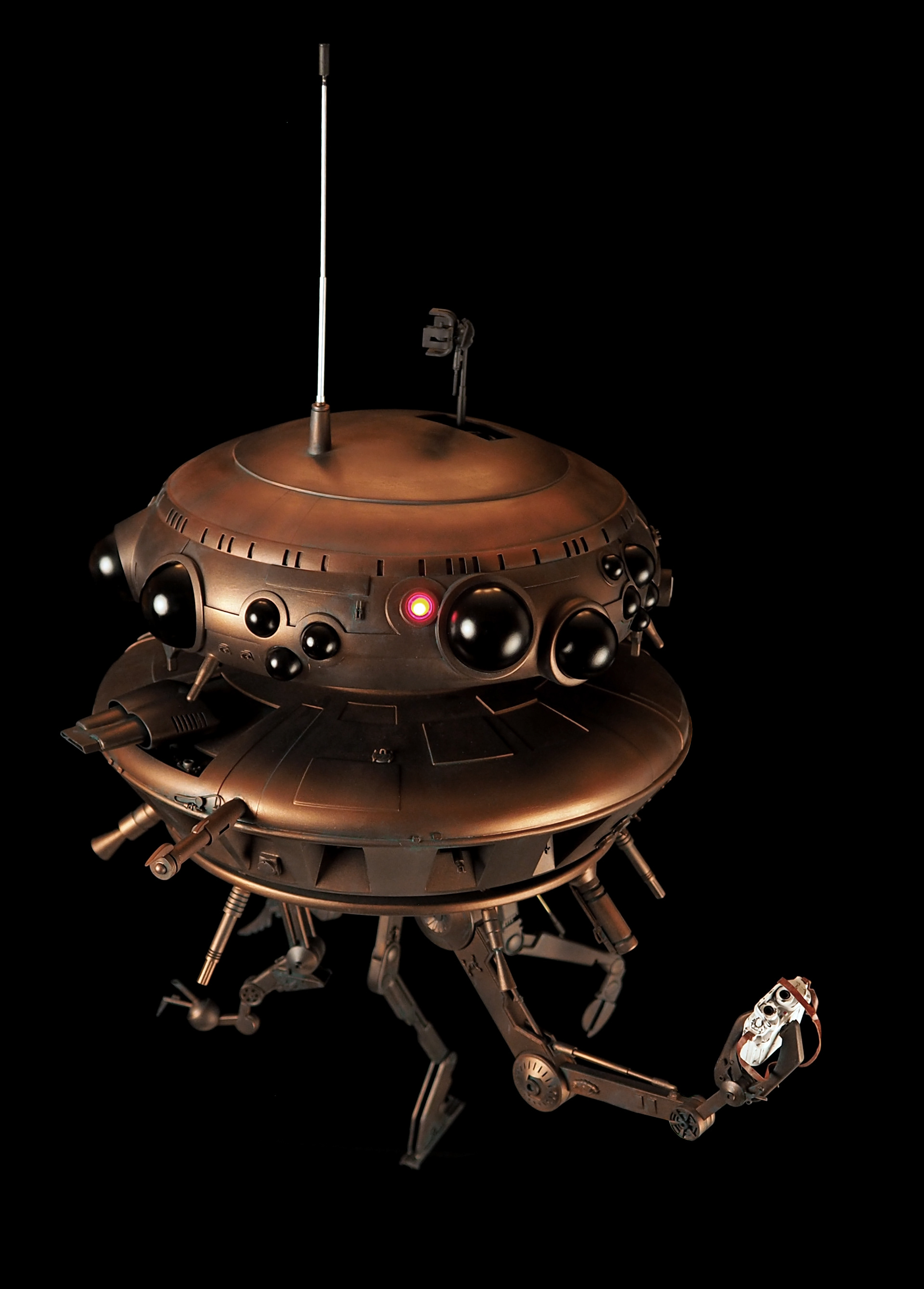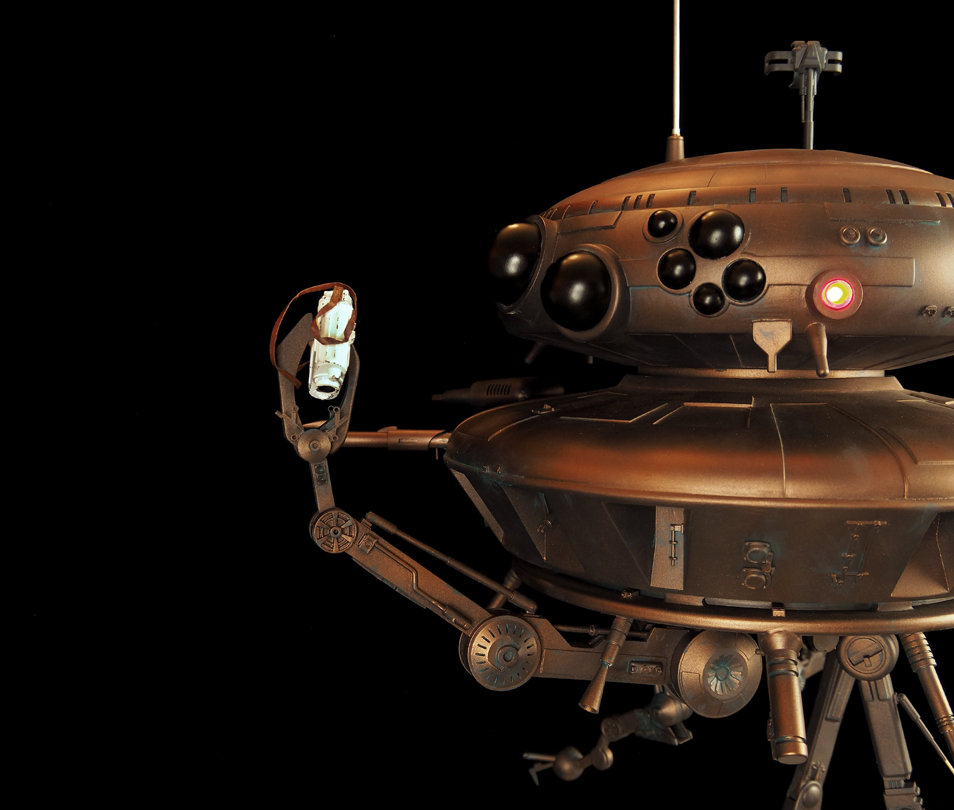 This is a 1/6th interpretation of the Concept Probe Droid, as mostly featured in the classic Ralph McQuarrie painting. I also pulled elements from Joe Johnston drawings, and decided that the copper color treatment would capture the warm tones in the painting. It also further differentiates this from the Probe Droid ILM built, which is a hard model to try to “top”. I like the insect-like elements of the smaller eye clusters (Johnston) as well as the eye stalk (McQuarrie) that seems to have inspired the droid in Jabba’s Palace’s main gate. I decided this is 1/6th scale which makes this version of a Probe Droid appreciably larger than the final model, and by having one of the arms holding a pair of Macrobinoculars, the larger sense of scale is conveyed.