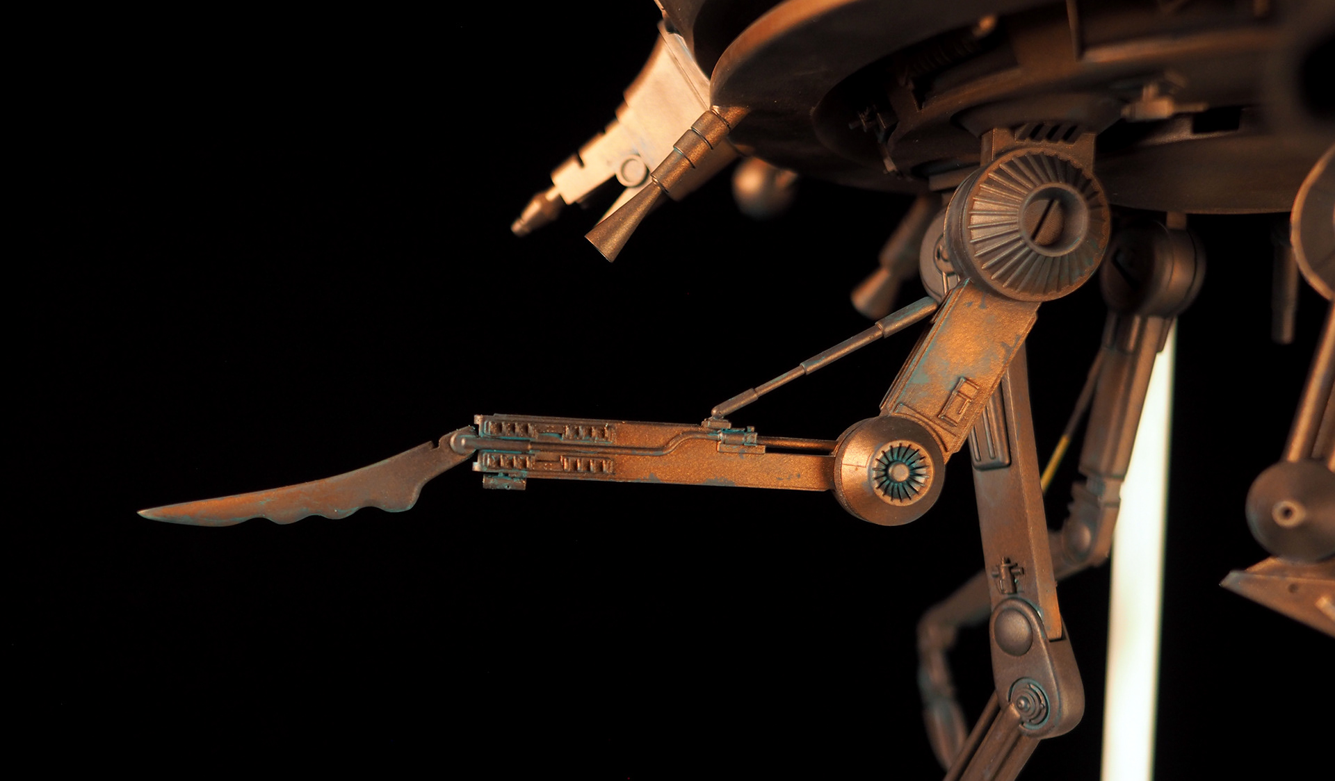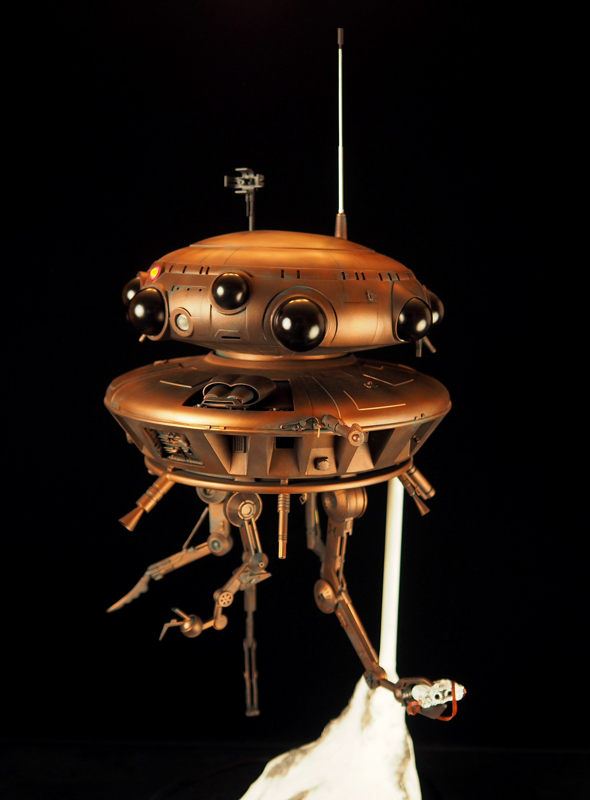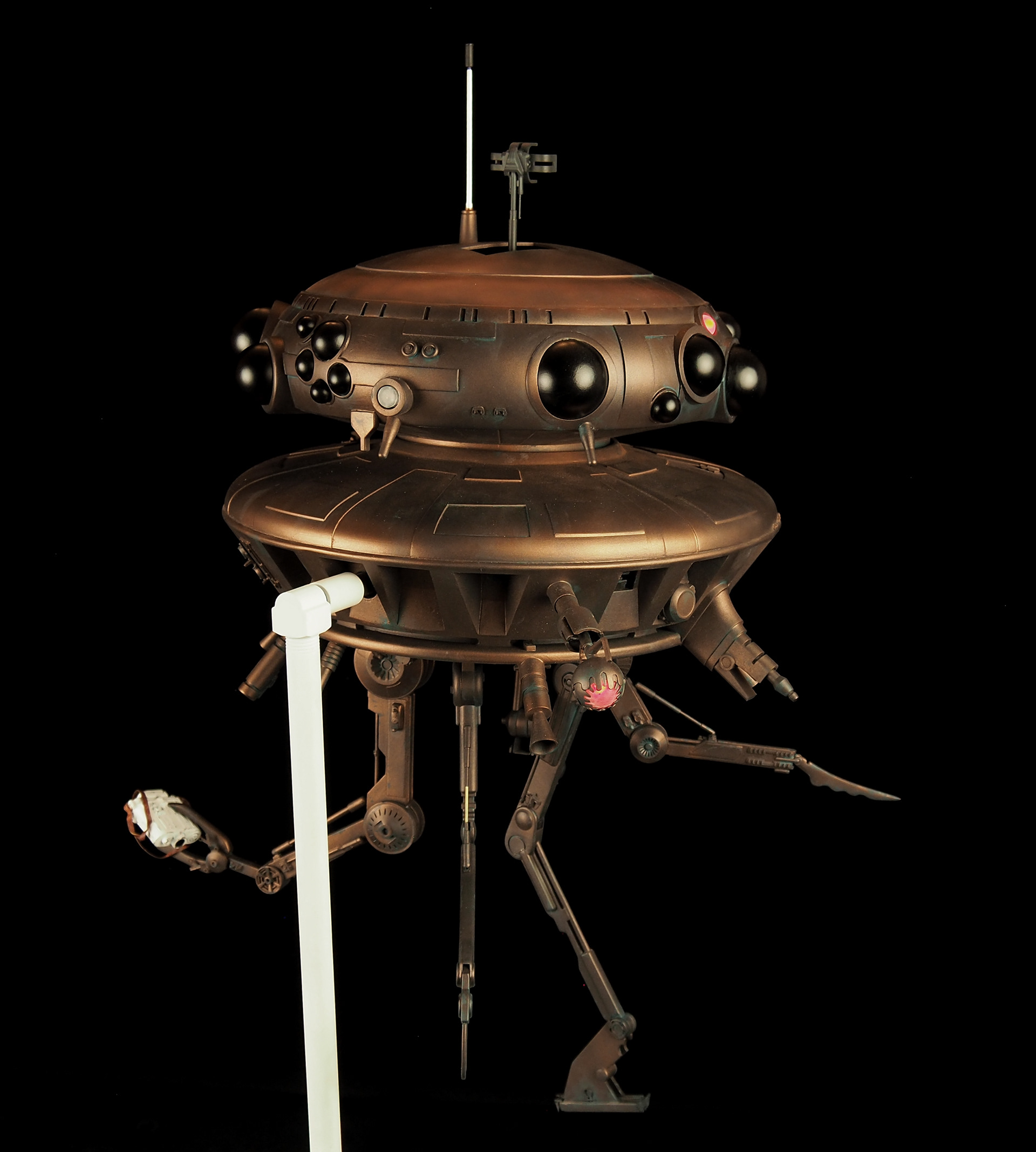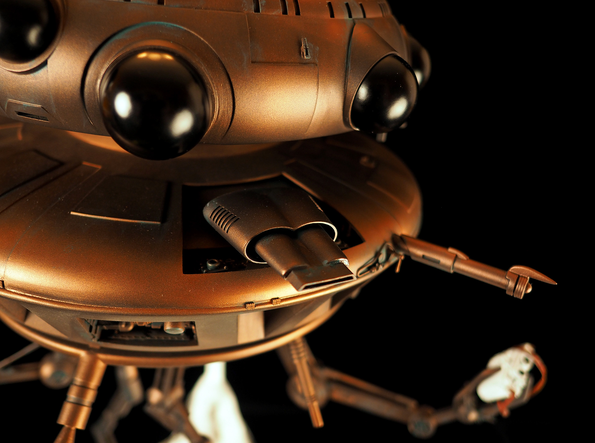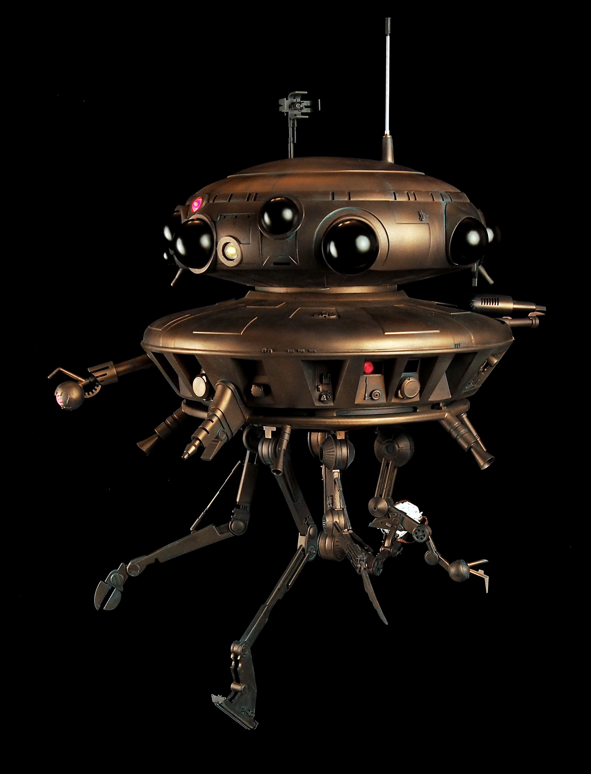 This is a 1/6th interpretation of the Concept Probe Droid, as mostly featured in the classic Ralph McQuarrie painting. I also pulled elements from Joe Johnston drawings, and decided that the copper color treatment would capture the warm tones in the painting. It also further differentiates this from the Probe Droid ILM built, which is a hard model to try to “top”. I like the insect-like elements of the smaller eye clusters (Johnston) as well as the eye stalk (McQuarrie) that seems to have inspired the droid in Jabba’s Palace’s main gate. I decided this is 1/6th scale which makes this version of a Probe Droid appreciably larger than the final model, and by having one of the arms holding a pair of Macrobinoculars, the larger sense of scale is conveyed.