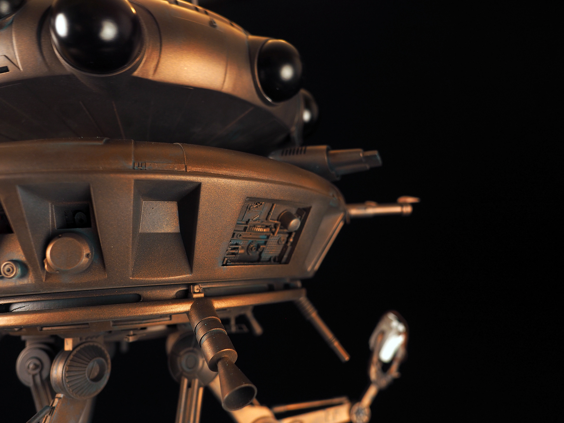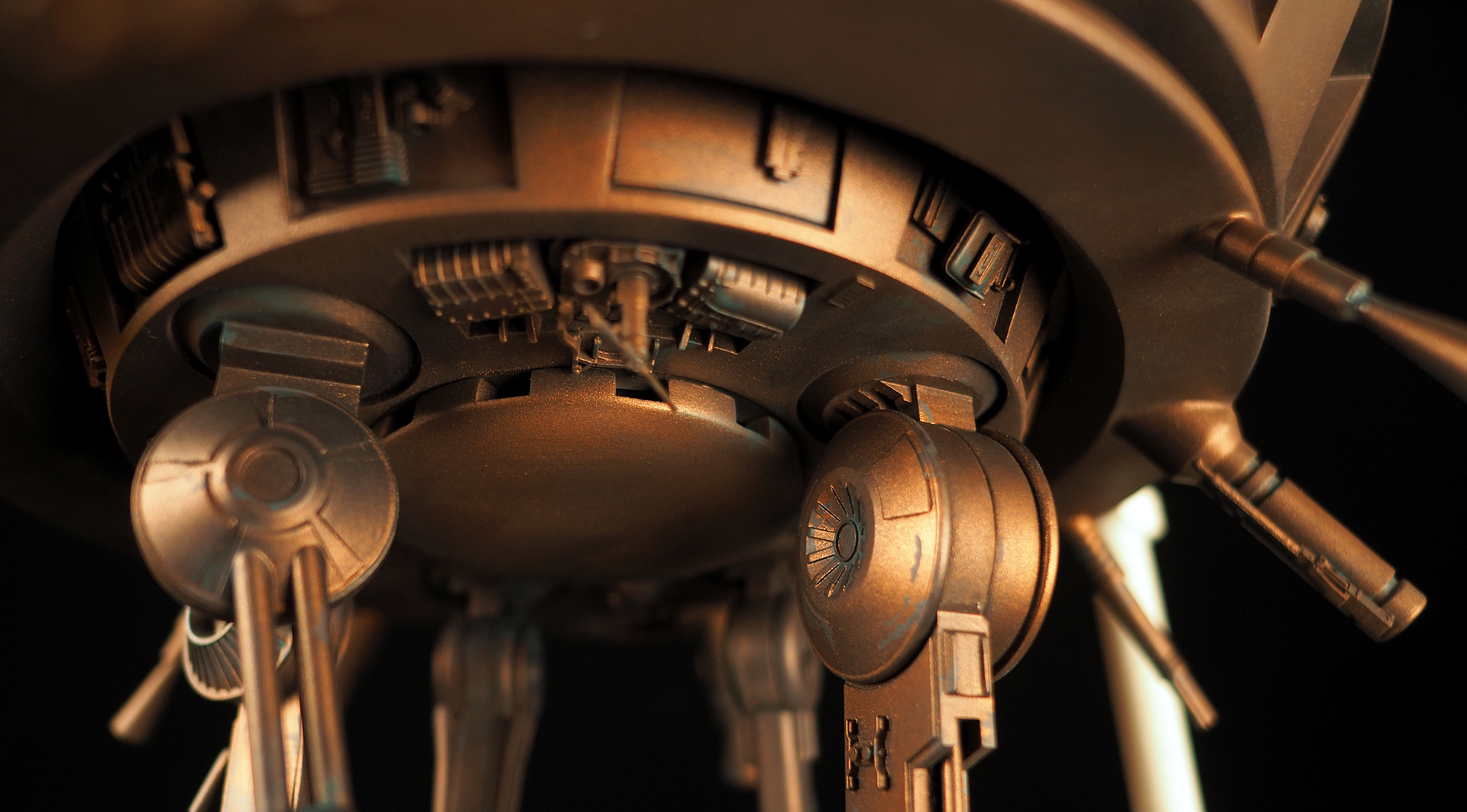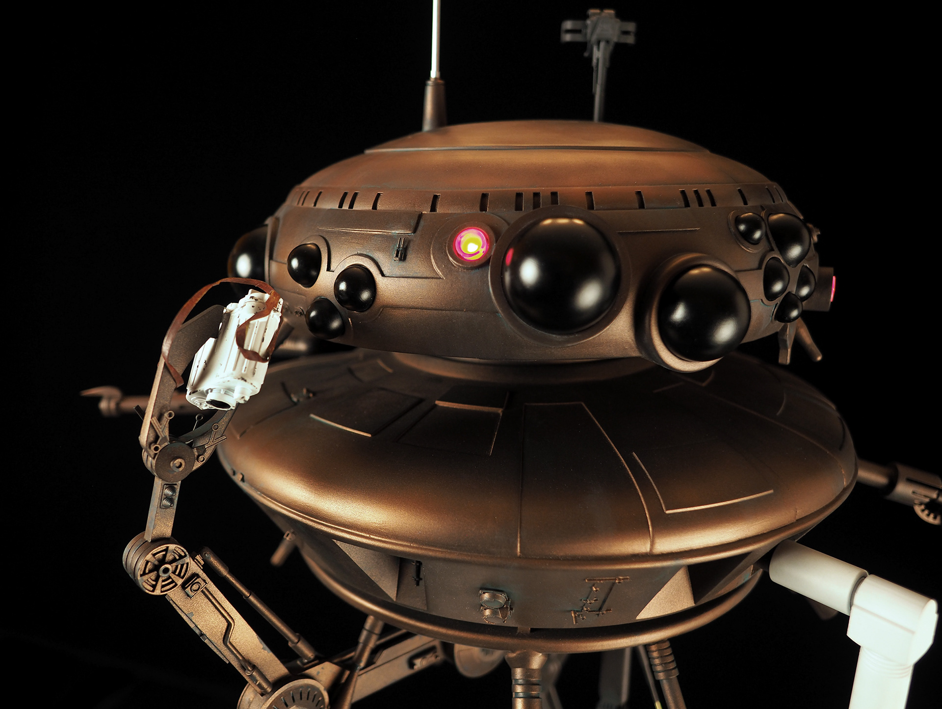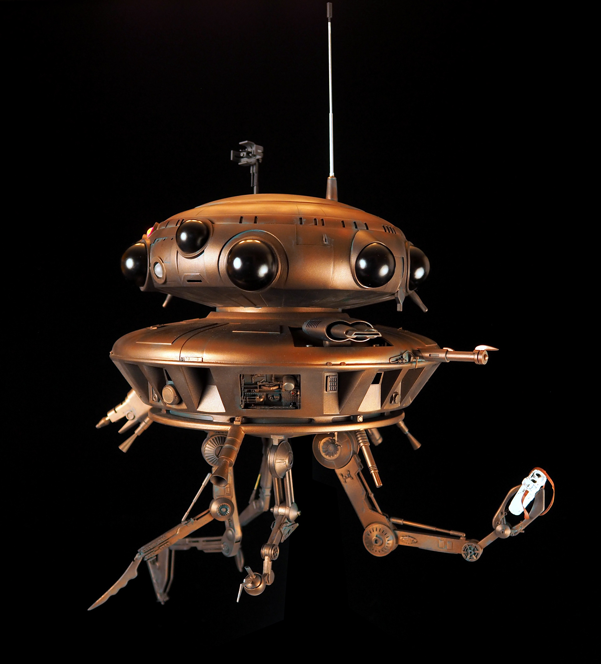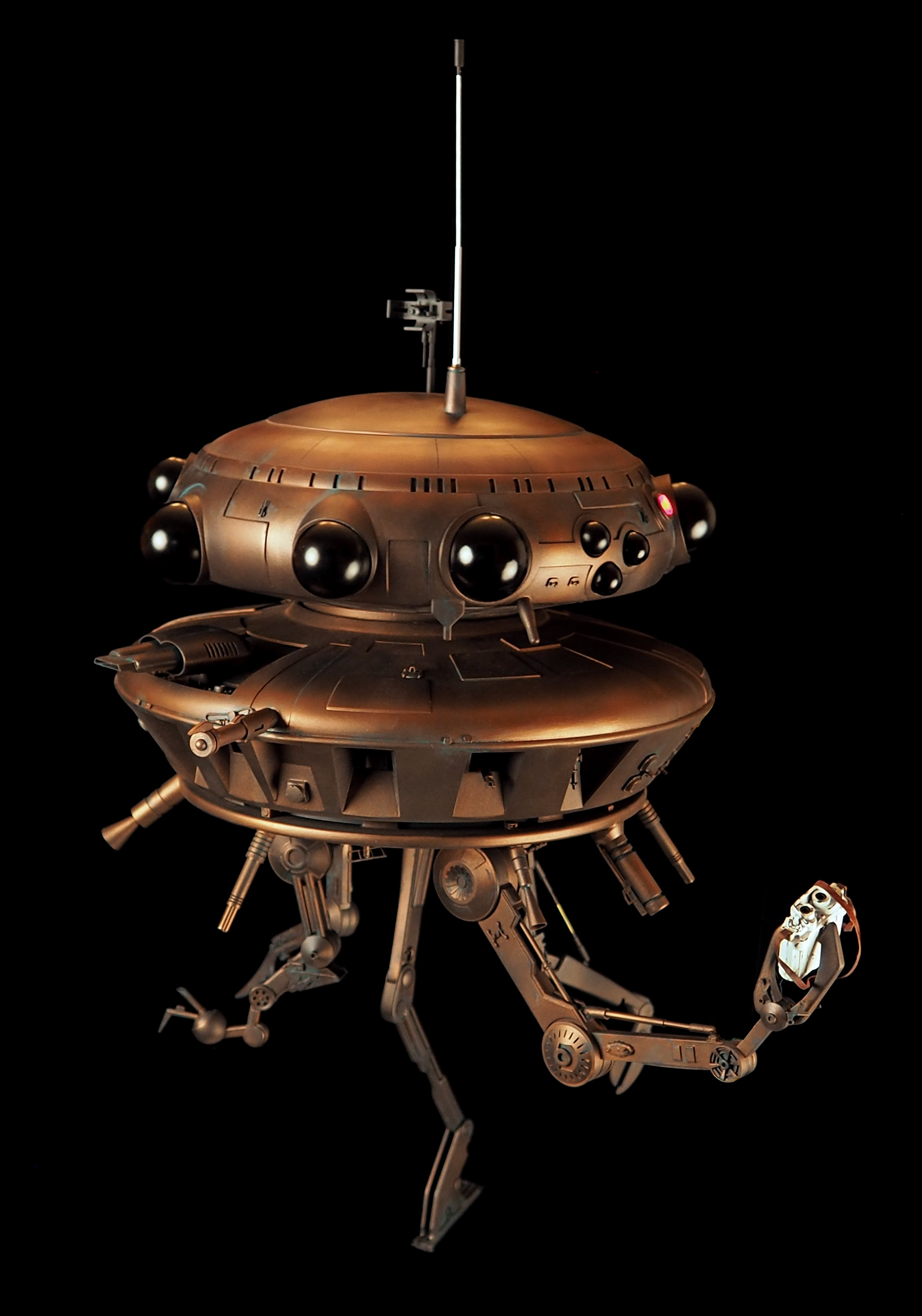 This is a 1/6th interpretation of the Concept Probe Droid, as mostly featured in the classic Ralph McQuarrie painting. I also pulled elements from Joe Johnston drawings, and decided that the copper color treatment would capture the warm tones in the painting. It also further differentiates this from the Probe Droid ILM built, which is a hard model to try to “top”. I like the insect-like elements of the smaller eye clusters (Johnston) as well as the eye stalk (McQuarrie) that seems to have inspired the droid in Jabba’s Palace’s main gate. I decided this is 1/6th scale which makes this version of a Probe Droid appreciably larger than the final model, and by having one of the arms holding a pair of Macrobinoculars, the larger sense of scale is conveyed.