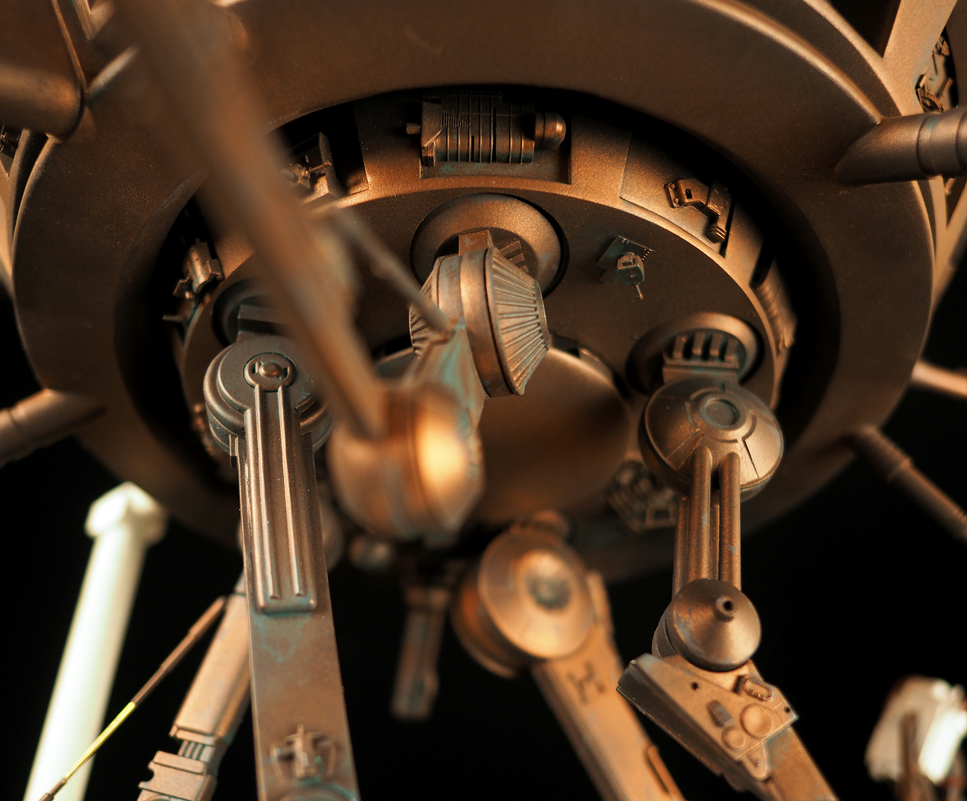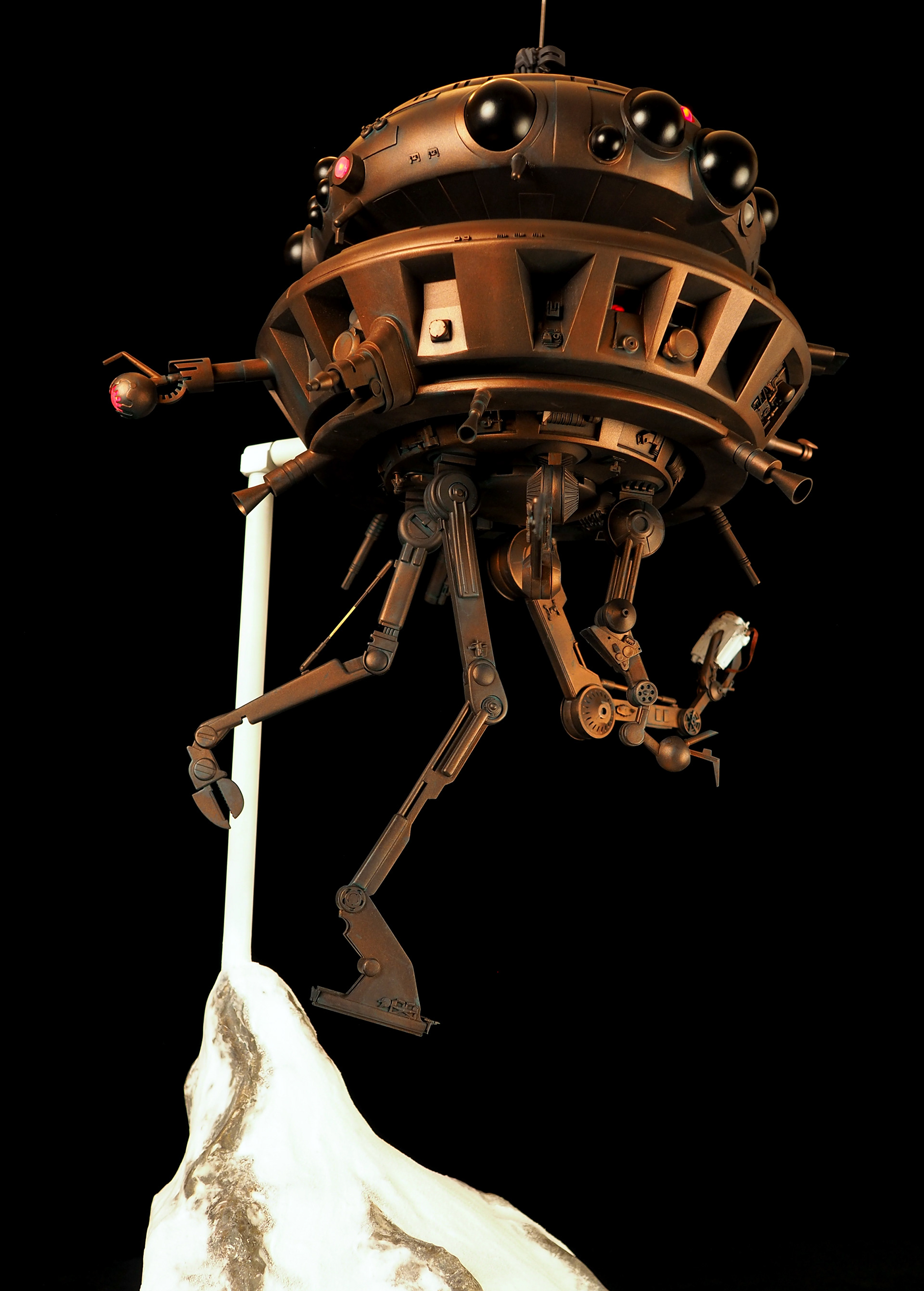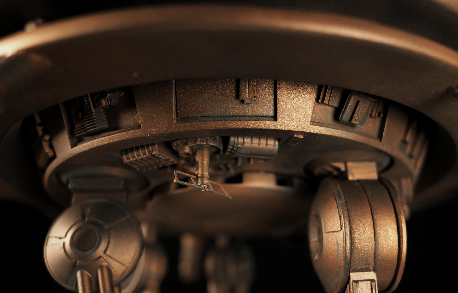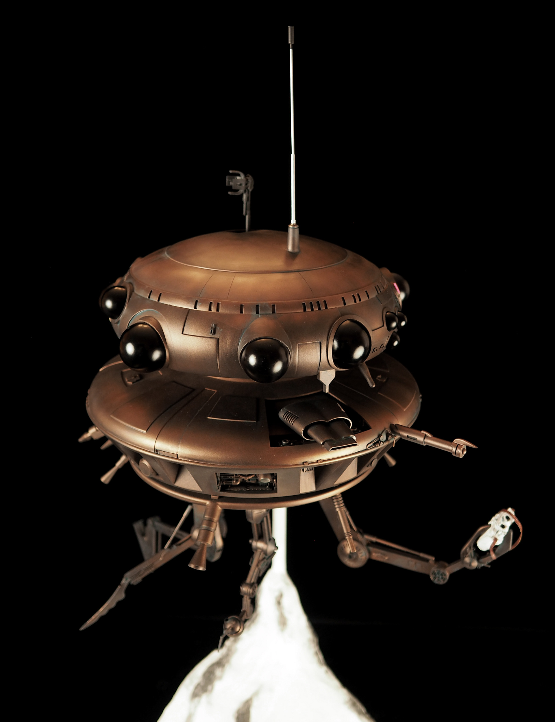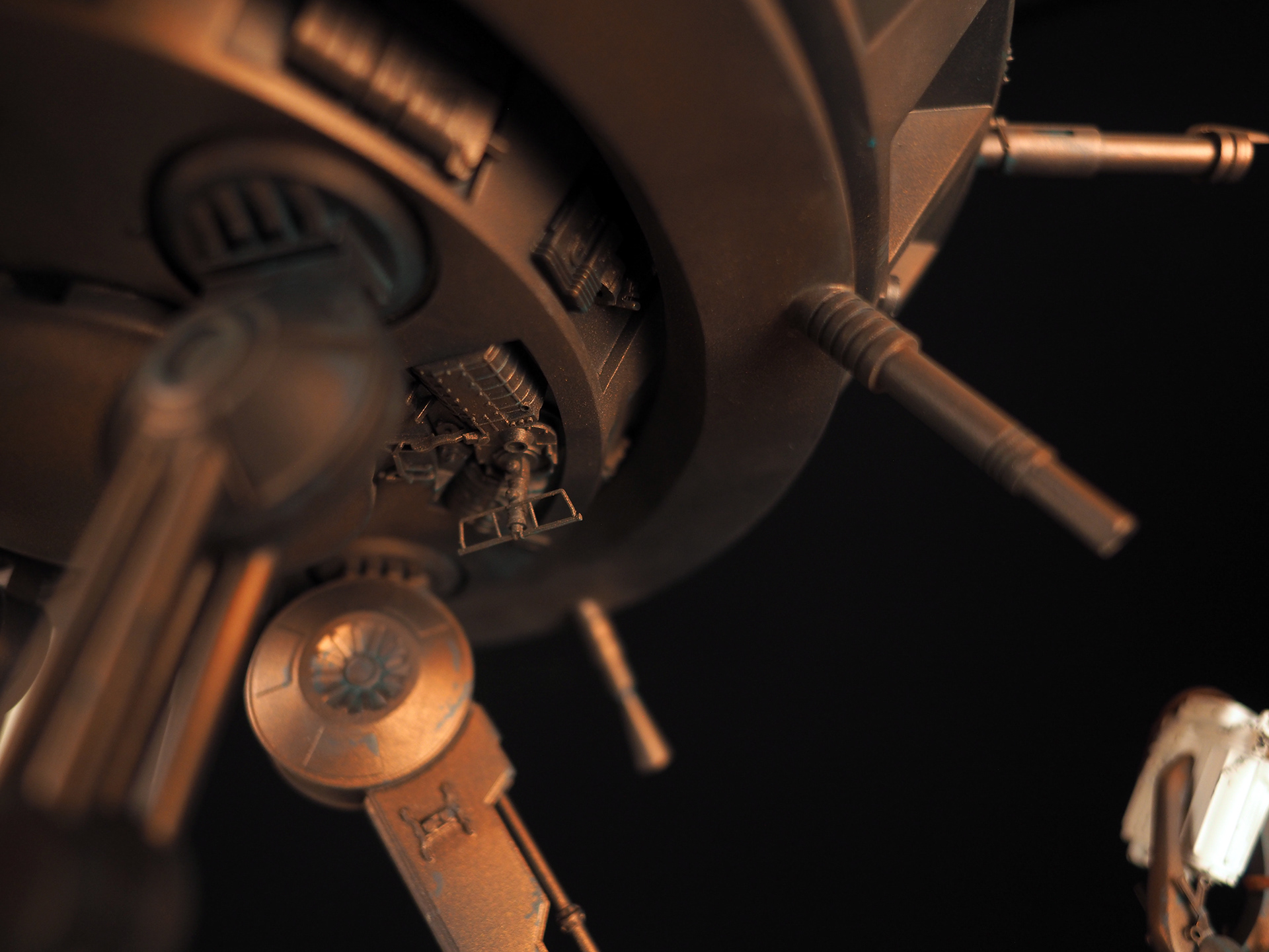 This is a 1/6th interpretation of the Concept Probe Droid, as mostly featured in the classic Ralph McQuarrie painting. I also pulled elements from Joe Johnston drawings, and decided that the copper color treatment would capture the warm tones in the painting. It also further differentiates this from the Probe Droid ILM built, which is a hard model to try to “top”. I like the insect-like elements of the smaller eye clusters (Johnston) as well as the eye stalk (McQuarrie) that seems to have inspired the droid in Jabba’s Palace’s main gate. I decided this is 1/6th scale which makes this version of a Probe Droid appreciably larger than the final model, and by having one of the arms holding a pair of Macrobinoculars, the larger sense of scale is conveyed.