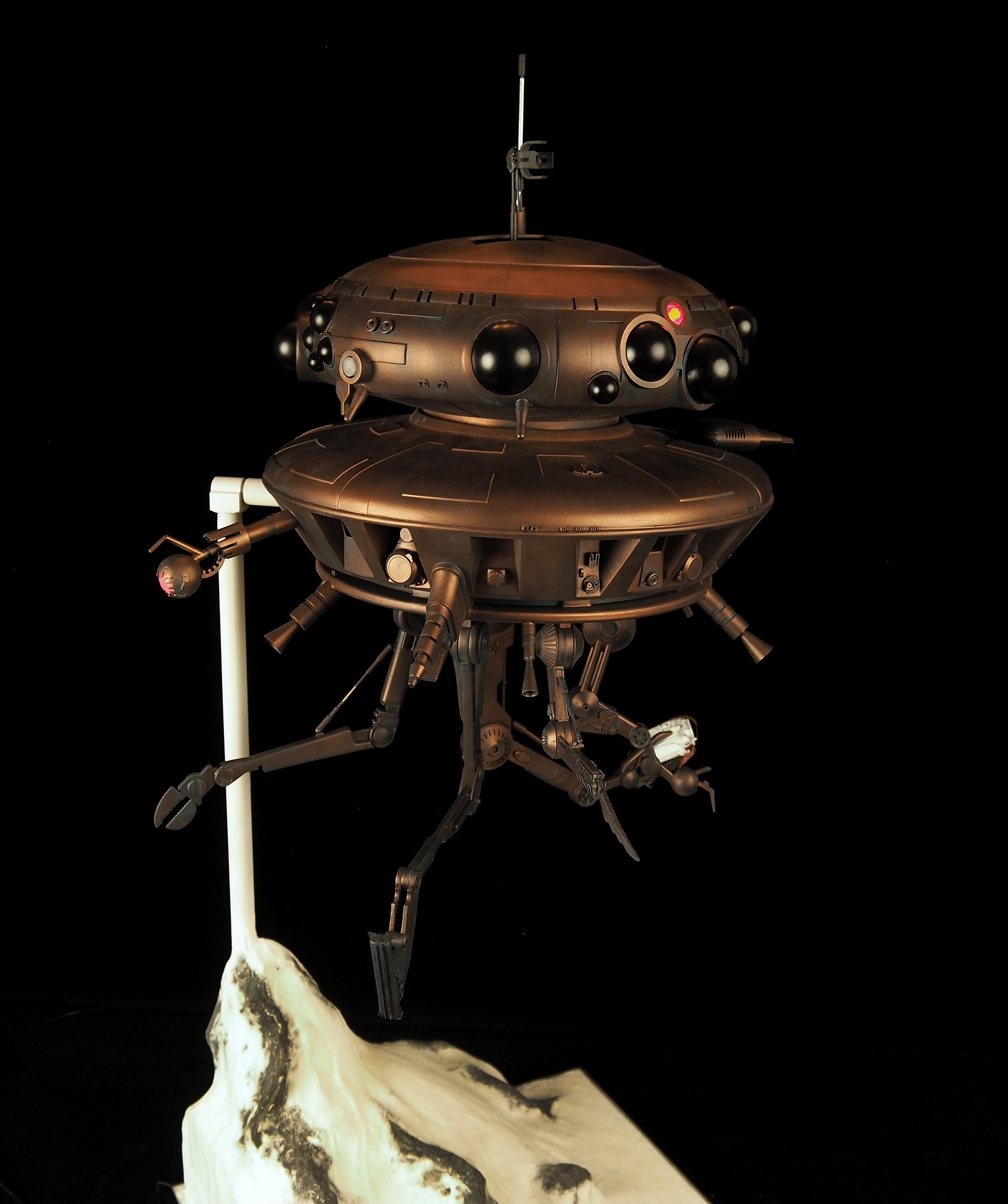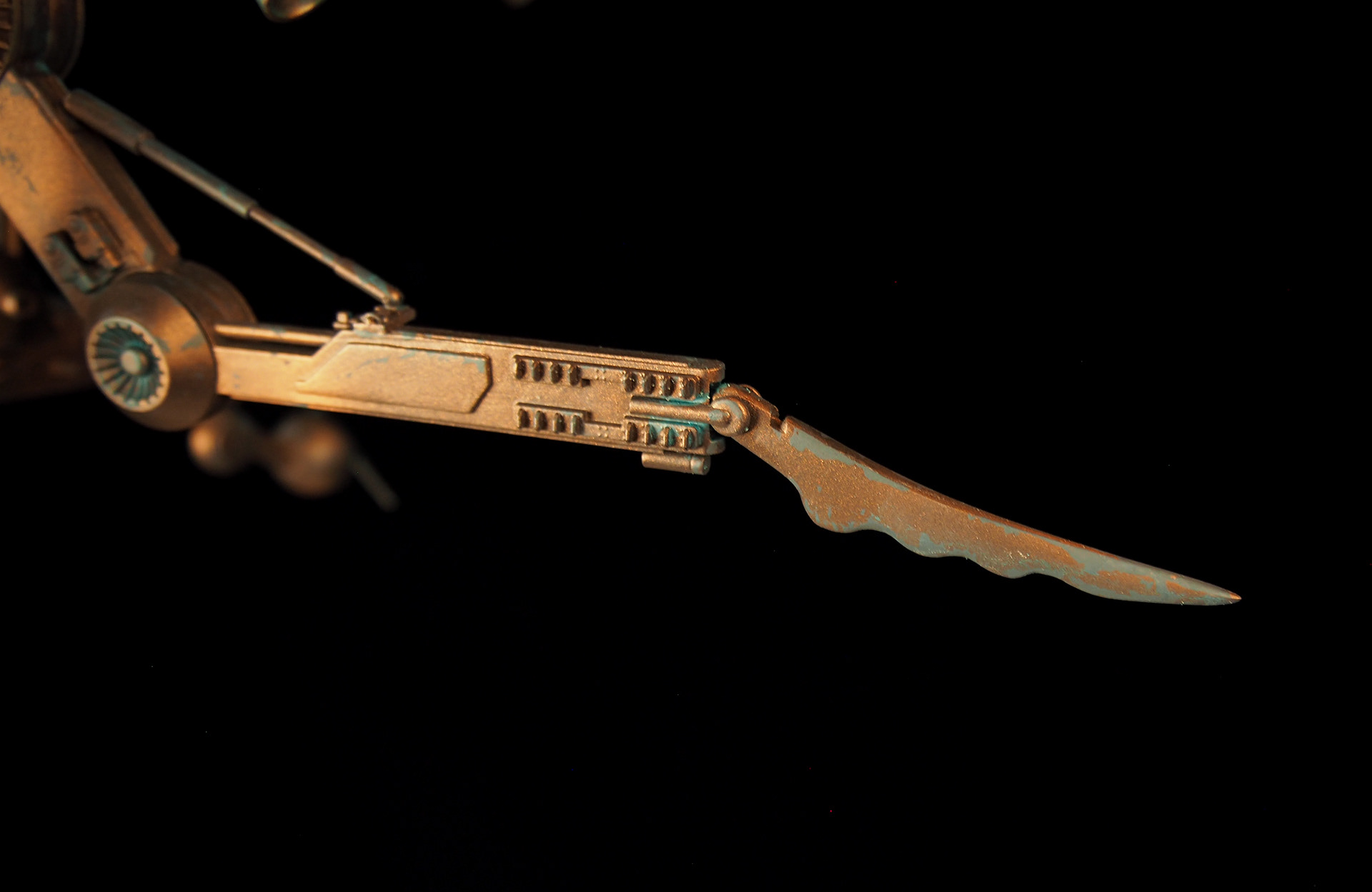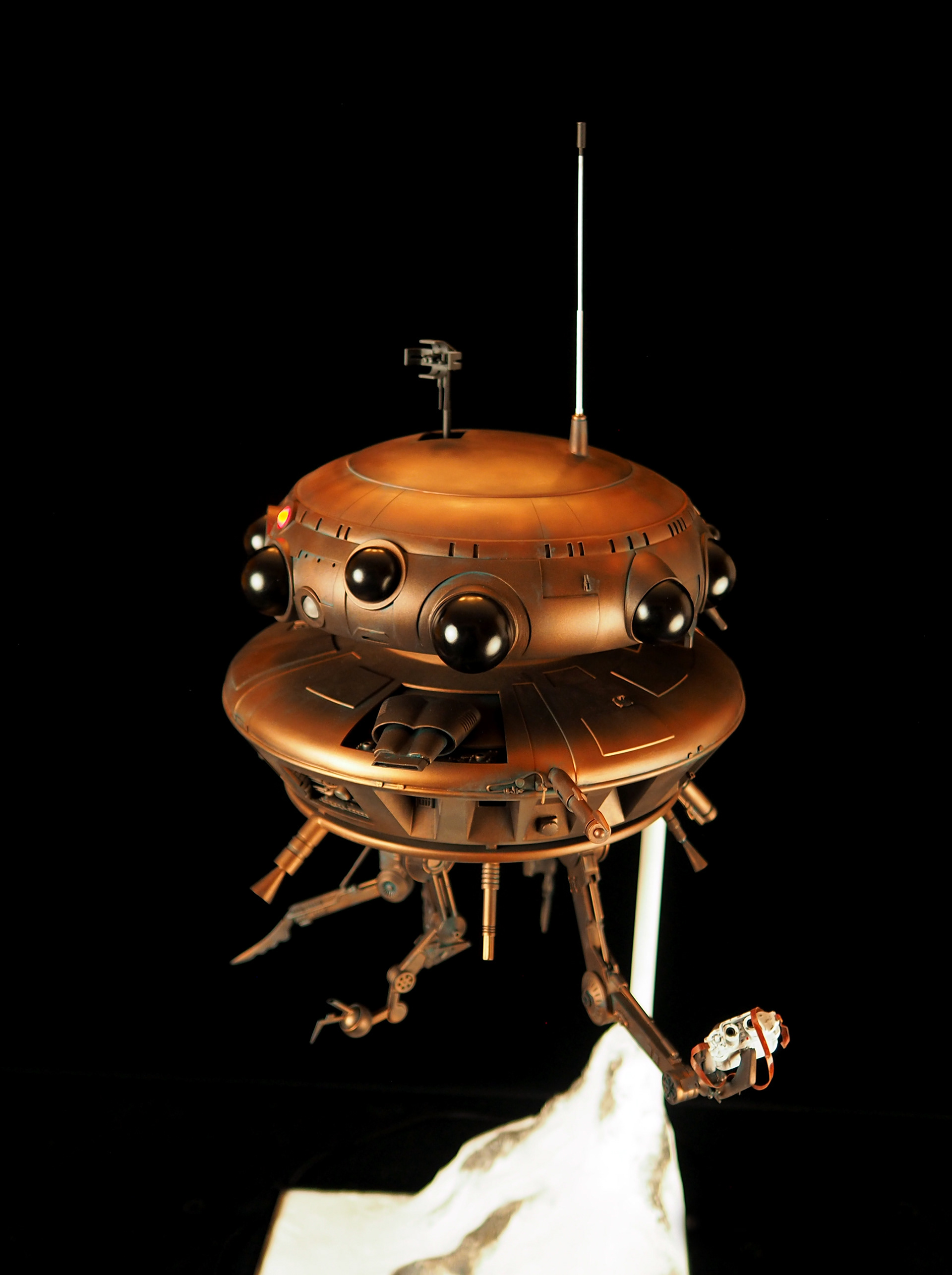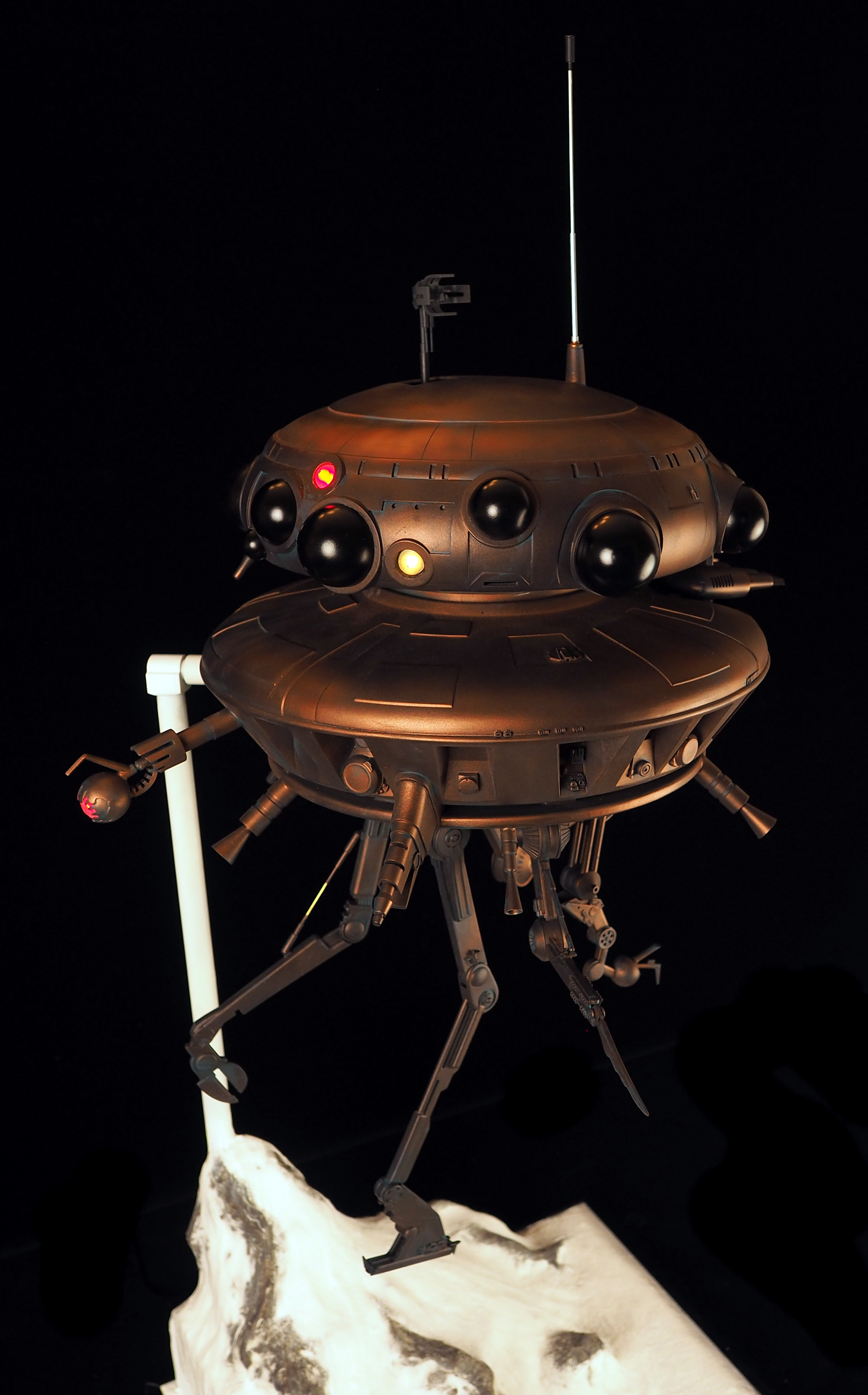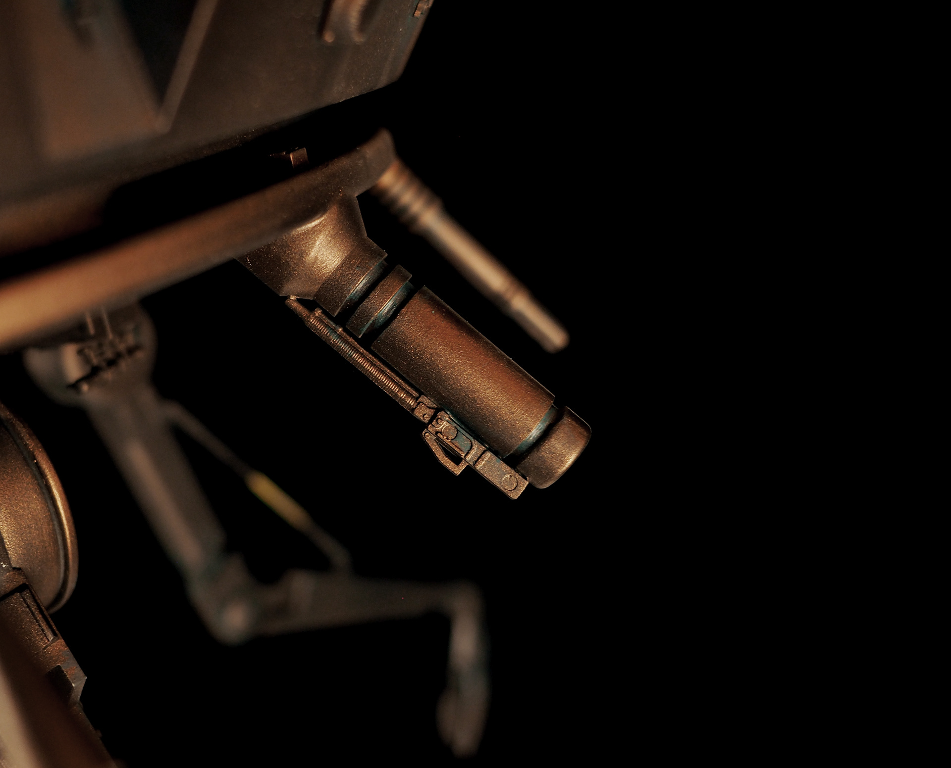 This is a 1/6th interpretation of the Concept Probe Droid, as mostly featured in the classic Ralph McQuarrie painting. I also pulled elements from Joe Johnston drawings, and decided that the copper color treatment would capture the warm tones in the painting. It also further differentiates this from the Probe Droid ILM built, which is a hard model to try to “top”. I like the insect-like elements of the smaller eye clusters (Johnston) as well as the eye stalk (McQuarrie) that seems to have inspired the droid in Jabba’s Palace’s main gate. I decided this is 1/6th scale which makes this version of a Probe Droid appreciably larger than the final model, and by having one of the arms holding a pair of Macrobinoculars, the larger sense of scale is conveyed.
