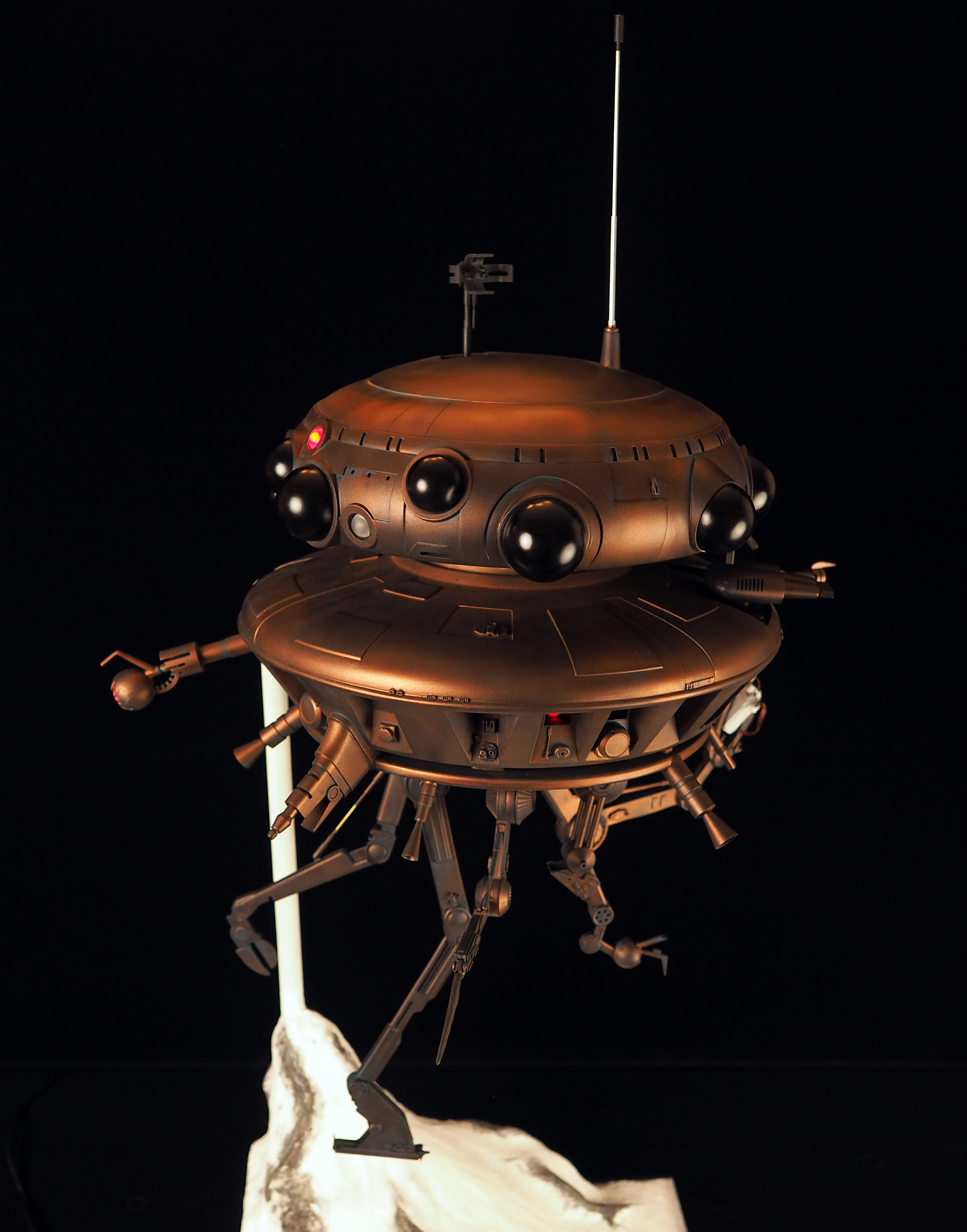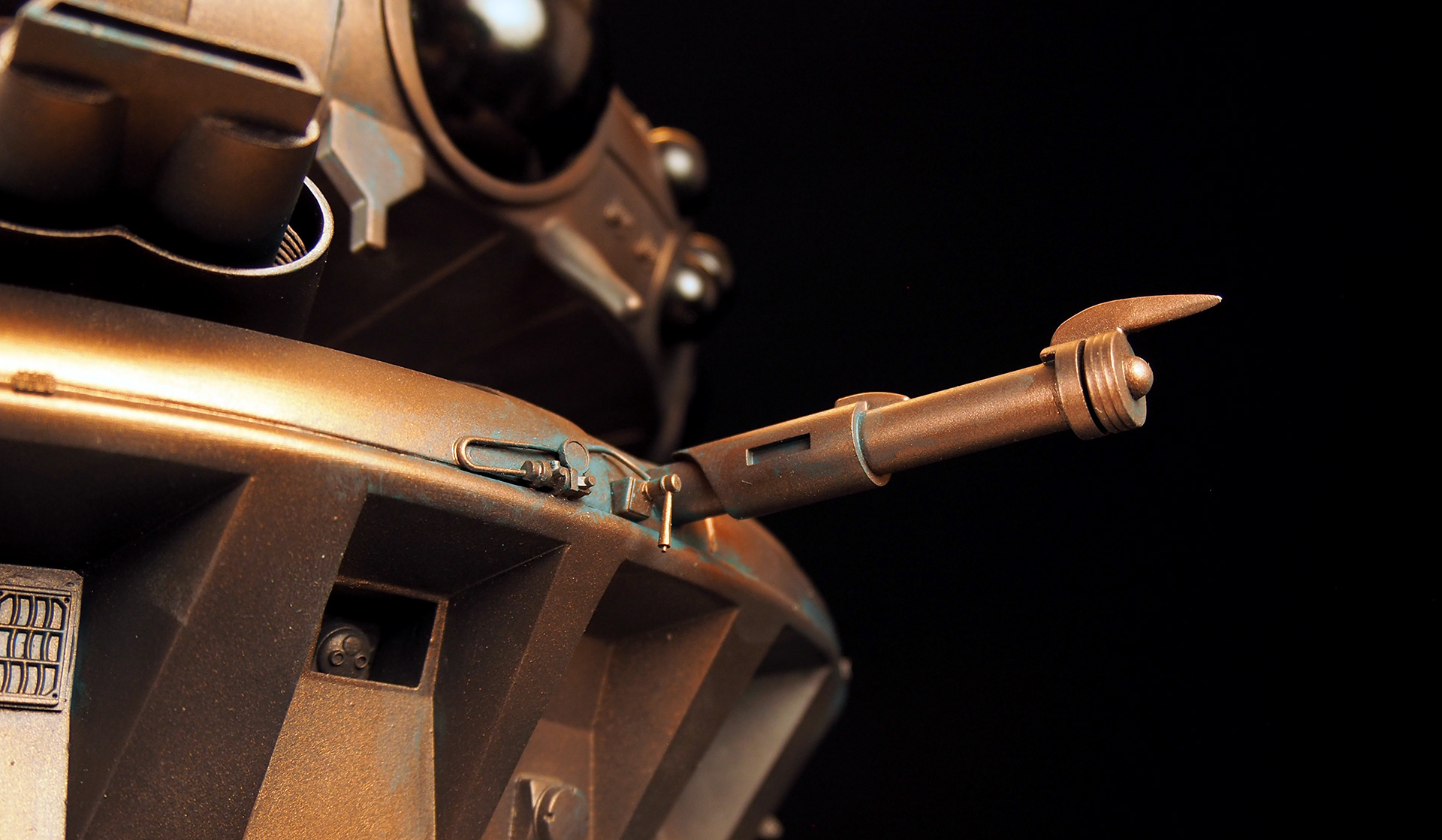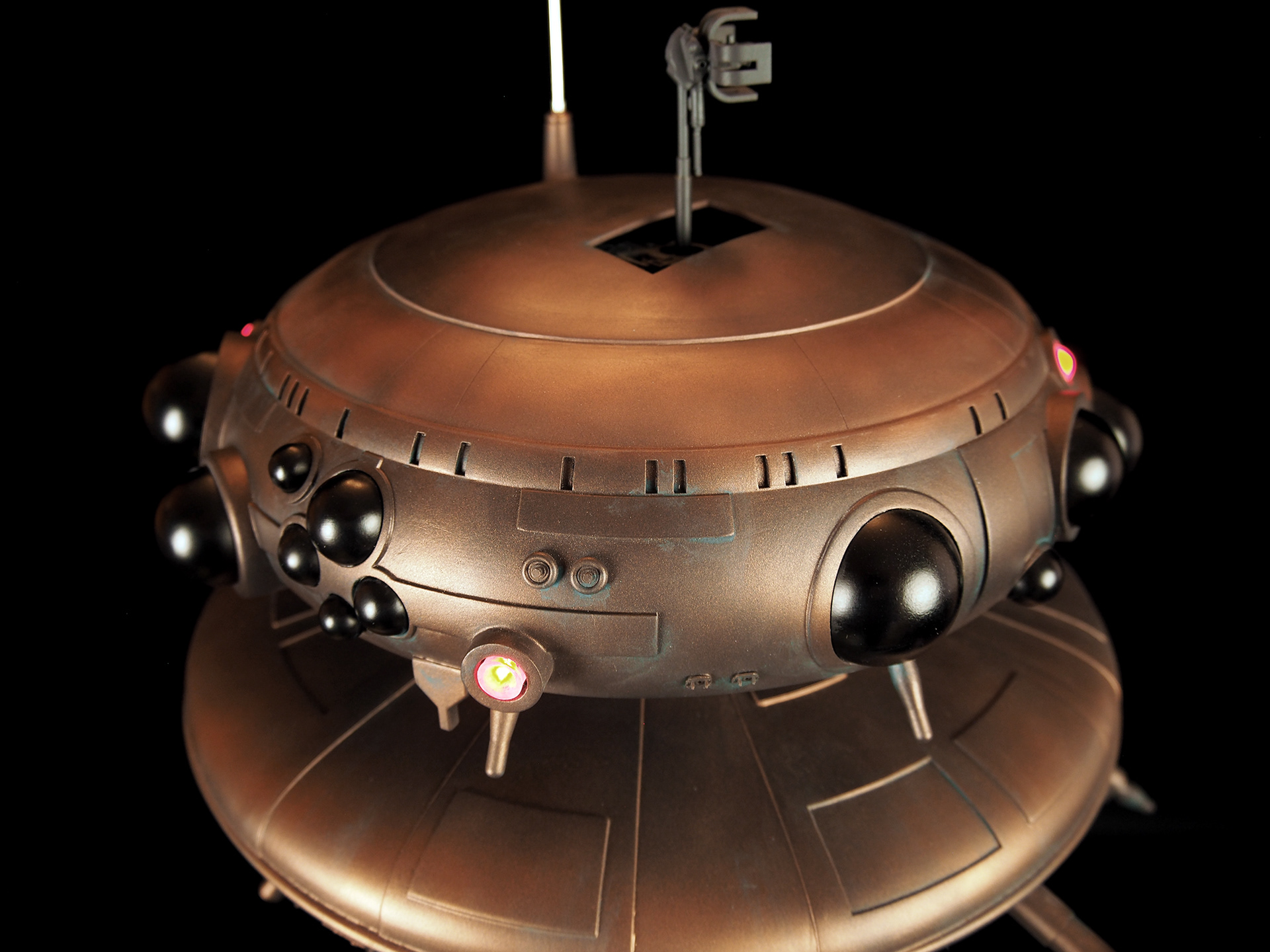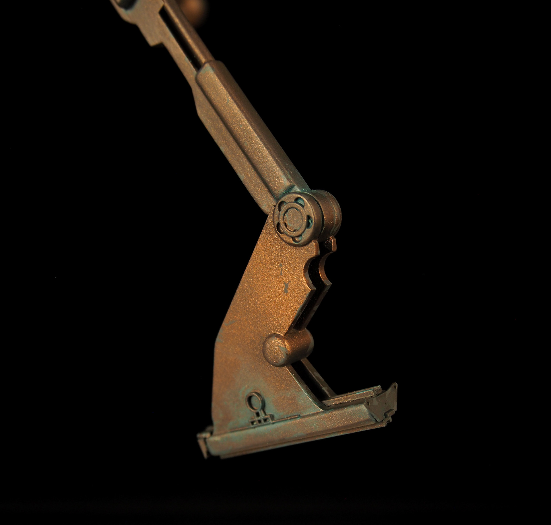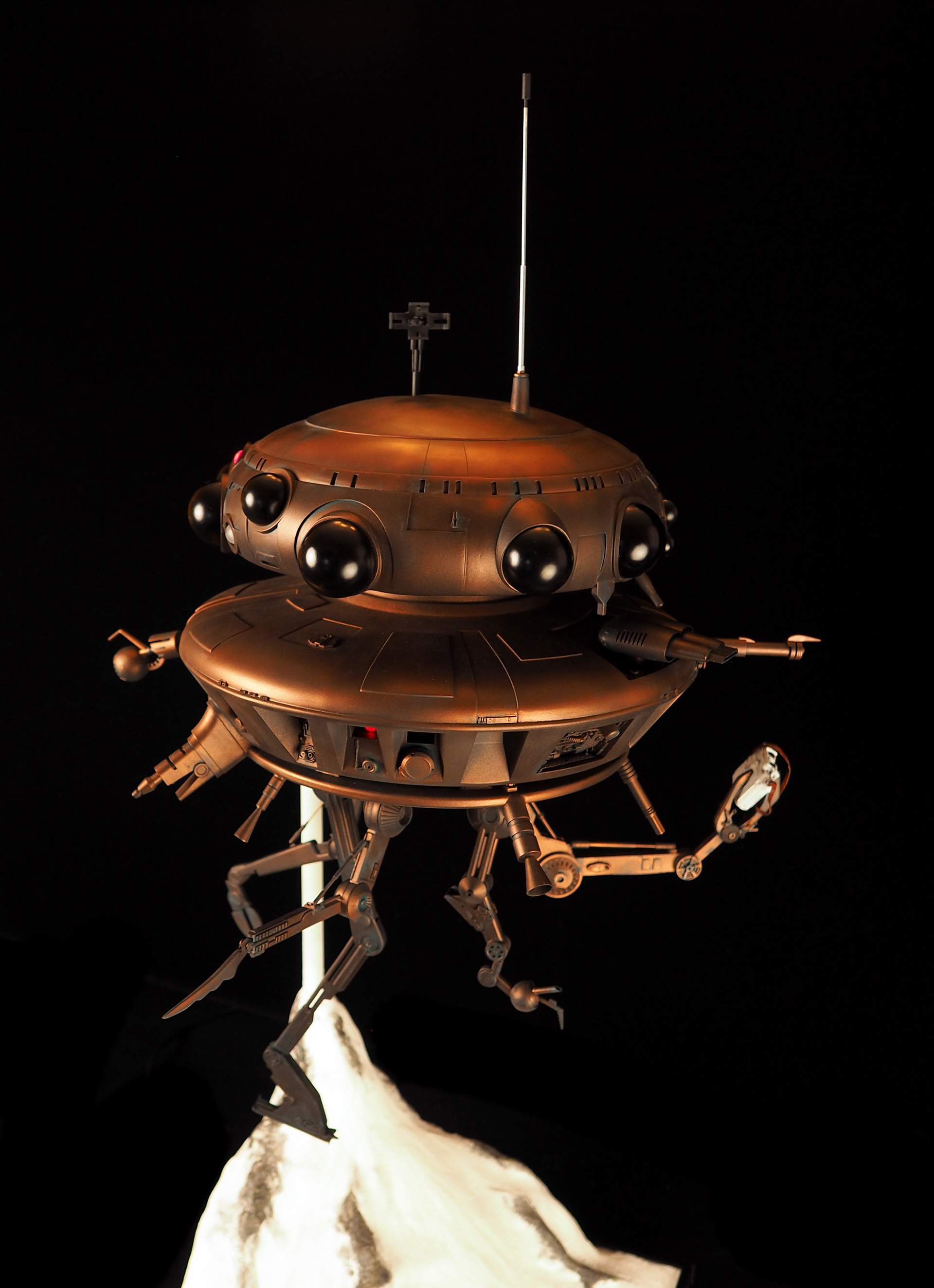 This is a 1/6th interpretation of the Concept Probe Droid, as mostly featured in the classic Ralph McQuarrie painting. I also pulled elements from Joe Johnston drawings, and decided that the copper color treatment would capture the warm tones in the painting. It also further differentiates this from the Probe Droid ILM built, which is a hard model to try to “top”. I like the insect-like elements of the smaller eye clusters (Johnston) as well as the eye stalk (McQuarrie) that seems to have inspired the droid in Jabba’s Palace’s main gate. I decided this is 1/6th scale which makes this version of a Probe Droid appreciably larger than the final model, and by having one of the arms holding a pair of Macrobinoculars, the larger sense of scale is conveyed.