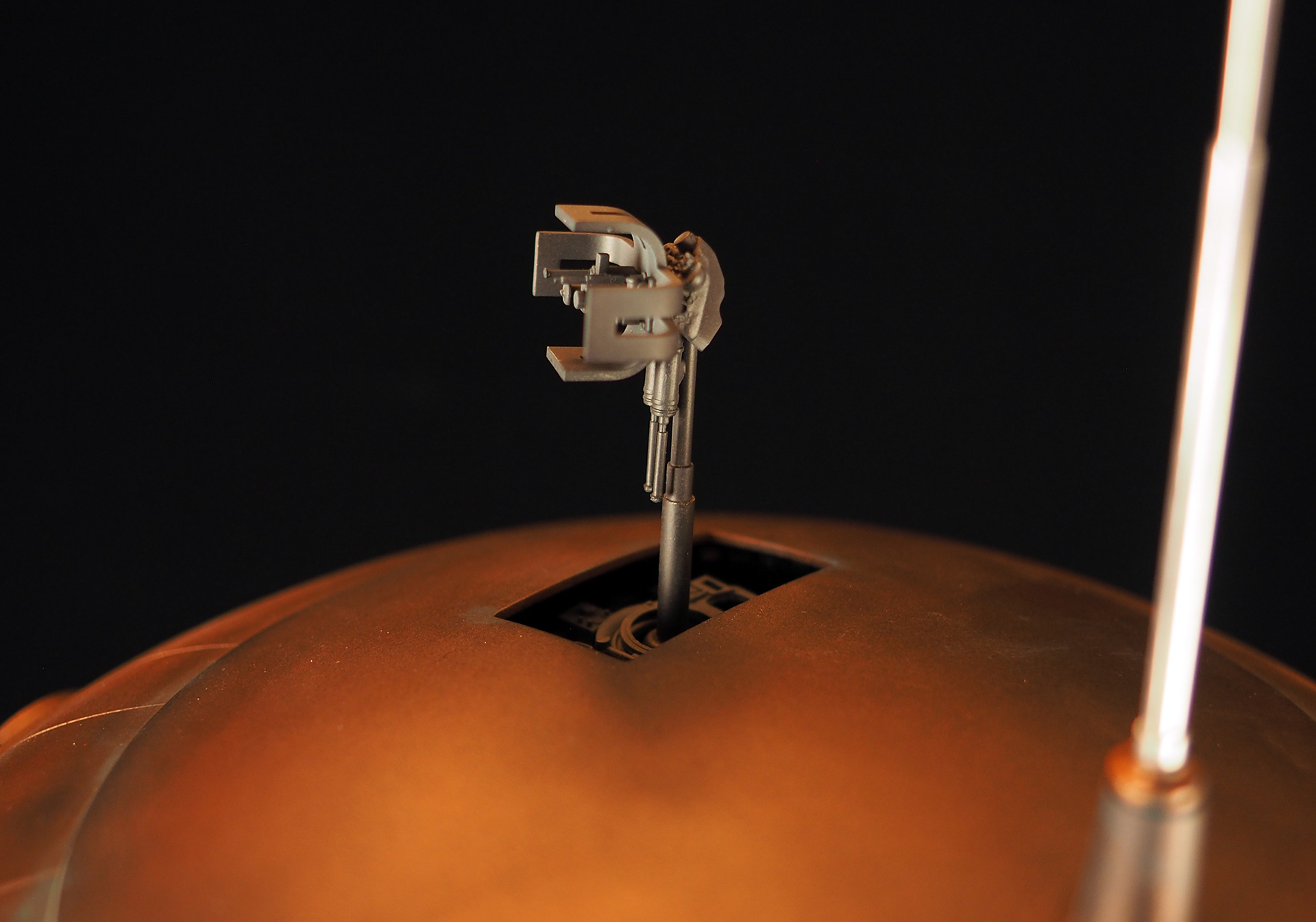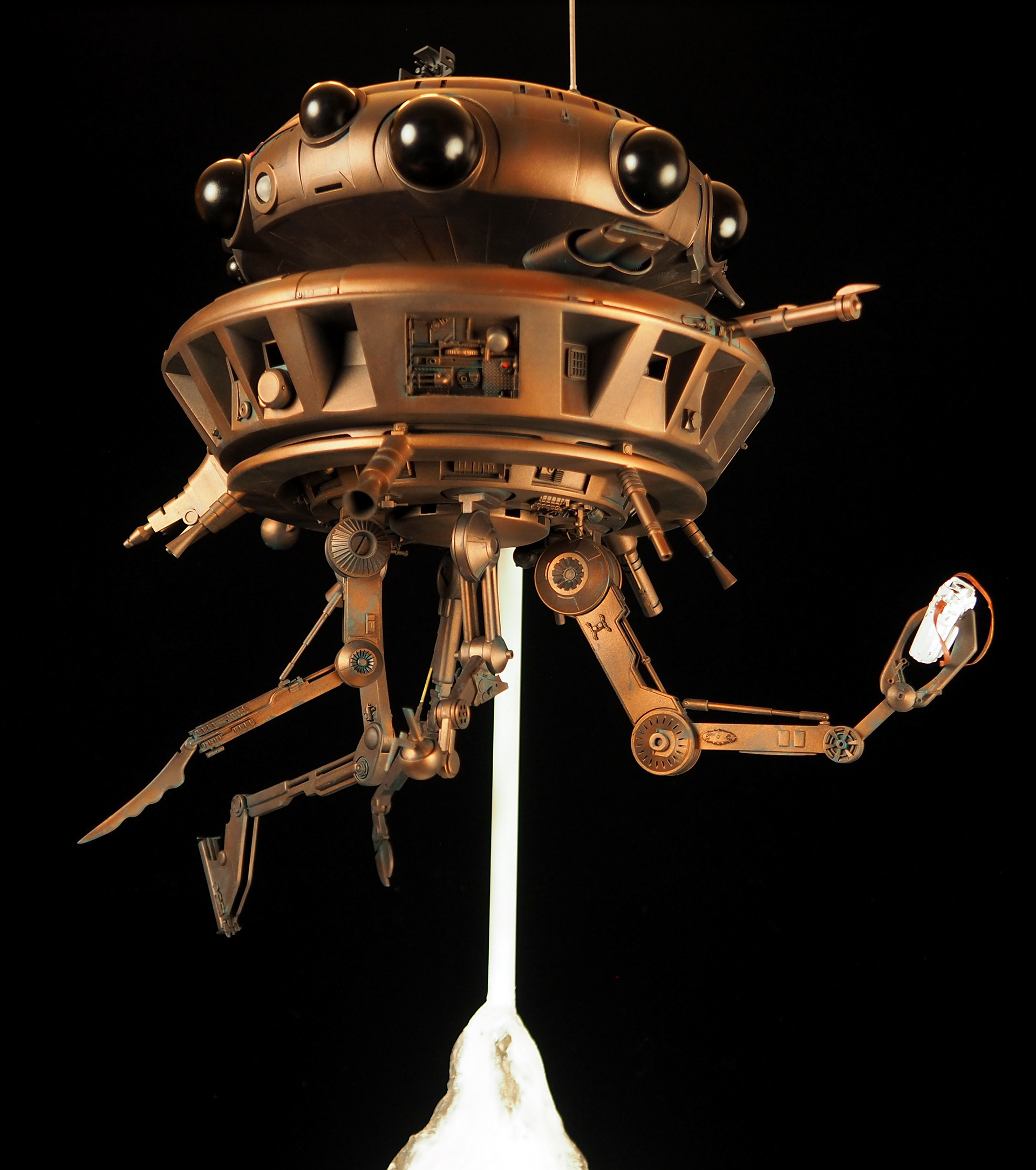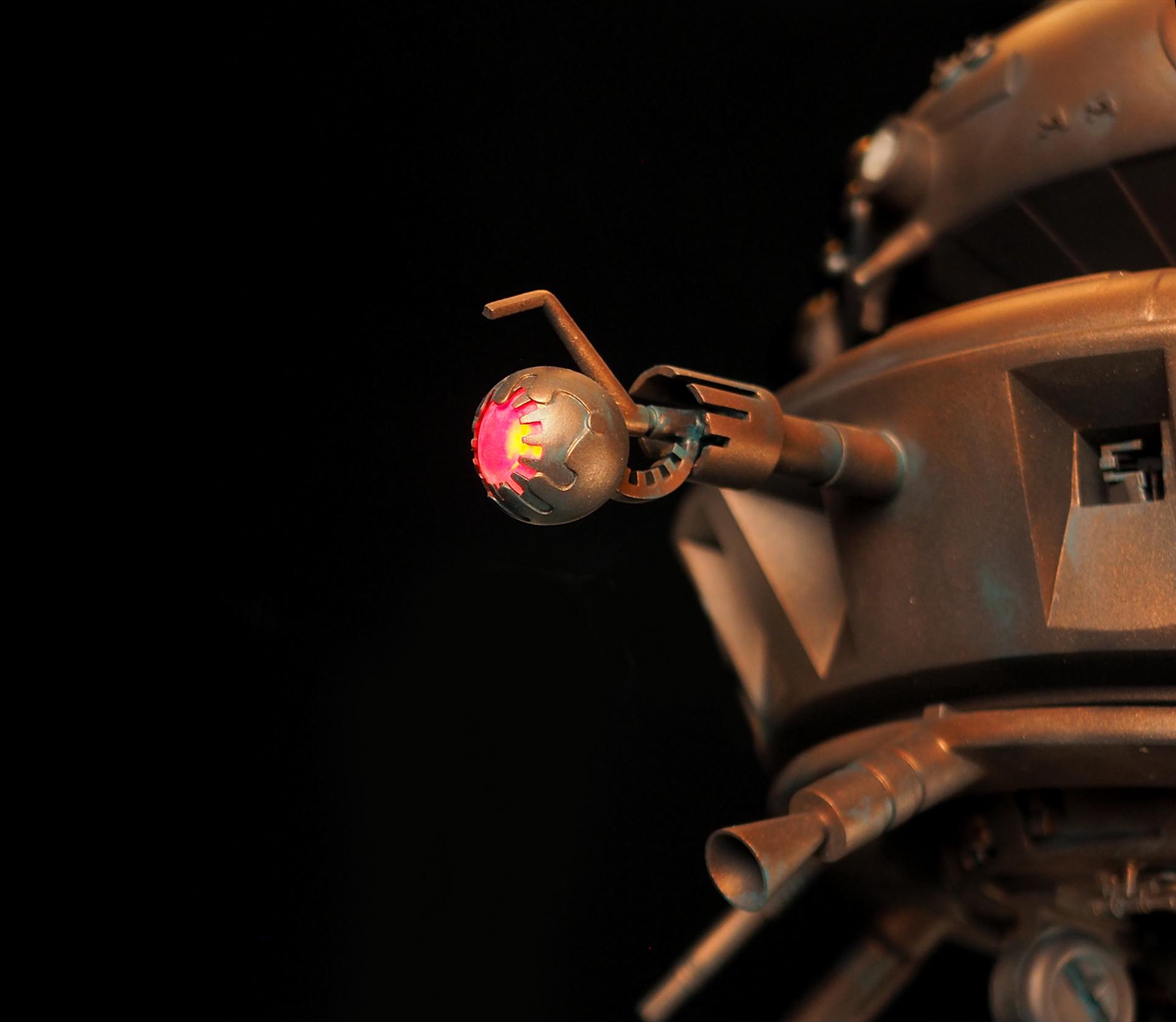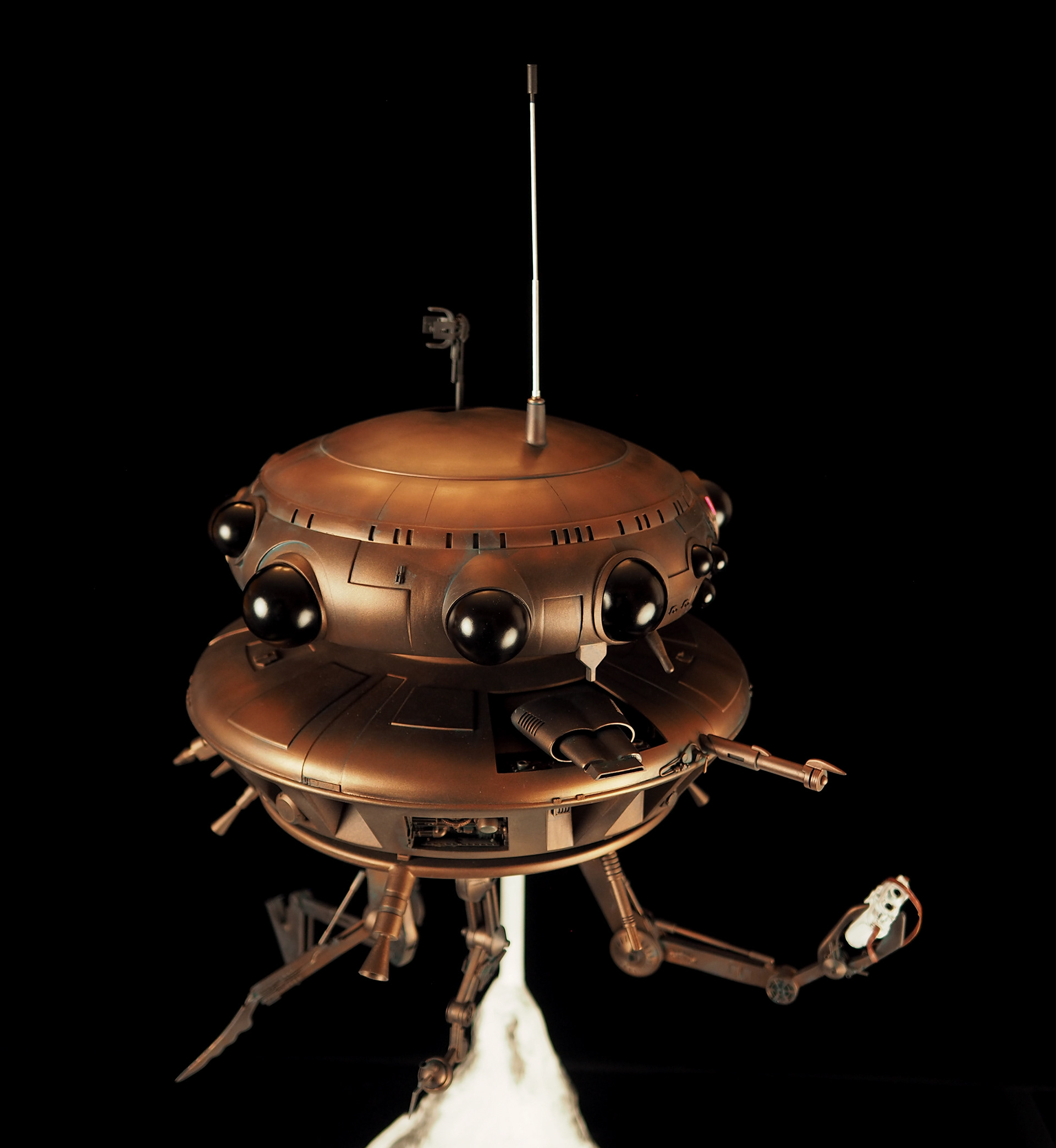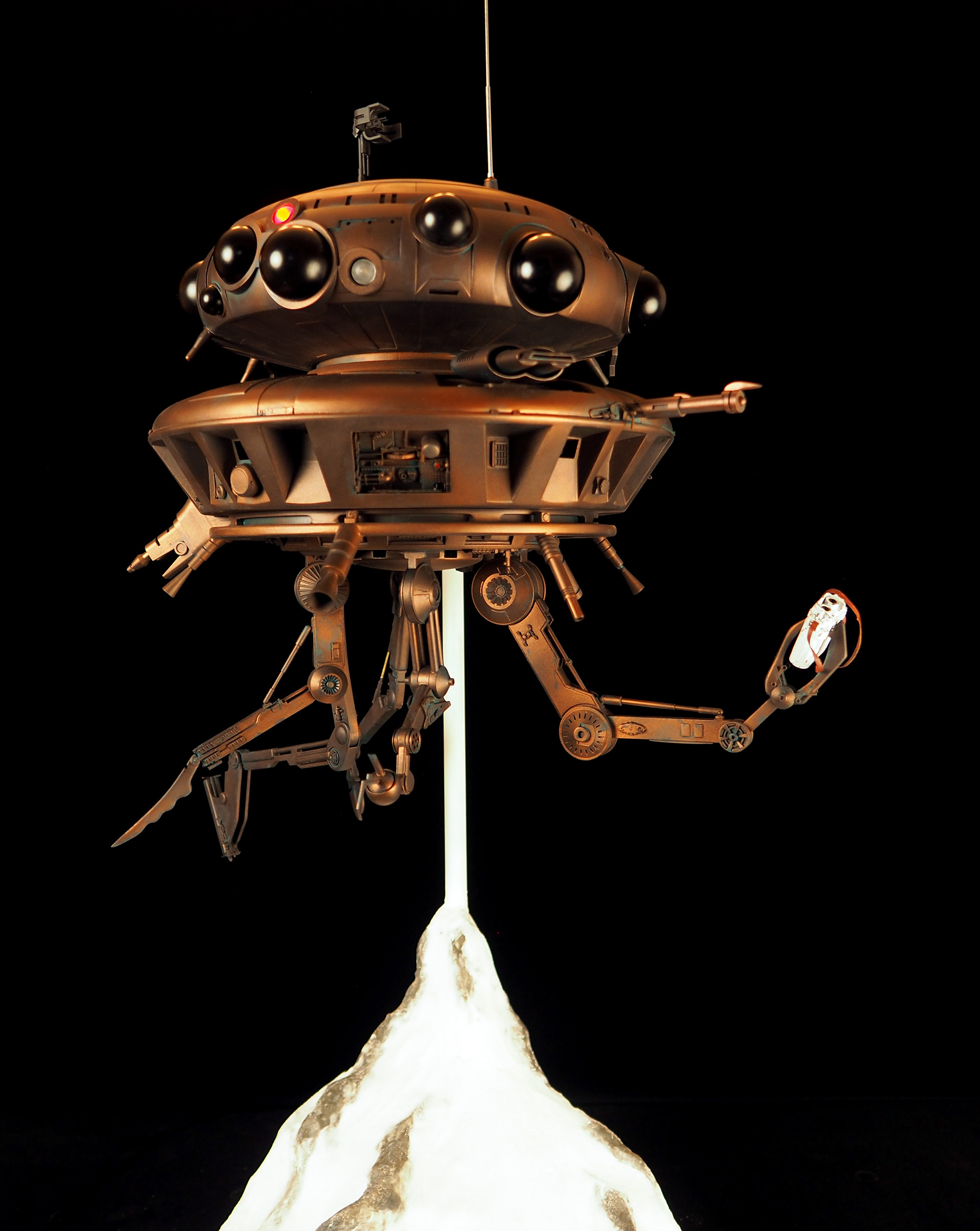 This is a 1/6th interpretation of the Concept Probe Droid, as mostly featured in the classic Ralph McQuarrie painting. I also pulled elements from Joe Johnston drawings, and decided that the copper color treatment would capture the warm tones in the painting. It also further differentiates this from the Probe Droid ILM built, which is a hard model to try to “top”. I like the insect-like elements of the smaller eye clusters (Johnston) as well as the eye stalk (McQuarrie) that seems to have inspired the droid in Jabba’s Palace’s main gate. I decided this is 1/6th scale which makes this version of a Probe Droid appreciably larger than the final model, and by having one of the arms holding a pair of Macrobinoculars, the larger sense of scale is conveyed.