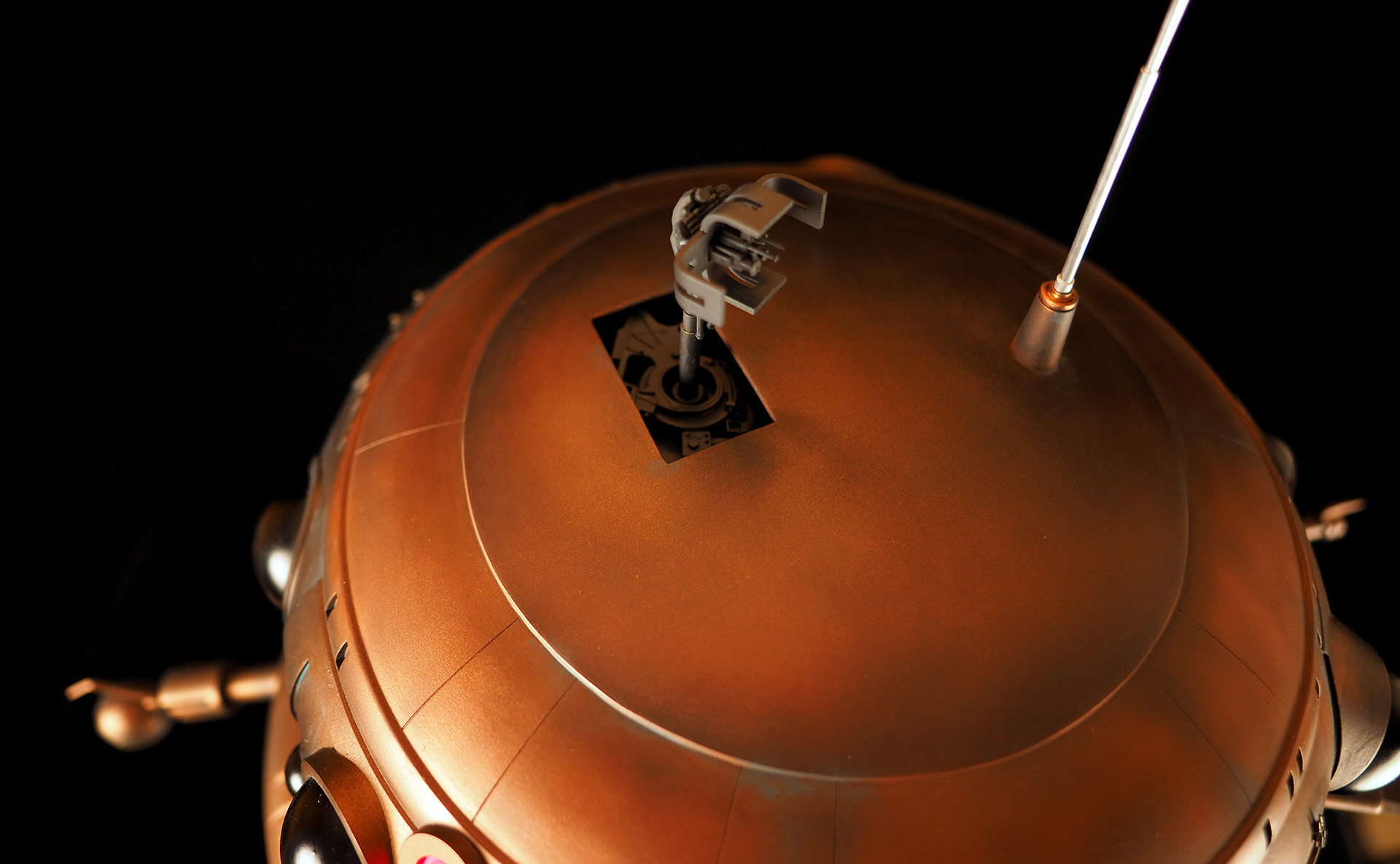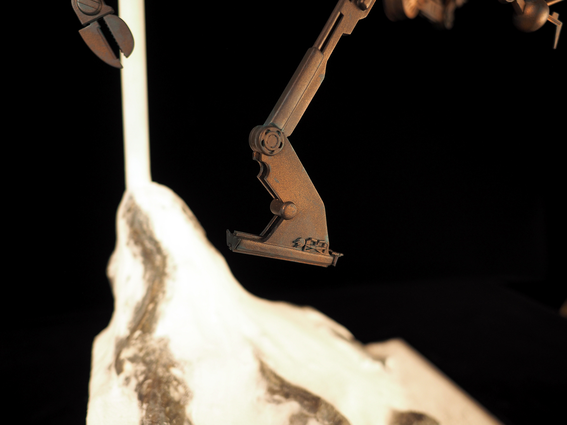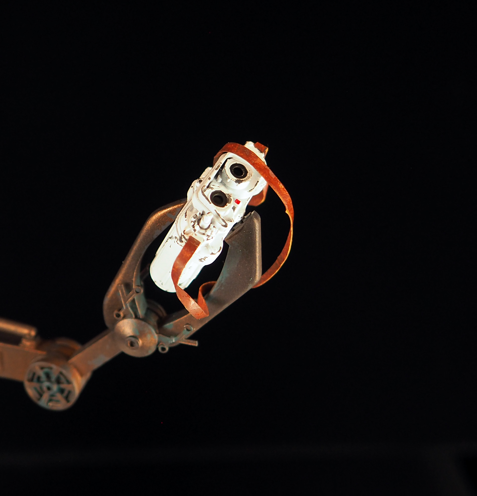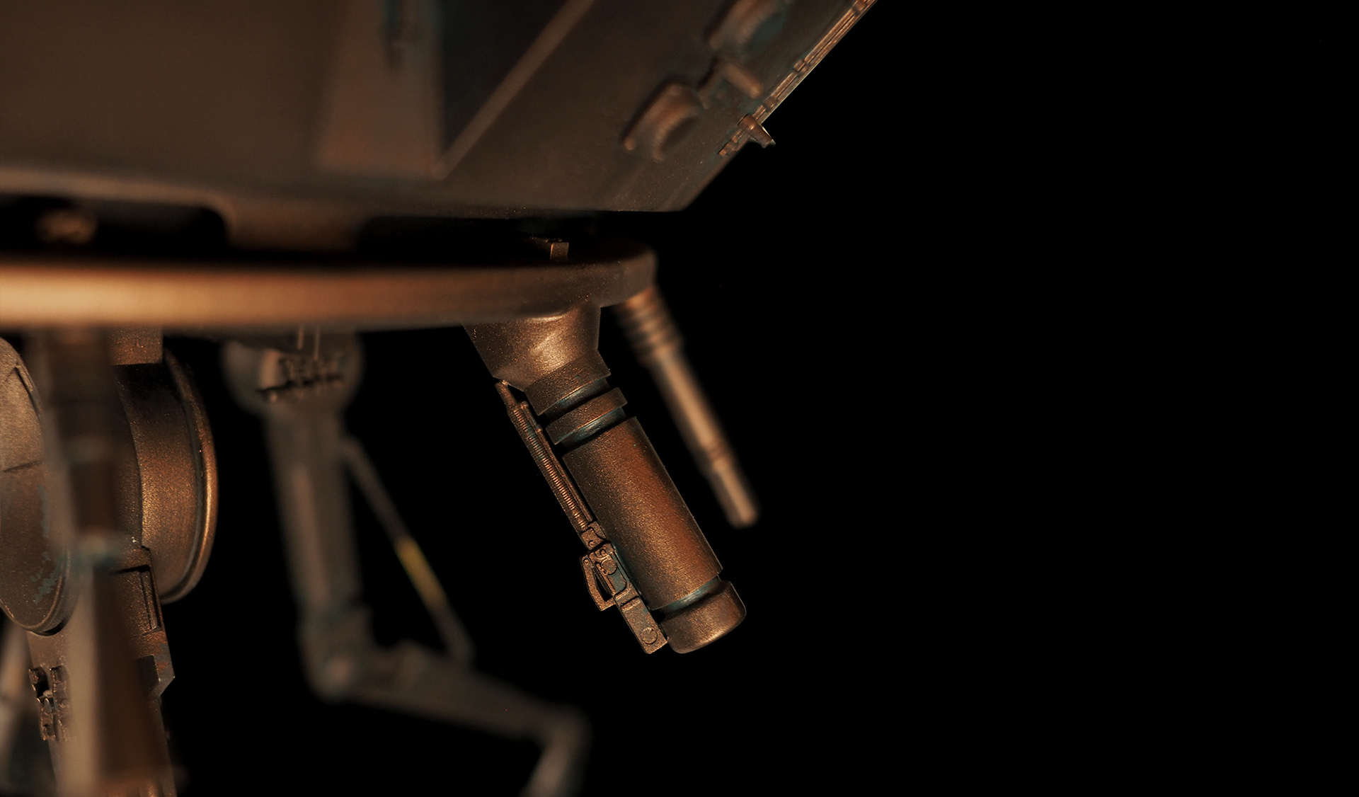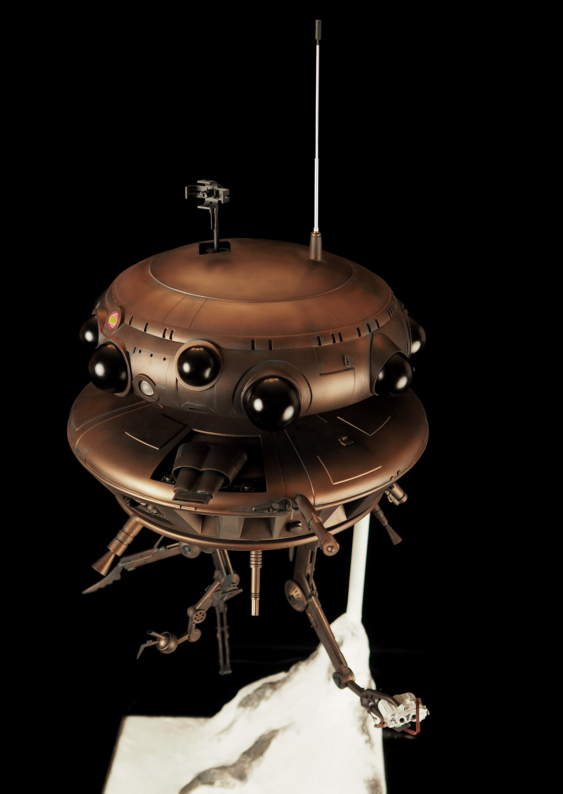This is a 1/6th interpretation of the Concept Probe Droid, as mostly featured in the classic Ralph McQuarrie painting. I also pulled elements from Joe Johnston drawings, and decided that the copper color treatment would capture the warm tones in the painting. It also further differentiates this from the Probe Droid ILM built, which is a hard model to try to “top”. I like the insect-like elements of the smaller eye clusters (Johnston) as well as the eye stalk (McQuarrie) that seems to have inspired the droid in Jabba’s Palace’s main gate. I decided this is 1/6th scale which makes this version of a Probe Droid appreciably larger than the final model, and by having one of the arms holding a pair of Macrobinoculars, the larger sense of scale is conveyed.