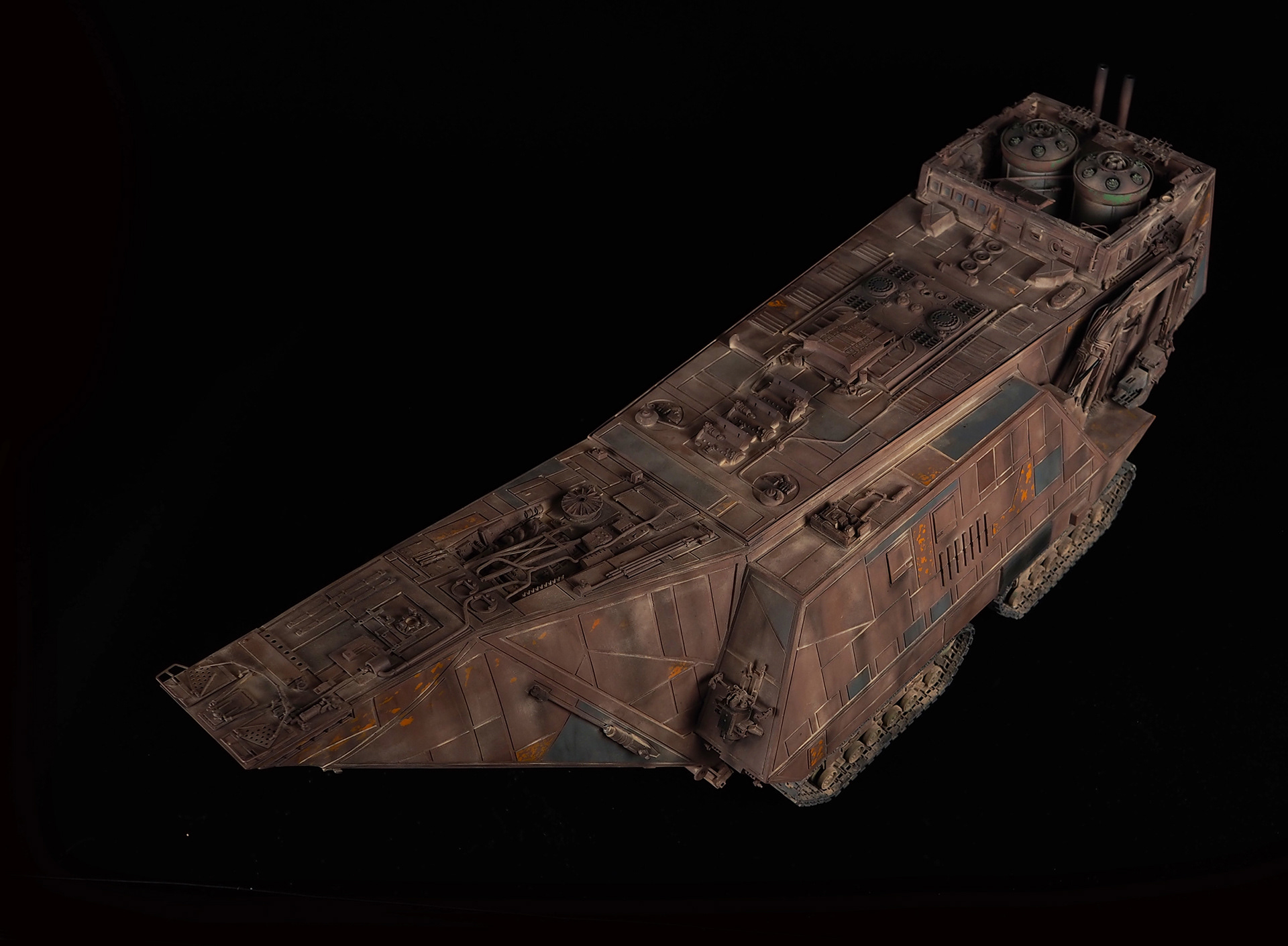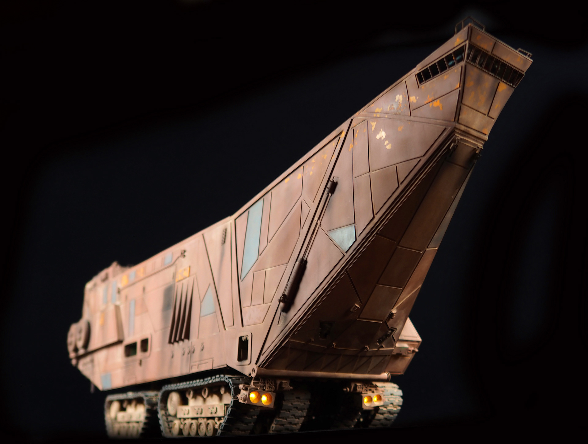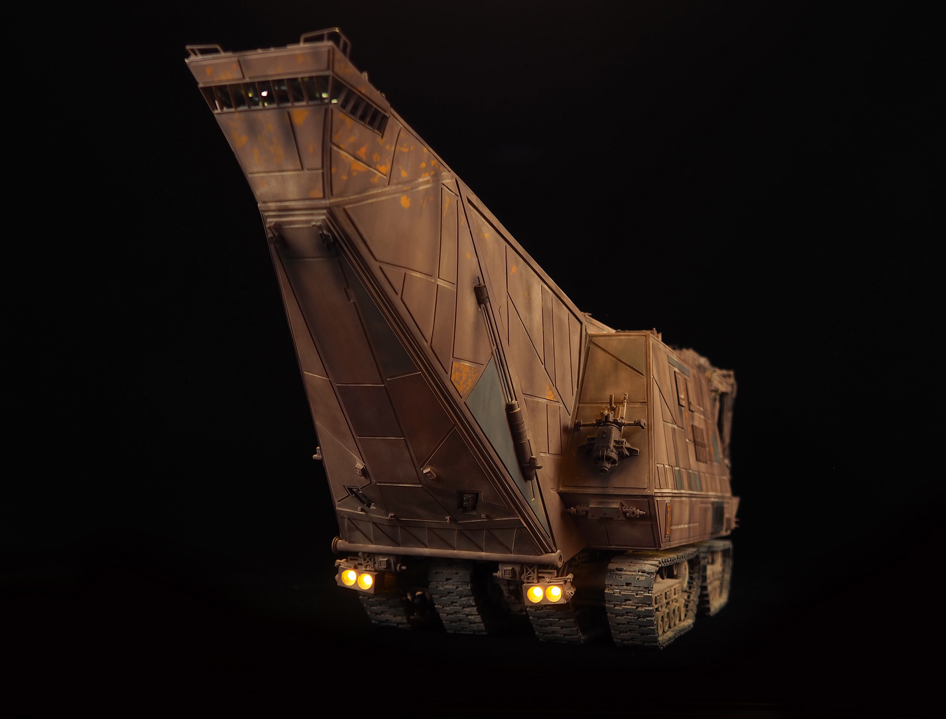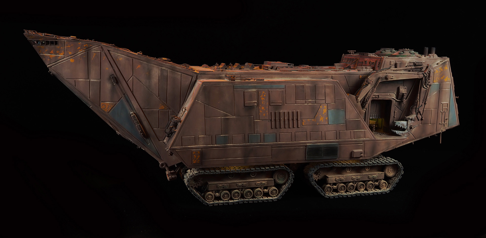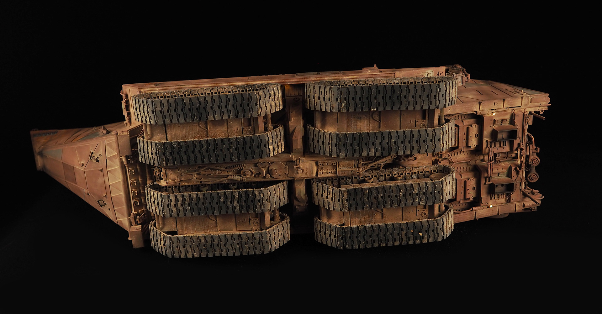 This is my interpretation of the Sandcrawler from Star Wars, as seen in the preproduction painting by Ralph McQuarrie. Much like the sketchbooks featuring the work of Joe Johnston and others, the McQuarrie paintings were and continue to be a massive source of inspiration for me. This model was my first real foray into building an under structure in Rhino and then printing in ABS on an FDM printer. From there I clad the model in styrene and detailed it using traditional techniques. Comically, it’s in scale with the Galoob Jawas, so I threw some in here and there. It took the better part of a year and a half to build the model, and I feel that I grew my digital skill sets tremendously.