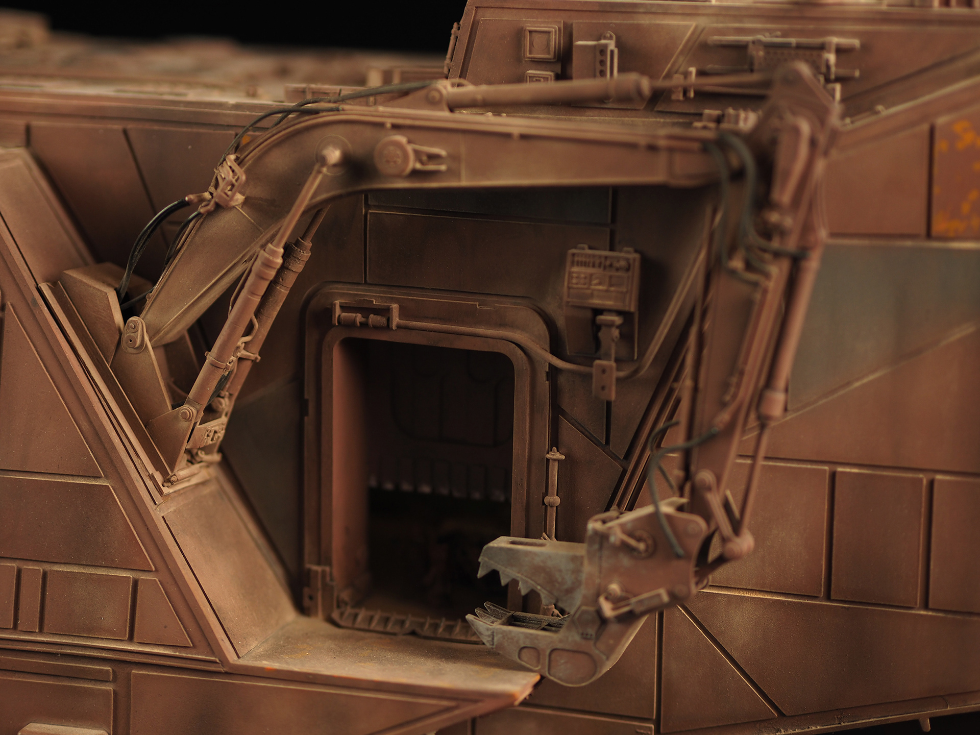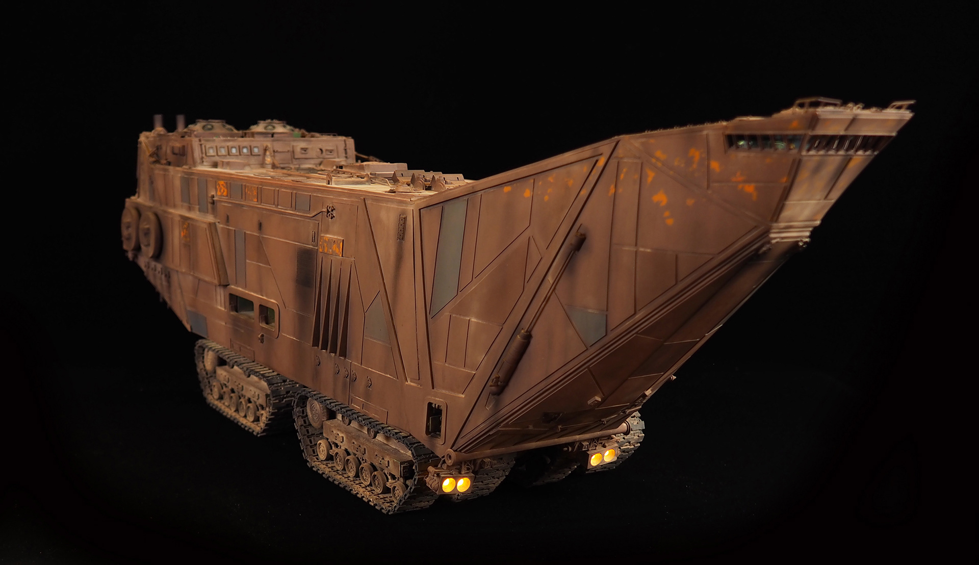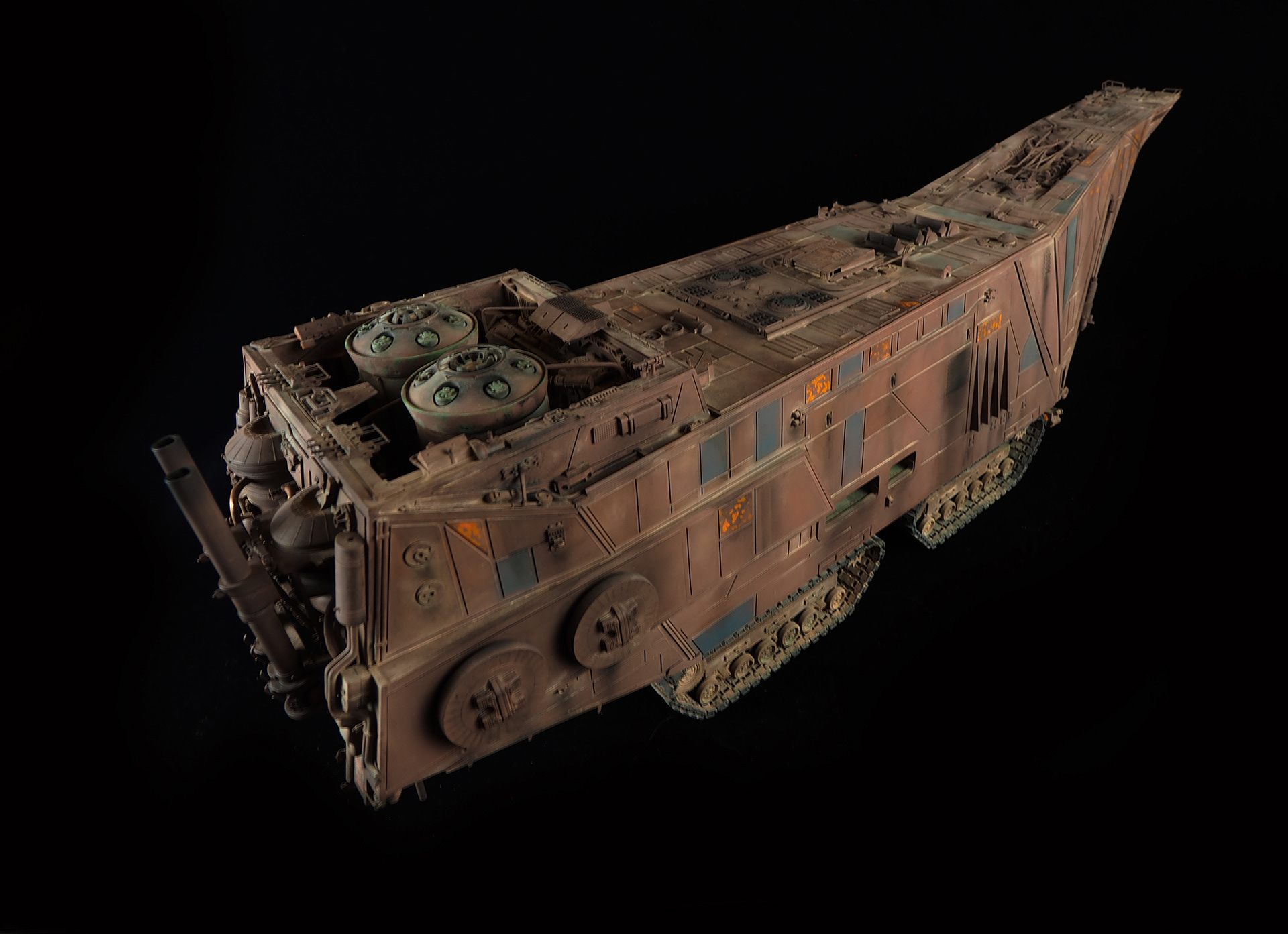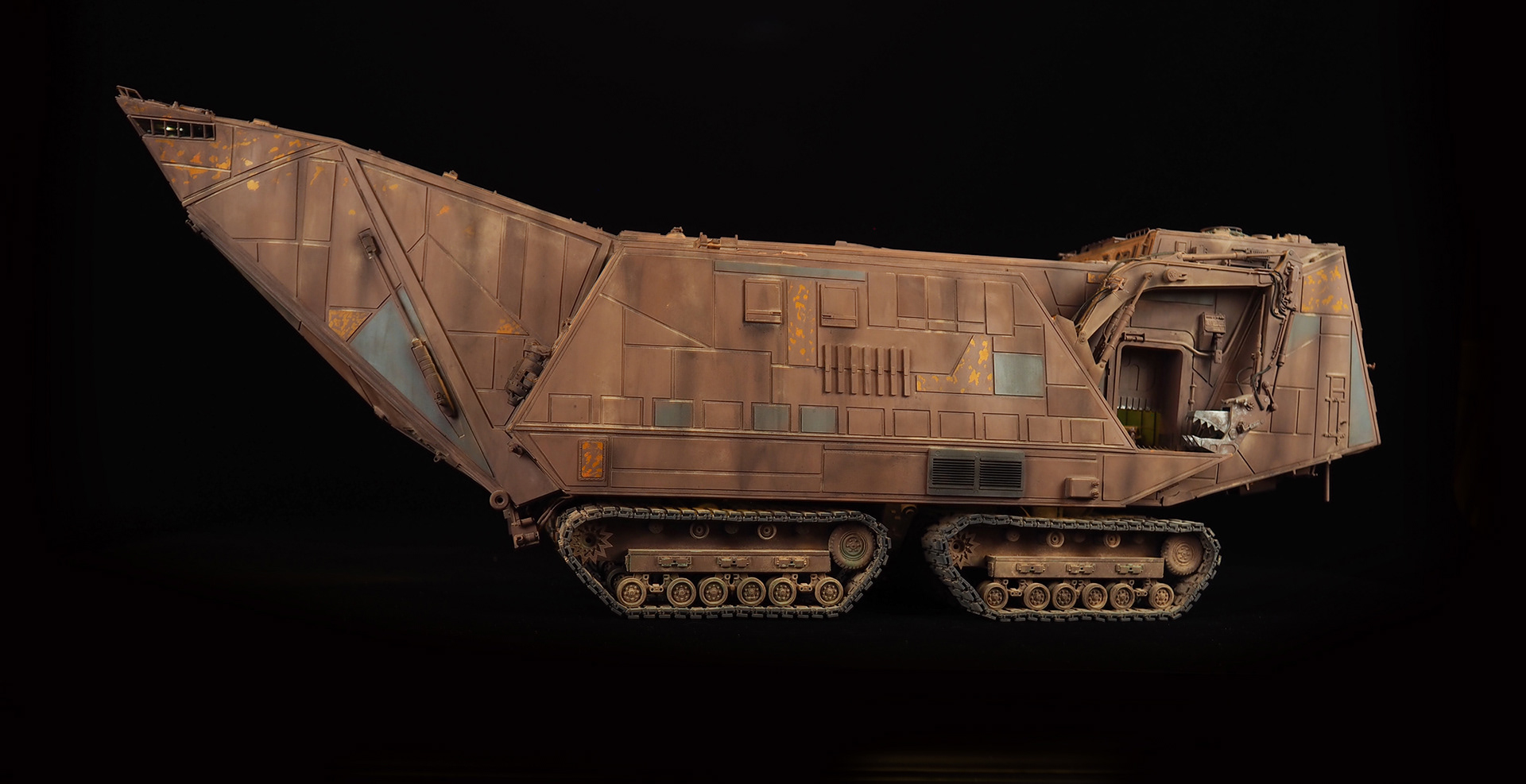 This is my interpretation of the Sandcrawler from Star Wars, as seen in the preproduction painting by Ralph McQuarrie. Much like the sketchbooks featuring the work of Joe Johnston and others, the McQuarrie paintings were and continue to be a massive source of inspiration for me. This model was my first real foray into building an under structure in Rhino and then printing in ABS on an FDM printer. From there I clad the model in styrene and detailed it using traditional techniques. Comically, it’s in scale with the Galoob Jawas, so I threw some in here and there. It took the better part of a year and a half to build the model, and I feel that I grew my digital skill sets tremendously.