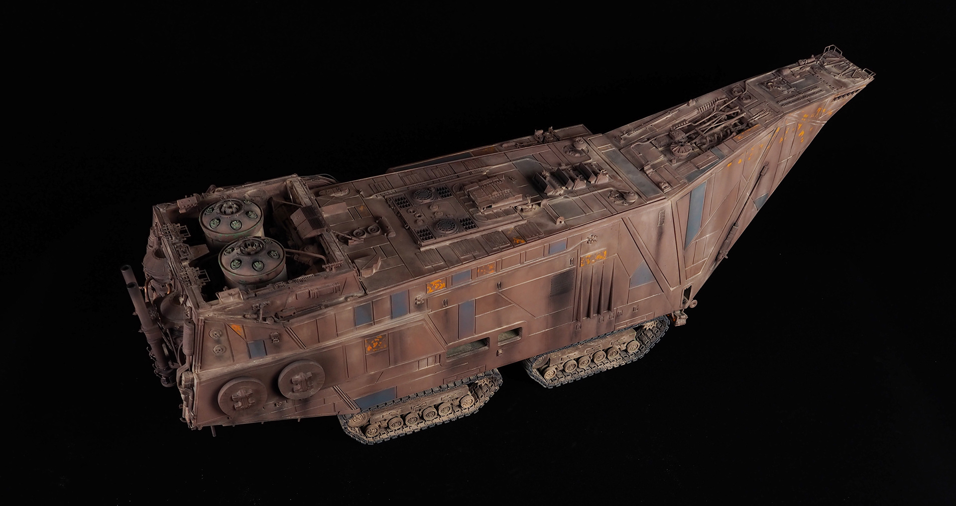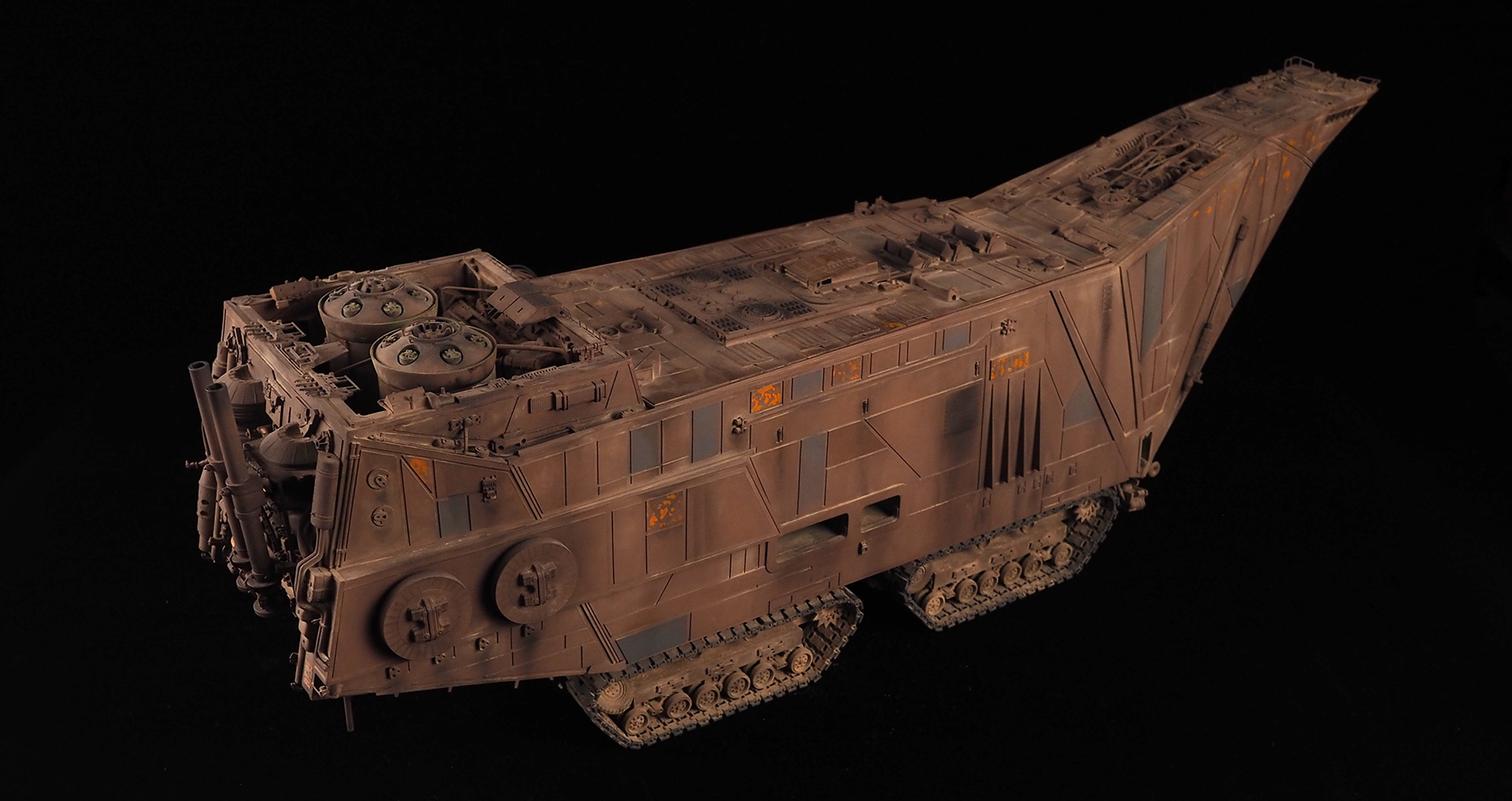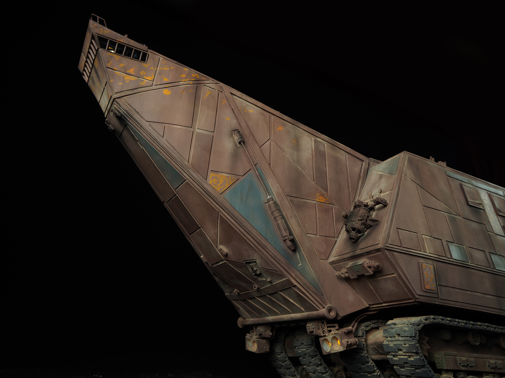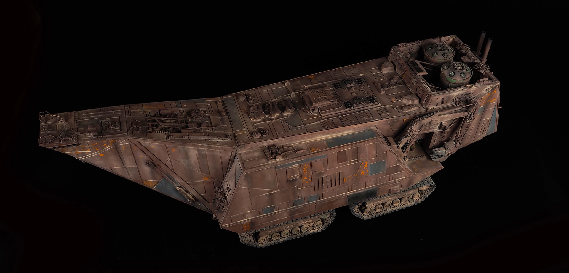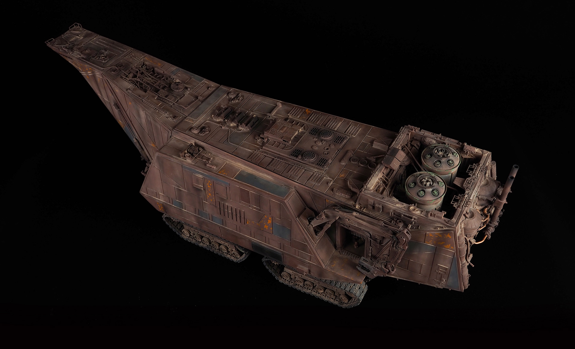 This is my interpretation of the Sandcrawler from Star Wars, as seen in the preproduction painting by Ralph McQuarrie. Much like the sketchbooks featuring the work of Joe Johnston and others, the McQuarrie paintings were and continue to be a massive source of inspiration for me. This model was my first real foray into building an under structure in Rhino and then printing in ABS on an FDM printer. From there I clad the model in styrene and detailed it using traditional techniques. Comically, it’s in scale with the Galoob Jawas, so I threw some in here and there. It took the better part of a year and a half to build the model, and I feel that I grew my digital skill sets tremendously.