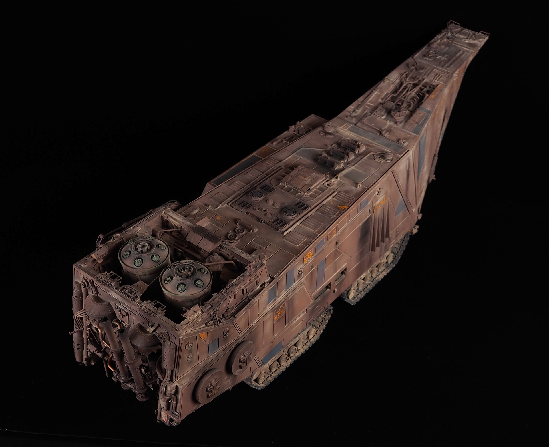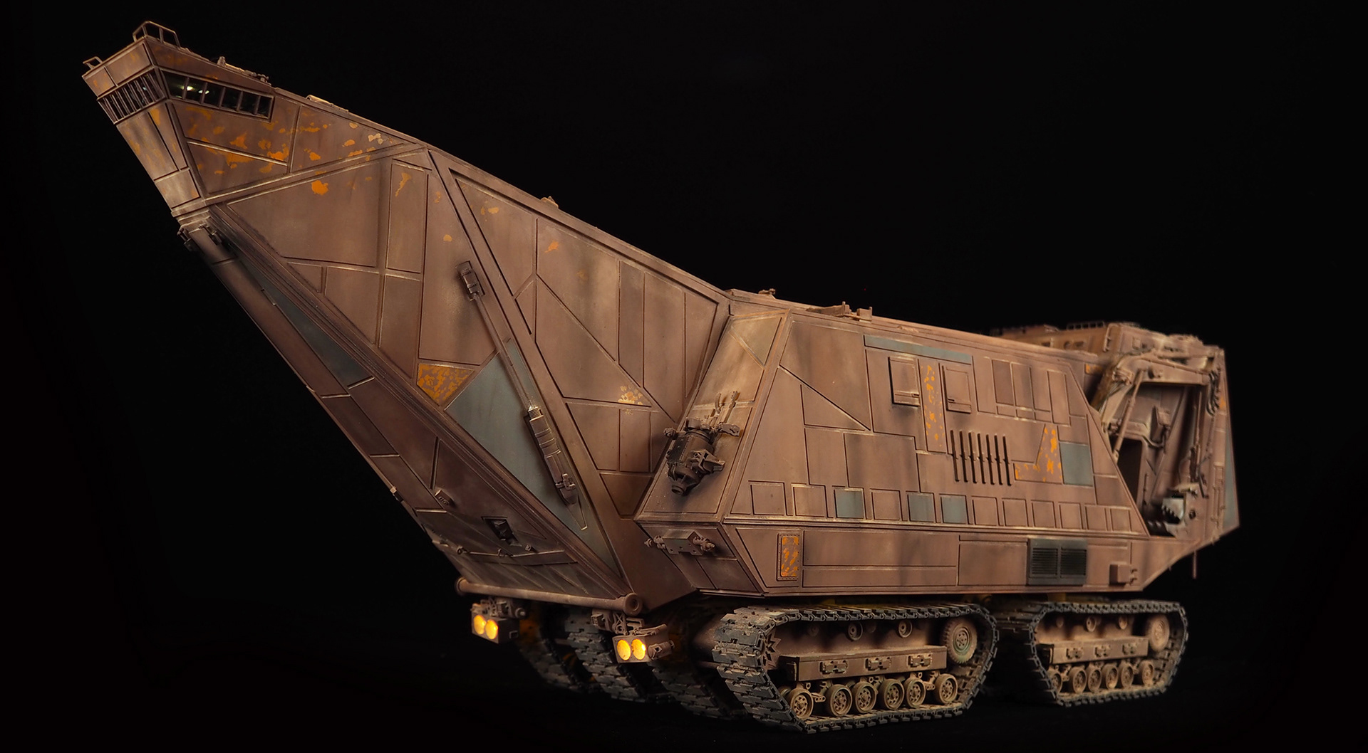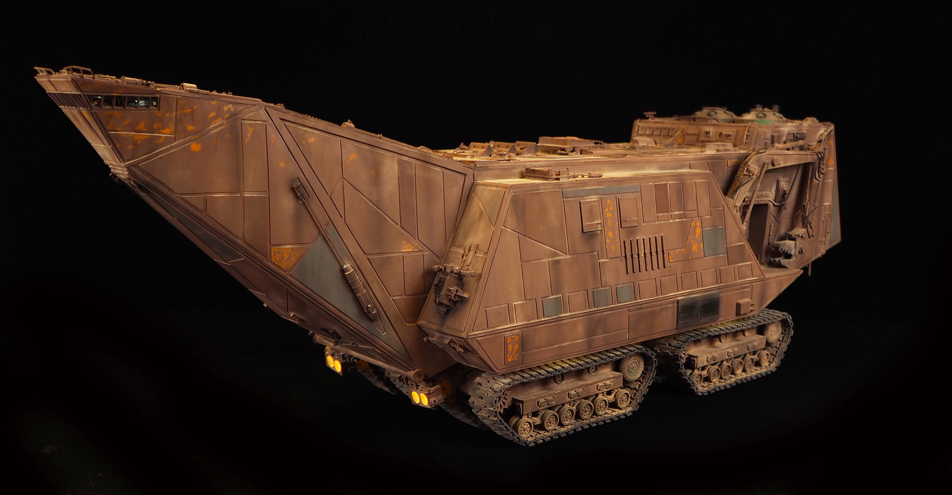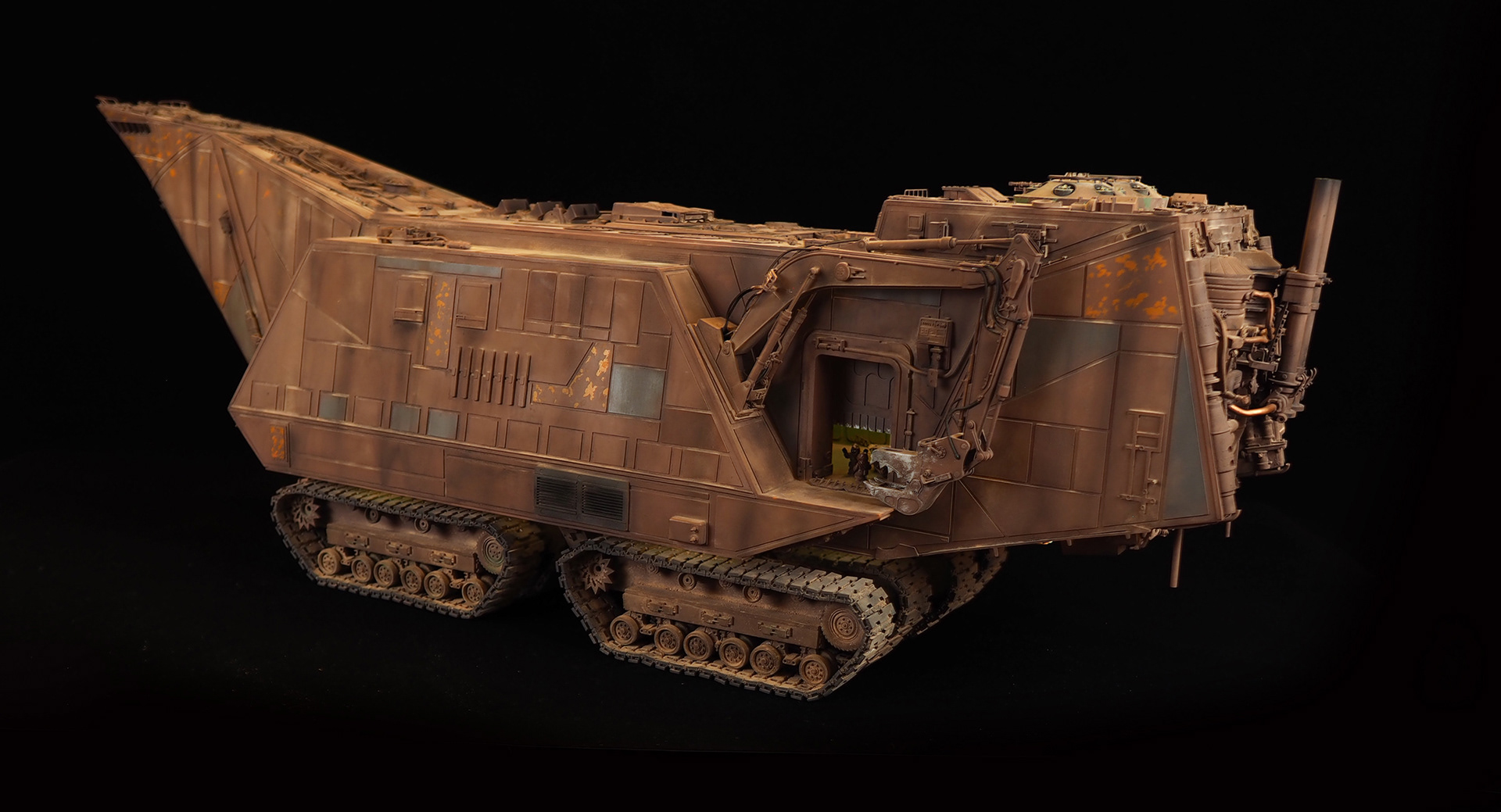 This is my interpretation of the Sandcrawler from Star Wars, as seen in the preproduction painting by Ralph McQuarrie. Much like the sketchbooks featuring the work of Joe Johnston and others, the McQuarrie paintings were and continue to be a massive source of inspiration for me. This model was my first real foray into building an under structure in Rhino and then printing in ABS on an FDM printer. From there I clad the model in styrene and detailed it using traditional techniques. Comically, it’s in scale with the Galoob Jawas, so I threw some in here and there. It took the better part of a year and a half to build the model, and I feel that I grew my digital skill sets tremendously.