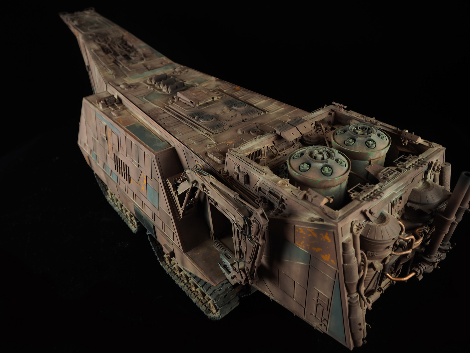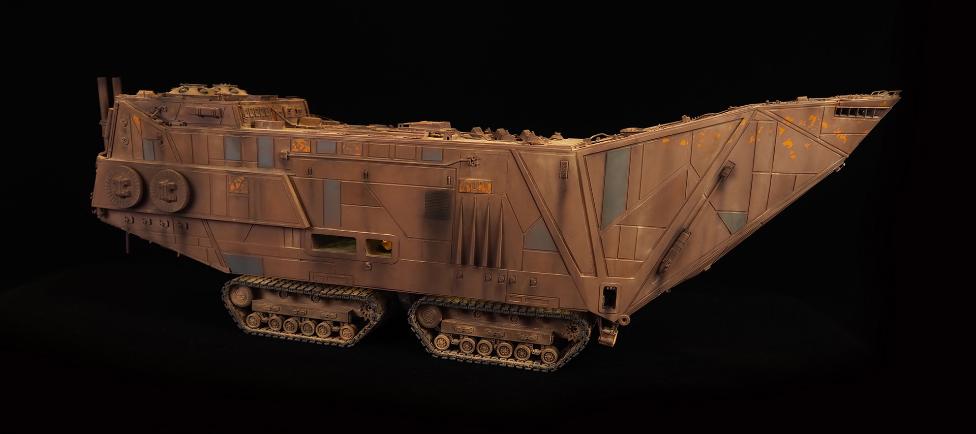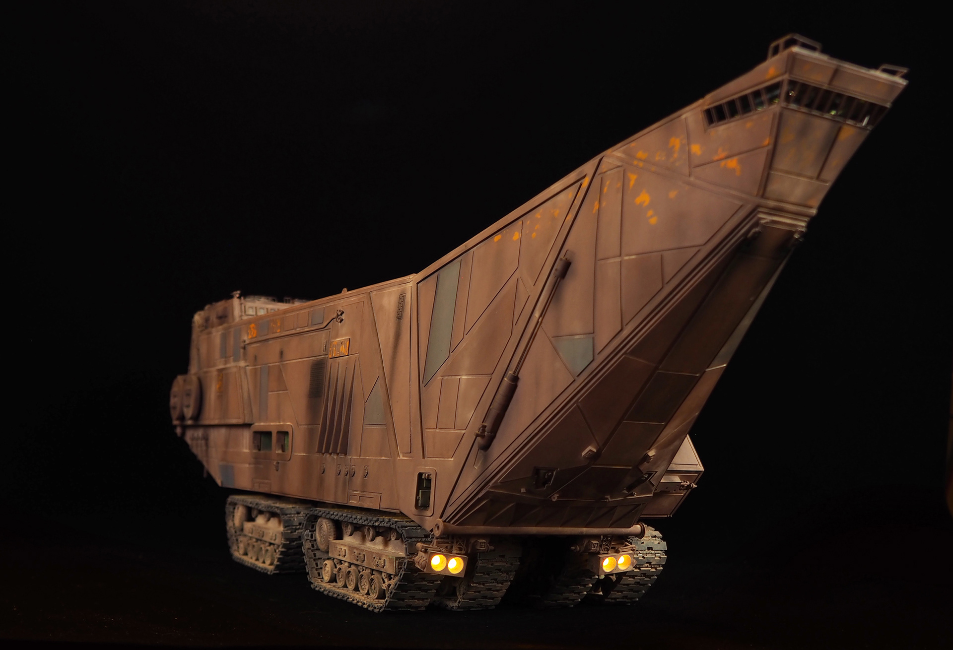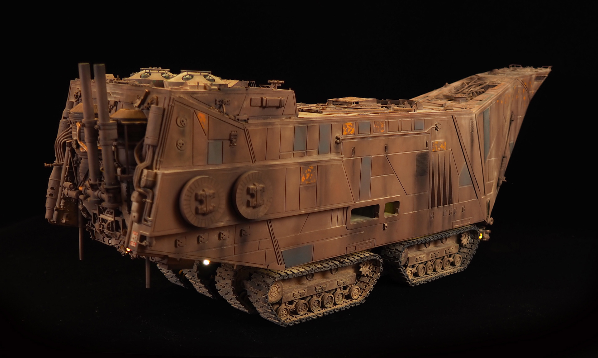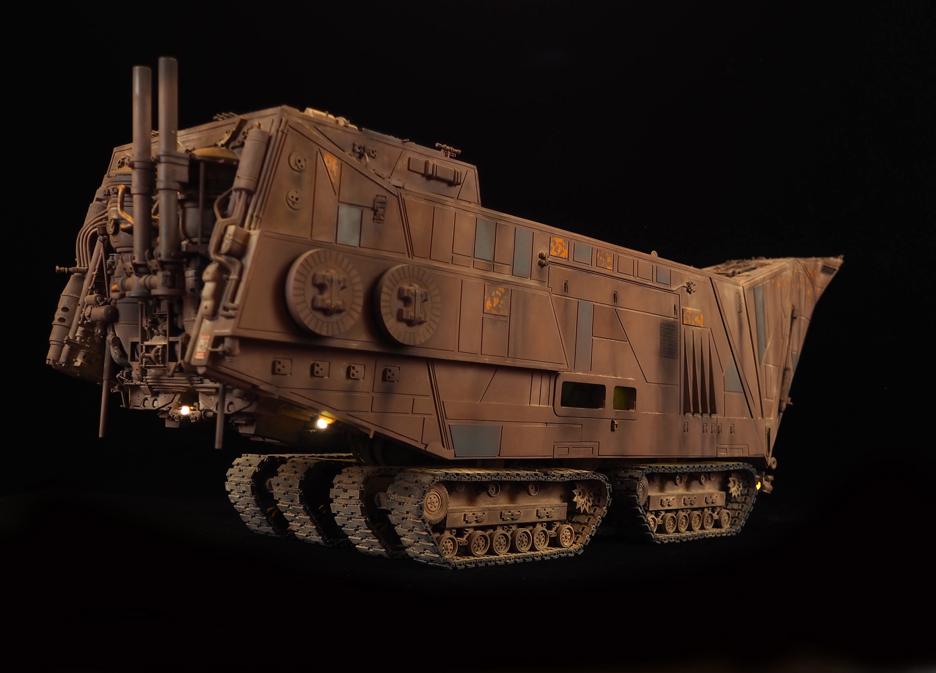 This is my interpretation of the Sandcrawler from Star Wars, as seen in the preproduction painting by Ralph McQuarrie. Much like the sketchbooks featuring the work of Joe Johnston and others, the McQuarrie paintings were and continue to be a massive source of inspiration for me. This model was my first real foray into building an under structure in Rhino and then printing in ABS on an FDM printer. From there I clad the model in styrene and detailed it using traditional techniques. Comically, it’s in scale with the Galoob Jawas, so I threw some in here and there. It took the better part of a year and a half to build the model, and I feel that I grew my digital skill sets tremendously.