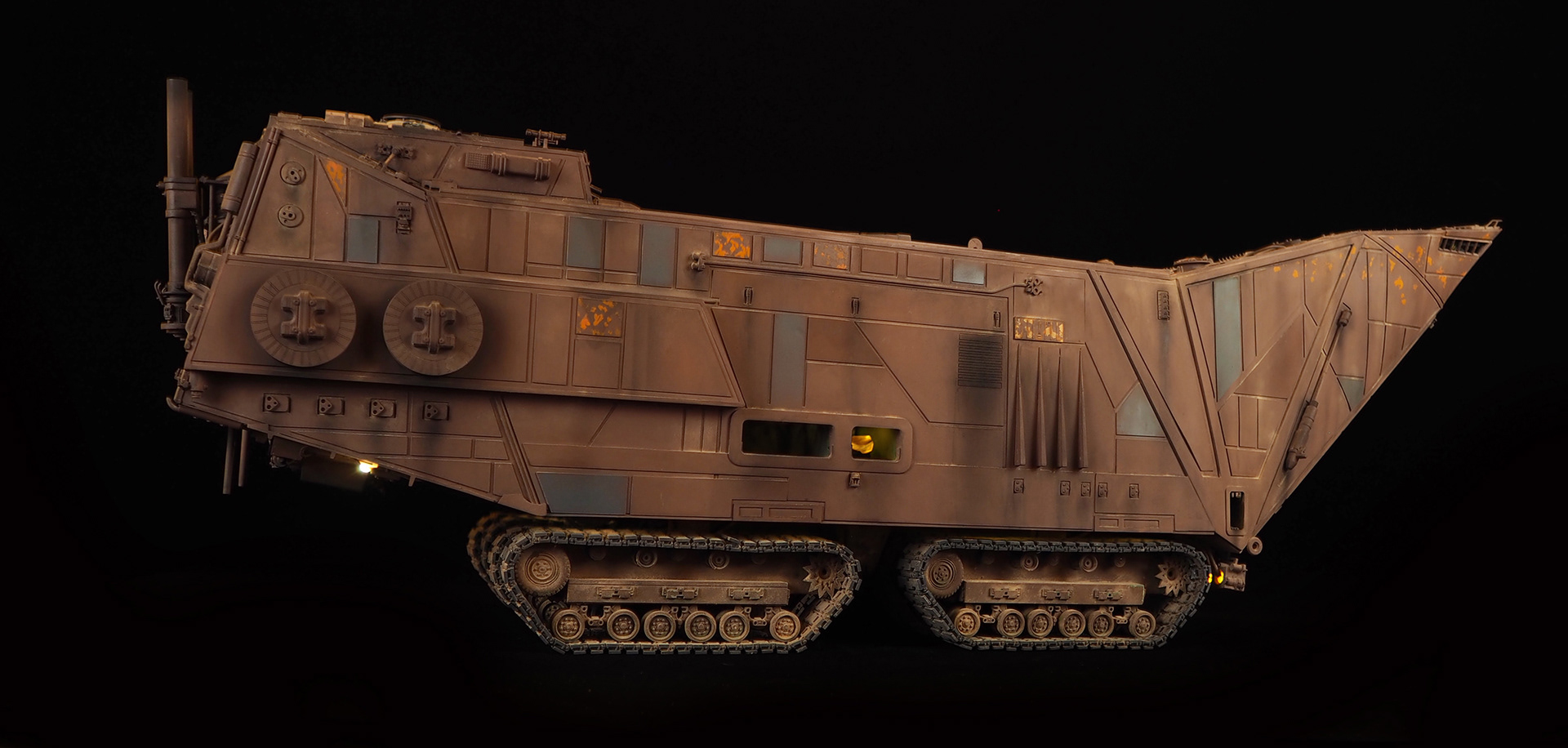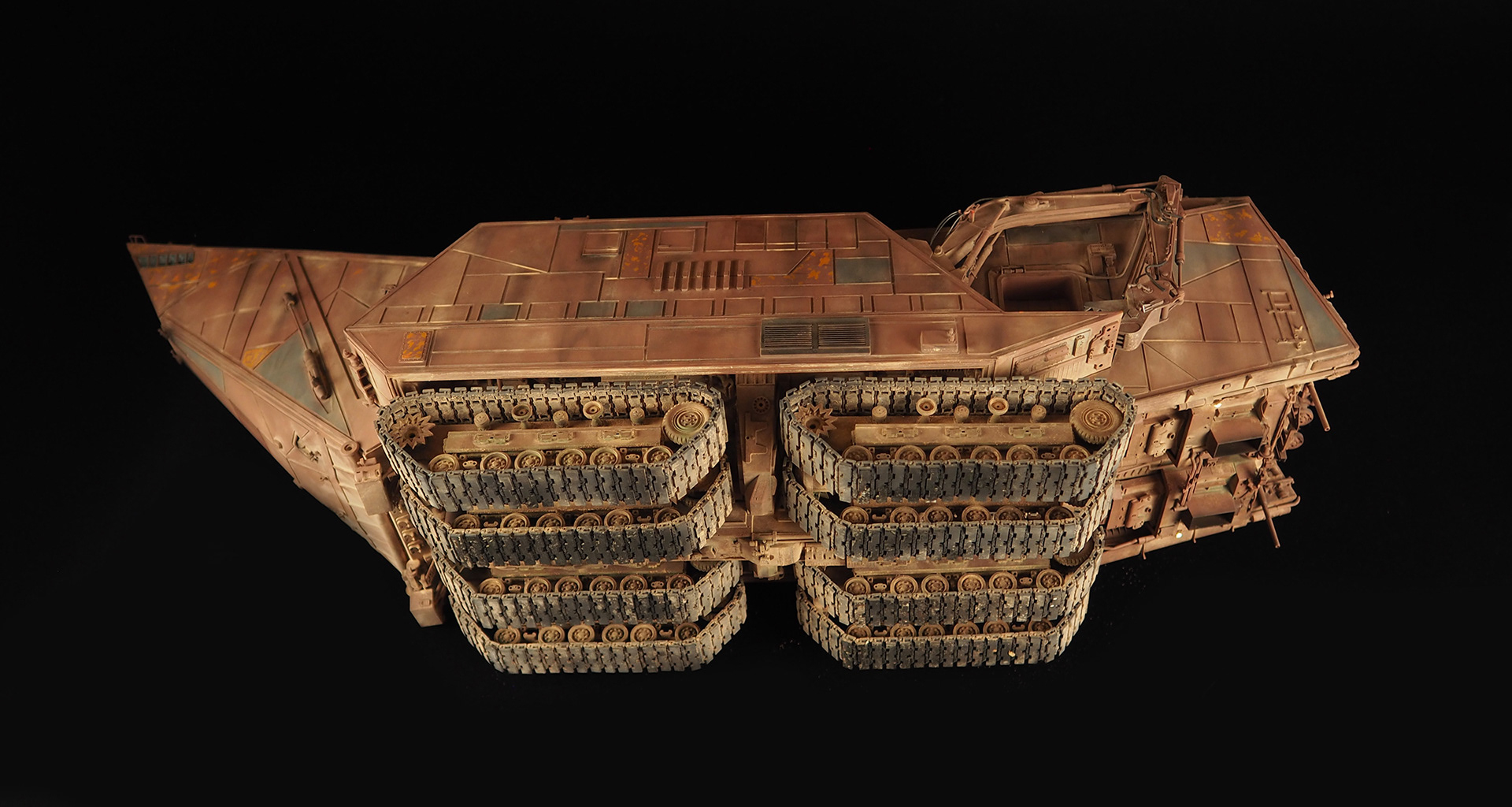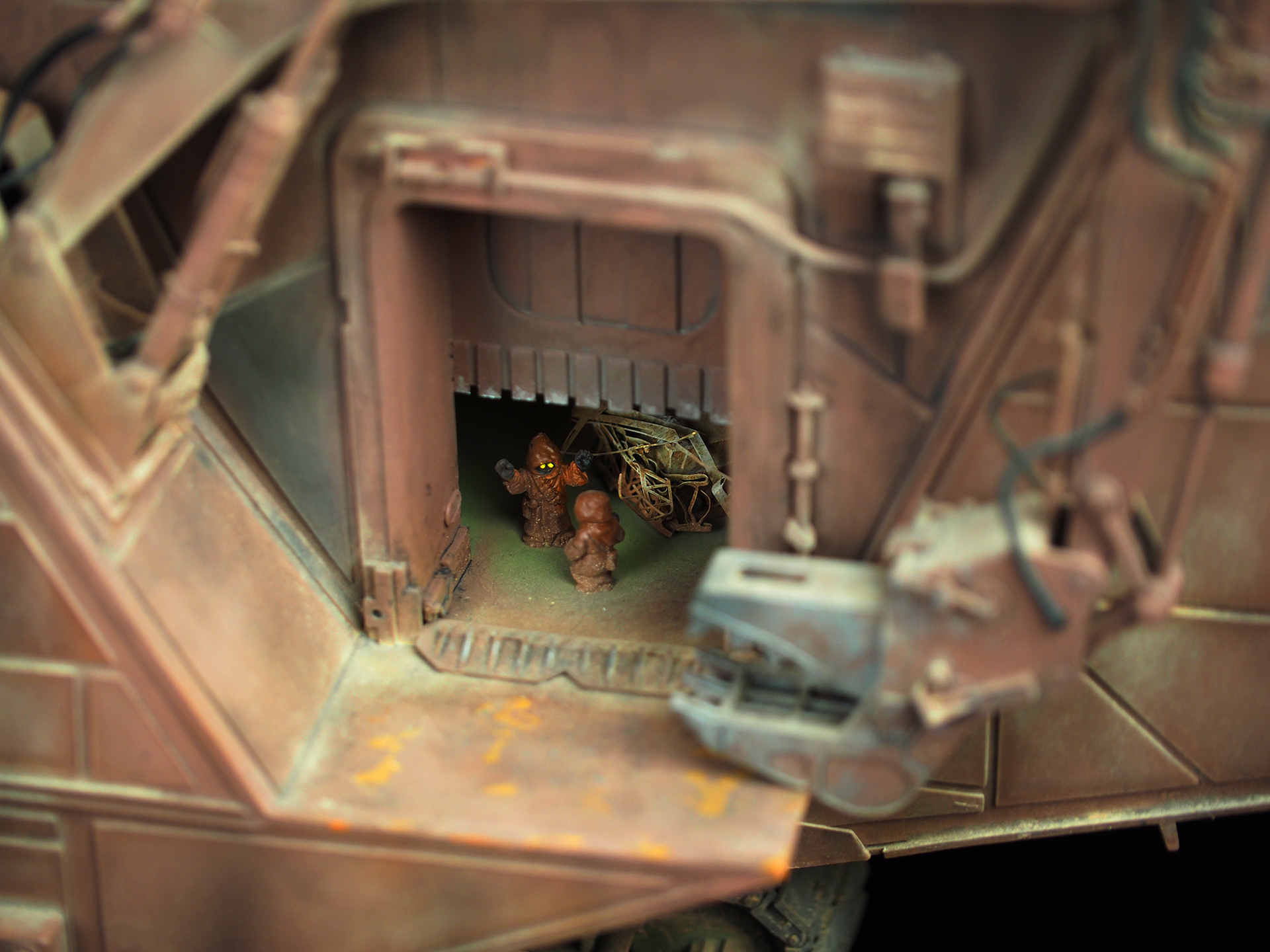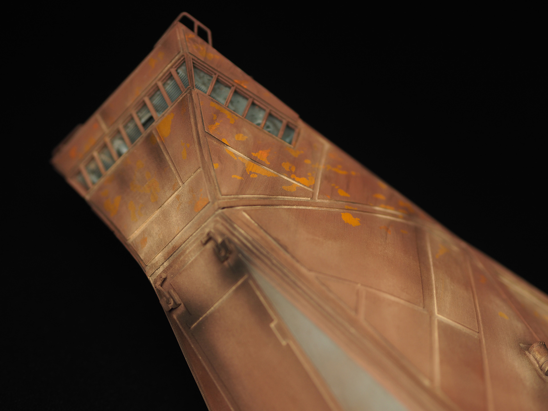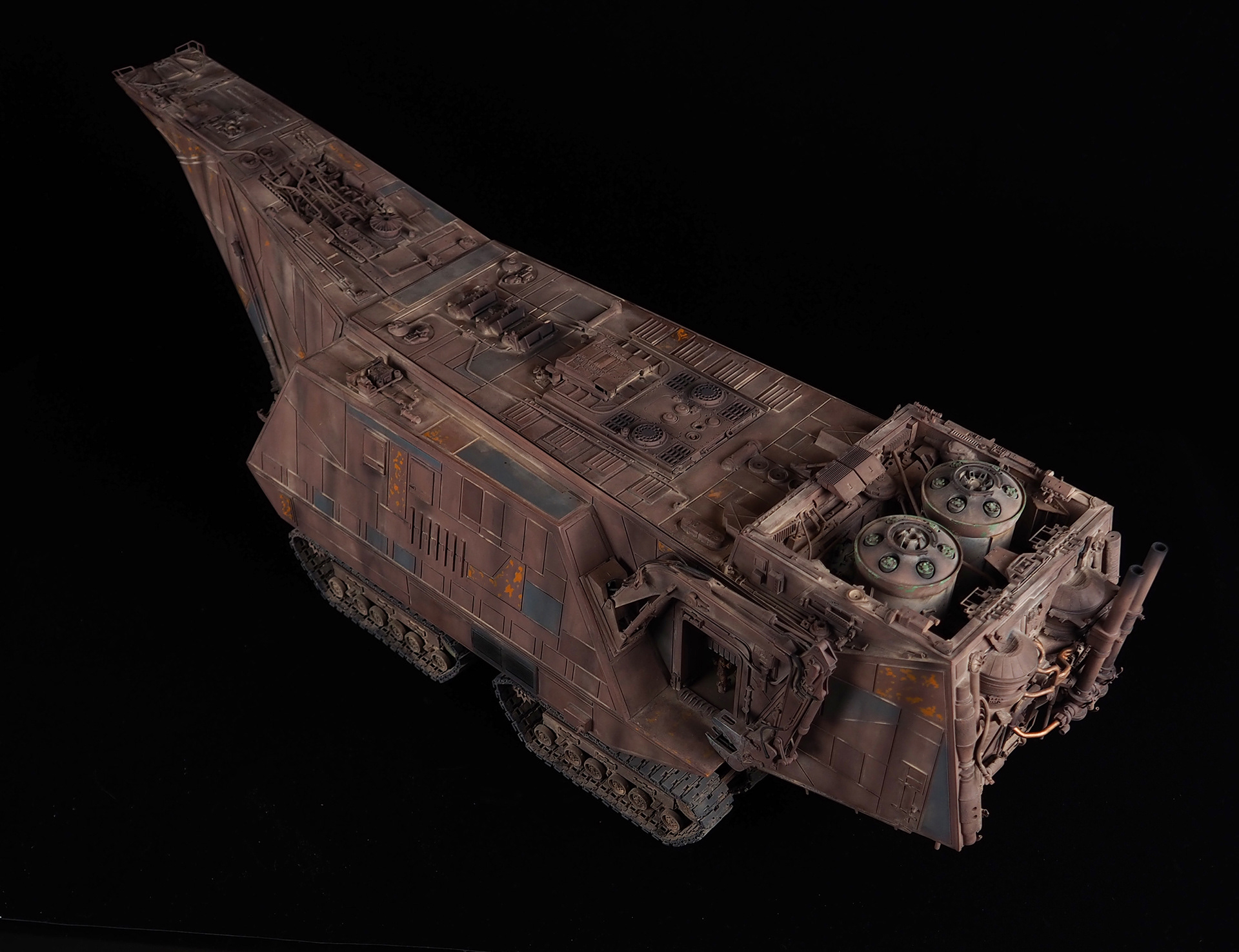 This is my interpretation of the Sandcrawler from Star Wars, as seen in the preproduction painting by Ralph McQuarrie. Much like the sketchbooks featuring the work of Joe Johnston and others, the McQuarrie paintings were and continue to be a massive source of inspiration for me. This model was my first real foray into building an under structure in Rhino and then printing in ABS on an FDM printer. From there I clad the model in styrene and detailed it using traditional techniques. Comically, it’s in scale with the Galoob Jawas, so I threw some in here and there. It took the better part of a year and a half to build the model, and I feel that I grew my digital skill sets tremendously.