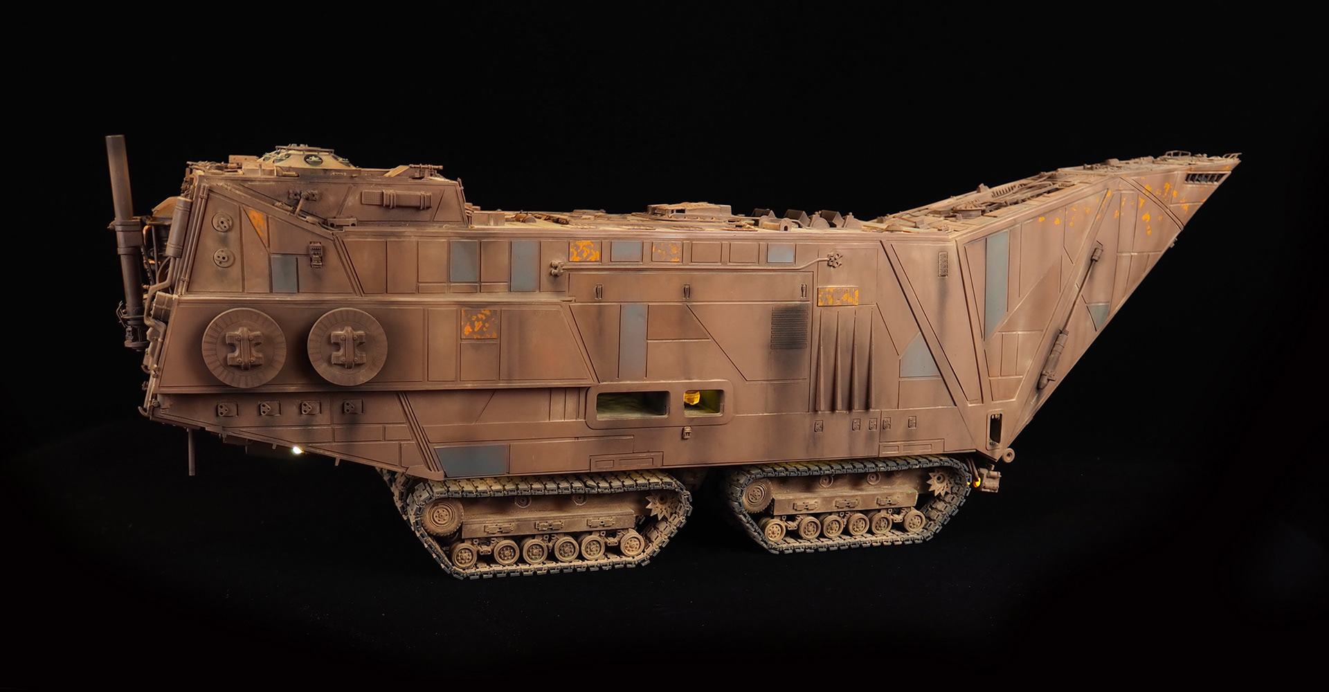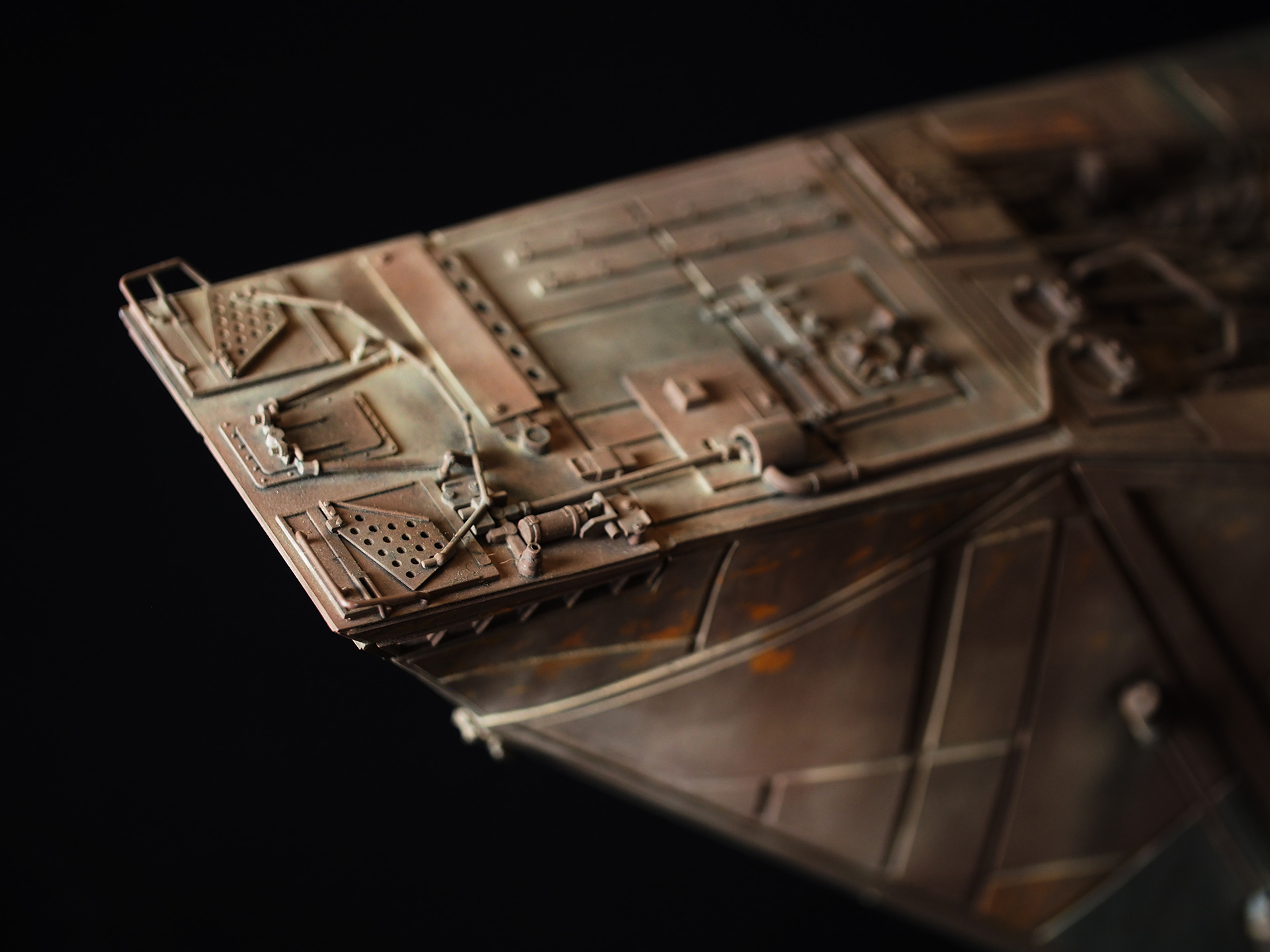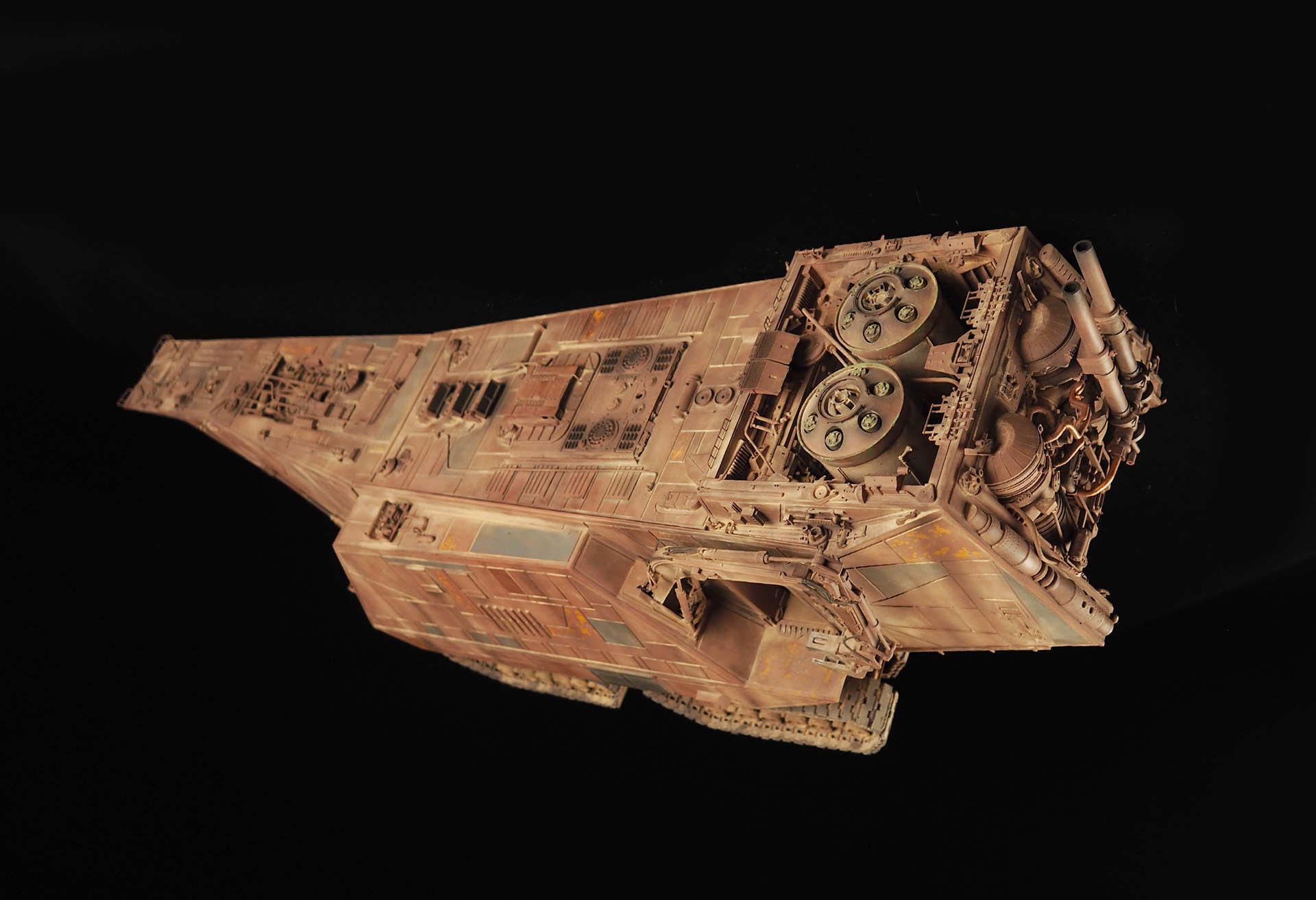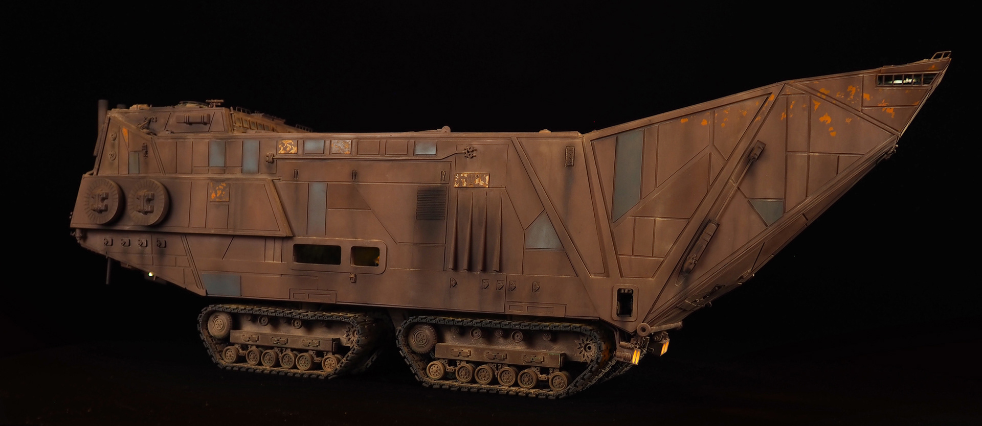 This is my interpretation of the Sandcrawler from Star Wars, as seen in the preproduction painting by Ralph McQuarrie. Much like the sketchbooks featuring the work of Joe Johnston and others, the McQuarrie paintings were and continue to be a massive source of inspiration for me. This model was my first real foray into building an under structure in Rhino and then printing in ABS on an FDM printer. From there I clad the model in styrene and detailed it using traditional techniques. Comically, it’s in scale with the Galoob Jawas, so I threw some in here and there. It took the better part of a year and a half to build the model, and I feel that I grew my digital skill sets tremendously.