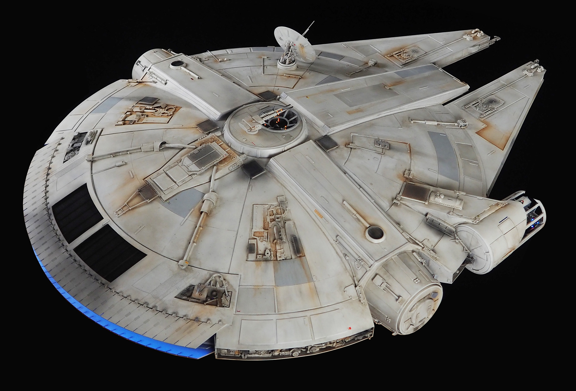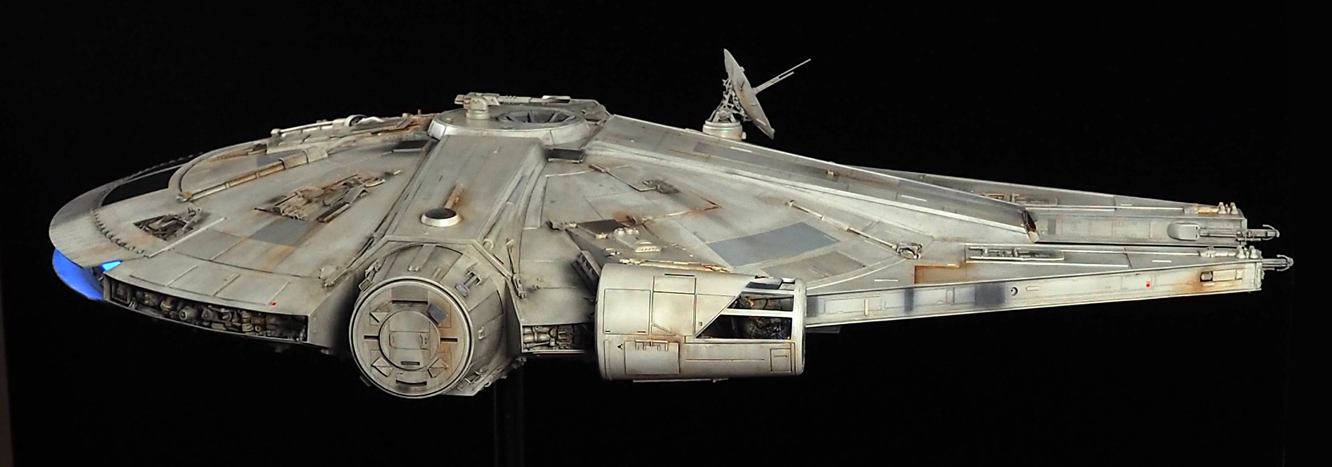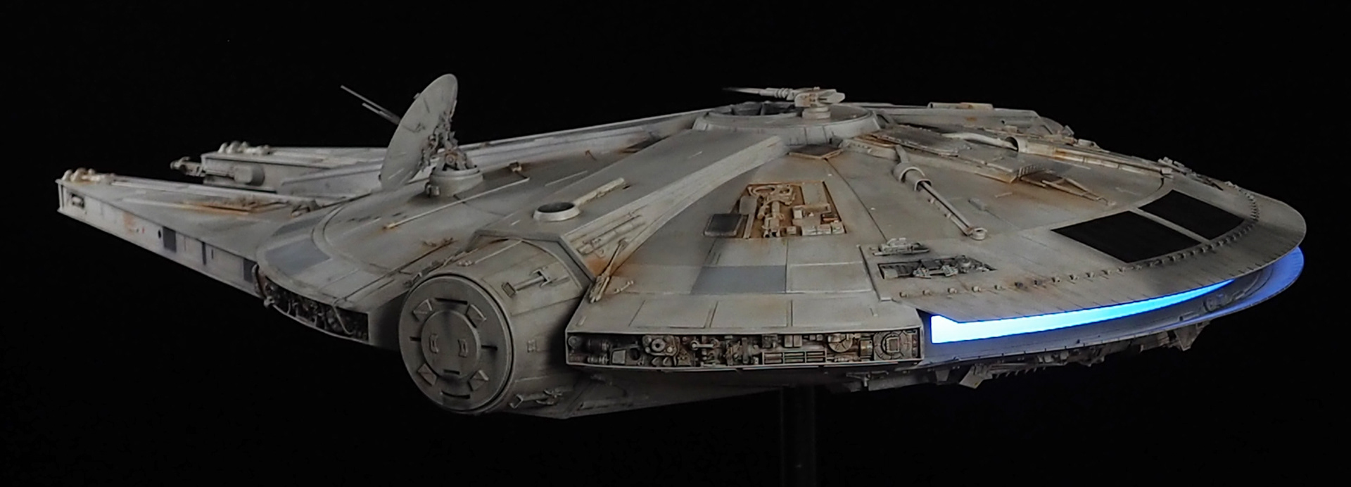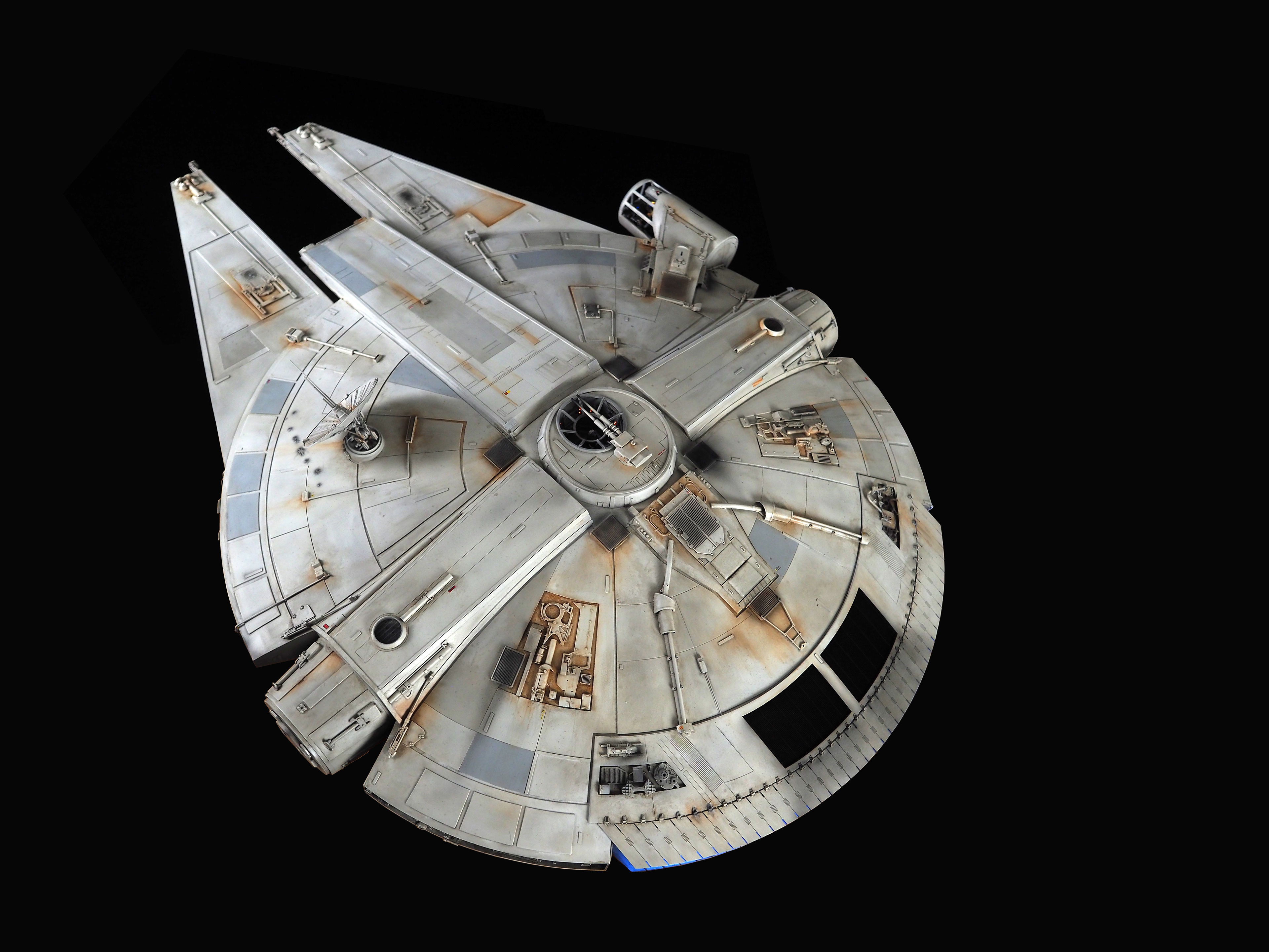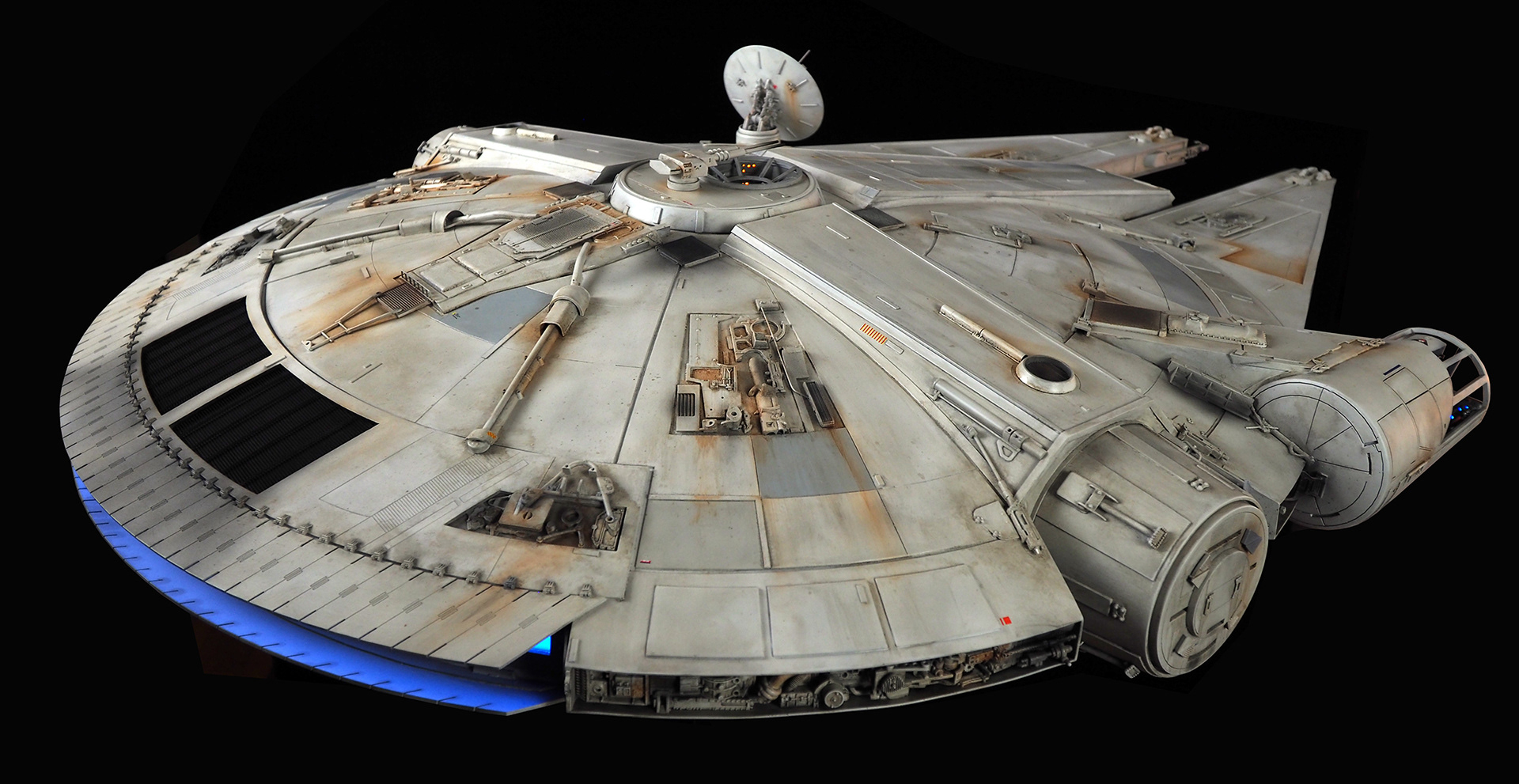 The work of Stinson Lenz was the spark that kicked this project off, as he had designed a McQuarrie Falcon in SketchUp. At that time I did not know any 3D programs, so I purchased the model from him for a very reasonable fee, and enlisted the help of some friends to get things where I needed them to be. John Sabean drew a skeleton and we printed the parts on an FDM printer, Jeff Waclawski and the late Kip Hart converted a few key parts like the cockpit shell and radar dish to STL and grew them on an Objet, Jim Shima solved an electronics requirement to get that even blue engine light the way I wanted, and I (now with Rhino and my own 3D printer at home) grew the remaining parts, laser cut some panels, cut the styrene, clad the saucer, sculpted the figures, and detailed the model as shown. I finished and debuted it at the 2017 Wonderfest in Kentucky. It is my favorite model so far, and I hope you relish it as much as I !
