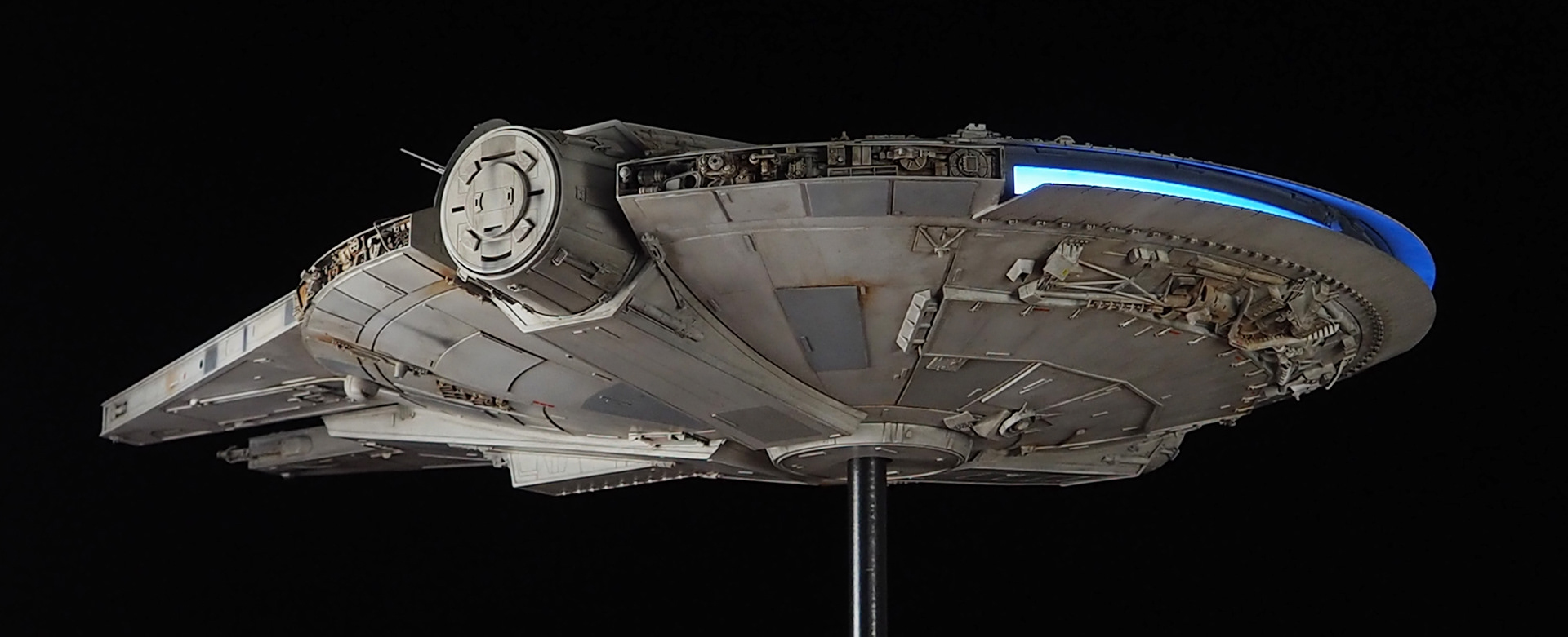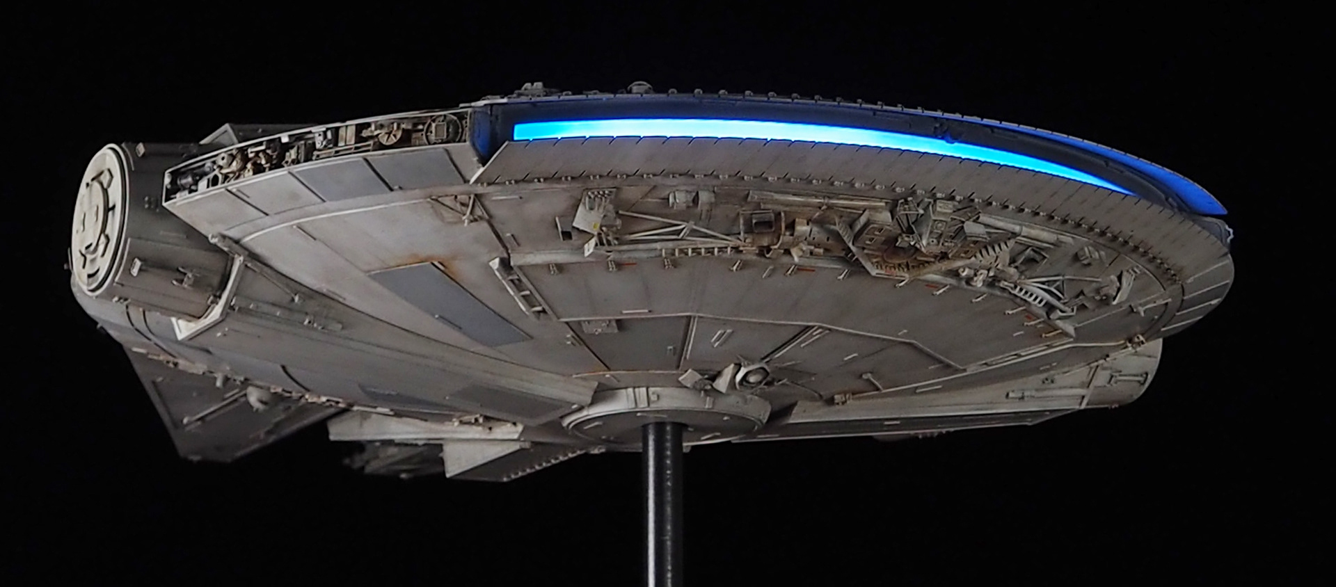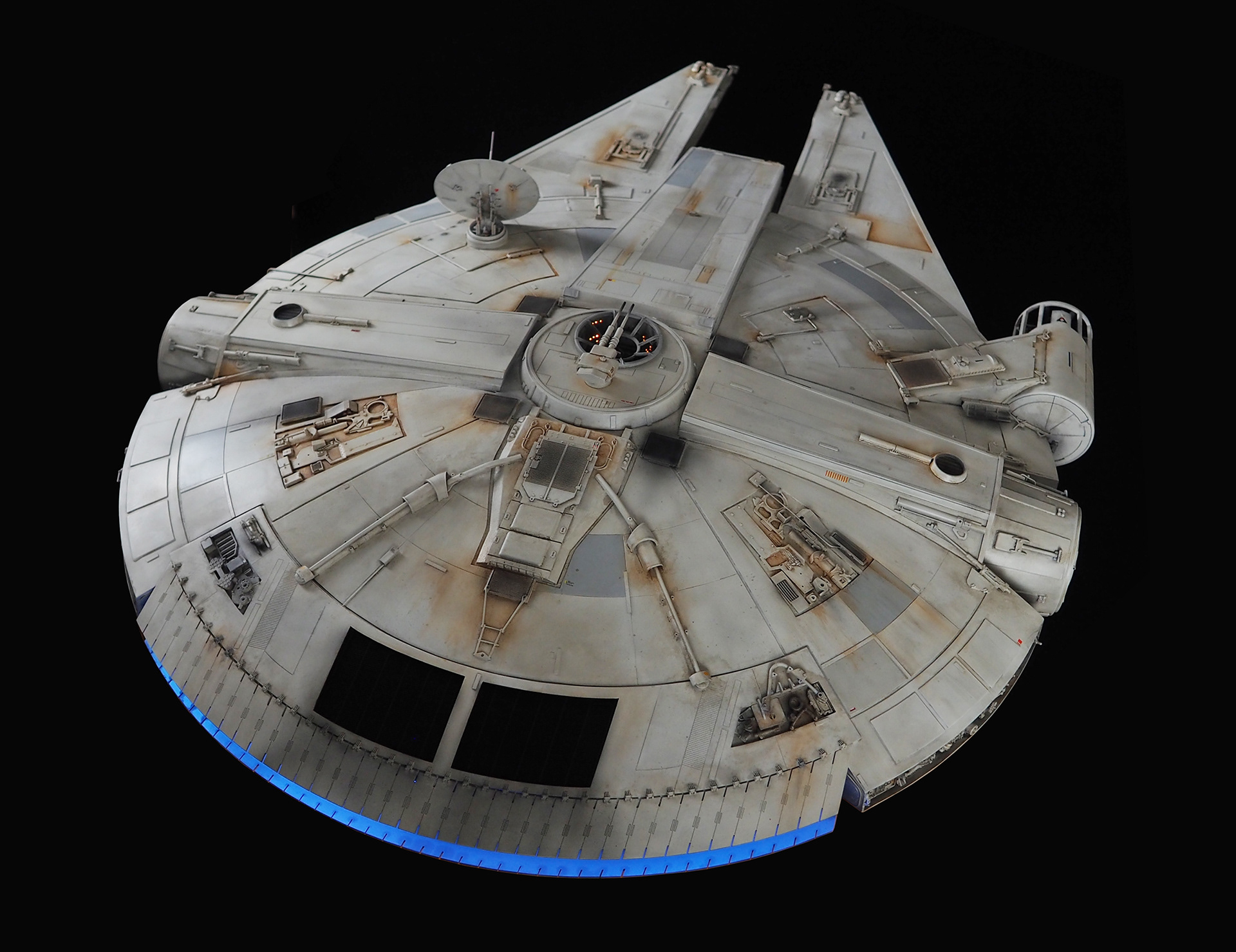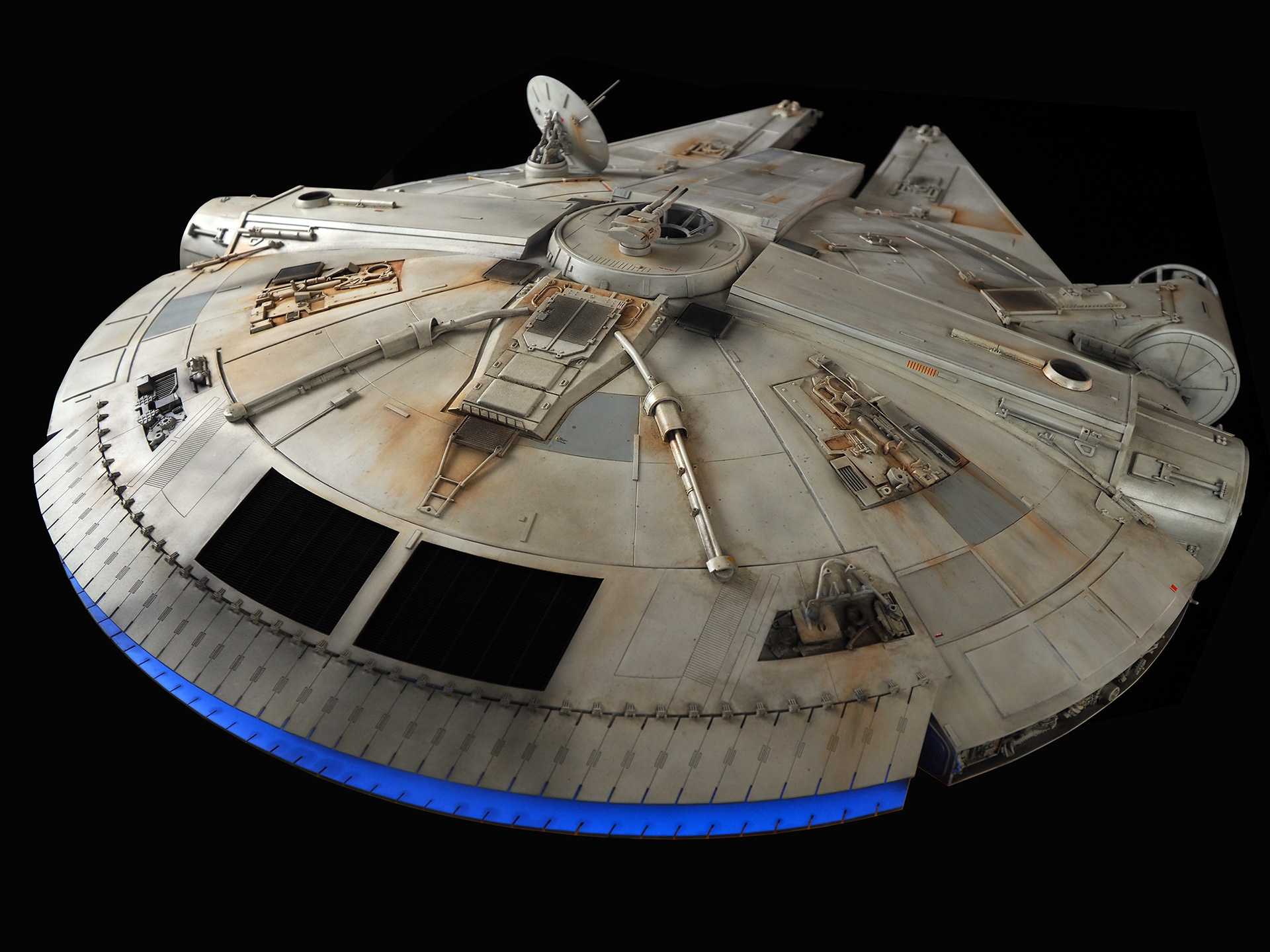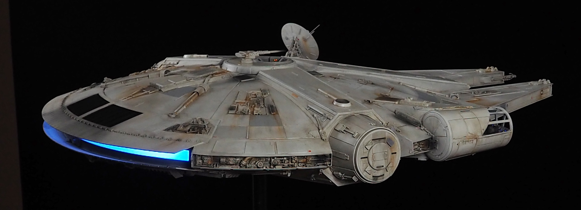 The work of Stinson Lenz was the spark that kicked this project off, as he had designed a McQuarrie Falcon in SketchUp. At that time I did not know any 3D programs, so I purchased the model from him for a very reasonable fee, and enlisted the help of some friends to get things where I needed them to be. John Sabean drew a skeleton and we printed the parts on an FDM printer, Jeff Waclawski and the late Kip Hart converted a few key parts like the cockpit shell and radar dish to STL and grew them on an Objet, Jim Shima solved an electronics requirement to get that even blue engine light the way I wanted, and I (now with Rhino and my own 3D printer at home) grew the remaining parts, laser cut some panels, cut the styrene, clad the saucer, sculpted the figures, and detailed the model as shown. I finished and debuted it at the 2017 Wonderfest in Kentucky. It is my favorite model so far, and I hope you relish it as much as I !