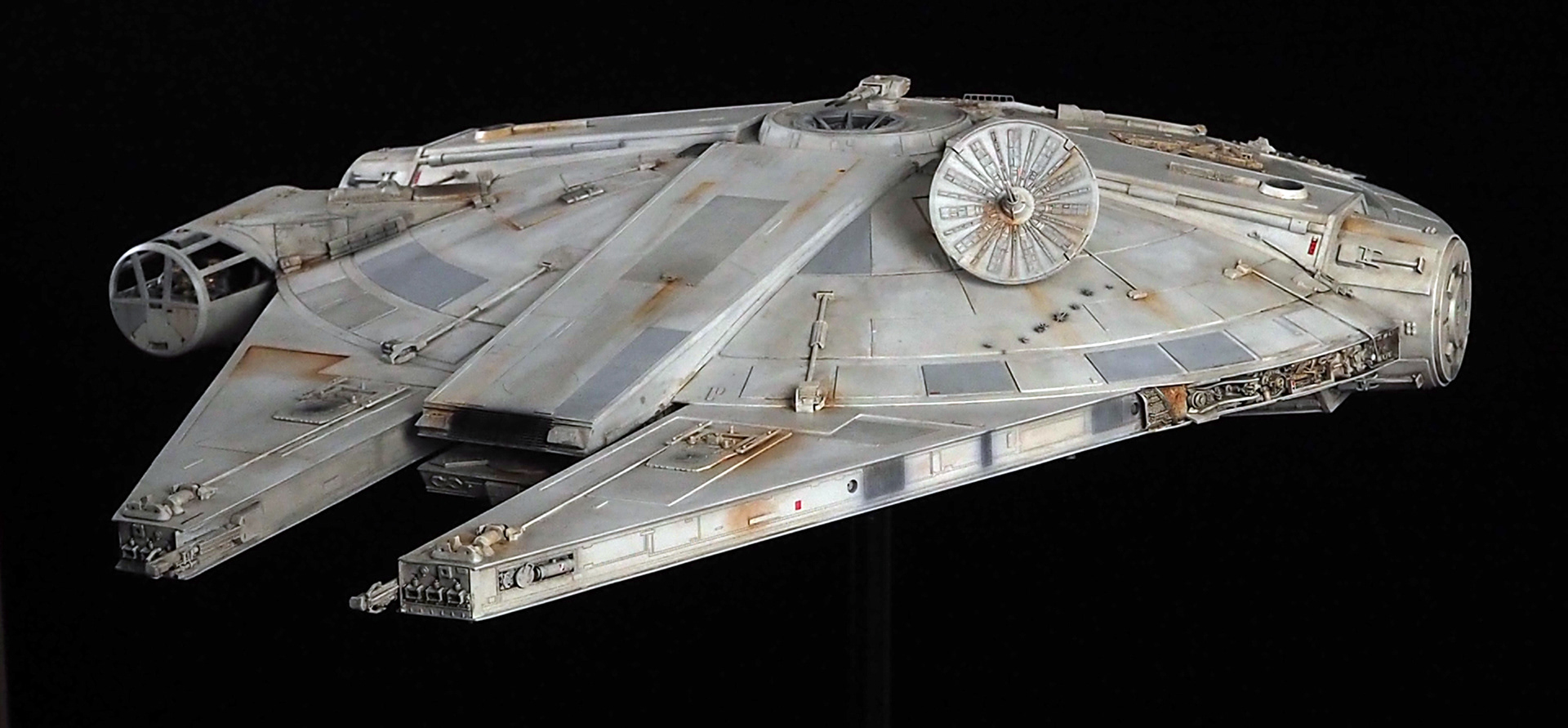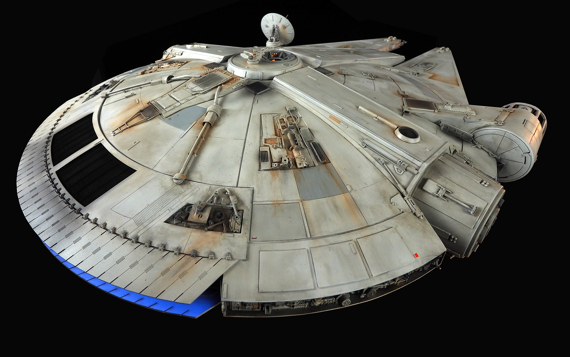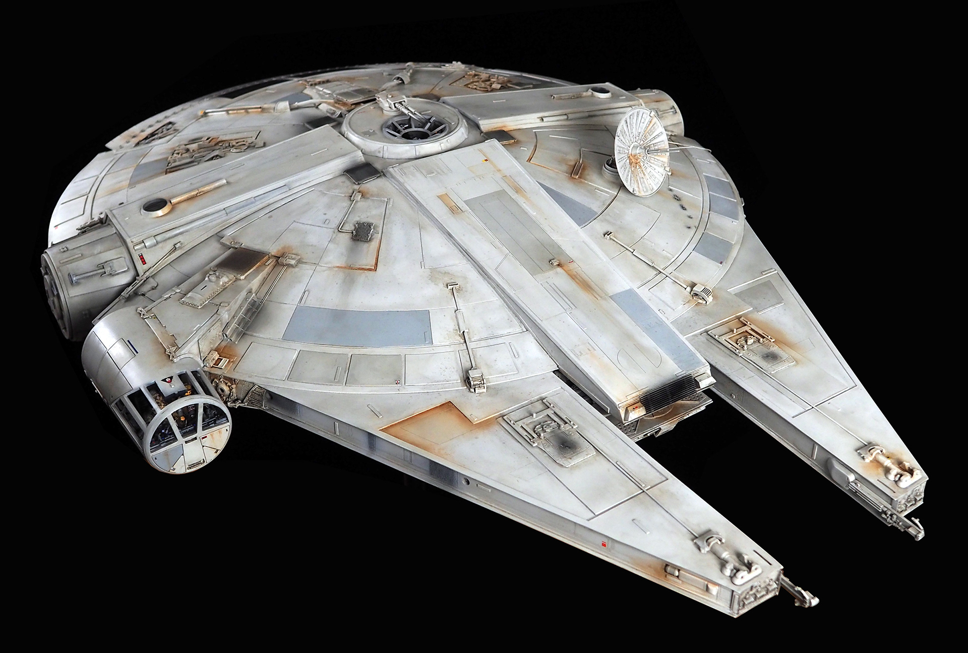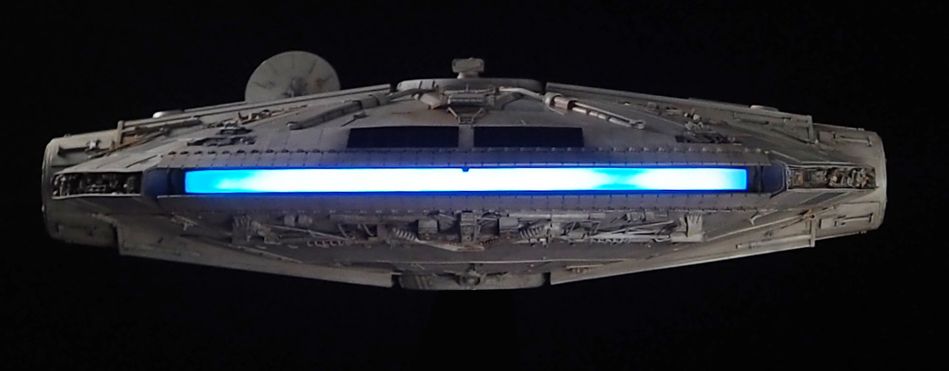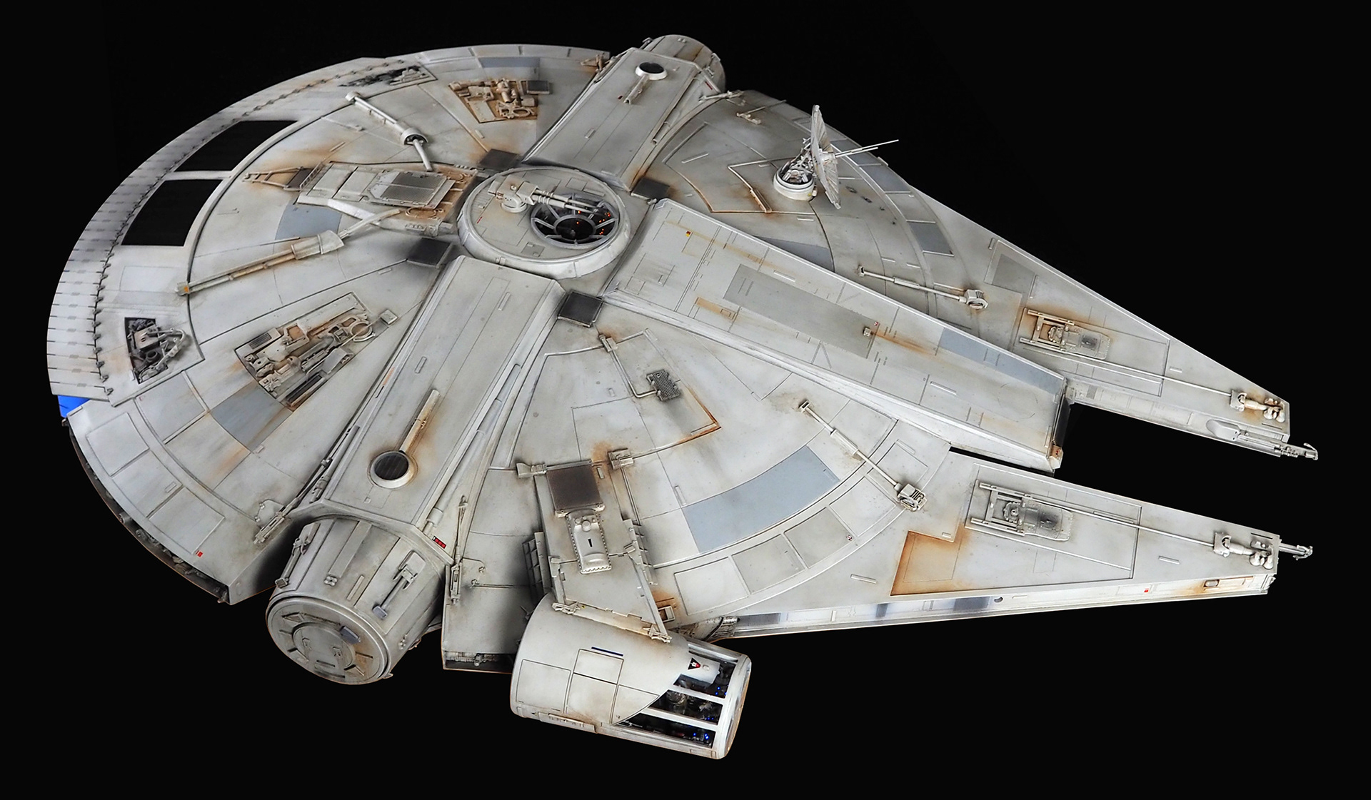 The work of Stinson Lenz was the spark that kicked this project off, as he had designed a McQuarrie Falcon in SketchUp. At that time I did not know any 3D programs, so I purchased the model from him for a very reasonable fee, and enlisted the help of some friends to get things where I needed them to be. John Sabean drew a skeleton and we printed the parts on an FDM printer, Jeff Waclawski and the late Kip Hart converted a few key parts like the cockpit shell and radar dish to STL and grew them on an Objet, Jim Shima solved an electronics requirement to get that even blue engine light the way I wanted, and I (now with Rhino and my own 3D printer at home) grew the remaining parts, laser cut some panels, cut the styrene, clad the saucer, sculpted the figures, and detailed the model as shown. I finished and debuted it at the 2017 Wonderfest in Kentucky. It is my favorite model so far, and I hope you relish it as much as I !