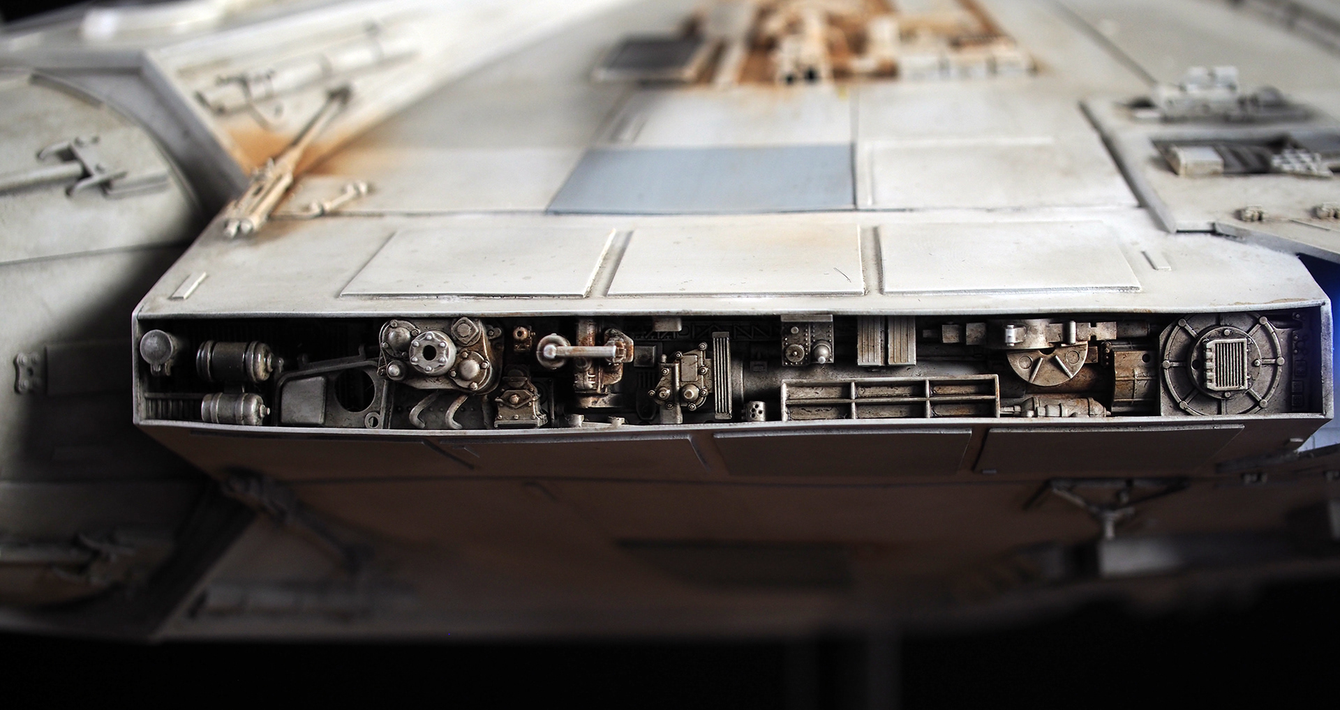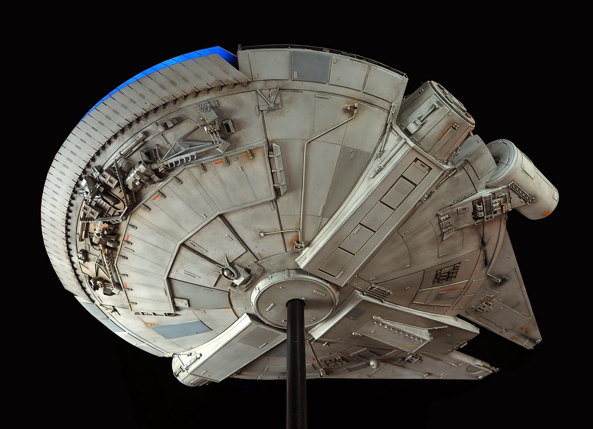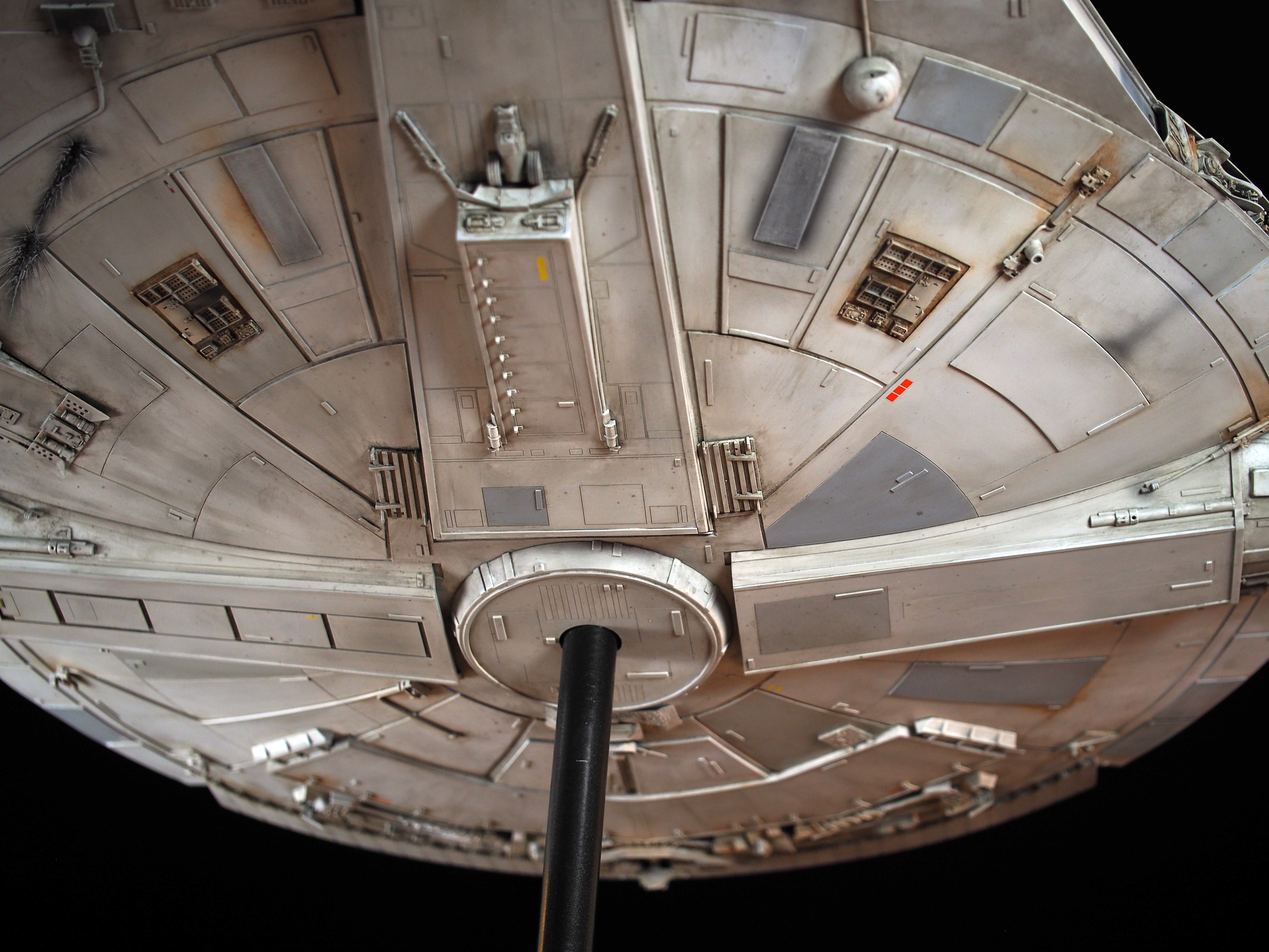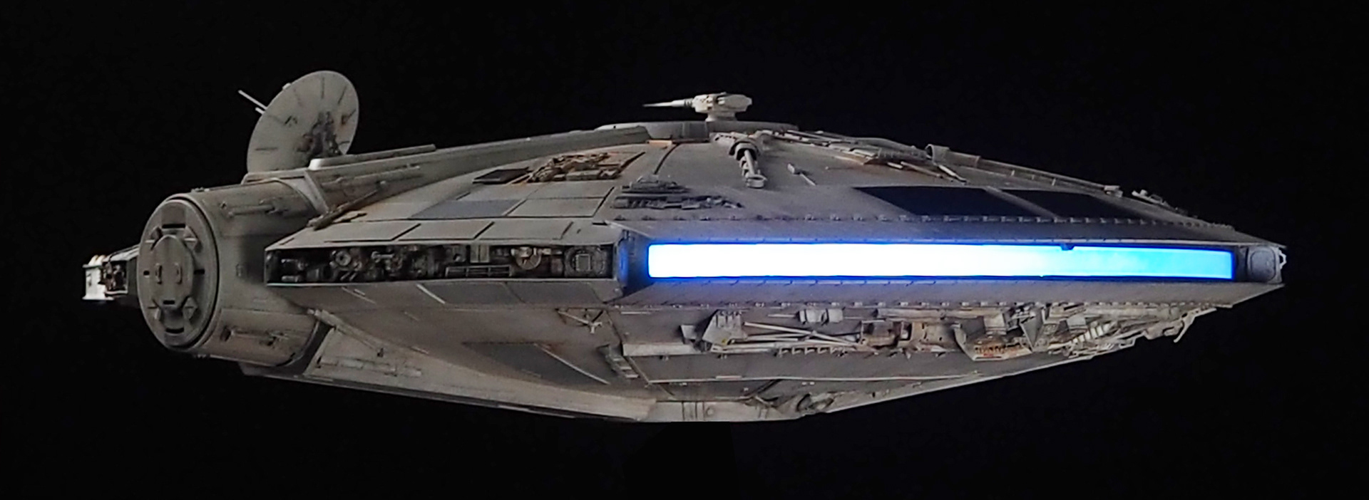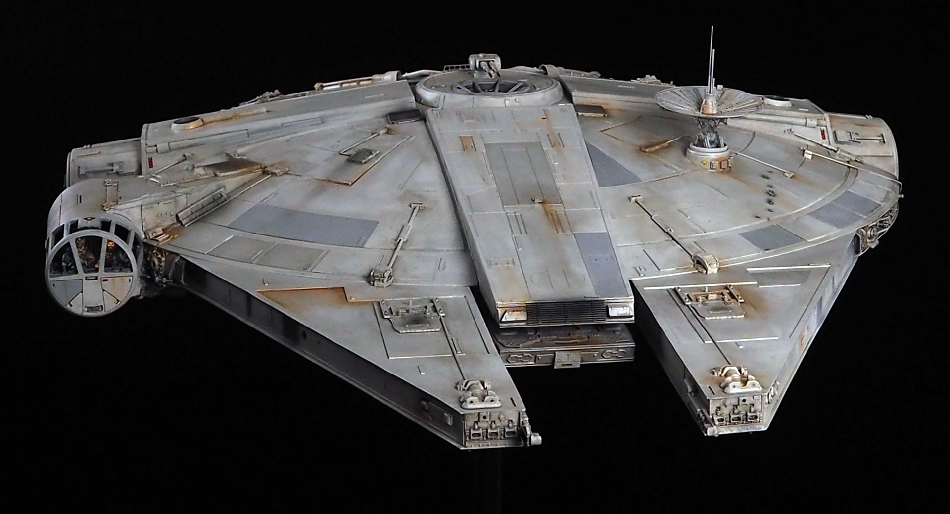 The work of Stinson Lenz was the spark that kicked this project off, as he had designed a McQuarrie Falcon in SketchUp. At that time I did not know any 3D programs, so I purchased the model from him for a very reasonable fee, and enlisted the help of some friends to get things where I needed them to be. John Sabean drew a skeleton and we printed the parts on an FDM printer, Jeff Waclawski and the late Kip Hart converted a few key parts like the cockpit shell and radar dish to STL and grew them on an Objet, Jim Shima solved an electronics requirement to get that even blue engine light the way I wanted, and I (now with Rhino and my own 3D printer at home) grew the remaining parts, laser cut some panels, cut the styrene, clad the saucer, sculpted the figures, and detailed the model as shown. I finished and debuted it at the 2017 Wonderfest in Kentucky. It is my favorite model so far, and I hope you relish it as much as I !