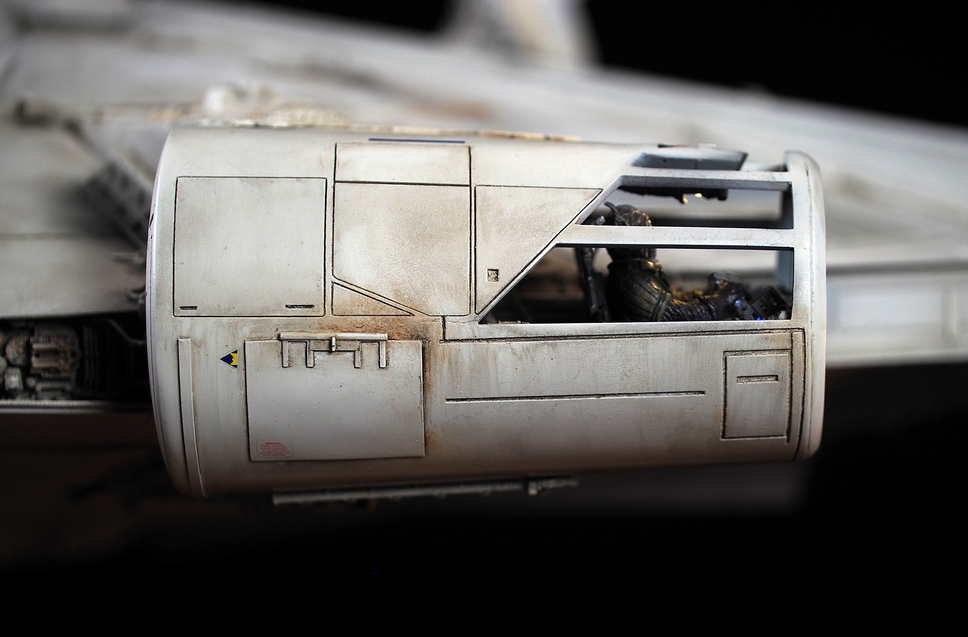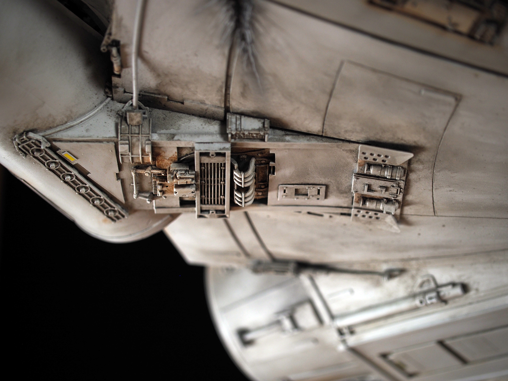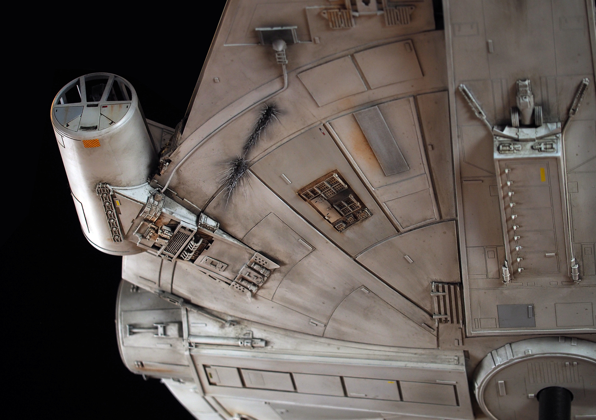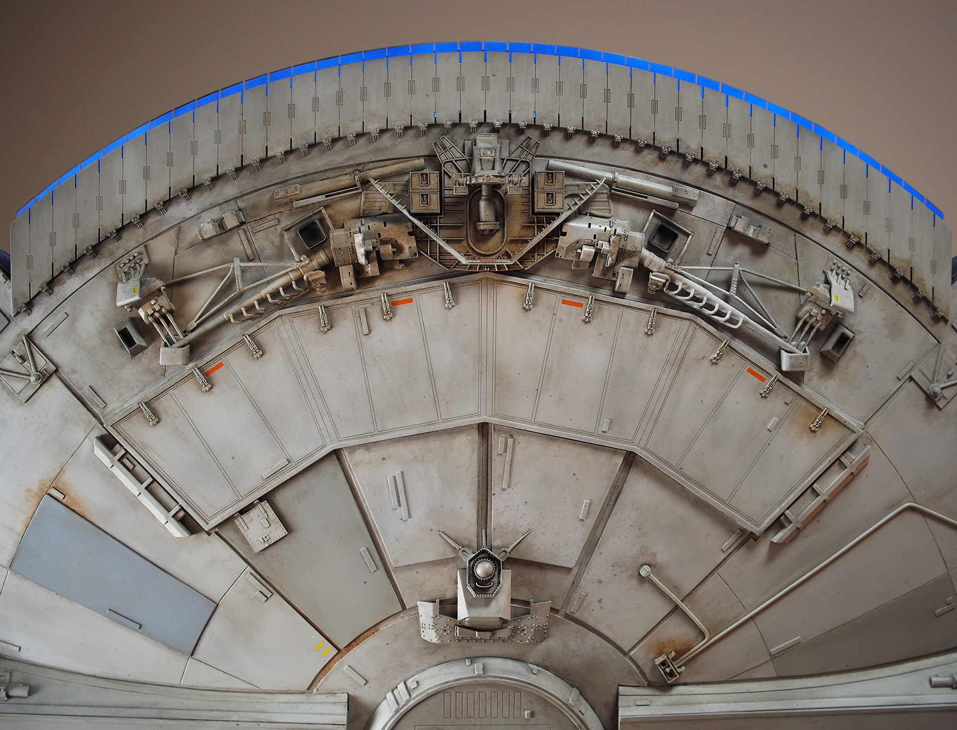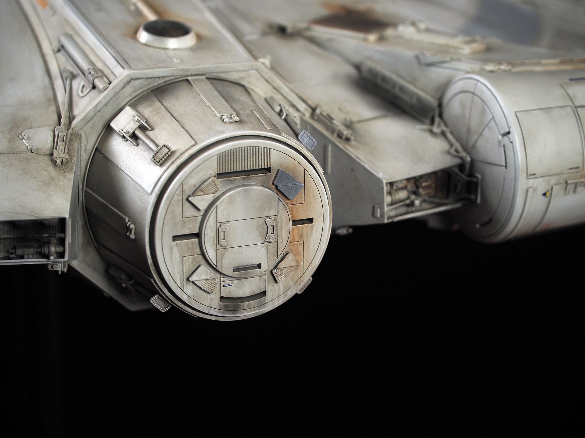 The work of Stinson Lenz was the spark that kicked this project off, as he had designed a McQuarrie Falcon in SketchUp. At that time I did not know any 3D programs, so I purchased the model from him for a very reasonable fee, and enlisted the help of some friends to get things where I needed them to be. John Sabean drew a skeleton and we printed the parts on an FDM printer, Jeff Waclawski and the late Kip Hart converted a few key parts like the cockpit shell and radar dish to STL and grew them on an Objet, Jim Shima solved an electronics requirement to get that even blue engine light the way I wanted, and I (now with Rhino and my own 3D printer at home) grew the remaining parts, laser cut some panels, cut the styrene, clad the saucer, sculpted the figures, and detailed the model as shown. I finished and debuted it at the 2017 Wonderfest in Kentucky. It is my favorite model so far, and I hope you relish it as much as I !
