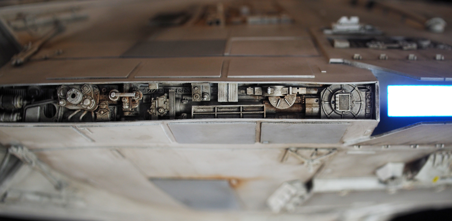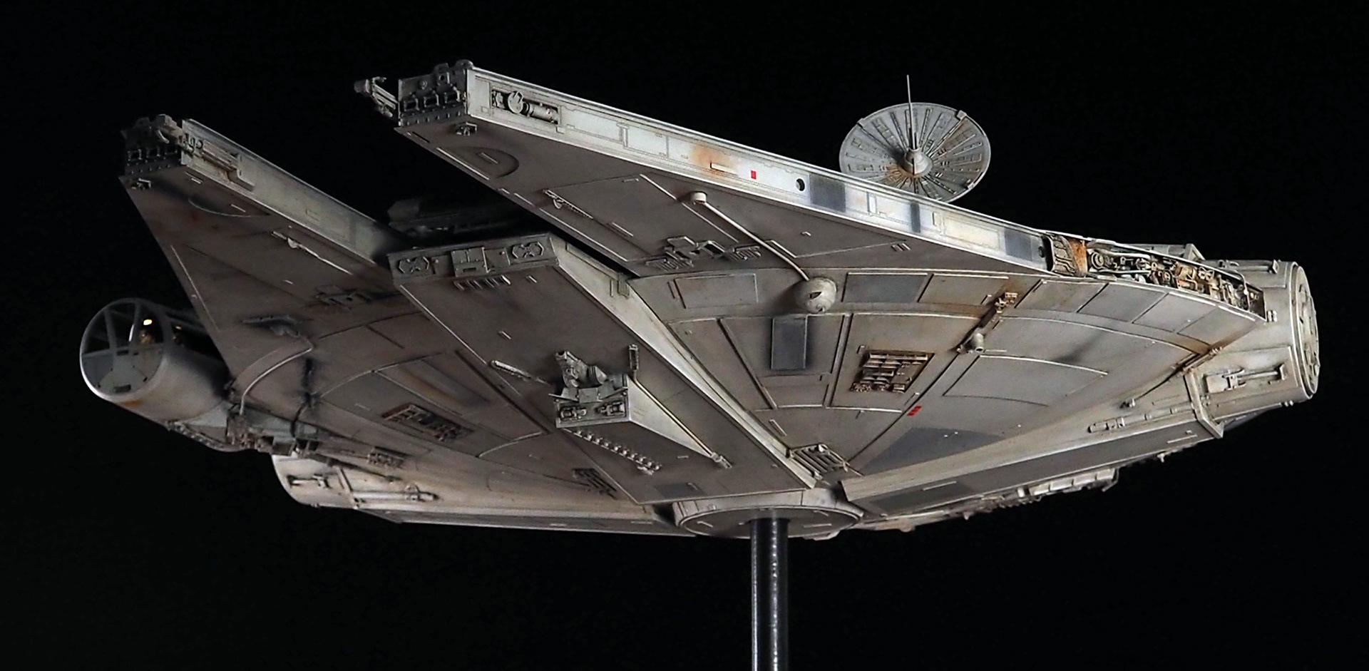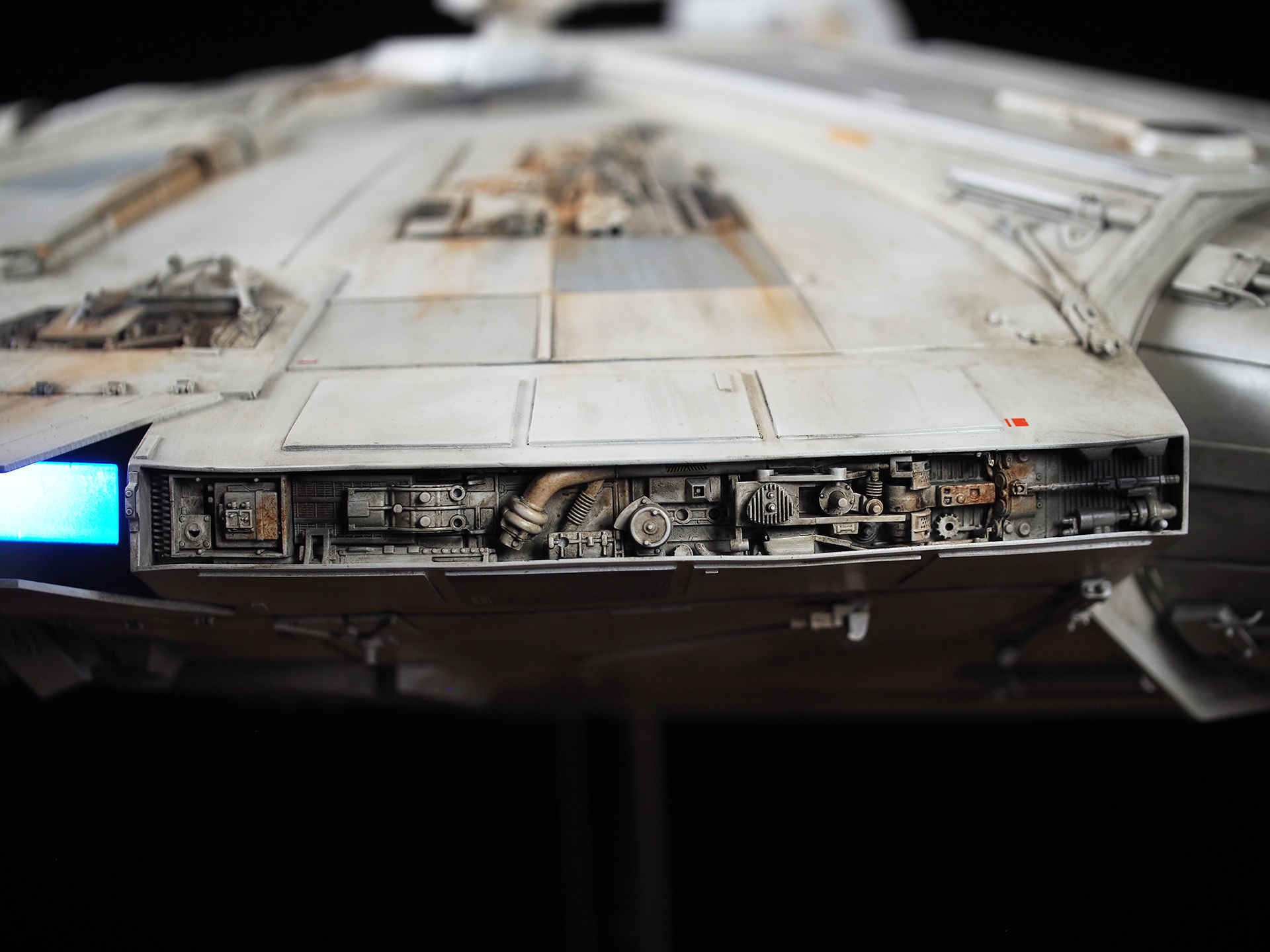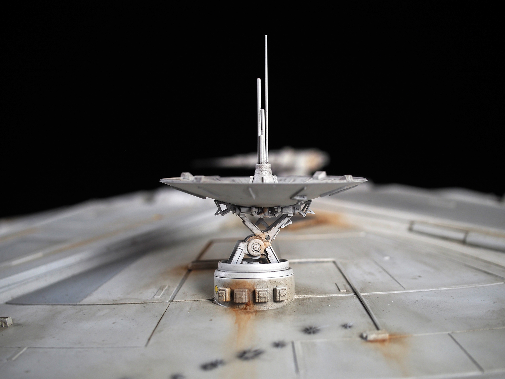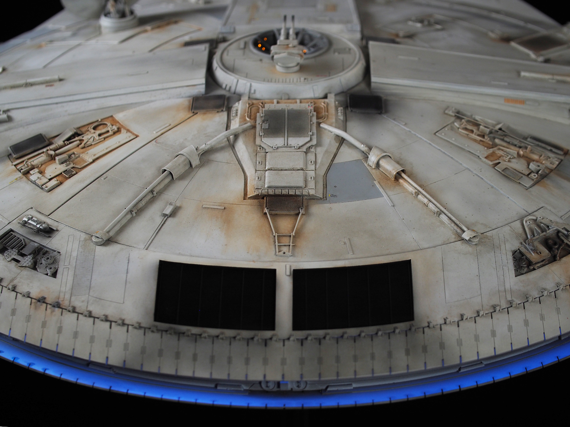 The work of Stinson Lenz was the spark that kicked this project off, as he had designed a McQuarrie Falcon in SketchUp. At that time I did not know any 3D programs, so I purchased the model from him for a very reasonable fee, and enlisted the help of some friends to get things where I needed them to be. John Sabean drew a skeleton and we printed the parts on an FDM printer, Jeff Waclawski and the late Kip Hart converted a few key parts like the cockpit shell and radar dish to STL and grew them on an Objet, Jim Shima solved an electronics requirement to get that even blue engine light the way I wanted, and I (now with Rhino and my own 3D printer at home) grew the remaining parts, laser cut some panels, cut the styrene, clad the saucer, sculpted the figures, and detailed the model as shown. I finished and debuted it at the 2017 Wonderfest in Kentucky. It is my favorite model so far, and I hope you relish it as much as I !
