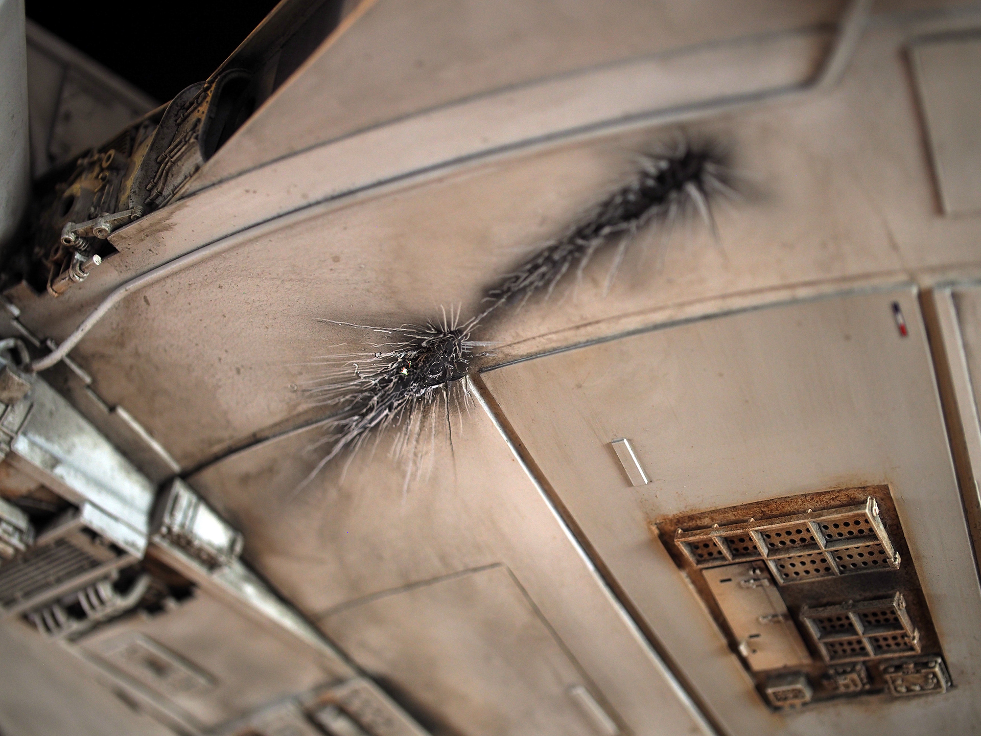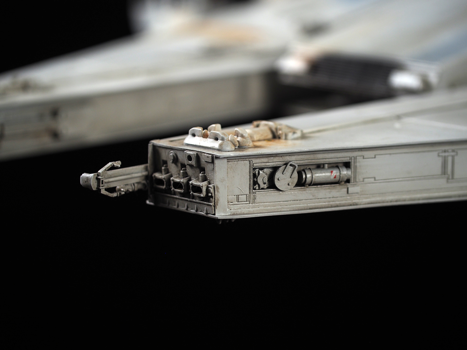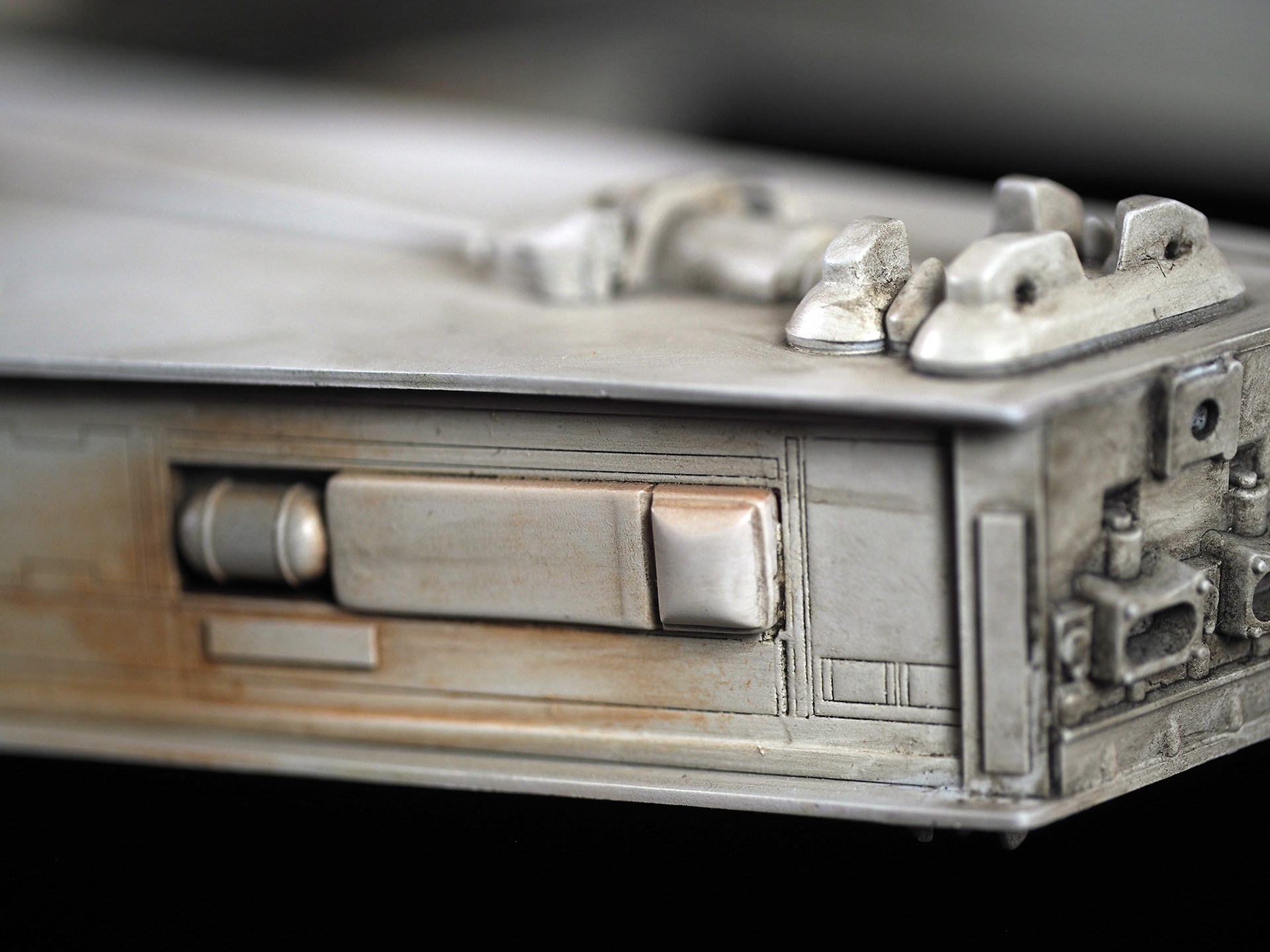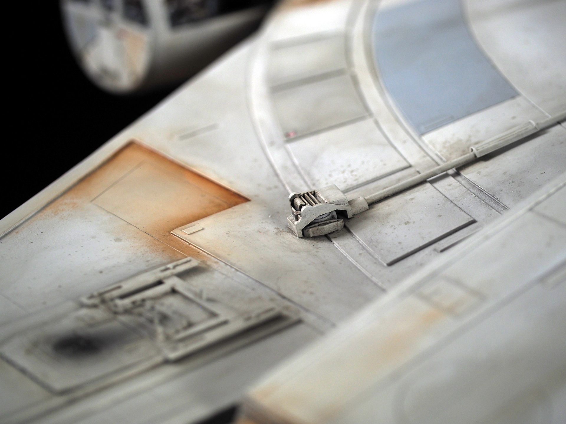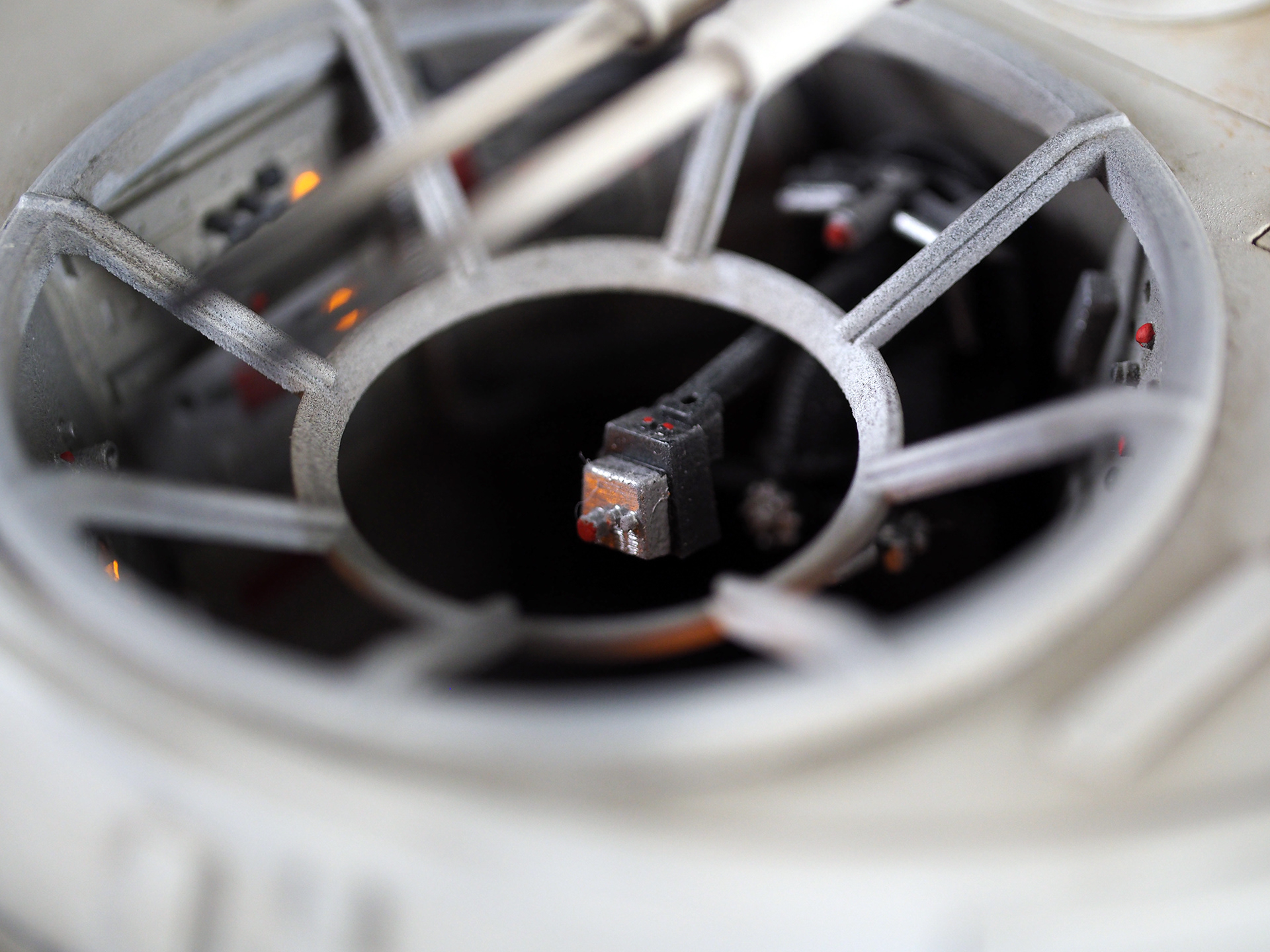 The work of Stinson Lenz was the spark that kicked this project off, as he had designed a McQuarrie Falcon in SketchUp. At that time I did not know any 3D programs, so I purchased the model from him for a very reasonable fee, and enlisted the help of some friends to get things where I needed them to be. John Sabean drew a skeleton and we printed the parts on an FDM printer, Jeff Waclawski and the late Kip Hart converted a few key parts like the cockpit shell and radar dish to STL and grew them on an Objet, Jim Shima solved an electronics requirement to get that even blue engine light the way I wanted, and I (now with Rhino and my own 3D printer at home) grew the remaining parts, laser cut some panels, cut the styrene, clad the saucer, sculpted the figures, and detailed the model as shown. I finished and debuted it at the 2017 Wonderfest in Kentucky. It is my favorite model so far, and I hope you relish it as much as I !