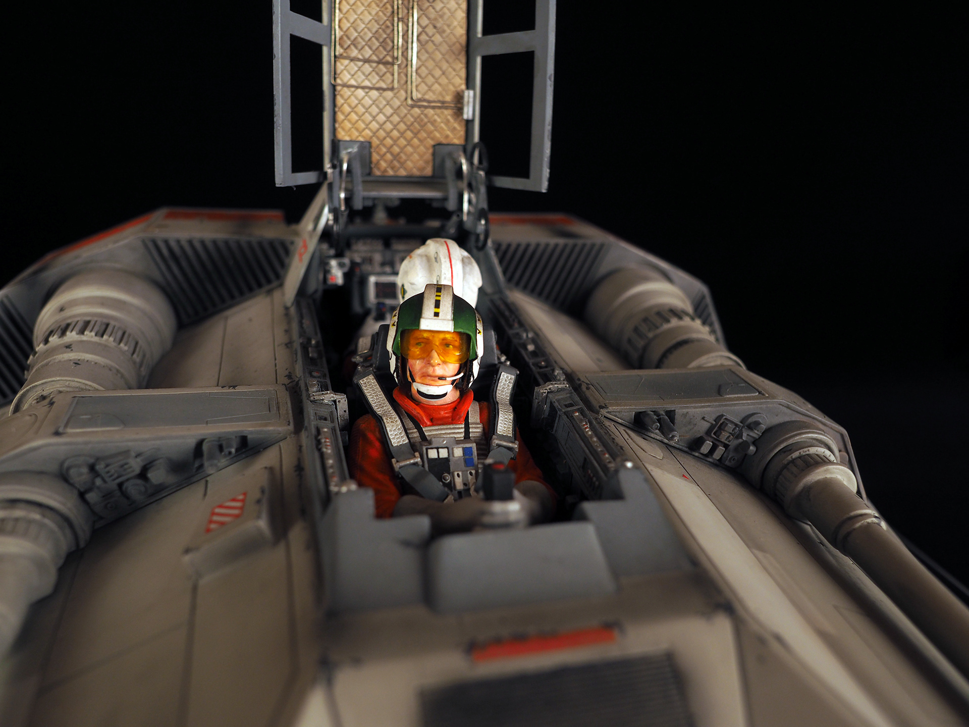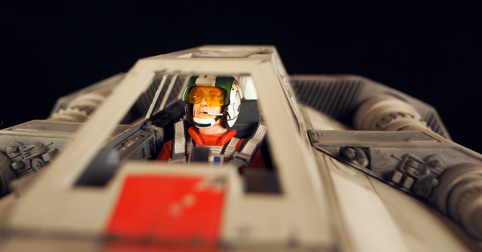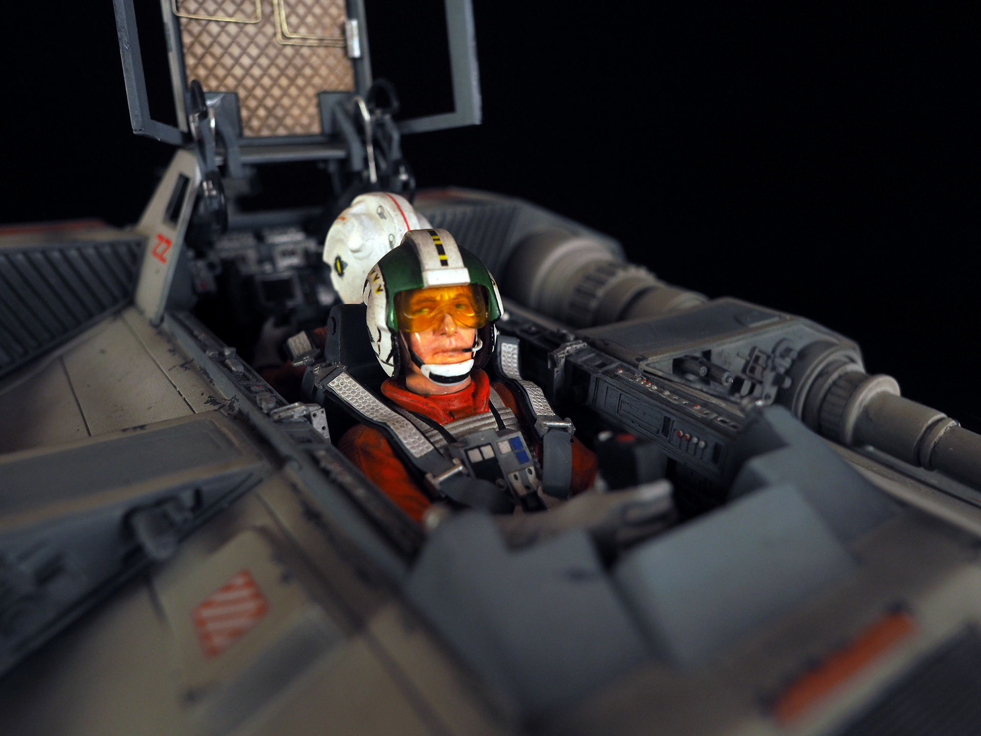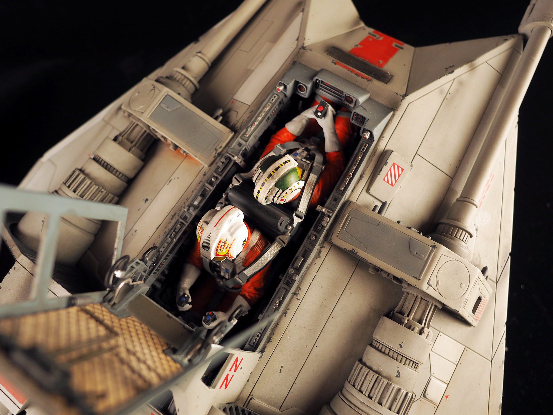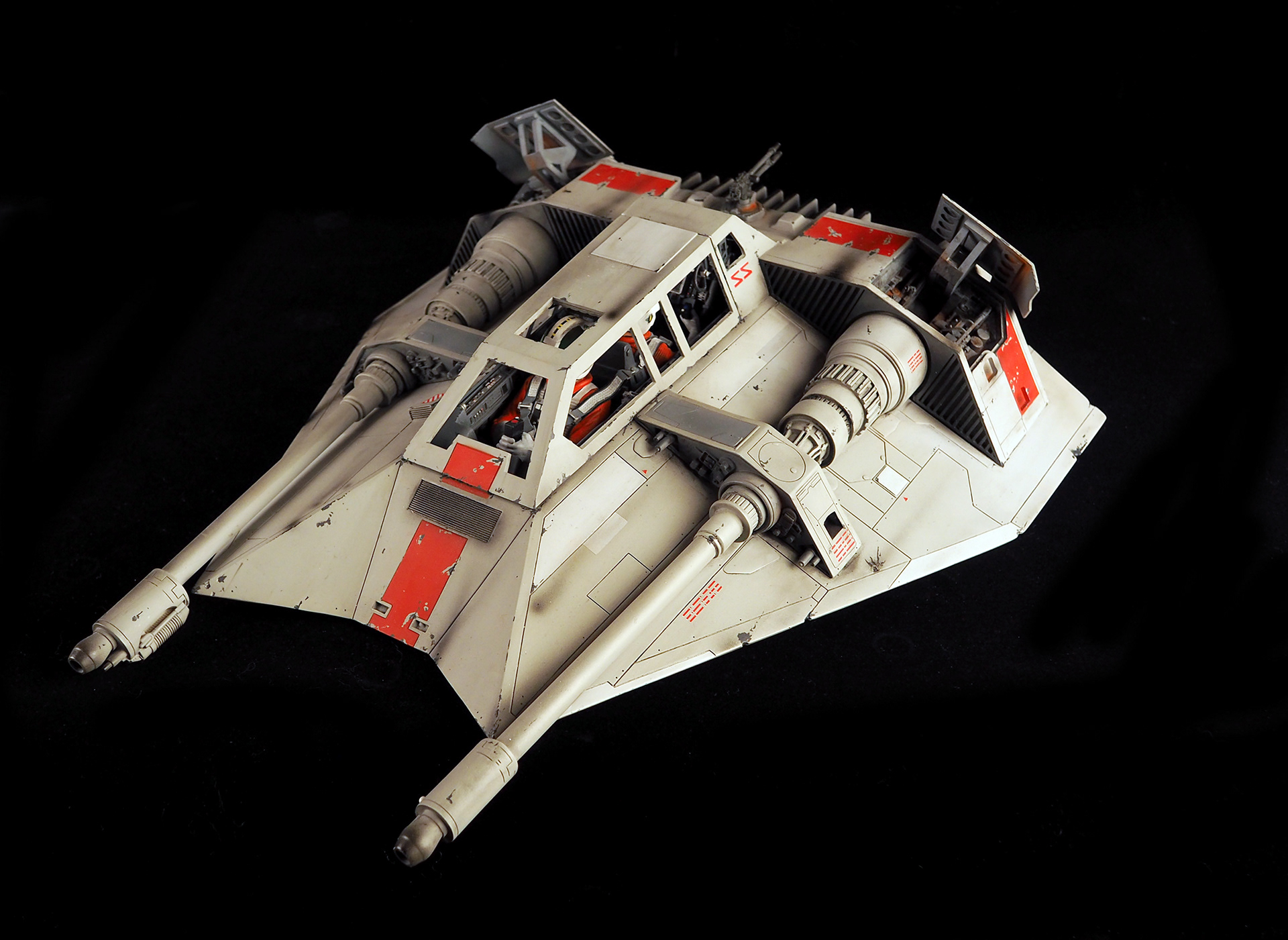 This is a Master Replicas Snowspeeder, which was up-detailed and completely repainted. The replica dates back to 2005 or so, and was one of the projects I generated paint masters for, when I was a contractor with Master Replicas. It was a great thing to come full circle with the improved tools and skills i have now, but how quickly one can forget how challenging it is to work with polystone, a very heay and brittle material. The engine boxes were replaced to make way for “air brakes” and their inner bays, and the cockpit was gutted, with two figures added. Various other details were also upgraded and replaced, like the harpoon gun. The body sculpts and Wedge Antilles head sculpt were commissioned by a talented Z-Brush artist, and once again my friend Chris’ head makes an appearance as the harpoon gunner. Fun touches include the quilted canopy headliner, the hoses and wires that echo the 1:1 filming set, and the faux bubble wrap featured on the harnesses!