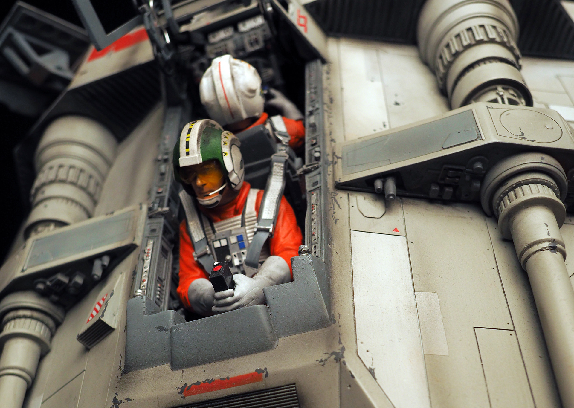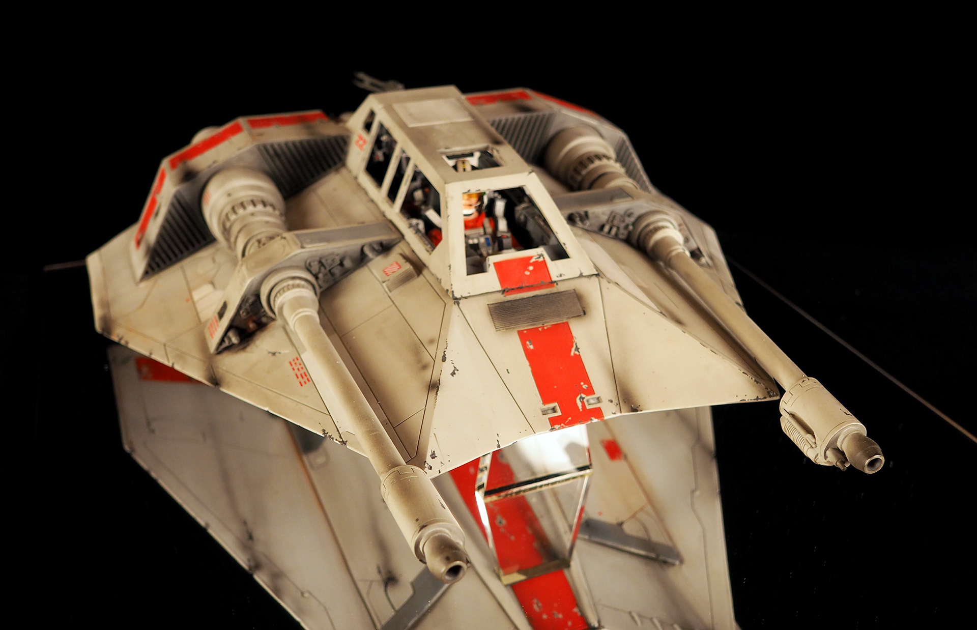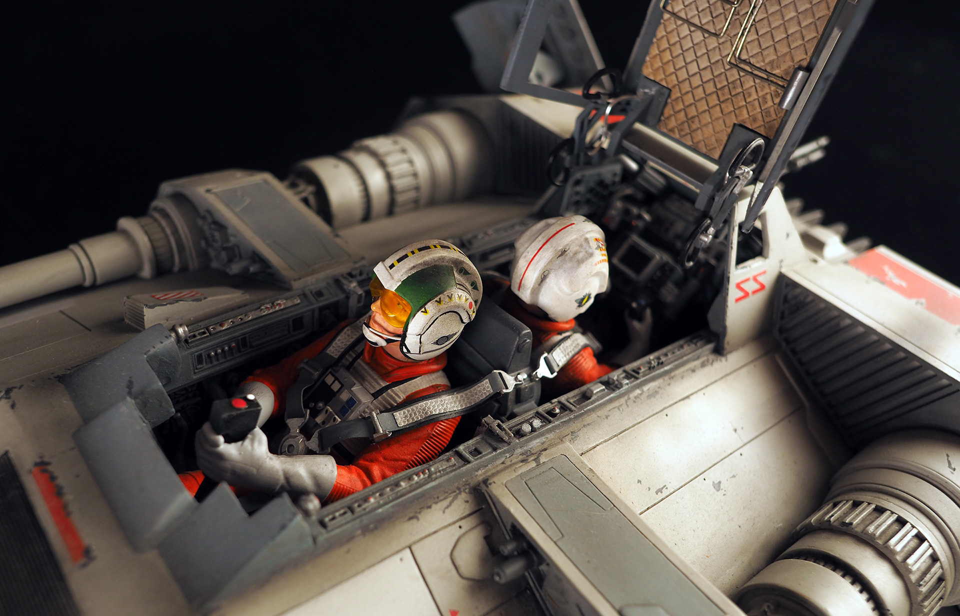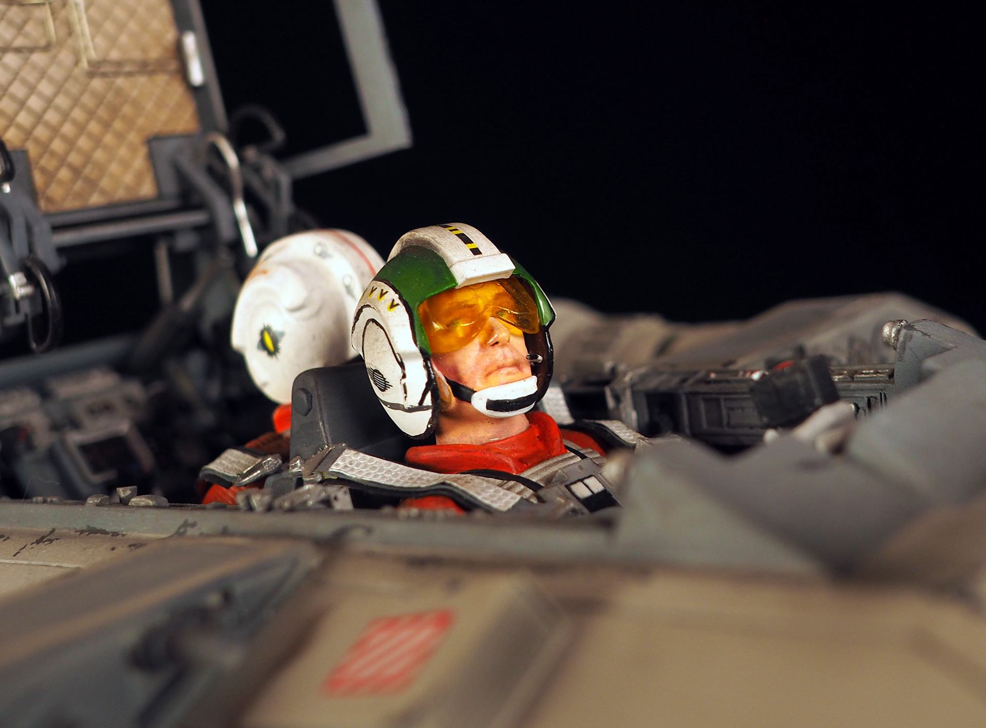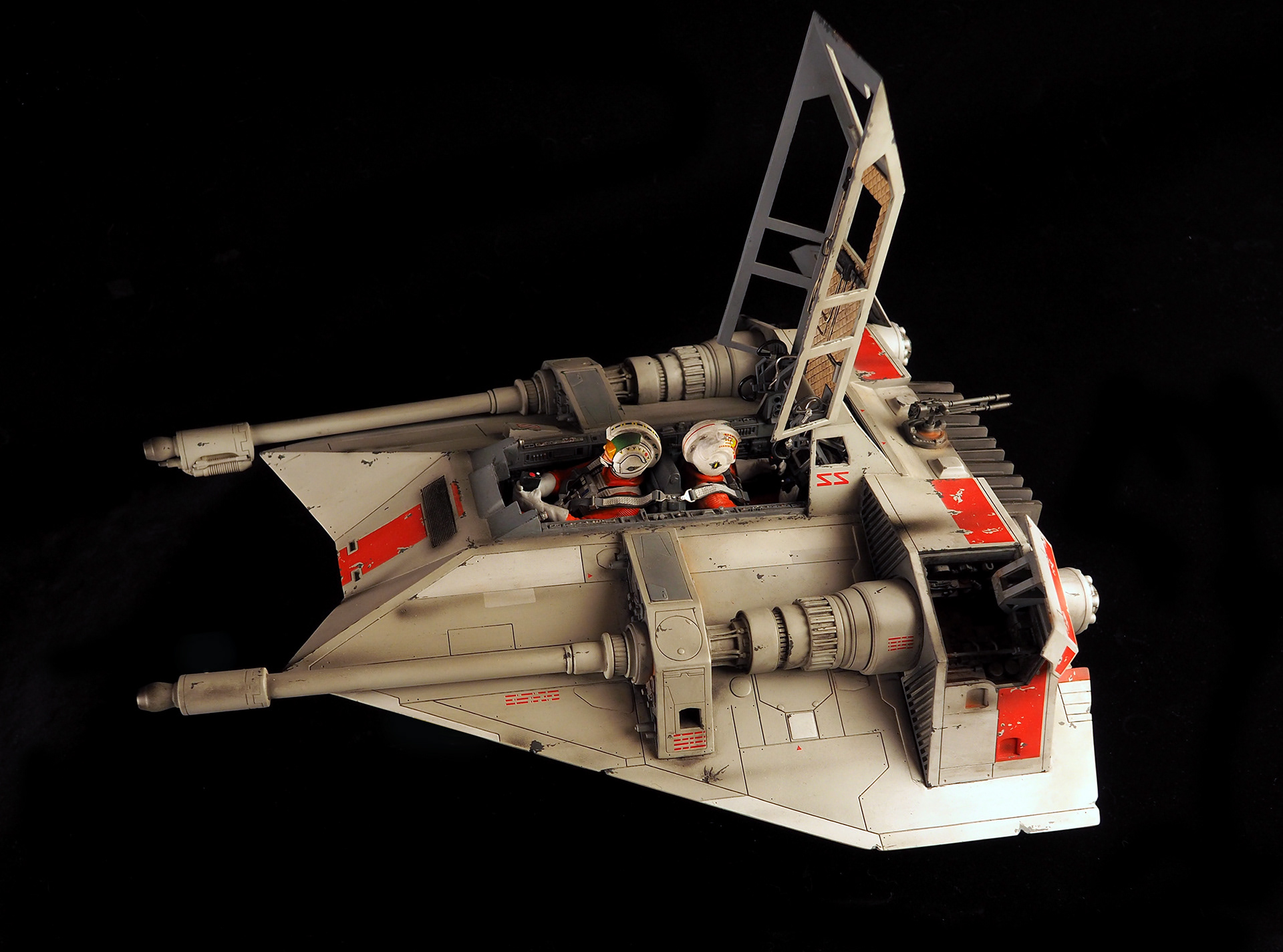 This is a Master Replicas Snowspeeder, which was up-detailed and completely repainted. The replica dates back to 2005 or so, and was one of the projects I generated paint masters for, when I was a contractor with Master Replicas. It was a great thing to come full circle with the improved tools and skills i have now, but how quickly one can forget how challenging it is to work with polystone, a very heay and brittle material. The engine boxes were replaced to make way for “air brakes” and their inner bays, and the cockpit was gutted, with two figures added. Various other details were also upgraded and replaced, like the harpoon gun. The body sculpts and Wedge Antilles head sculpt were commissioned by a talented Z-Brush artist, and once again my friend Chris’ head makes an appearance as the harpoon gunner. Fun touches include the quilted canopy headliner, the hoses and wires that echo the 1:1 filming set, and the faux bubble wrap featured on the harnesses!