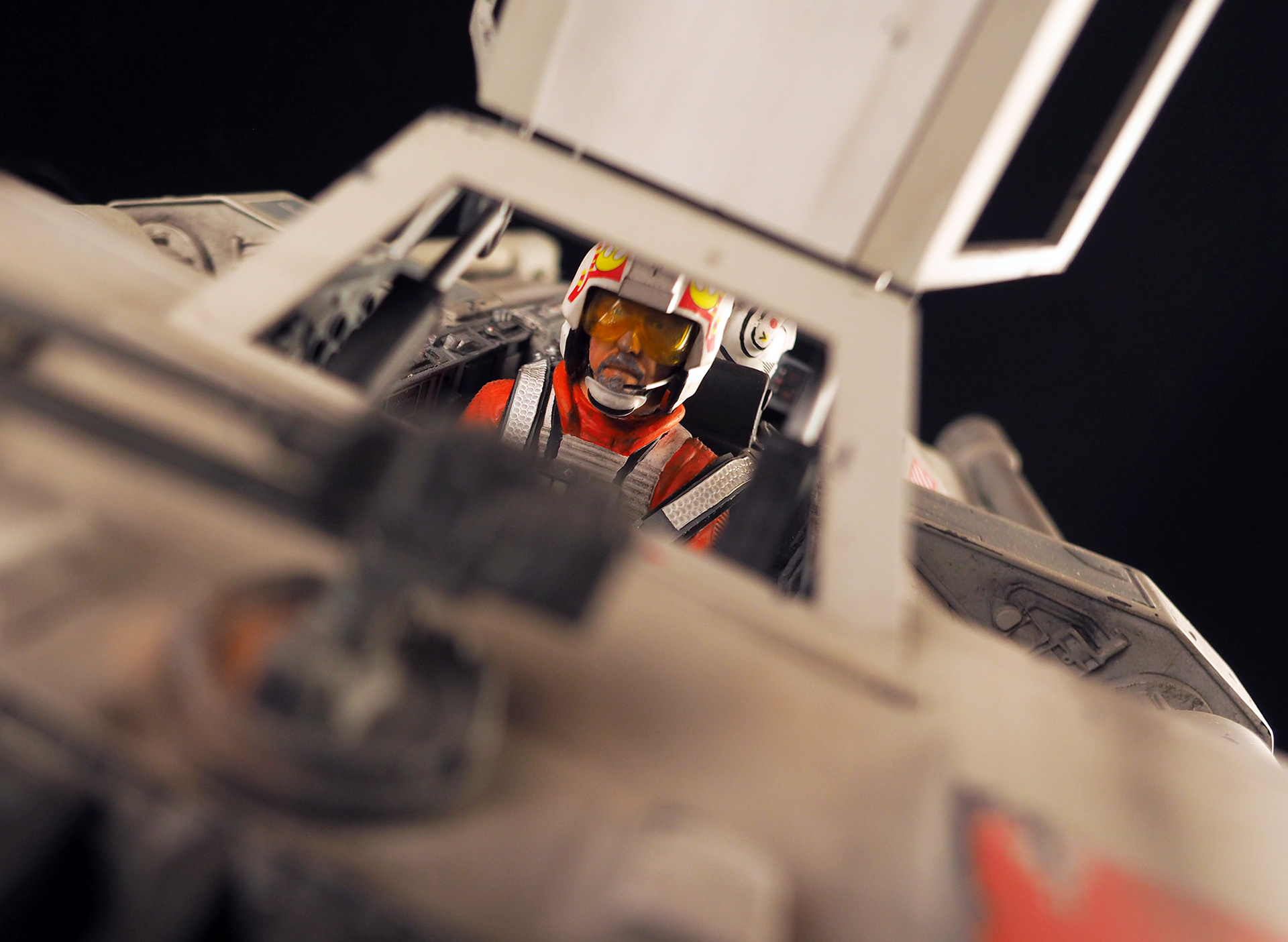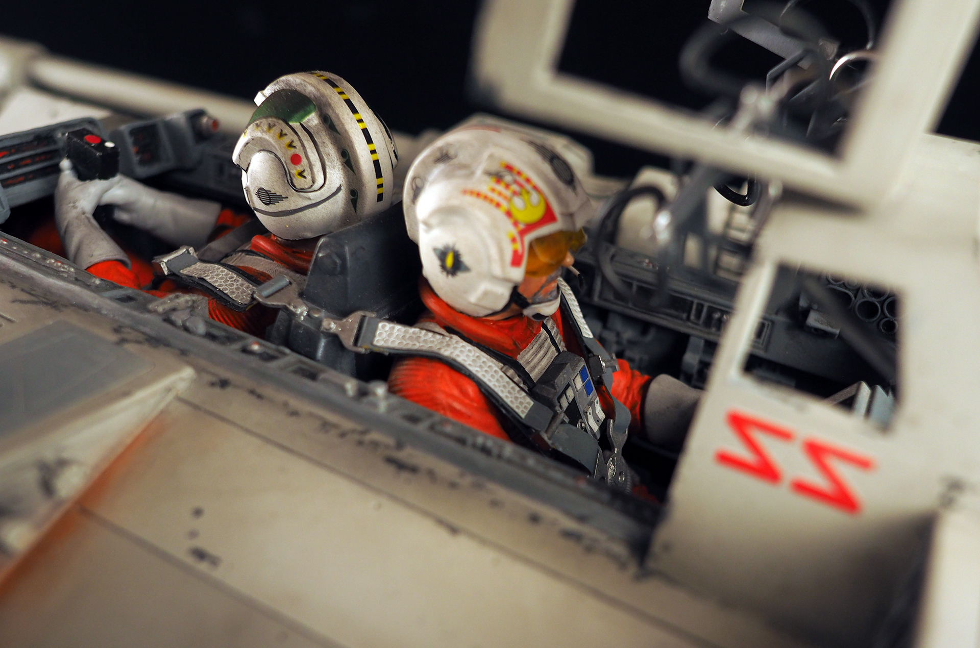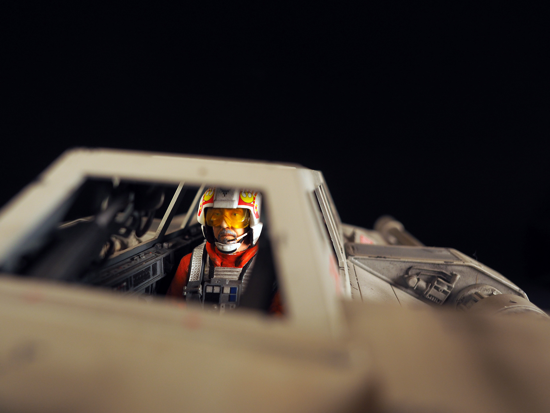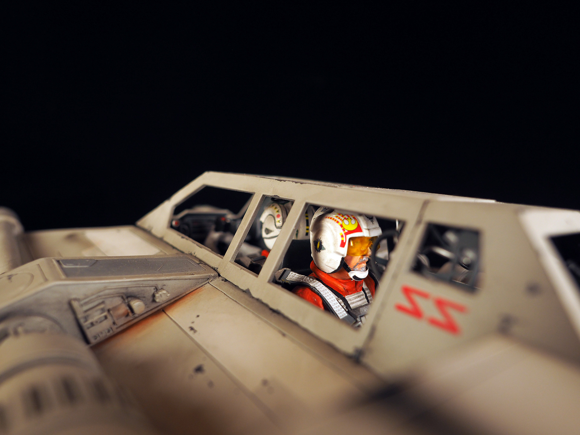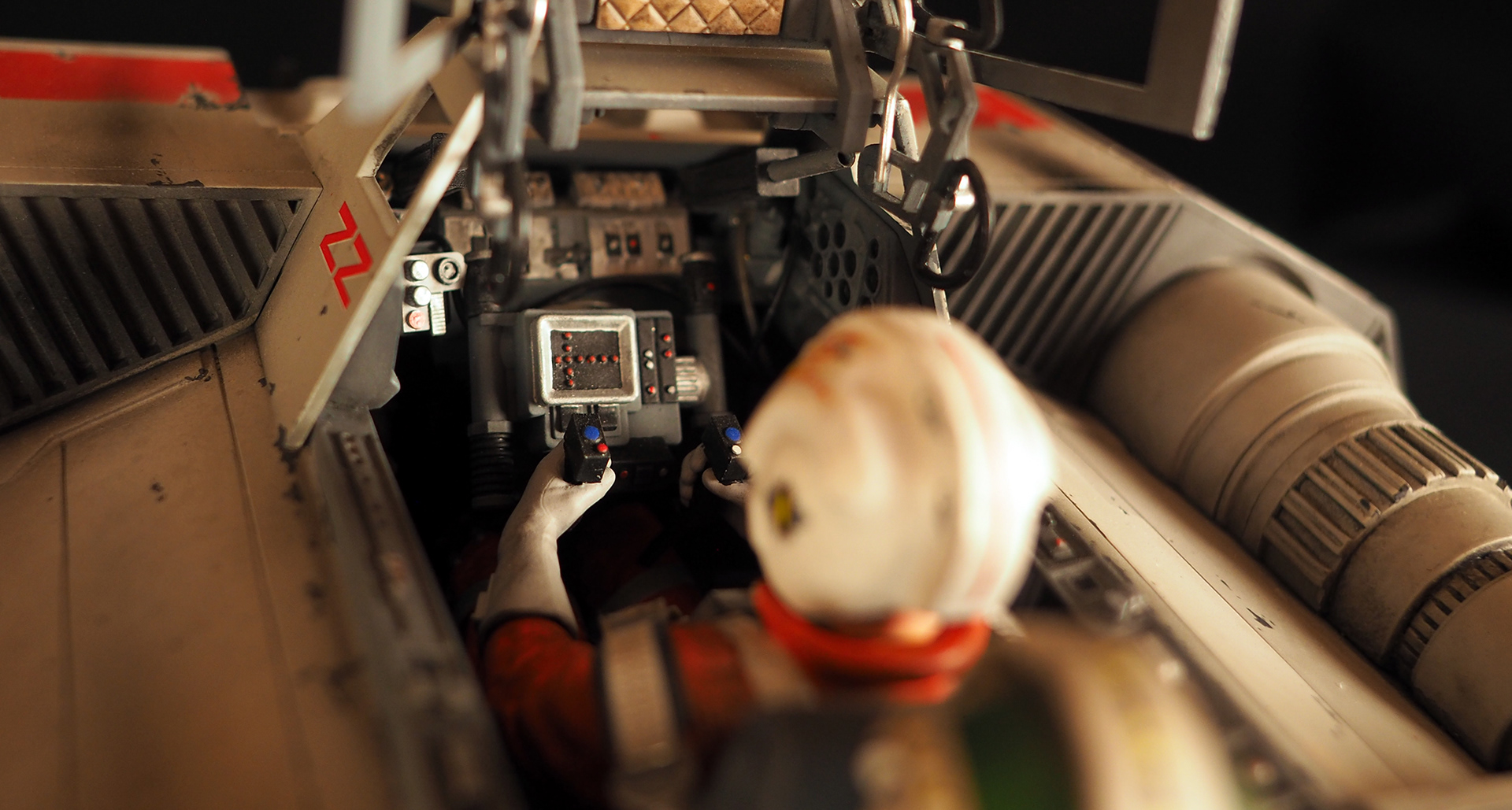 This is a Master Replicas Snowspeeder, which was up-detailed and completely repainted. The replica dates back to 2005 or so, and was one of the projects I generated paint masters for, when I was a contractor with Master Replicas. It was a great thing to come full circle with the improved tools and skills i have now, but how quickly one can forget how challenging it is to work with polystone, a very heay and brittle material. The engine boxes were replaced to make way for “air brakes” and their inner bays, and the cockpit was gutted, with two figures added. Various other details were also upgraded and replaced, like the harpoon gun. The body sculpts and Wedge Antilles head sculpt were commissioned by a talented Z-Brush artist, and once again my friend Chris’ head makes an appearance as the harpoon gunner. Fun touches include the quilted canopy headliner, the hoses and wires that echo the 1:1 filming set, and the faux bubble wrap featured on the harnesses!