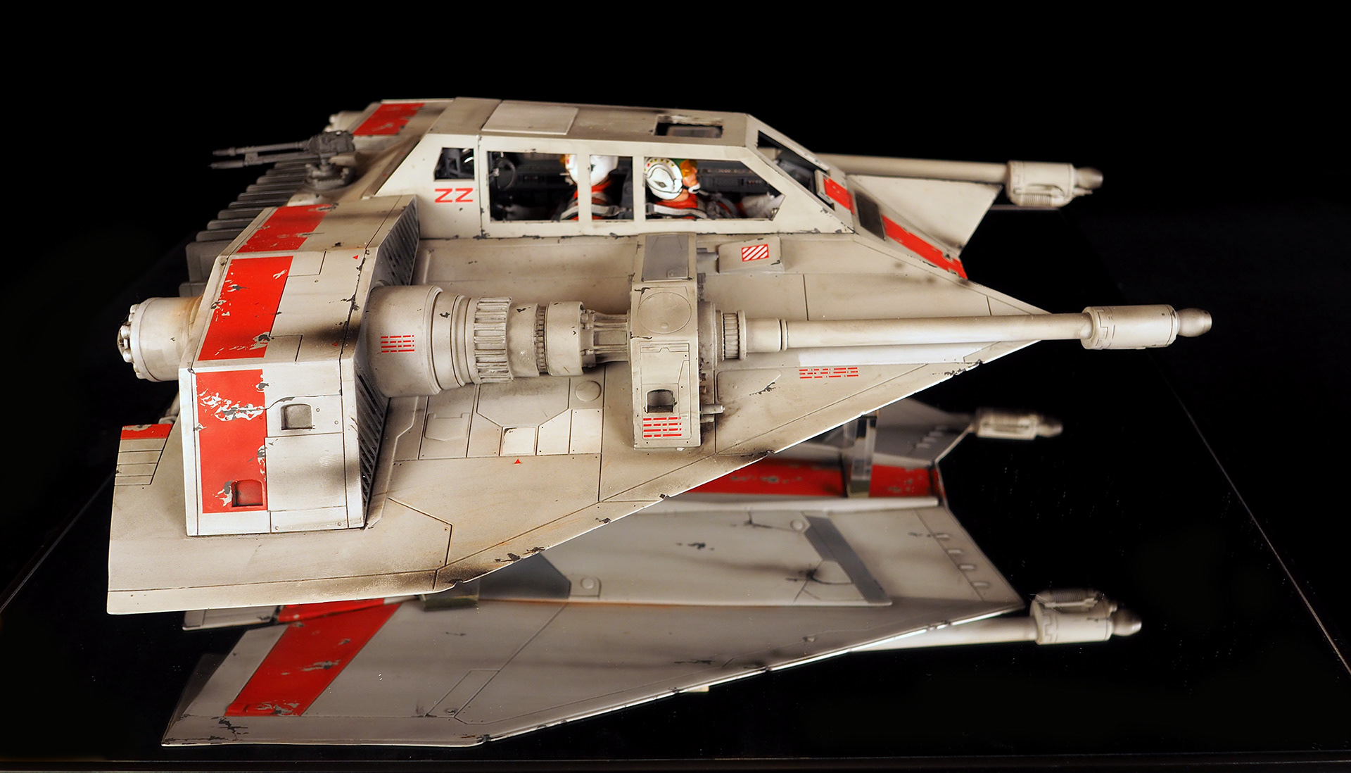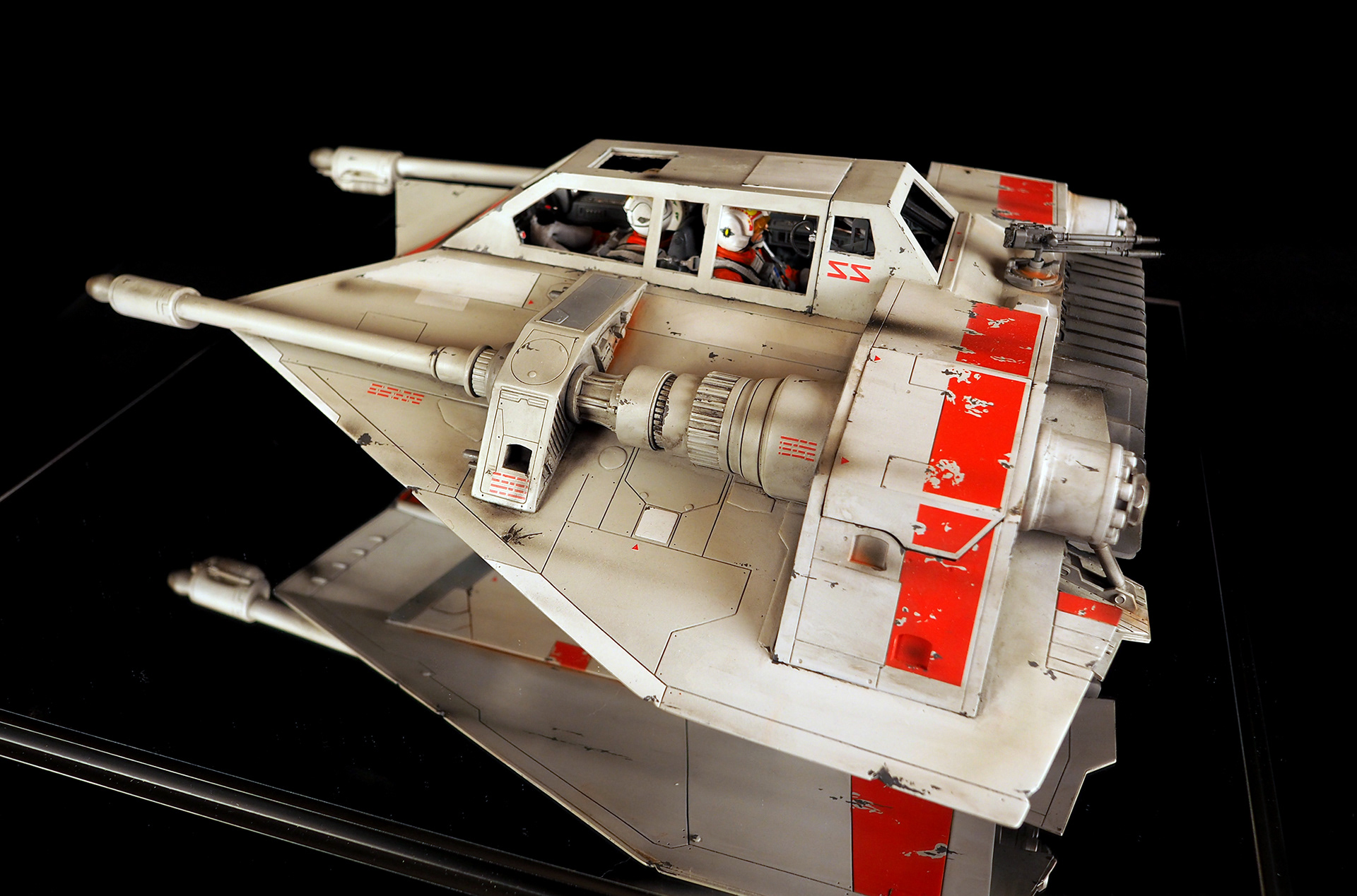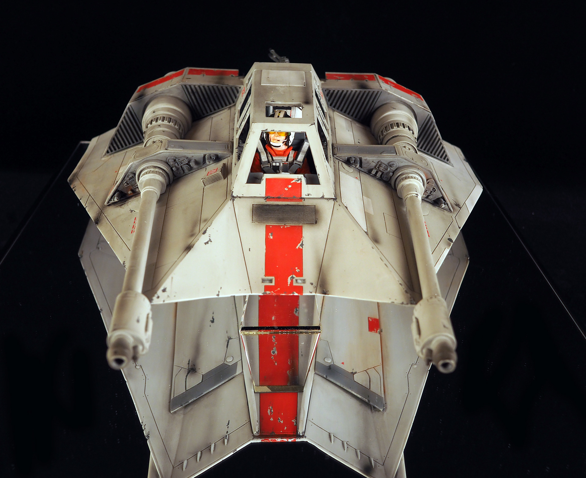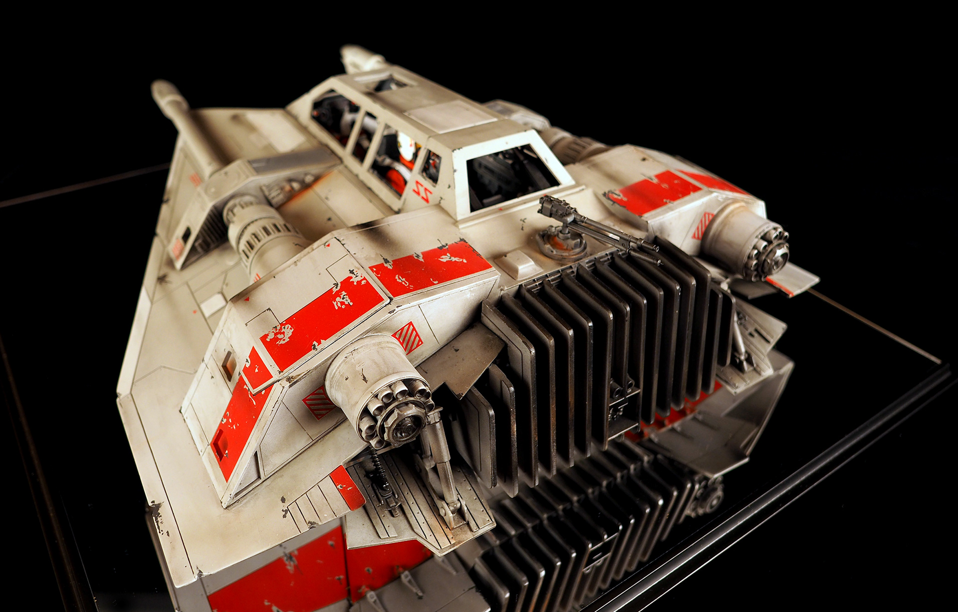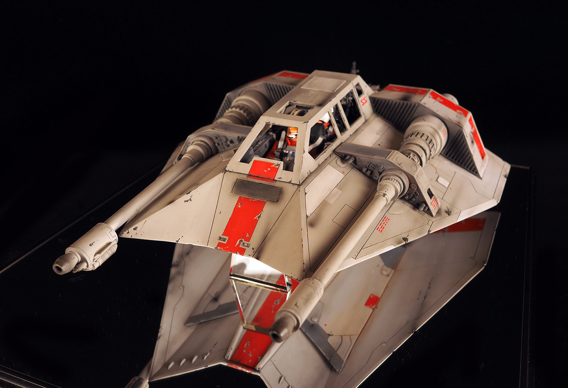 This is a Master Replicas Snowspeeder, which was up-detailed and completely repainted. The replica dates back to 2005 or so, and was one of the projects I generated paint masters for, when I was a contractor with Master Replicas. It was a great thing to come full circle with the improved tools and skills i have now, but how quickly one can forget how challenging it is to work with polystone, a very heay and brittle material. The engine boxes were replaced to make way for “air brakes” and their inner bays, and the cockpit was gutted, with two figures added. Various other details were also upgraded and replaced, like the harpoon gun. The body sculpts and Wedge Antilles head sculpt were commissioned by a talented Z-Brush artist, and once again my friend Chris’ head makes an appearance as the harpoon gunner. Fun touches include the quilted canopy headliner, the hoses and wires that echo the 1:1 filming set, and the faux bubble wrap featured on the harnesses!