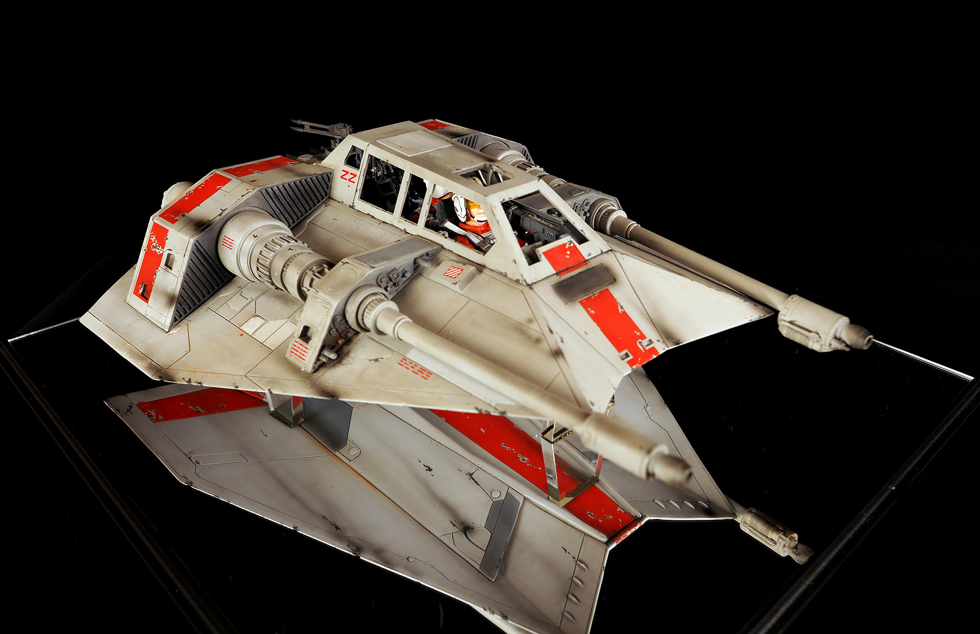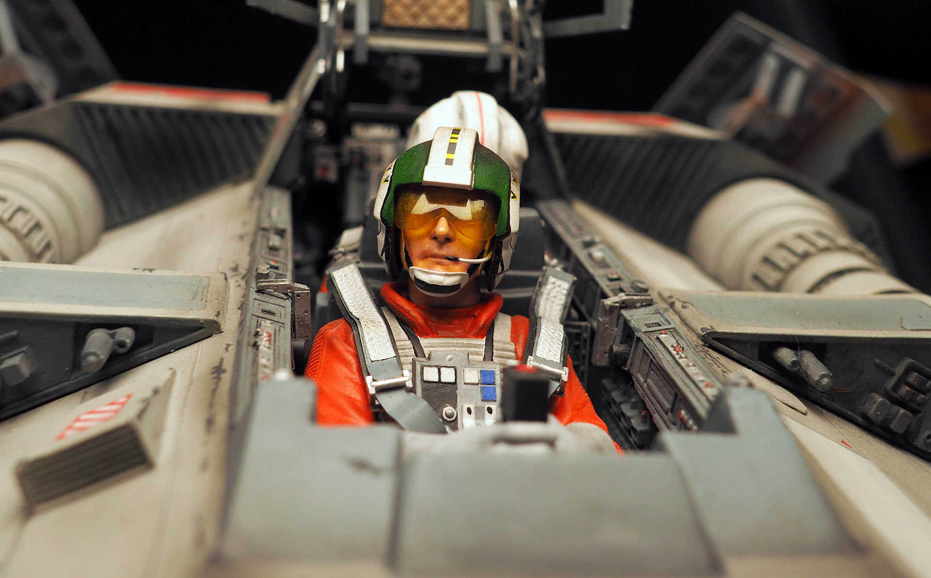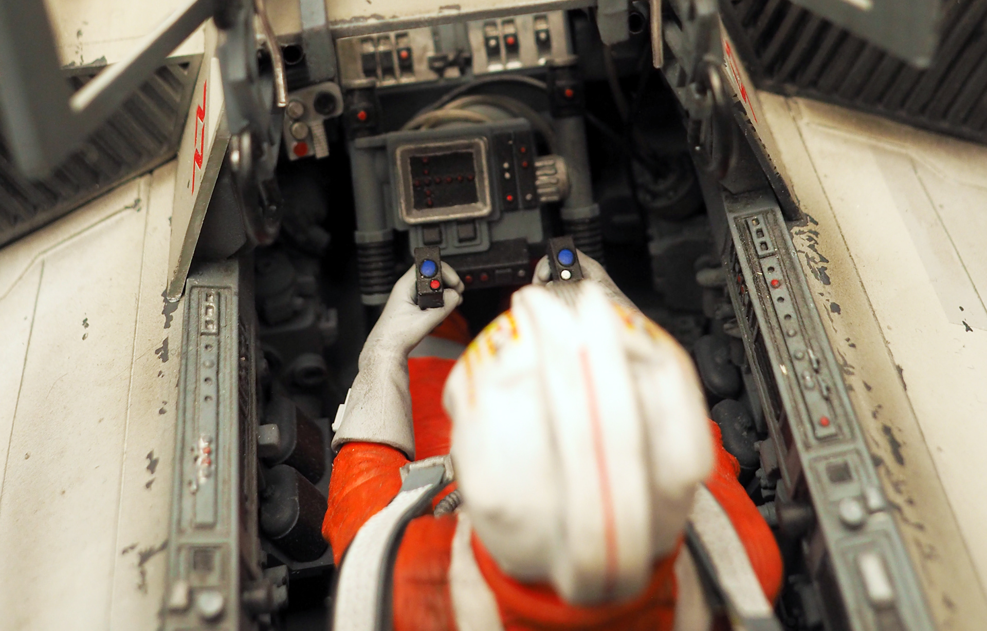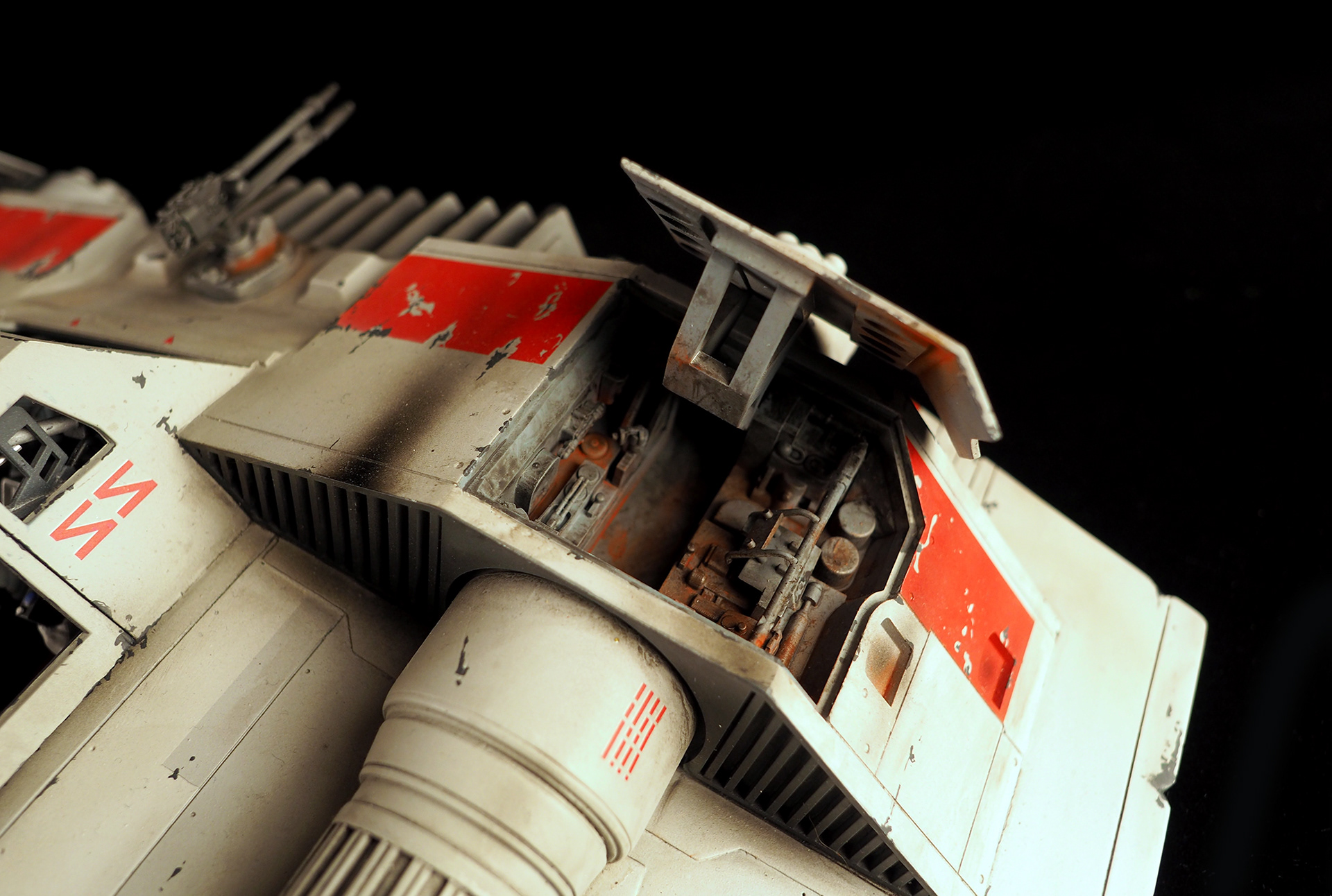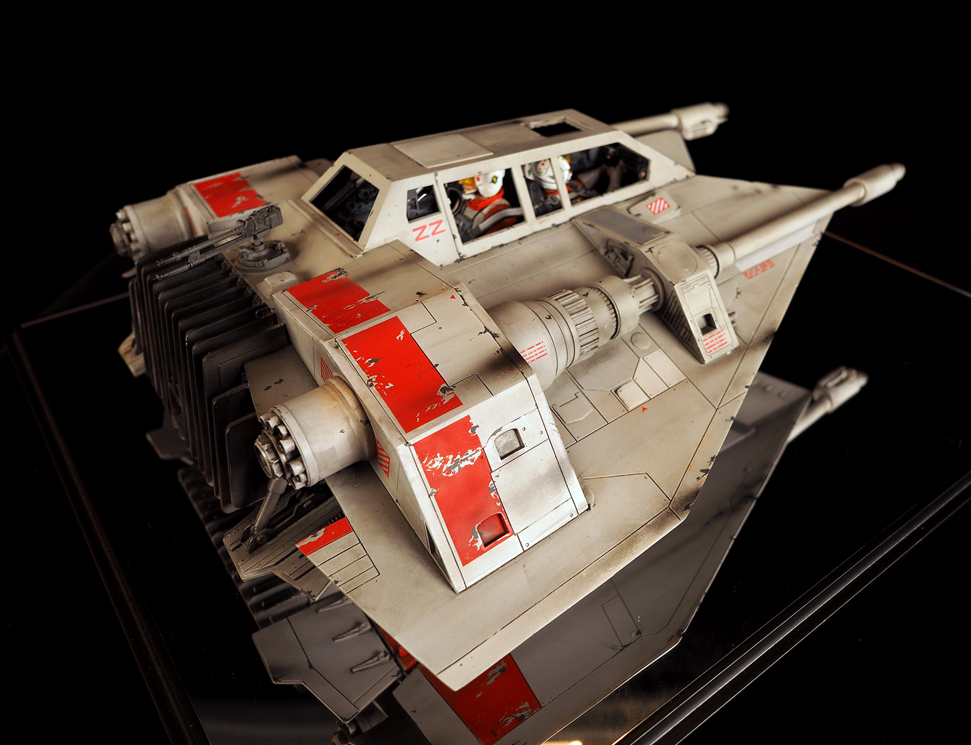This is a Master Replicas Snowspeeder, which was up-detailed and completely repainted. The replica dates back to 2005 or so, and was one of the projects I generated paint masters for, when I was a contractor with Master Replicas. It was a great thing to come full circle with the improved tools and skills i have now, but how quickly one can forget how challenging it is to work with polystone, a very heay and brittle material. The engine boxes were replaced to make way for “air brakes” and their inner bays, and the cockpit was gutted, with two figures added. Various other details were also upgraded and replaced, like the harpoon gun. The body sculpts and Wedge Antilles head sculpt were commissioned by a talented Z-Brush artist, and once again my friend Chris’ head makes an appearance as the harpoon gunner. Fun touches include the quilted canopy headliner, the hoses and wires that echo the 1:1 filming set, and the faux bubble wrap featured on the harnesses!