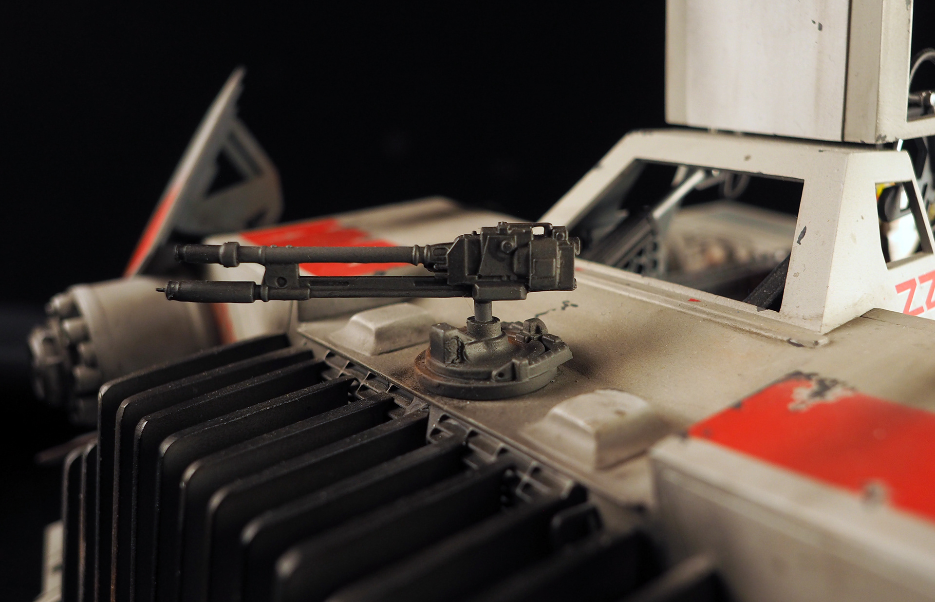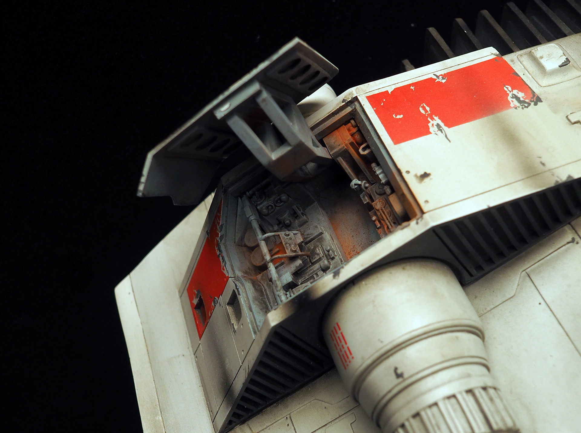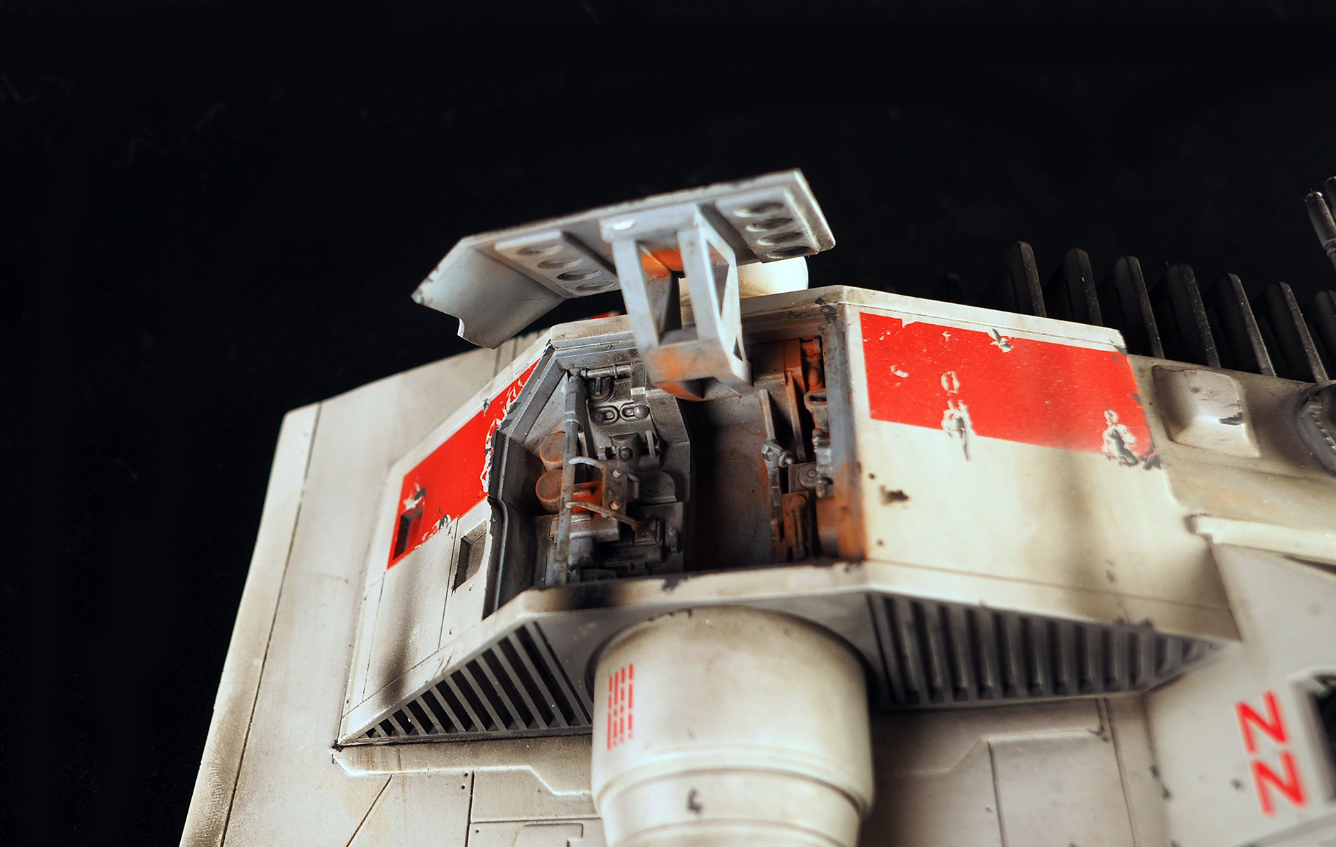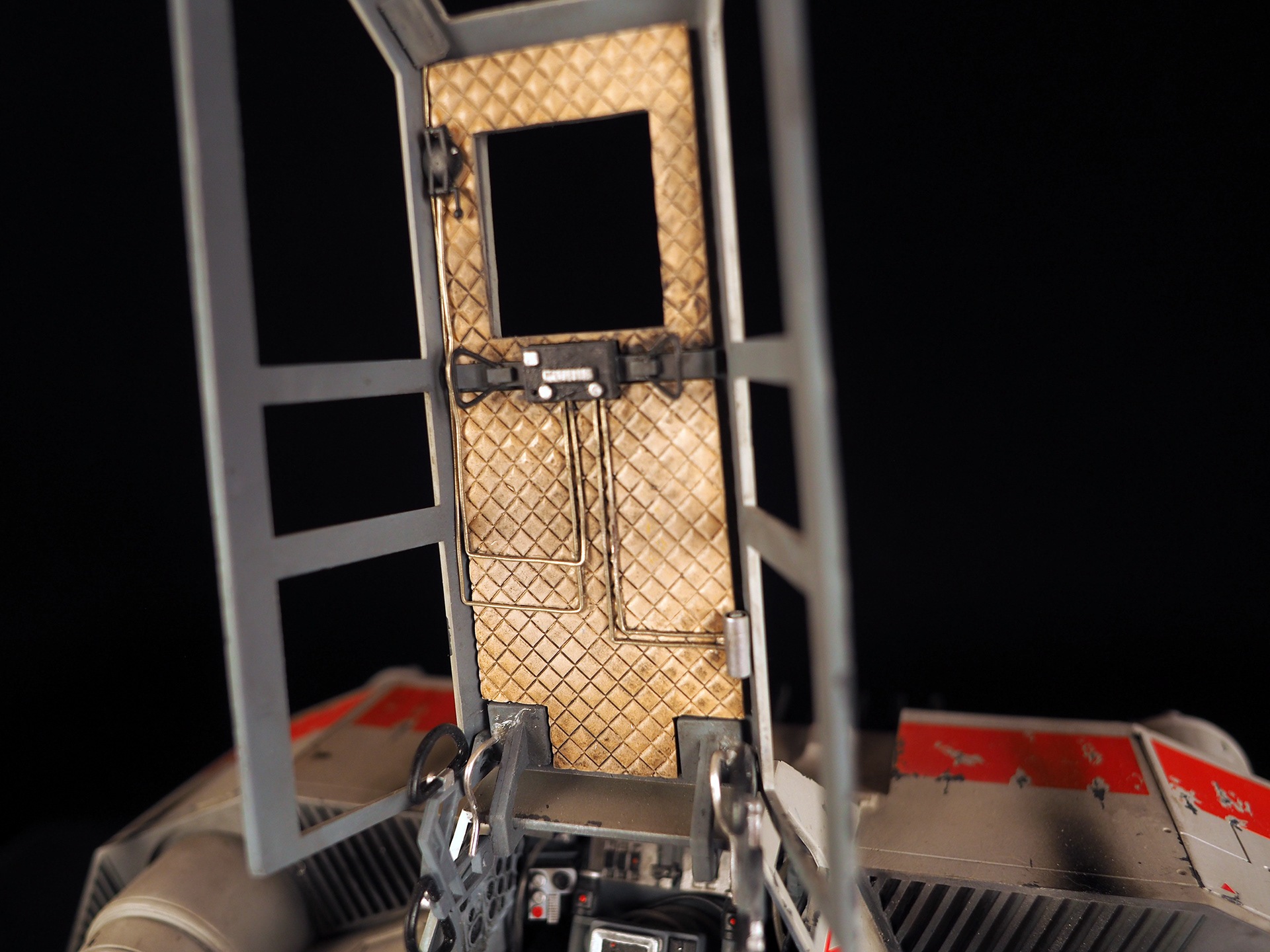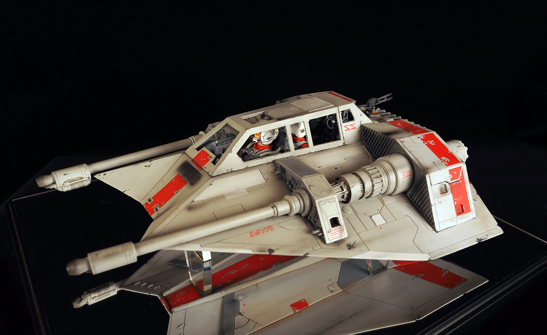 This is a Master Replicas Snowspeeder, which was up-detailed and completely repainted. The replica dates back to 2005 or so, and was one of the projects I generated paint masters for, when I was a contractor with Master Replicas. It was a great thing to come full circle with the improved tools and skills i have now, but how quickly one can forget how challenging it is to work with polystone, a very heay and brittle material. The engine boxes were replaced to make way for “air brakes” and their inner bays, and the cockpit was gutted, with two figures added. Various other details were also upgraded and replaced, like the harpoon gun. The body sculpts and Wedge Antilles head sculpt were commissioned by a talented Z-Brush artist, and once again my friend Chris’ head makes an appearance as the harpoon gunner. Fun touches include the quilted canopy headliner, the hoses and wires that echo the 1:1 filming set, and the faux bubble wrap featured on the harnesses!
