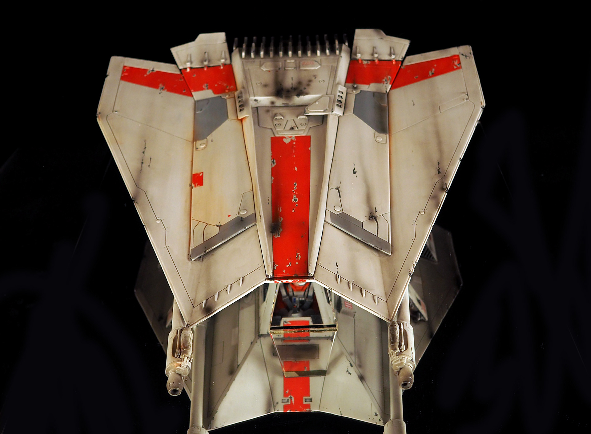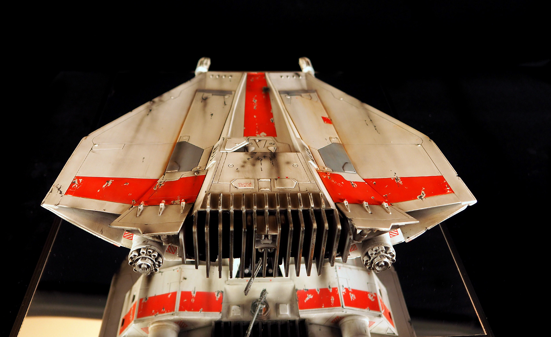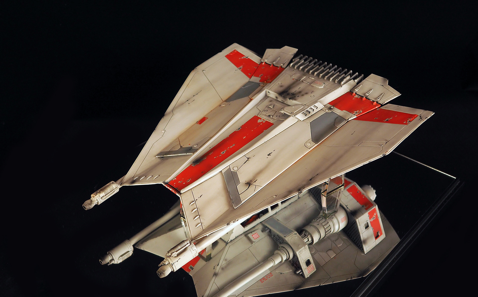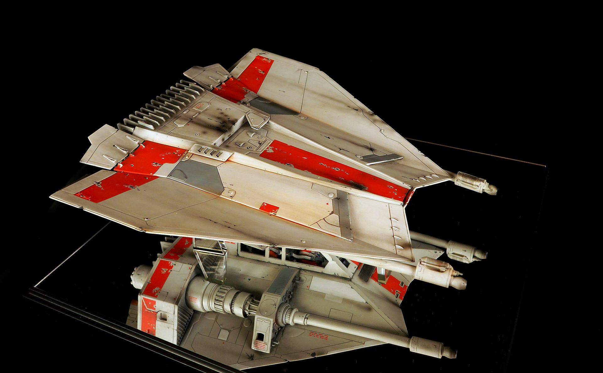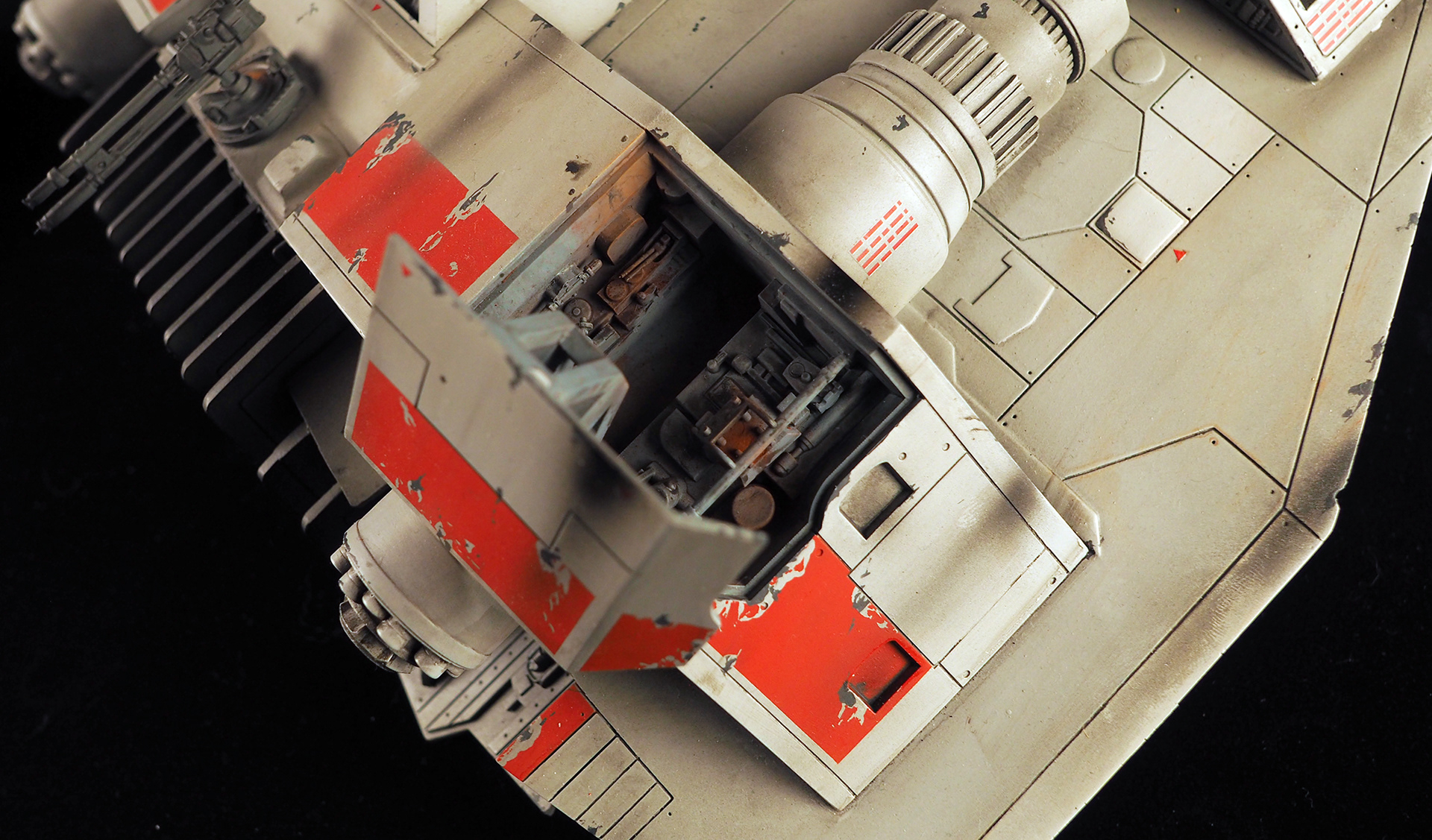 This is a Master Replicas Snowspeeder, which was up-detailed and completely repainted. The replica dates back to 2005 or so, and was one of the projects I generated paint masters for, when I was a contractor with Master Replicas. It was a great thing to come full circle with the improved tools and skills i have now, but how quickly one can forget how challenging it is to work with polystone, a very heay and brittle material. The engine boxes were replaced to make way for “air brakes” and their inner bays, and the cockpit was gutted, with two figures added. Various other details were also upgraded and replaced, like the harpoon gun. The body sculpts and Wedge Antilles head sculpt were commissioned by a talented Z-Brush artist, and once again my friend Chris’ head makes an appearance as the harpoon gunner. Fun touches include the quilted canopy headliner, the hoses and wires that echo the 1:1 filming set, and the faux bubble wrap featured on the harnesses!