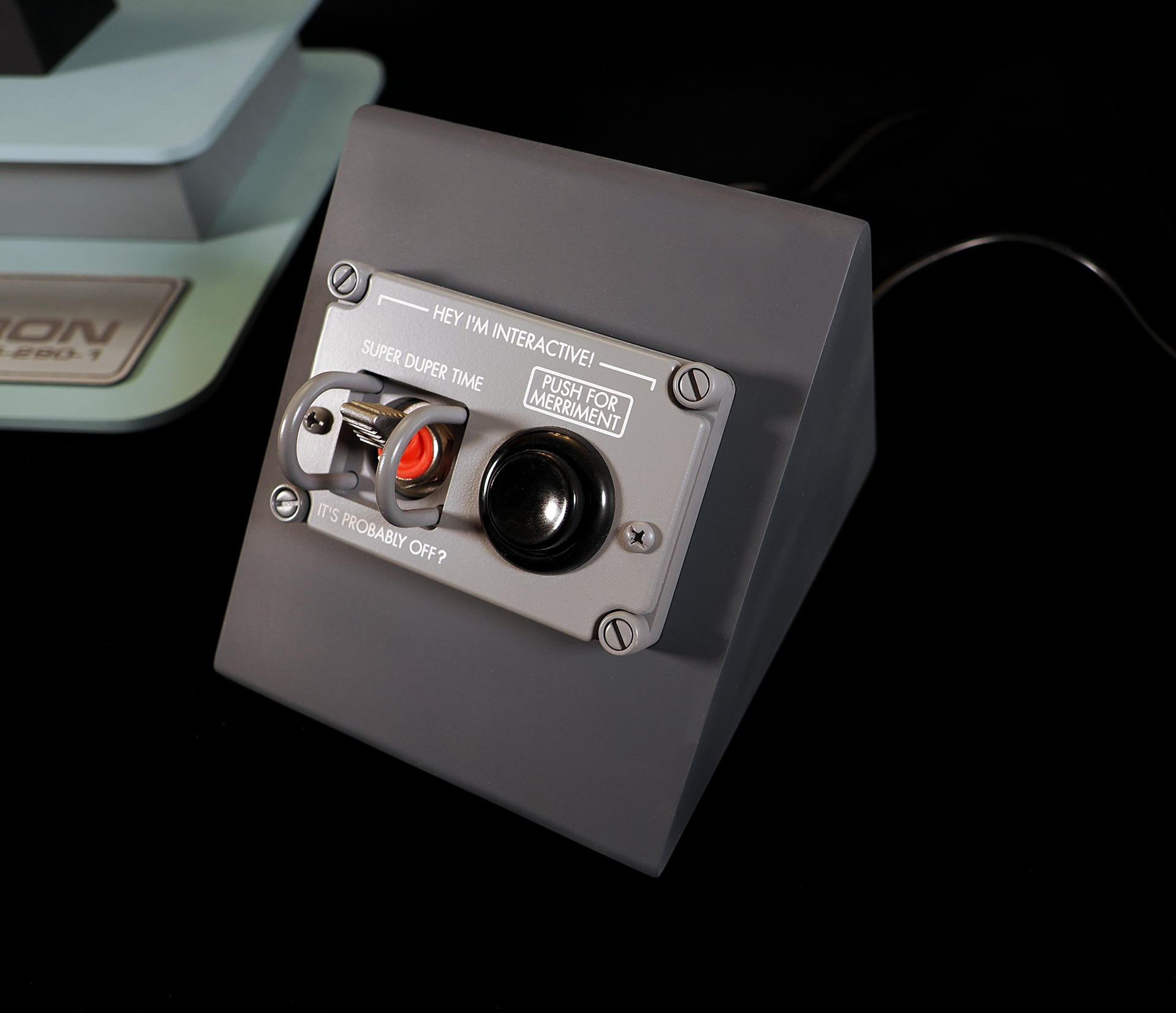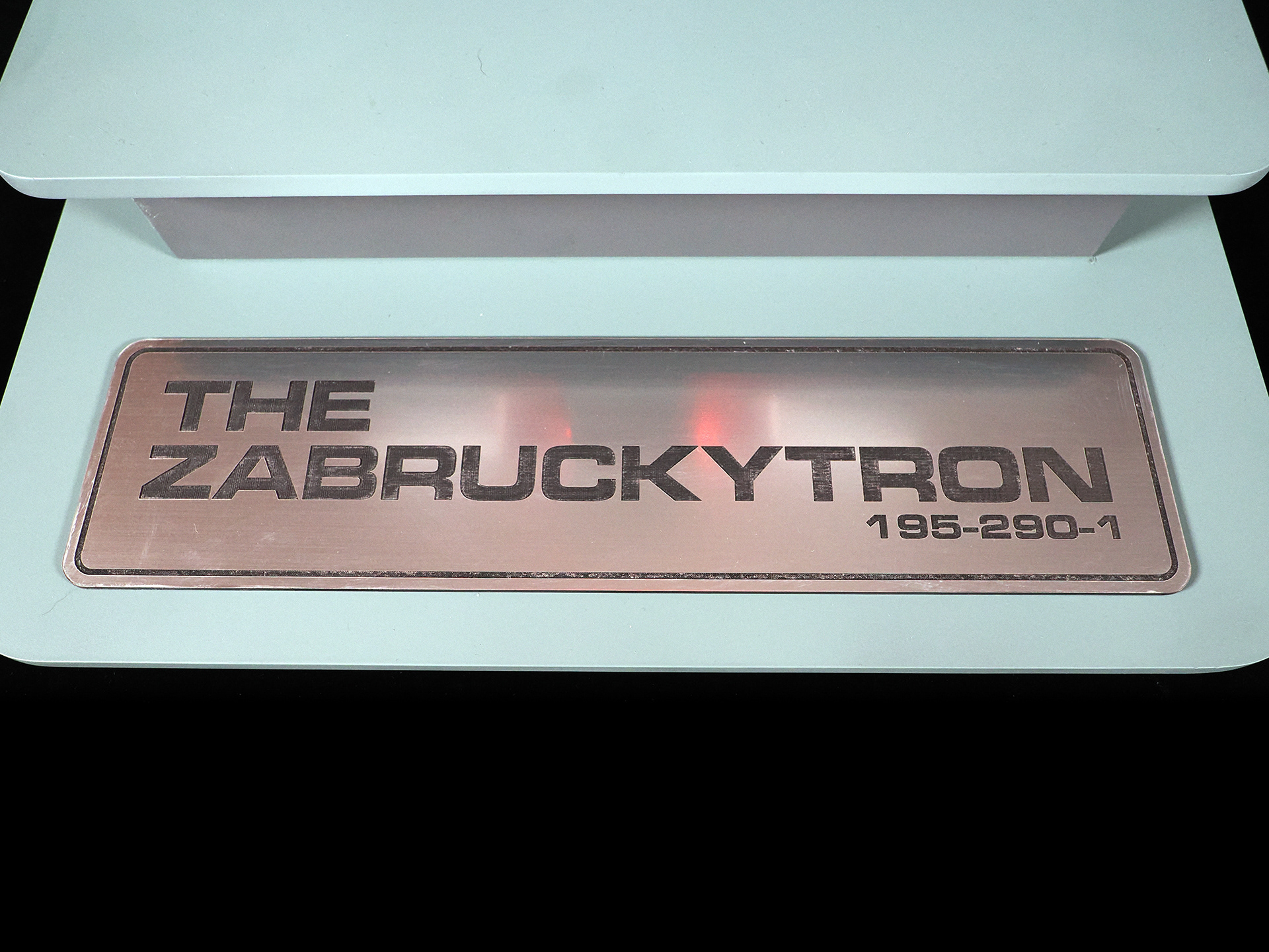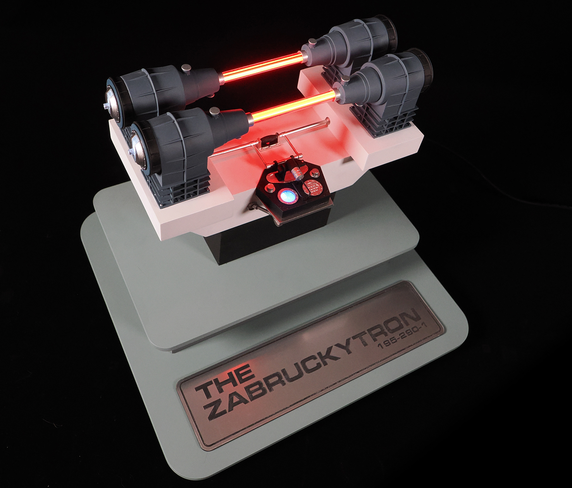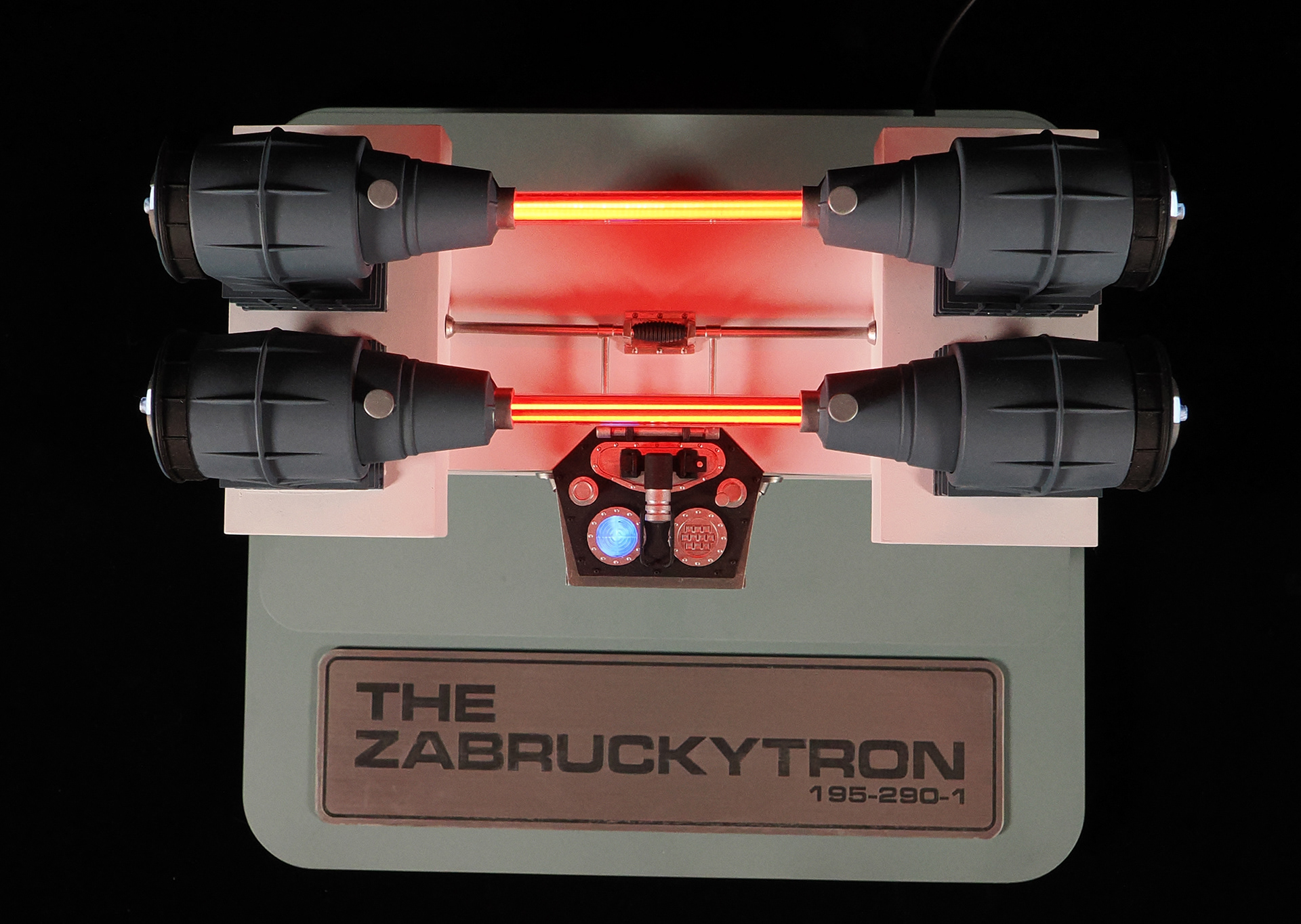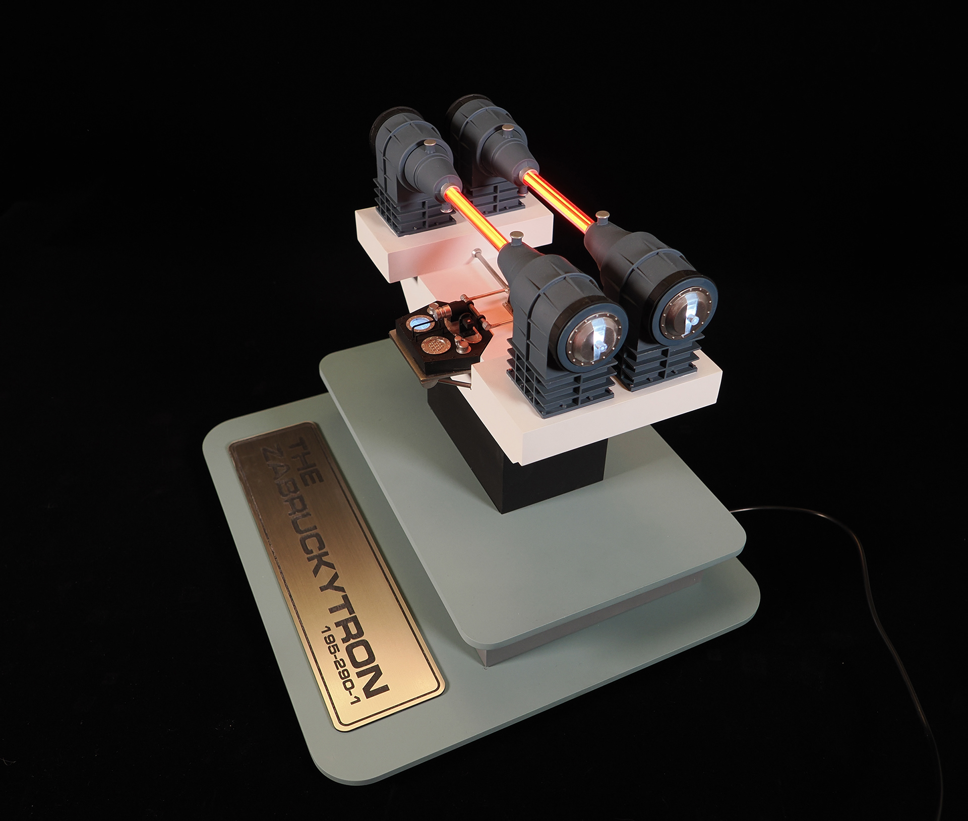 This is a model of the Modern Props #195-290-1 prop built by the company's owner, John Zabrucky. So I decided to call it The Zabruckytron, just to be slightly distinctive from what every one on the internet calls it. It is often referred to as The Most Important Device In The Universe or The Most Important Machine In The Universe because it was rented out to so many TV shows and Movies. Seen frequently in many Star Trek eipsodes across multiple series, Airplane II, Austin Powers, Buck Rogers, V, The Last Starfighter, Knight Rider, and many more. Randy from VoodooFX made a stellar analog-ish light rig from solenoids, randomly clicking on and off, to fire the eight LED filament style lights in the clear tubing. I feel the quirky electronics solution is a perfect match to such a kitschy subject matter. For the debut at Wonderfest 2024, I added a separate module that the viewer can use to activate the model's lights. I didn't want the constant clicking that would drive people insane stationed at nearby tables. For that simple touchable-by-the-public switch, I purchased a "rack module" from Concord Aerospace that you can customize. That was mounted into a triangular box I made from some laser cut acrylic. It's a fun model that celebrates the prop we love to spot!