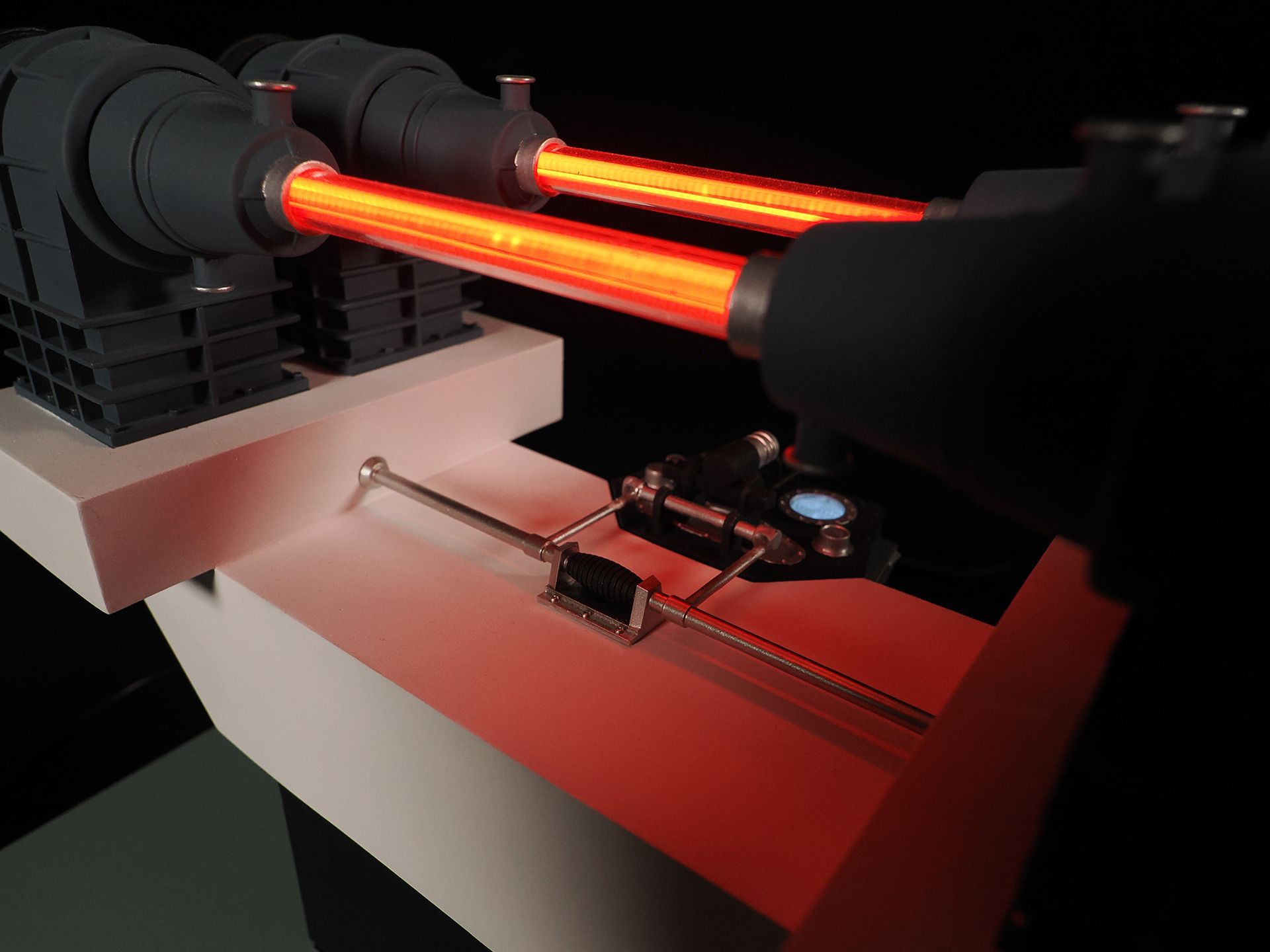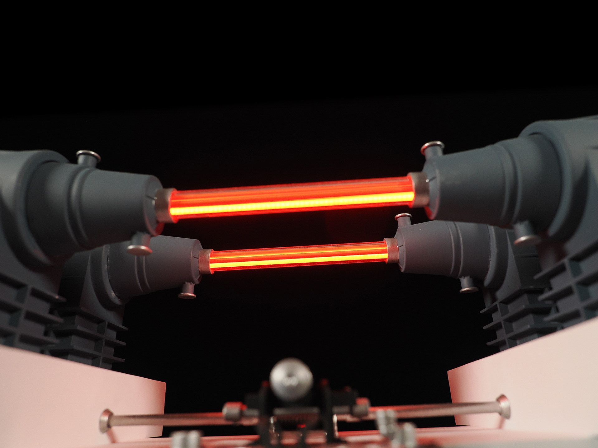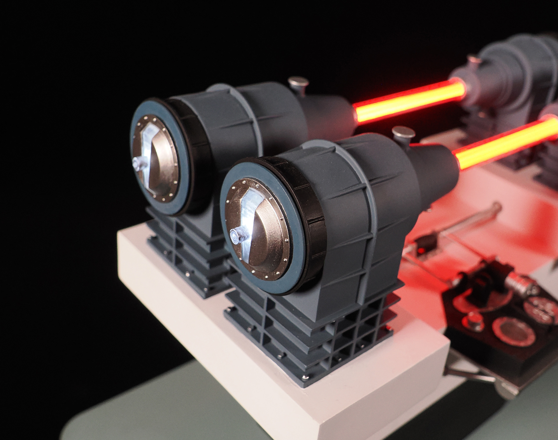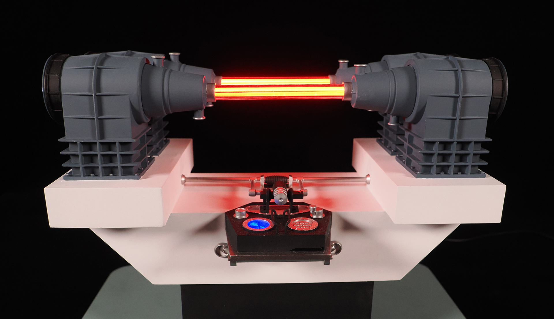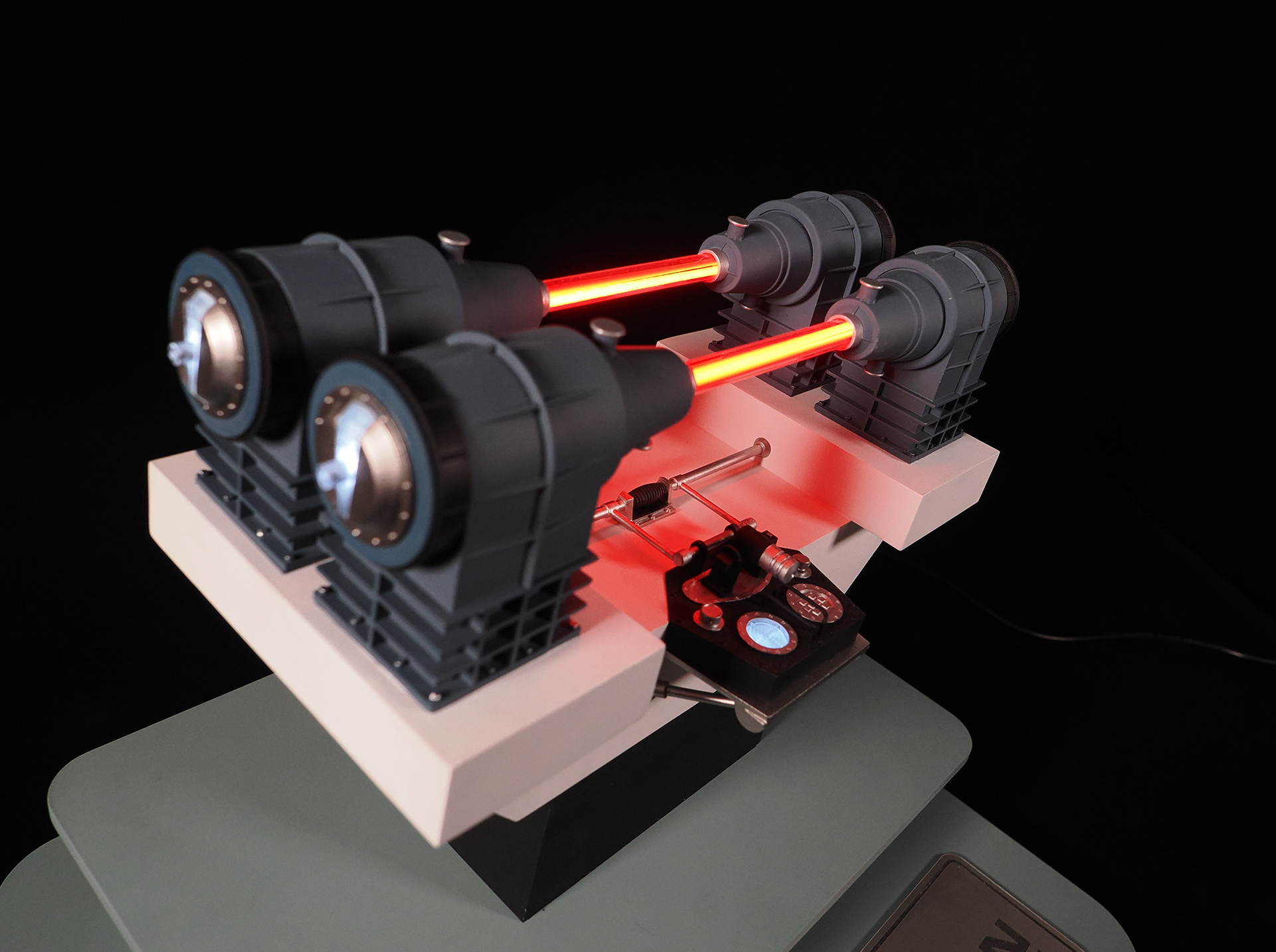 This is a model of the Modern Props #195-290-1 prop built by the company's owner, John Zabrucky. So I decided to call it The Zabruckytron, just to be slightly distinctive from what every one on the internet calls it. It is often referred to as The Most Important Device In The Universe or The Most Important Machine In The Universe because it was rented out to so many TV shows and Movies. Seen frequently in many Star Trek eipsodes across multiple series, Airplane II, Austin Powers, Buck Rogers, V, The Last Starfighter, Knight Rider, and many more. Randy from VoodooFX made a stellar analog-ish light rig from solenoids, randomly clicking on and off, to fire the eight LED filament style lights in the clear tubing. I feel the quirky electronics solution is a perfect match to such a kitschy subject matter. For the debut at Wonderfest 2024, I added a separate module that the viewer can use to activate the model's lights. I didn't want the constant clicking that would drive people insane stationed at nearby tables. For that simple touchable-by-the-public switch, I purchased a "rack module" from Concord Aerospace that you can customize. That was mounted into a triangular box I made from some laser cut acrylic. It's a fun model that celebrates the prop we love to spot!